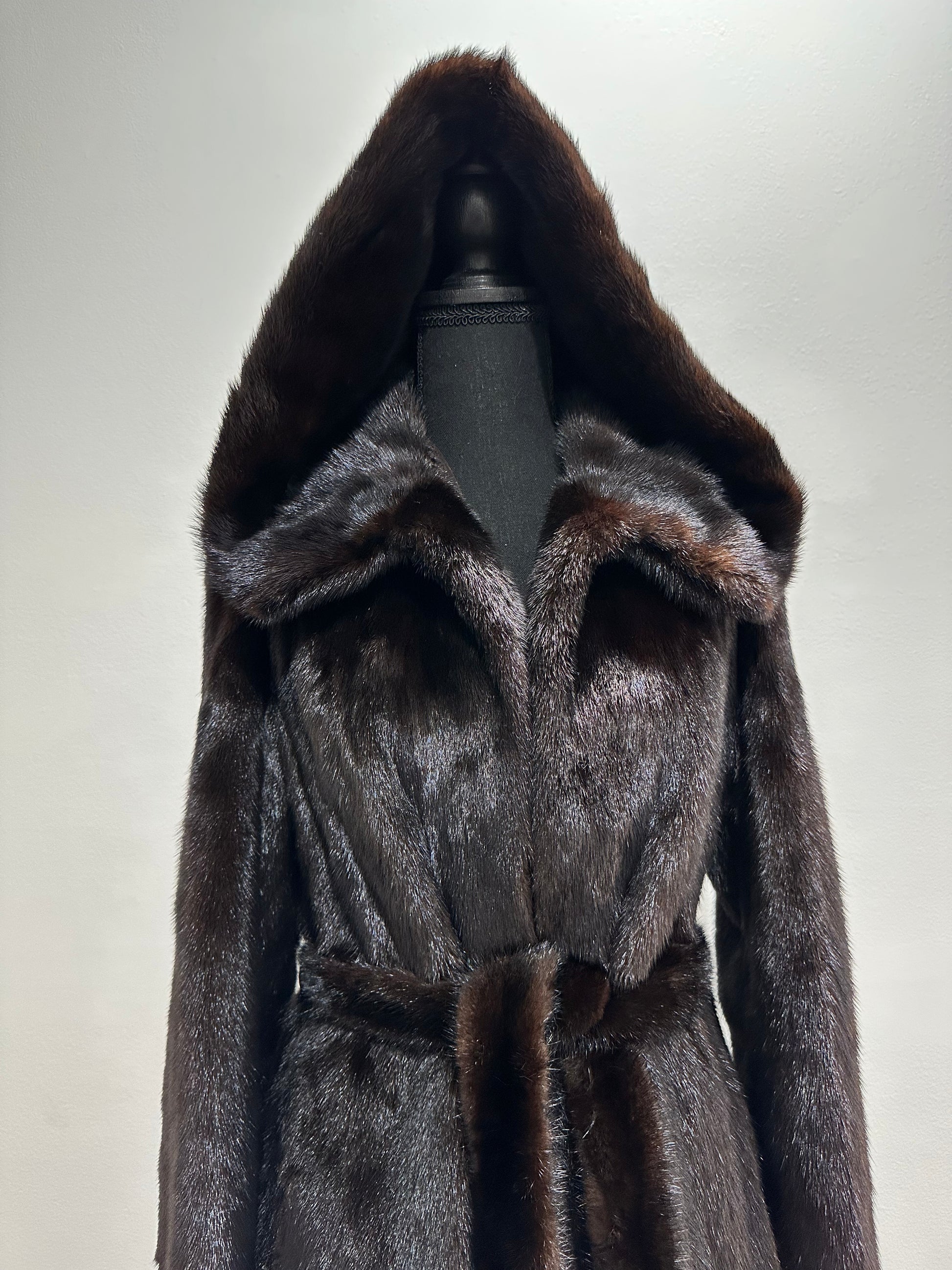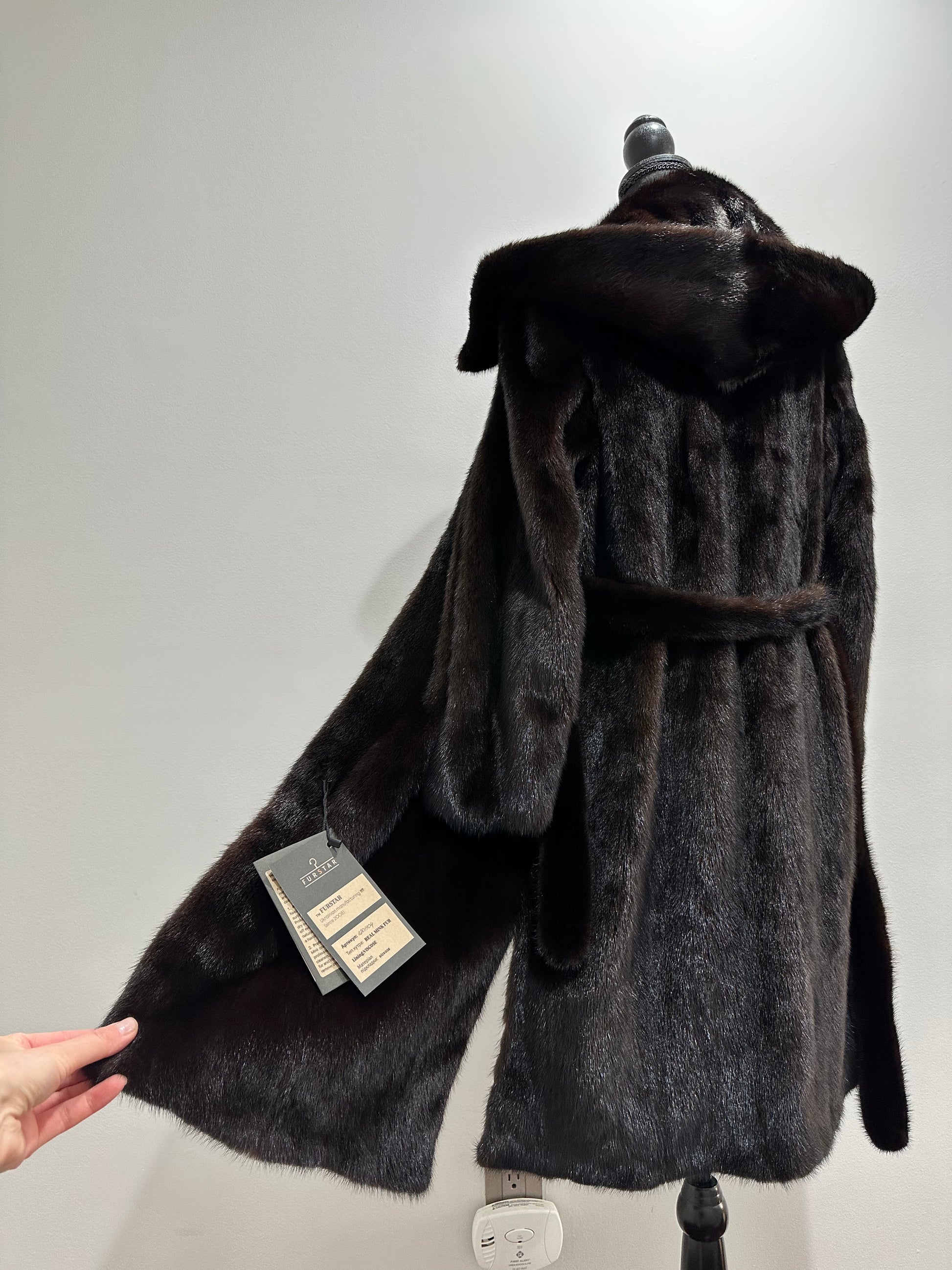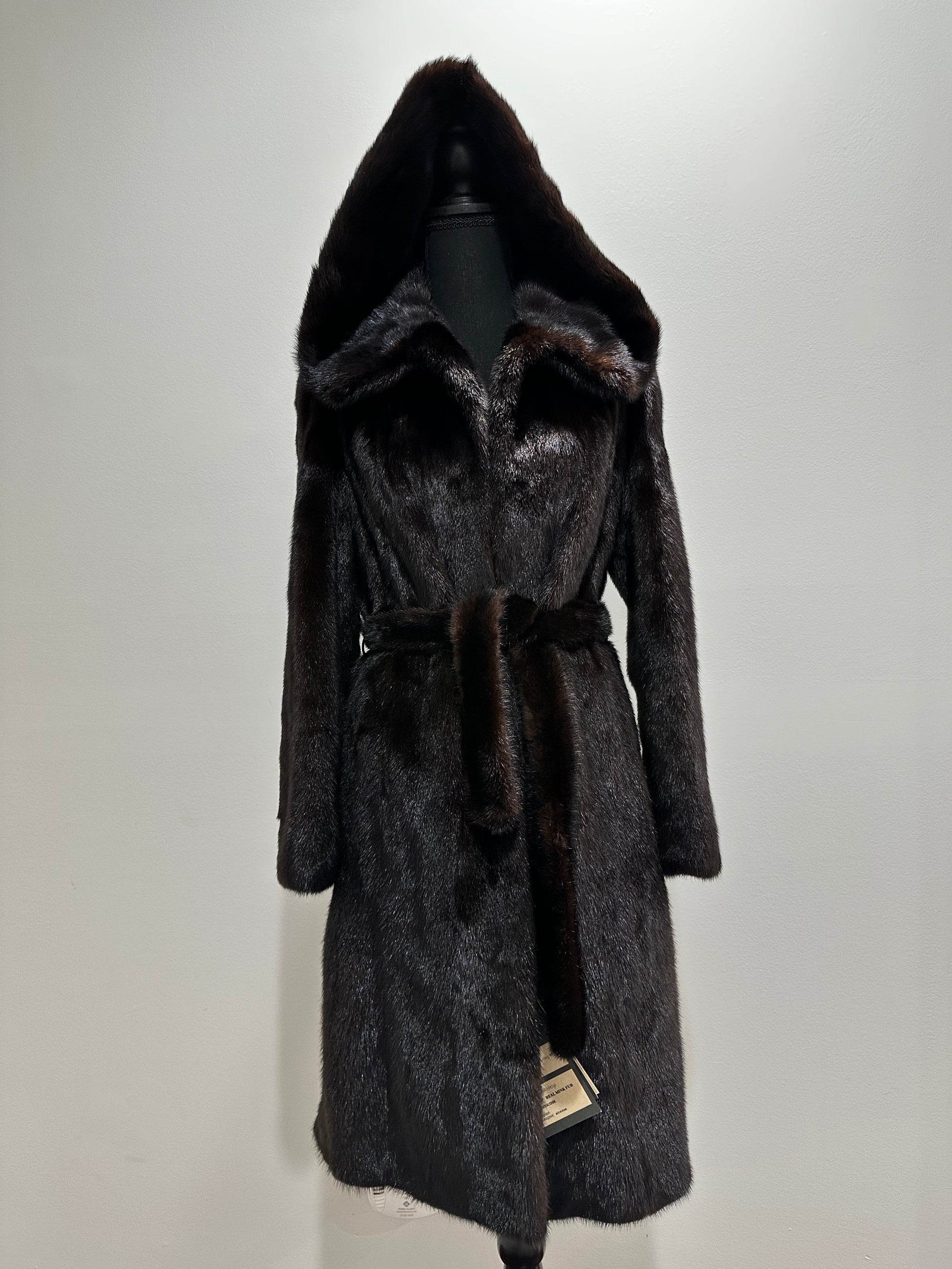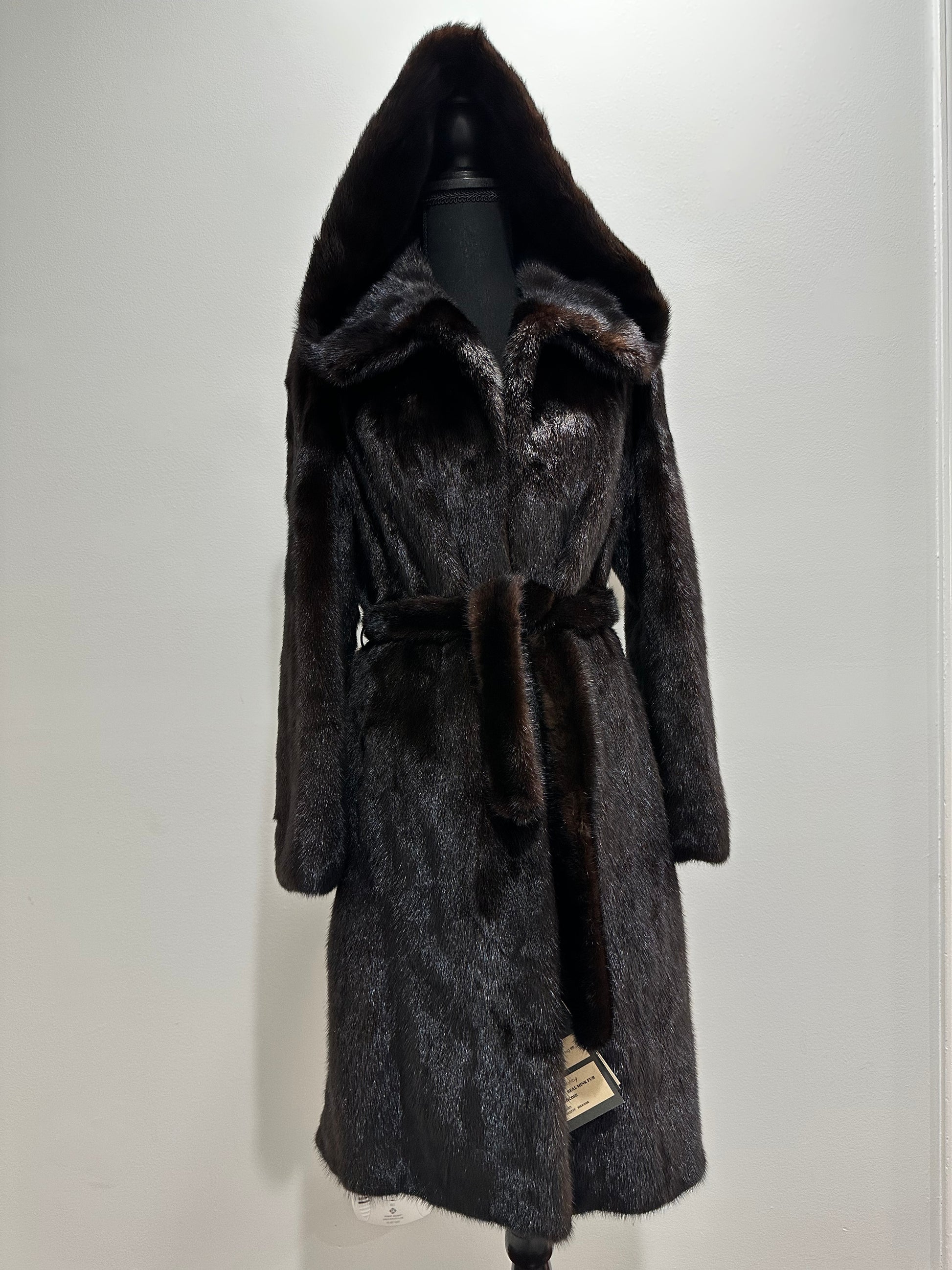 NEW REAL MINK FUR coat size M BELTED HOODED 1201104 long sleeve jacket BROWN