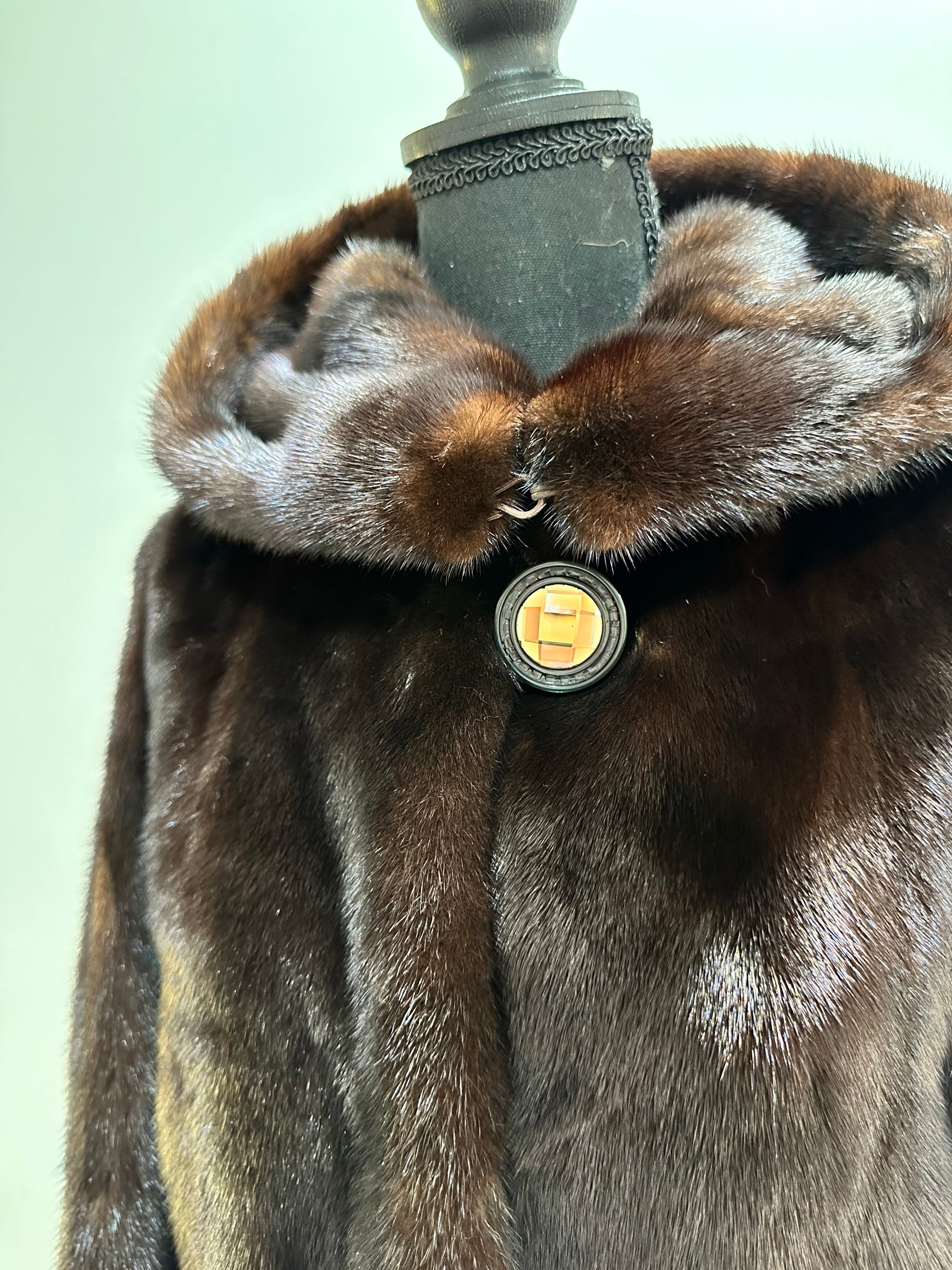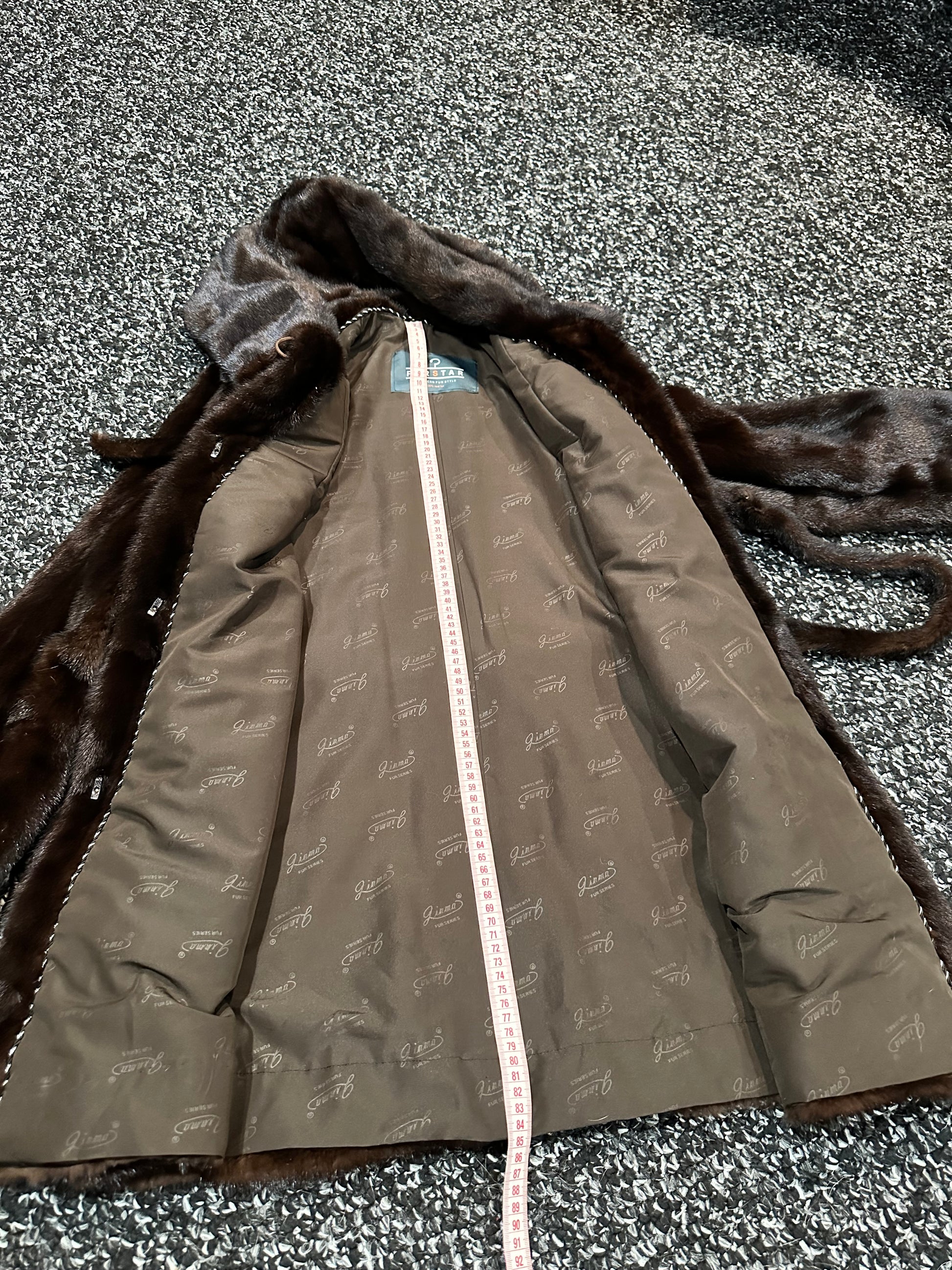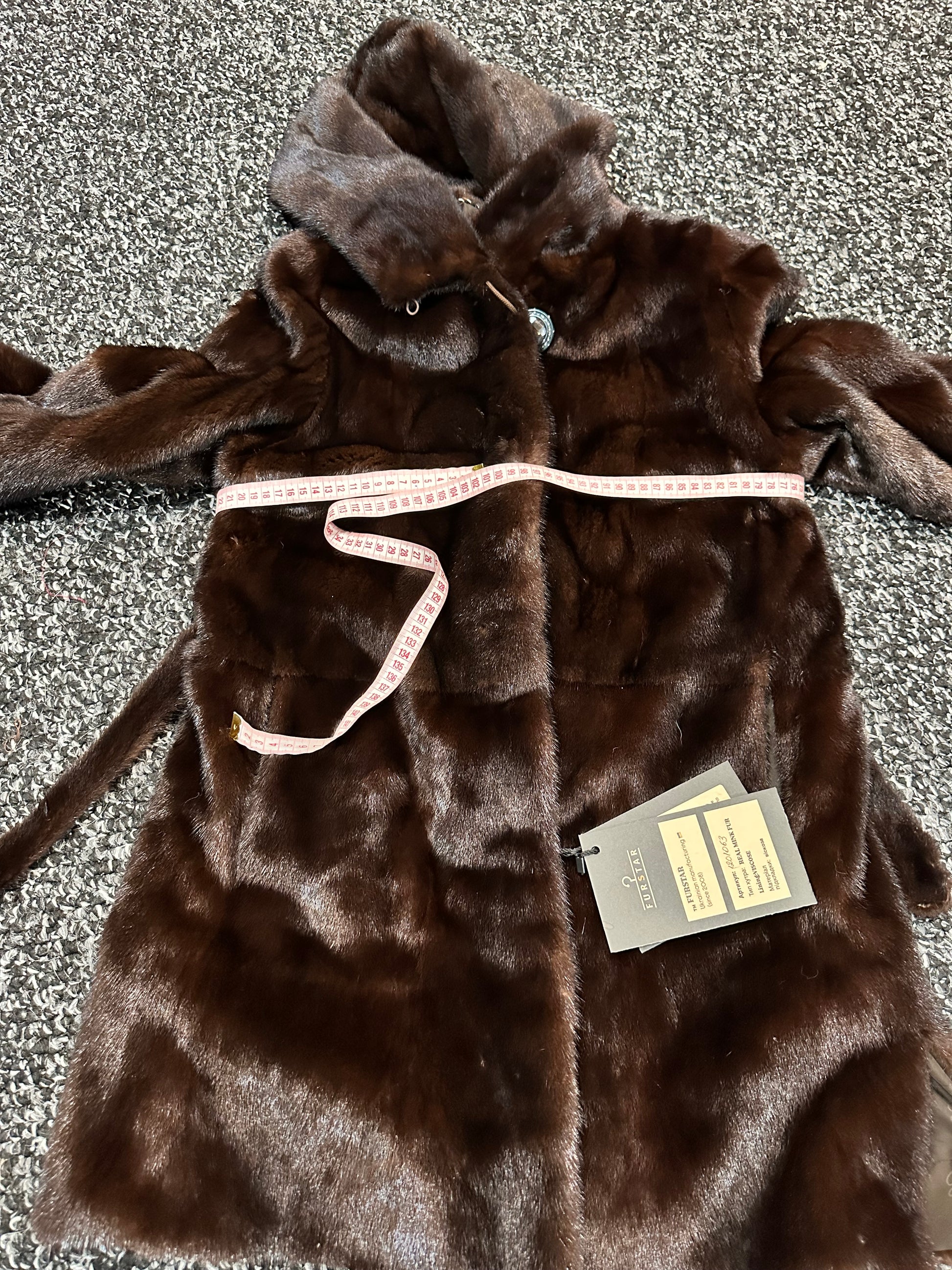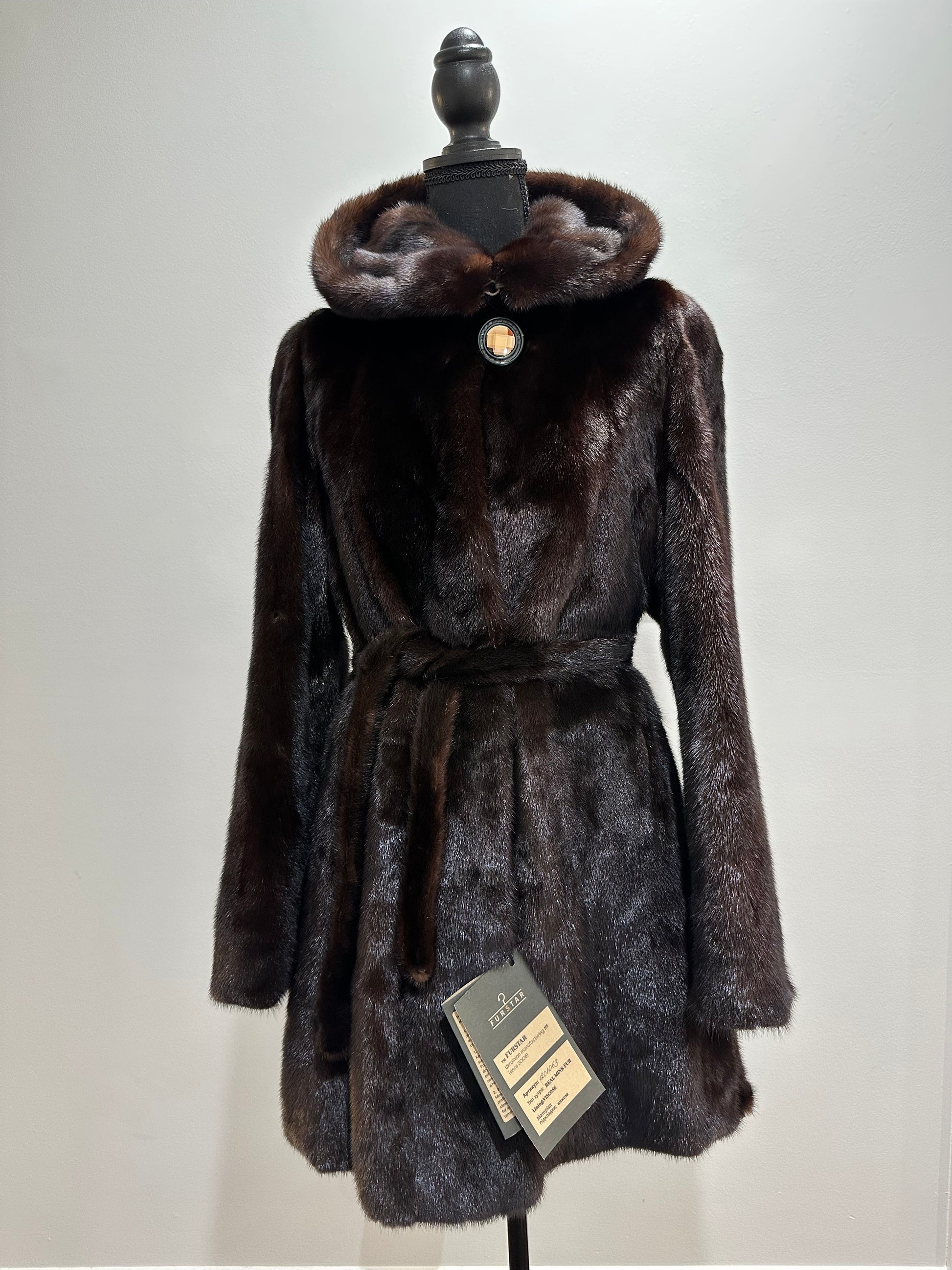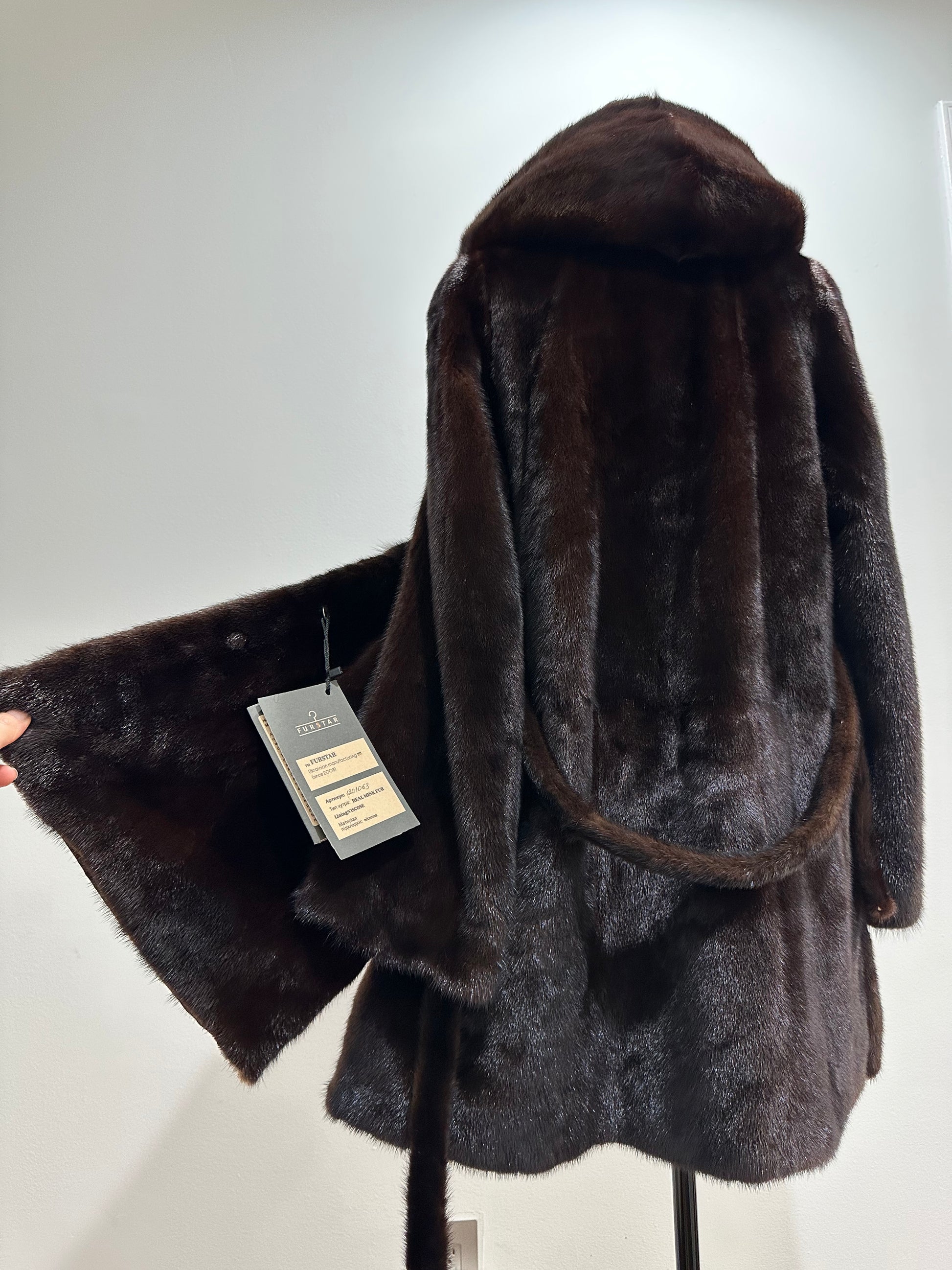 New REAL mink FUR coat size M made of chic Finnish mink NATURAL BROWN COLOR solid plates with a cobra hood CLOSED ON BUTTON. BELTED - SEE photoes. Manufacturer - Ukraine. There are 2 pockets. Fastens with hooks and button. The fur is thick, soft, shiny, silky, the fur coat is very warm, a chic model. Viscose lining with a beautiful pattern.