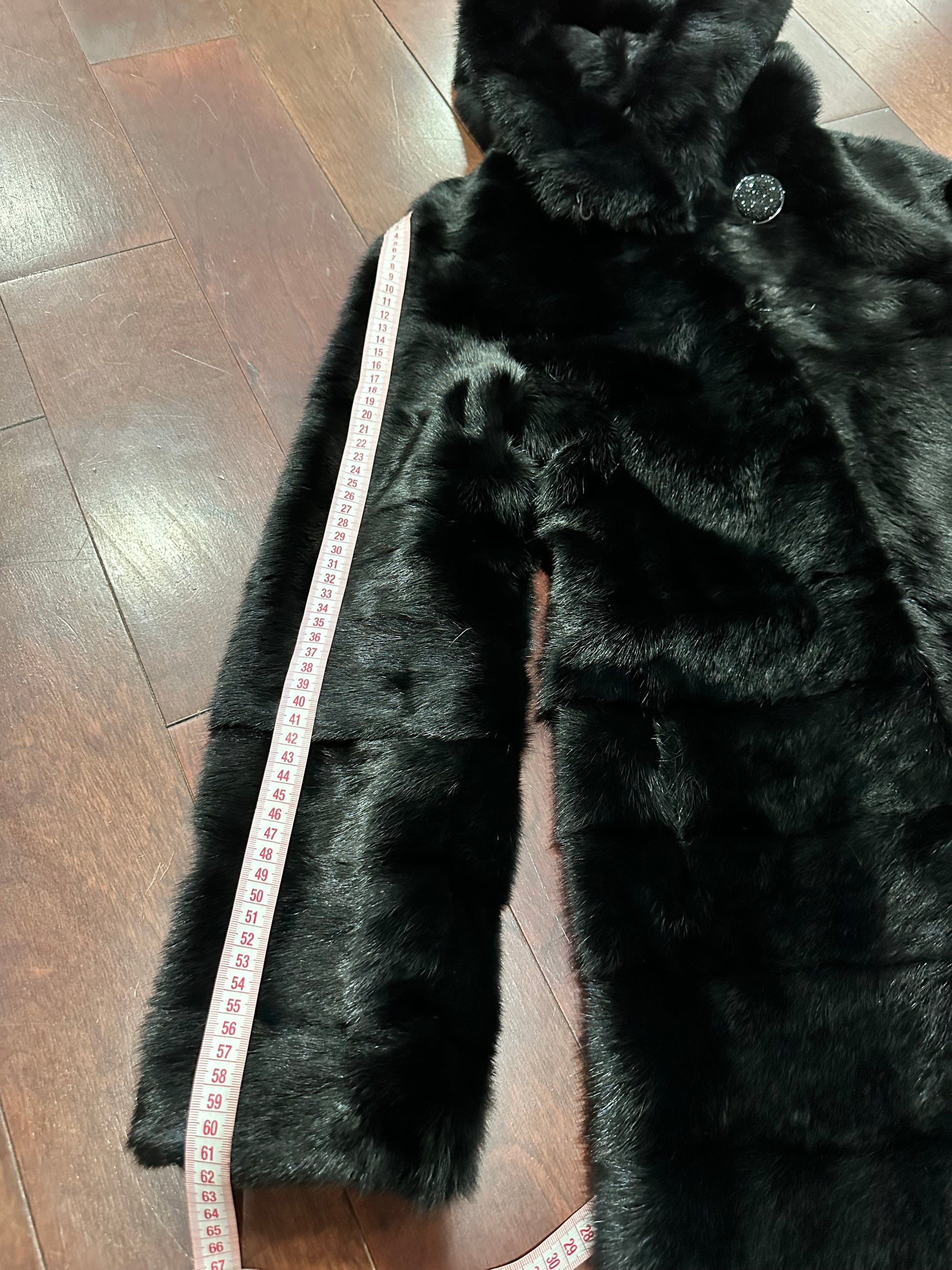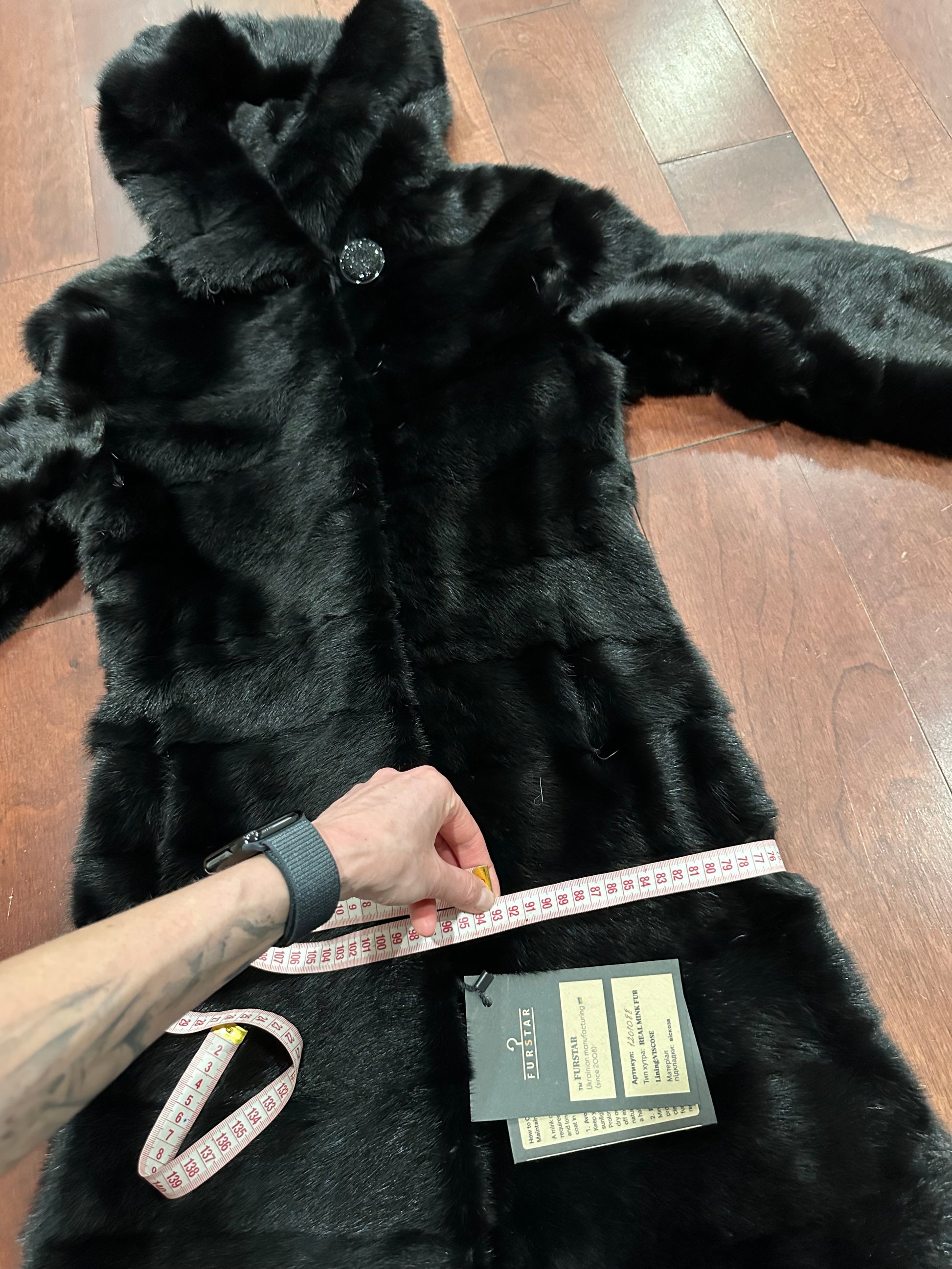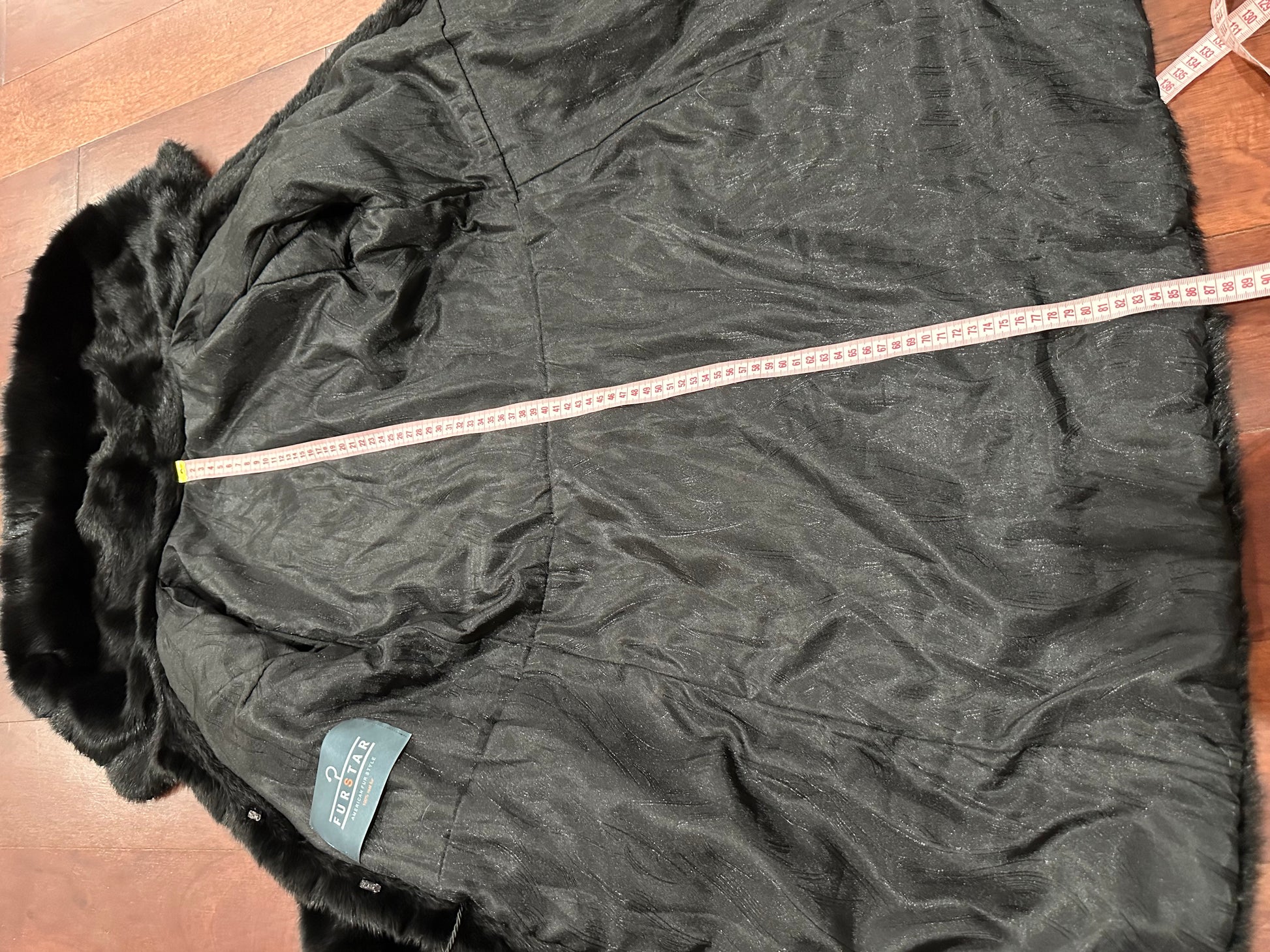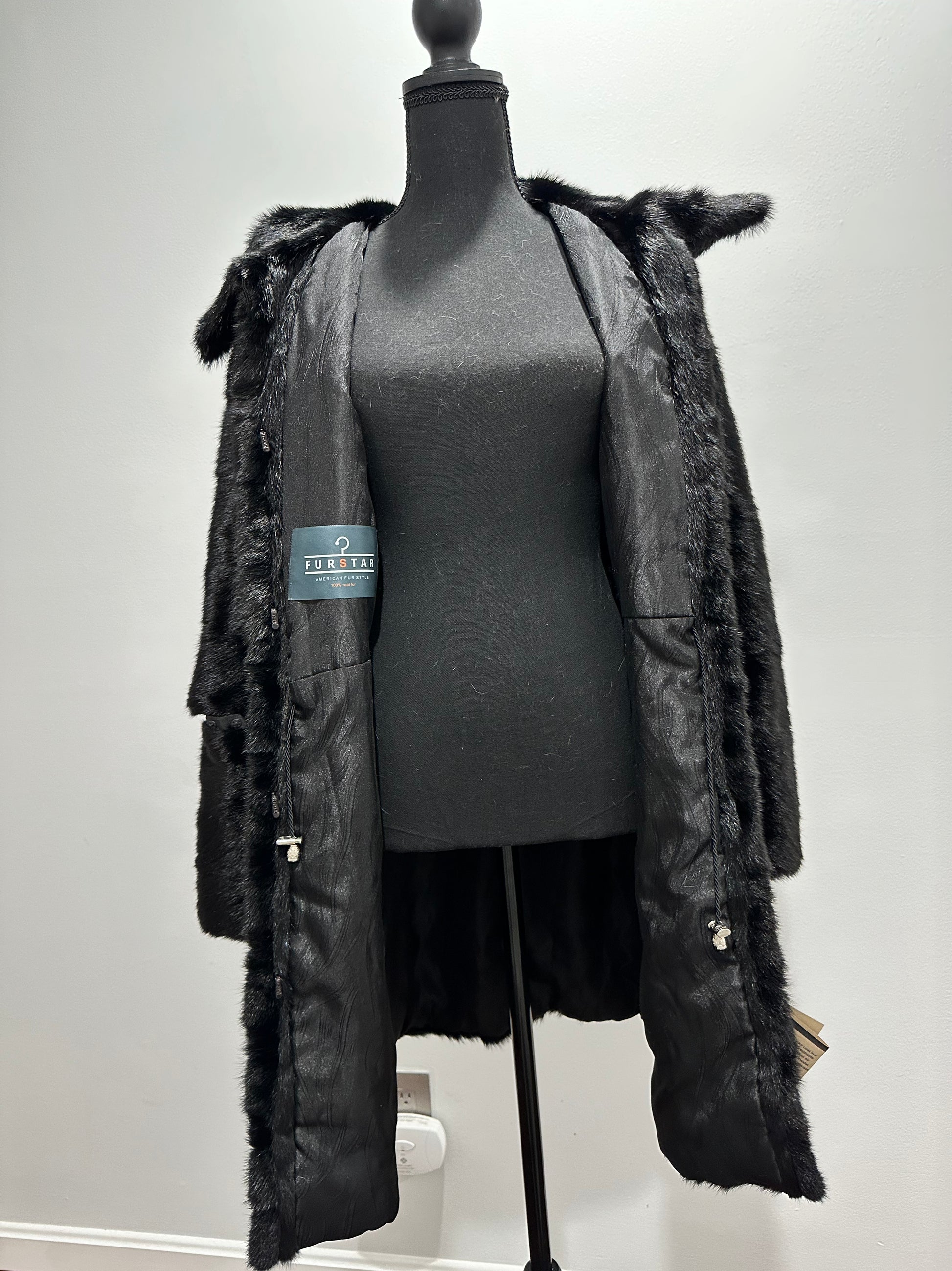 New mink coat size XXS made of REAL LONG HEAR mink BLACK COLOR solid plates with hood. sleeves - detachable. Fur style - horizontal fur plates. The model is straight. There is also a drawstring - SEE photoes. Manufacturer - Ukraine TRADE MARK FURSTAR SINCE 2008. There are 2 pockets. Fastens with hooks and button. THE SLEEVES CAN BE UNBUTTONED. The fur is thick, soft, shiny, silky, the fur coat is very warm, a chic model. Viscose lining with a beautiful pattern.