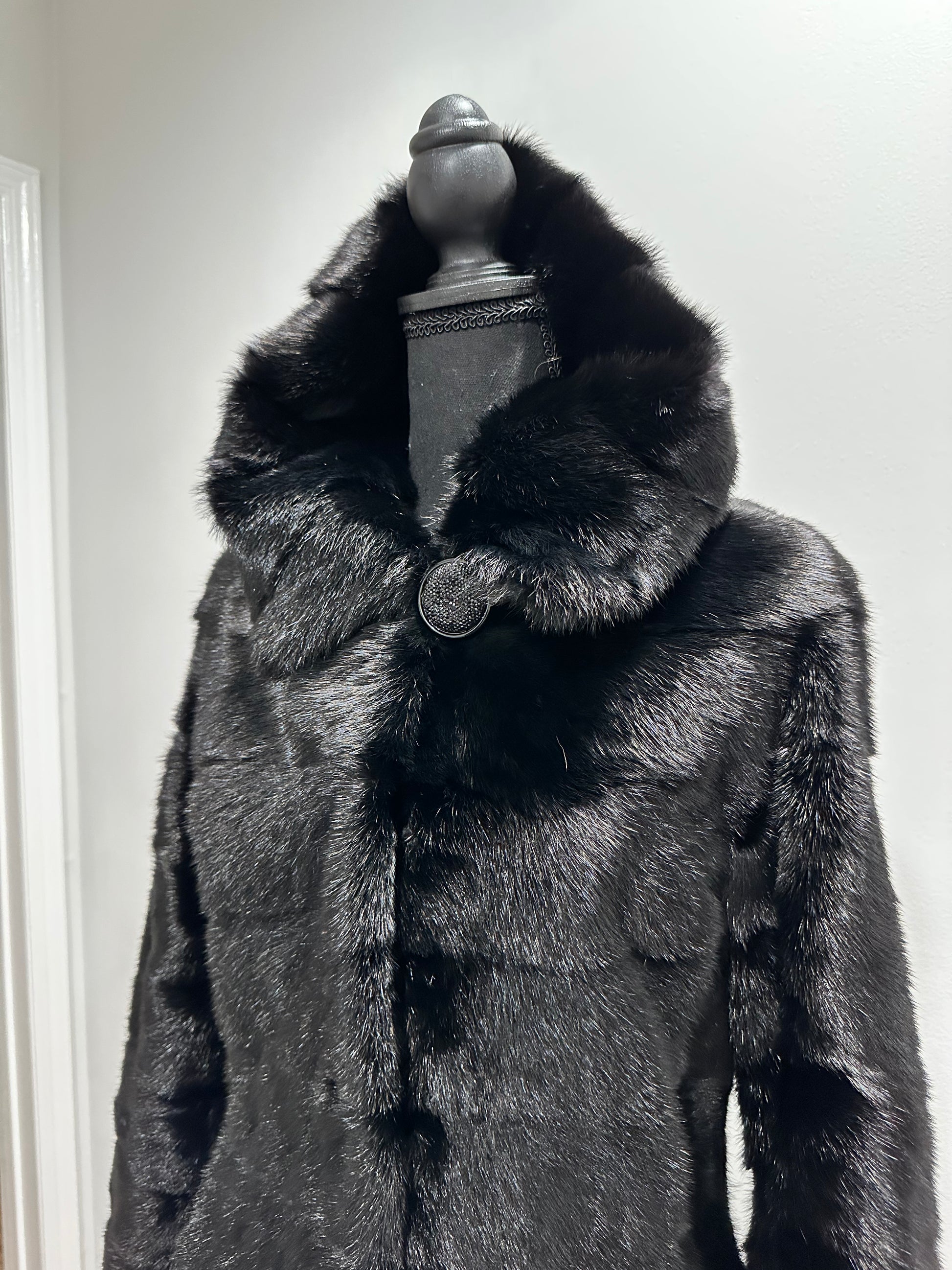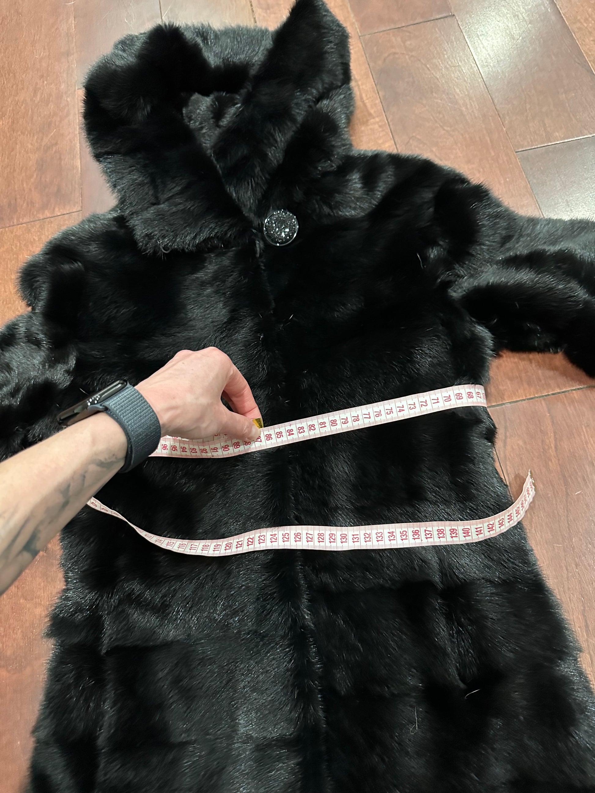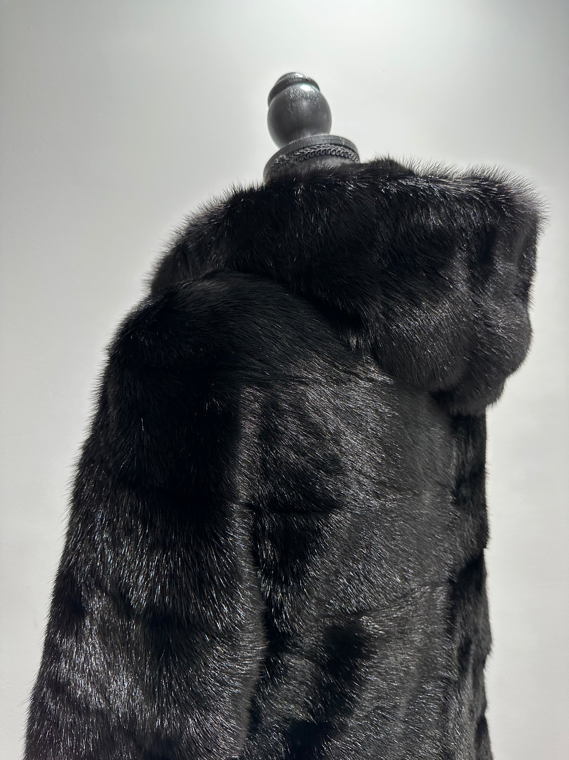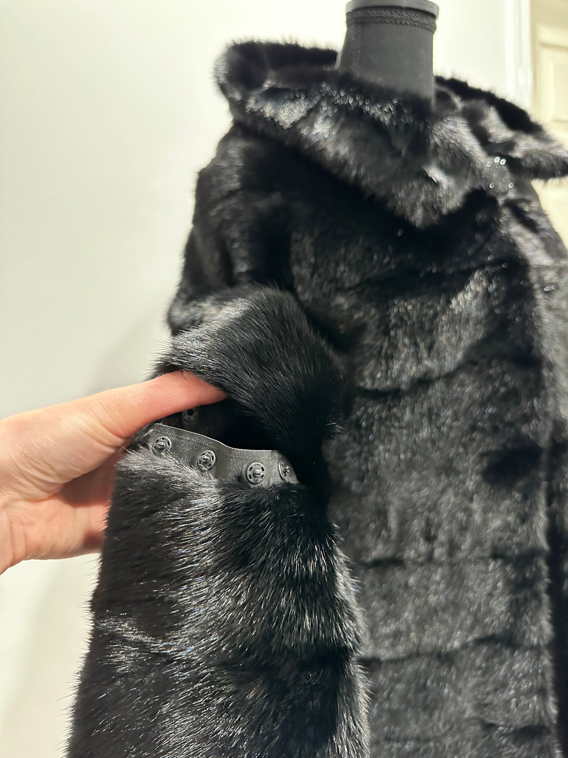 New mink coat size XXS made of REAL LONG HEAR mink BLACK COLOR solid plates with hood. sleeves - detachable. Fur style - horizontal fur plates. The model is straight. There is also a drawstring - SEE photoes. Manufacturer - Ukraine TRADE MARK FURSTAR SINCE 2008. There are 2 pockets. Fastens with hooks and button. THE SLEEVES CAN BE UNBUTTONED. The fur is thick, soft, shiny, silky, the fur coat is very warm, a chic model. Viscose lining with a beautiful pattern.