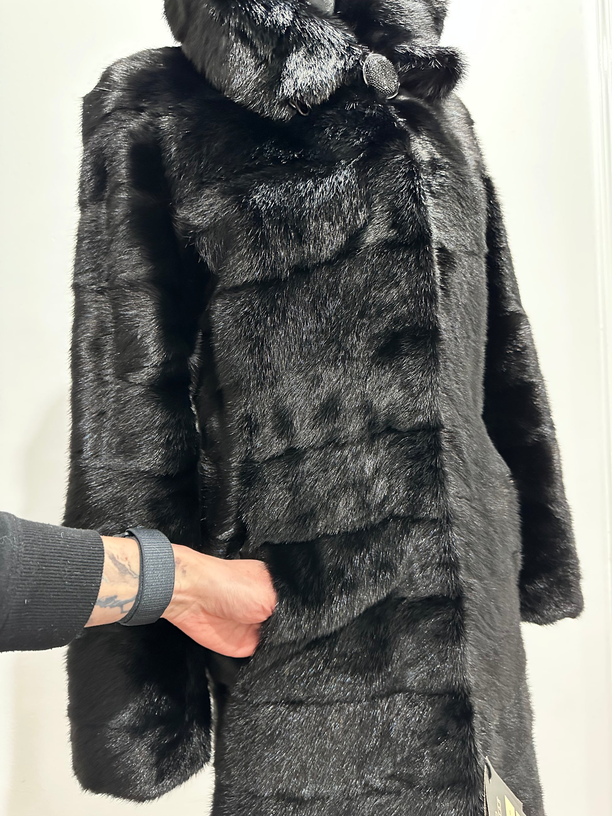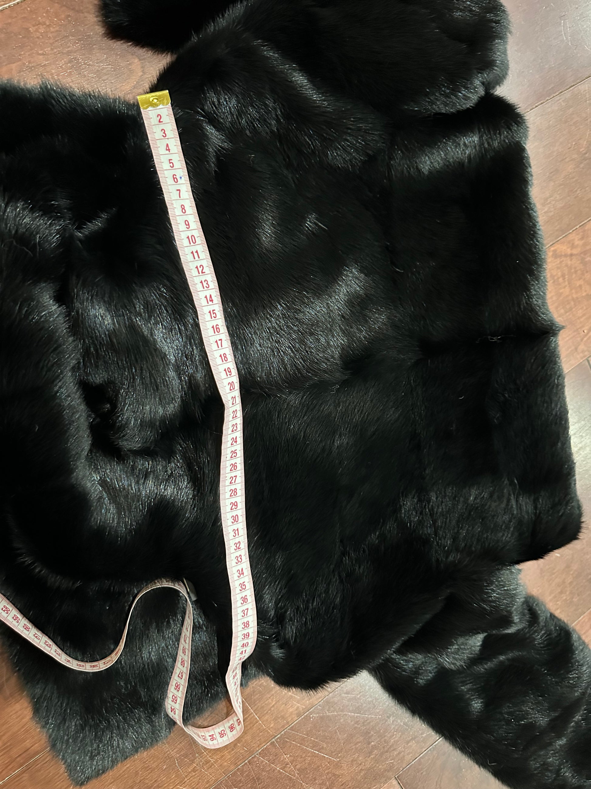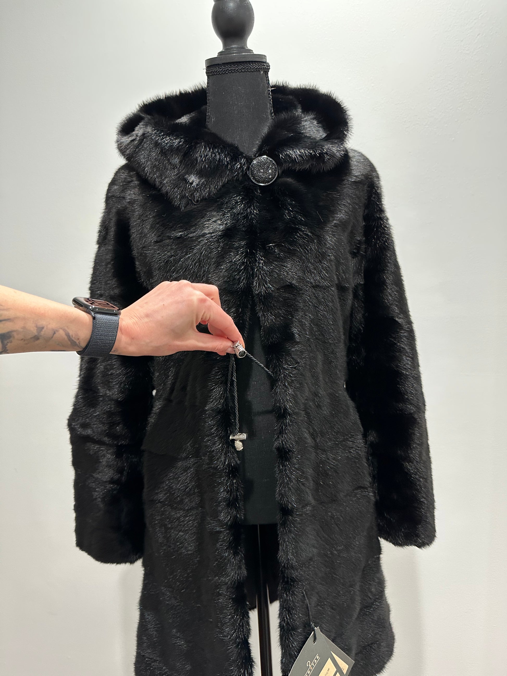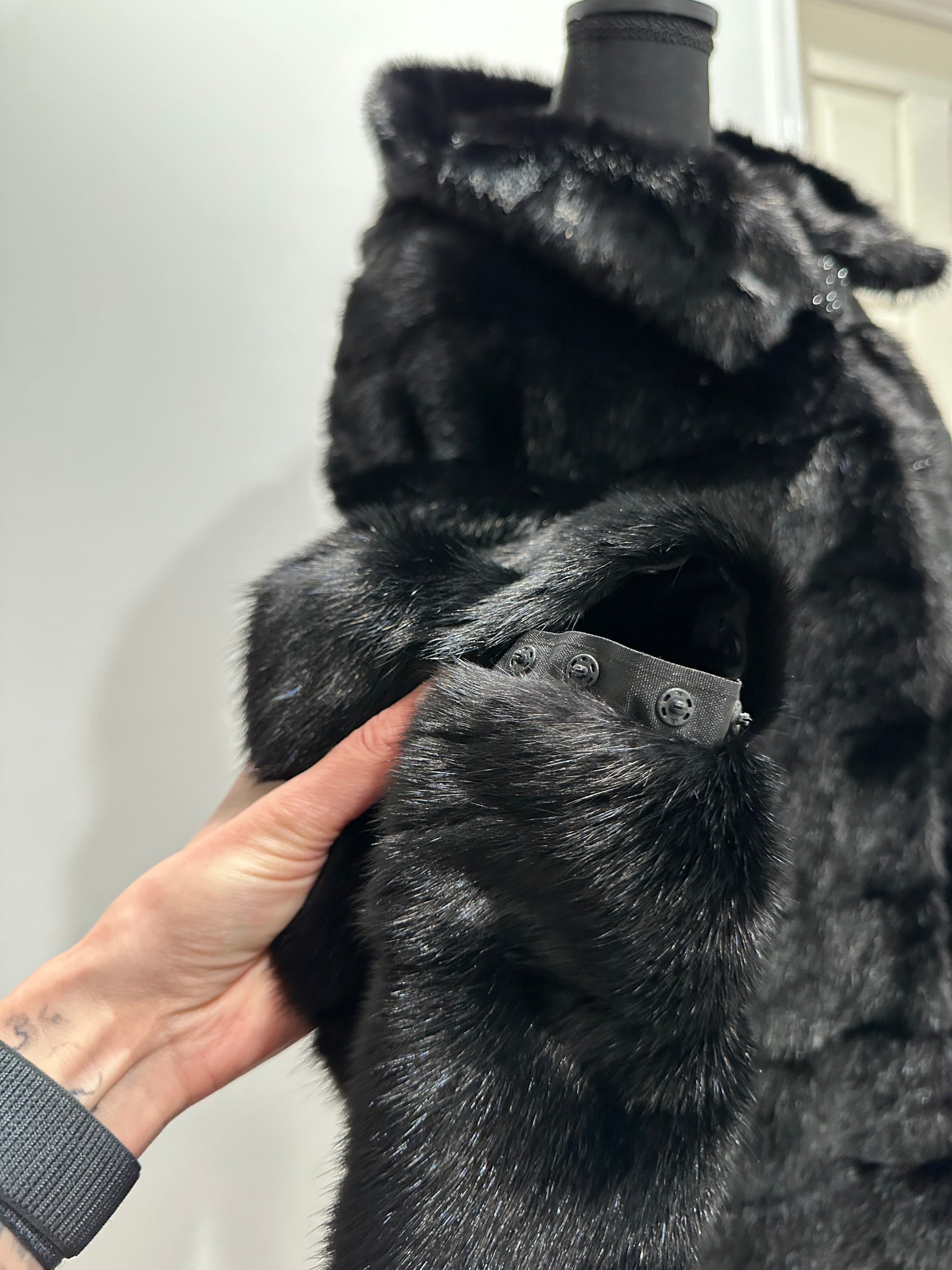 New mink coat size XXS made of REAL LONG HEAR mink BLACK COLOR solid plates with hood. sleeves - detachable. Fur style - horizontal fur plates. The model is straight. There is also a drawstring - SEE photoes. Manufacturer - Ukraine TRADE MARK FURSTAR SINCE 2008. There are 2 pockets. Fastens with hooks and button. THE SLEEVES CAN BE UNBUTTONED. The fur is thick, soft, shiny, silky, the fur coat is very warm, a chic model. Viscose lining with a beautiful pattern.