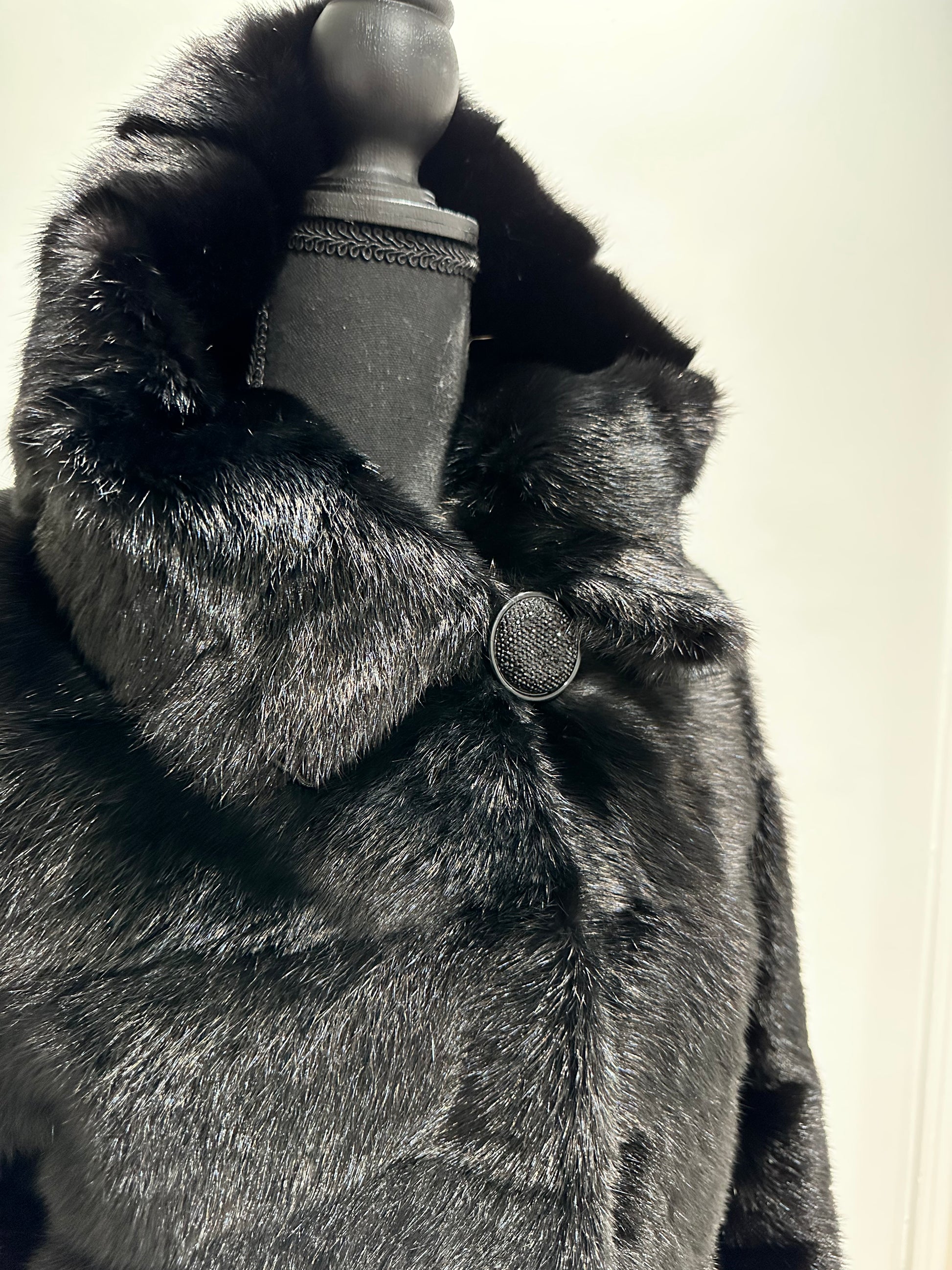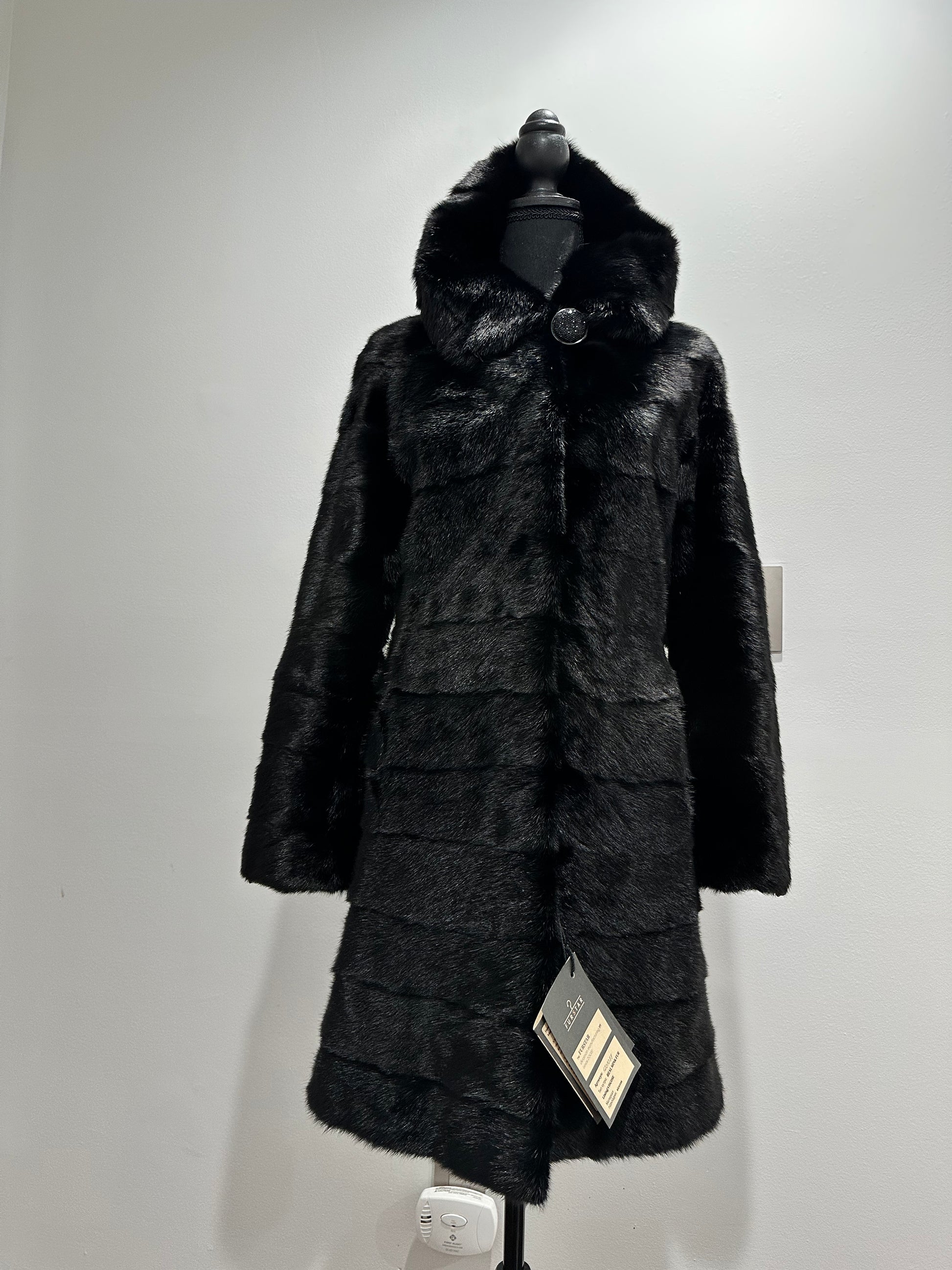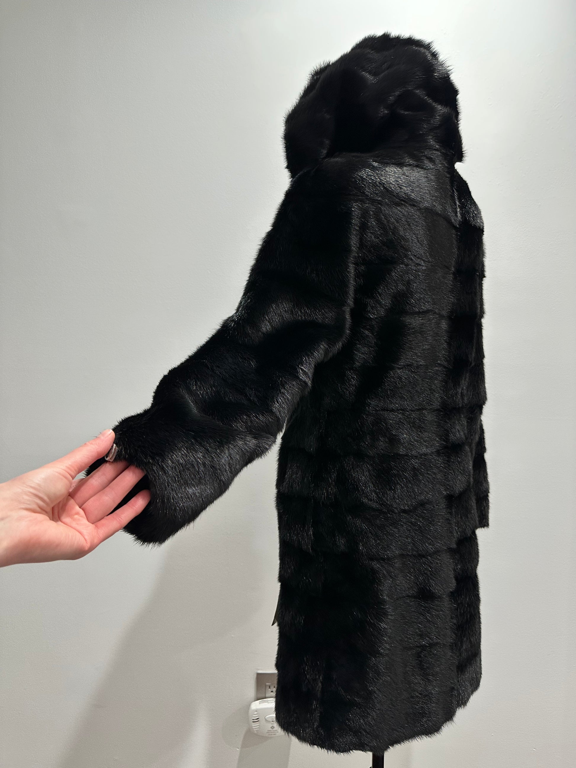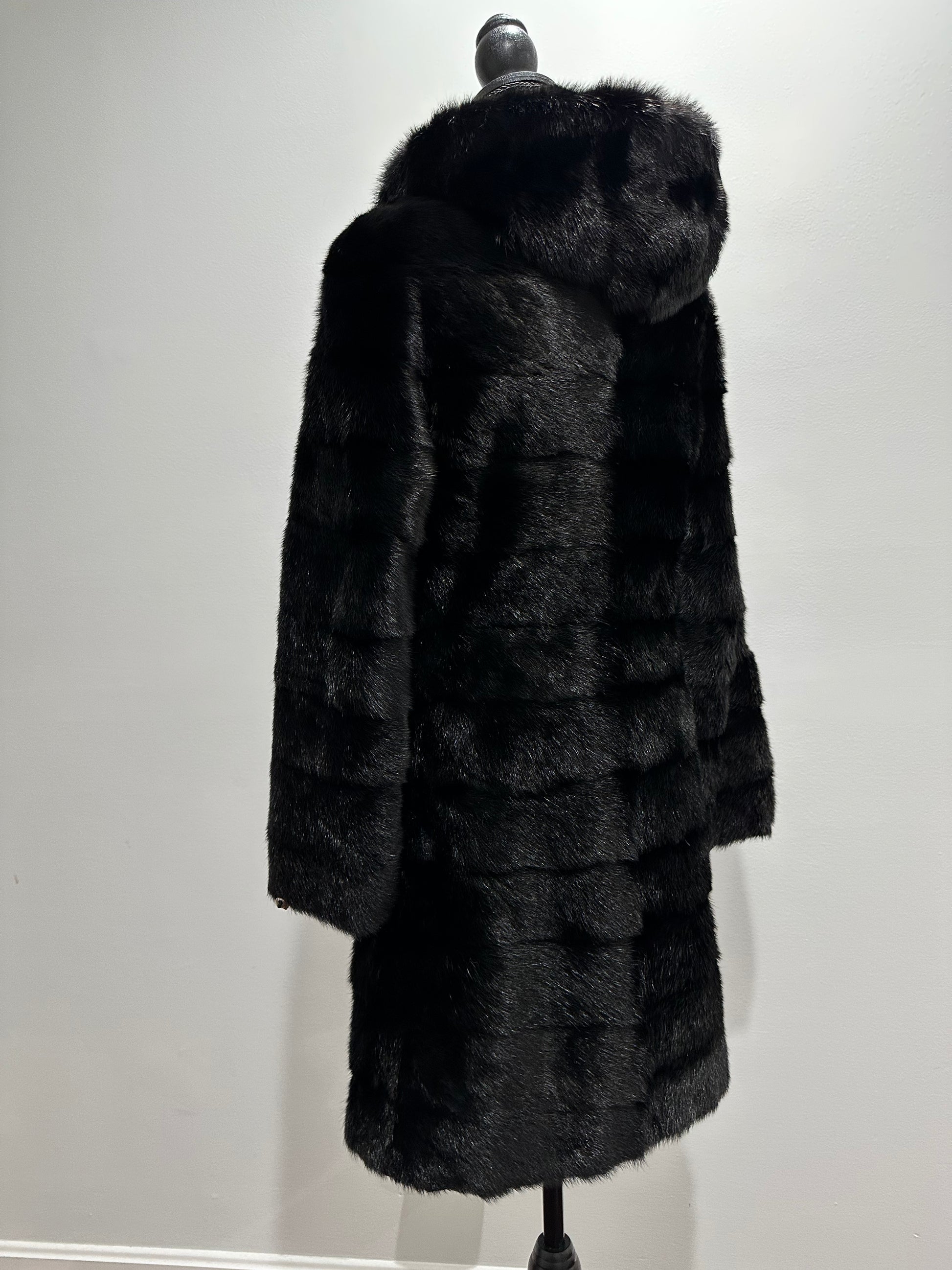 New mink coat size XXS made of REAL LONG HEAR mink BLACK COLOR solid plates with hood. sleeves - detachable. Fur style - horizontal fur plates. The model is straight. There is also a drawstring - SEE photoes. Manufacturer - Ukraine TRADE MARK FURSTAR SINCE 2008. There are 2 pockets. Fastens with hooks and button. THE SLEEVES CAN BE UNBUTTONED. The fur is thick, soft, shiny, silky, the fur coat is very warm, a chic model. Viscose lining with a beautiful pattern.