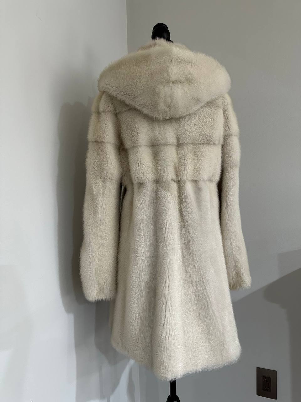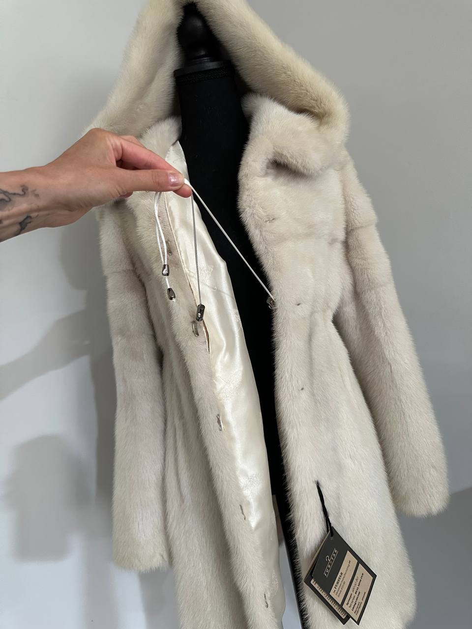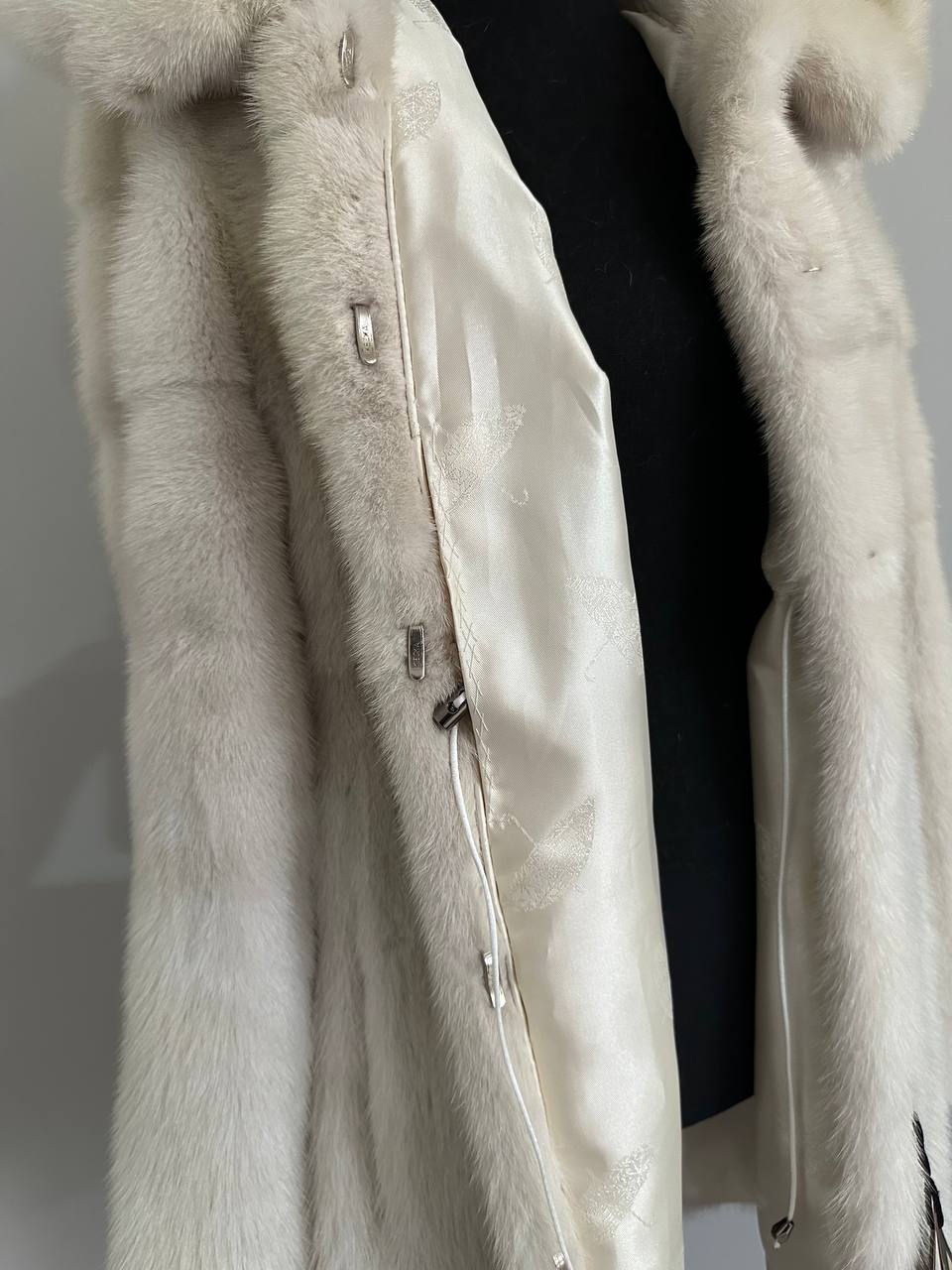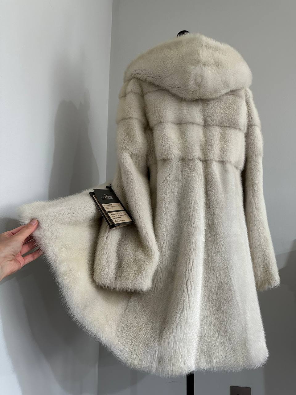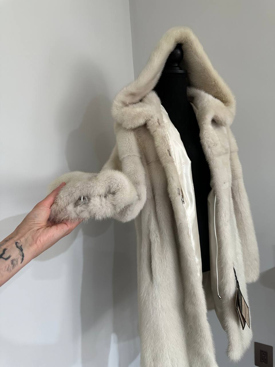New mink coat size S made of luxurious Finnish mink in ivory color, solid plates with HOOD. natural color. The model is straight, fitted with a drawstring at the waist. There is also a drawstring in sleeves - SEE PHOTOES VIDEO. Manufacturer - Ukraine FURSTAR. There are 2 pockets. Fastens with hooks. The fur is thick, soft, shiny, silky, the fur coat is very warm, a chic model. Viscose lining with a beautiful pattern. The hem is sewn, handmade.