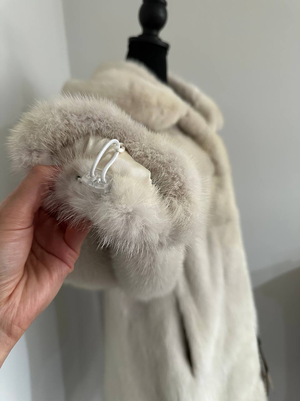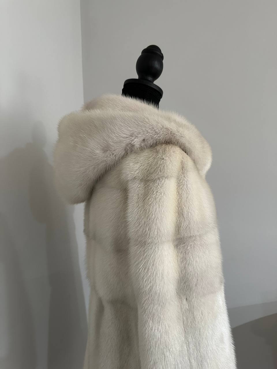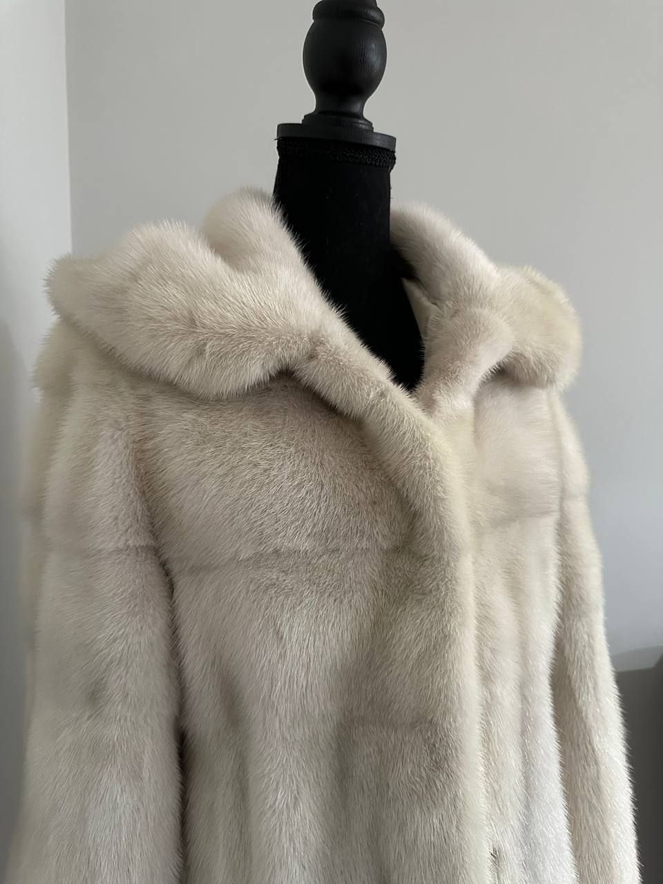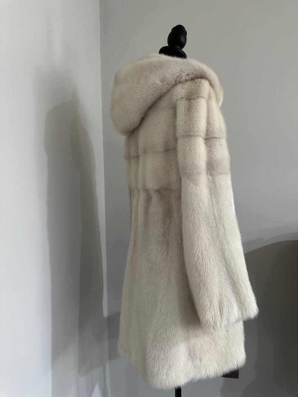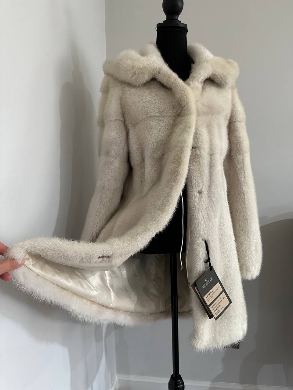 New mink coat size S made of luxurious Finnish mink in ivory color, solid plates with HOOD. natural color. The model is straight, fitted with a drawstring at the waist. There is also a drawstring in sleeves - SEE PHOTOES VIDEO. Manufacturer - Ukraine FURSTAR. There are 2 pockets. Fastens with hooks. The fur is thick, soft, shiny, silky, the fur coat is very warm, a chic model. Viscose lining with a beautiful pattern. The hem is sewn, handmade.