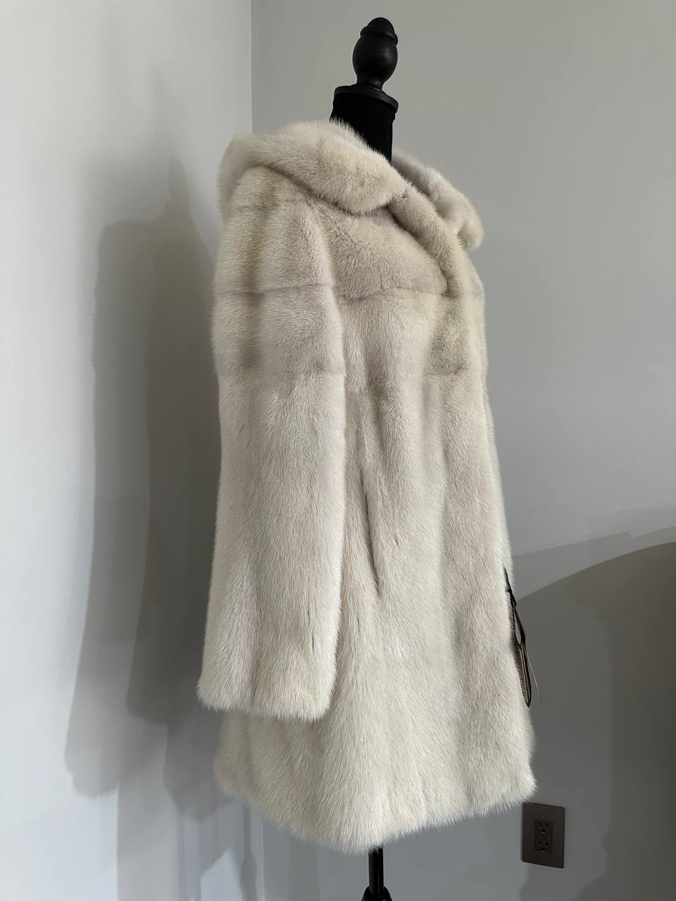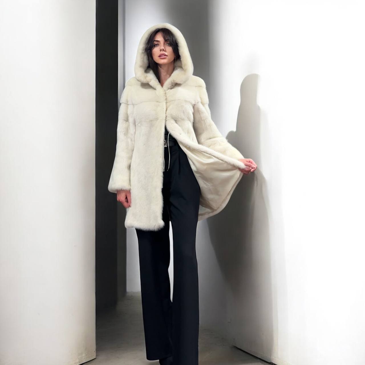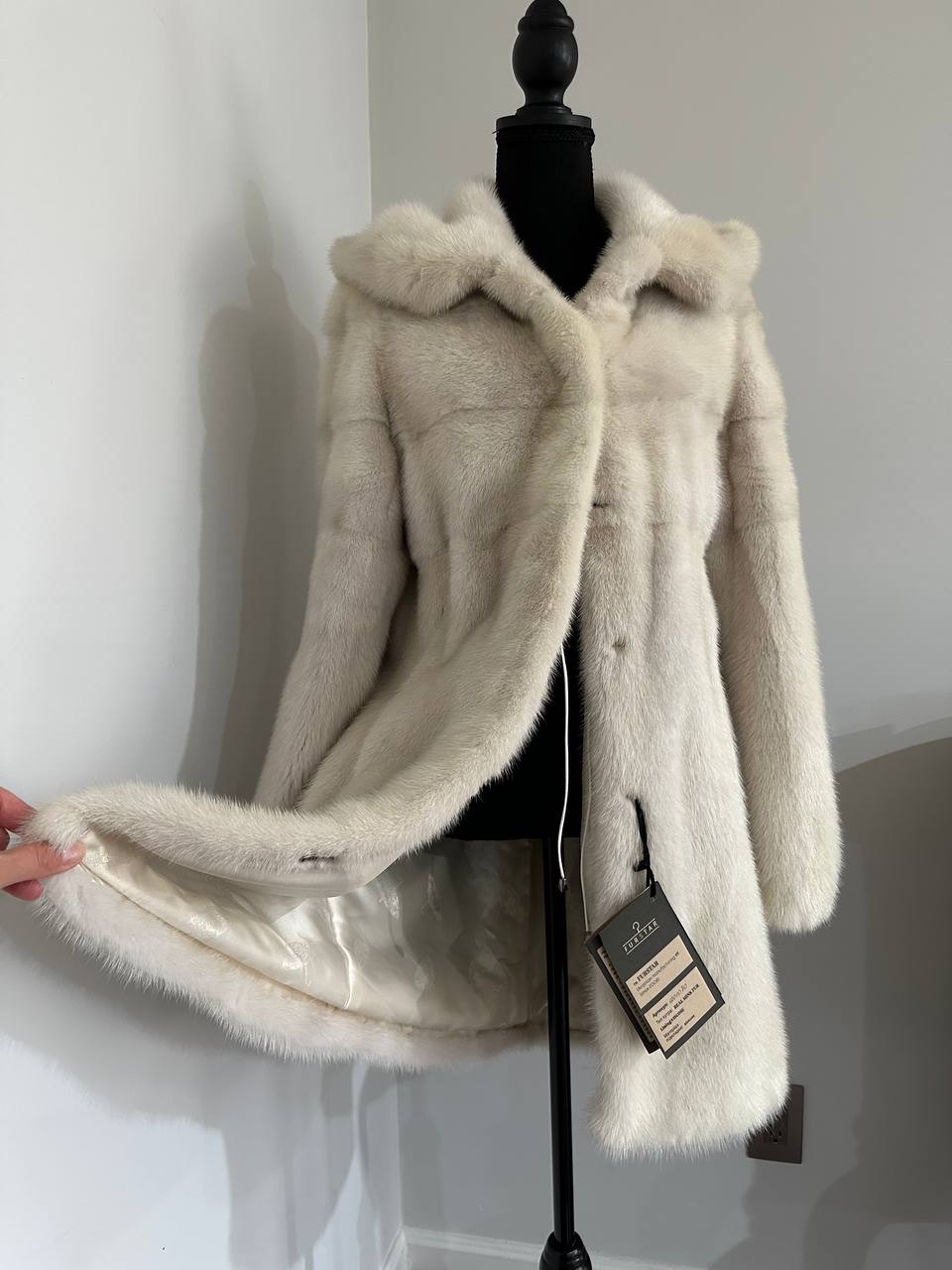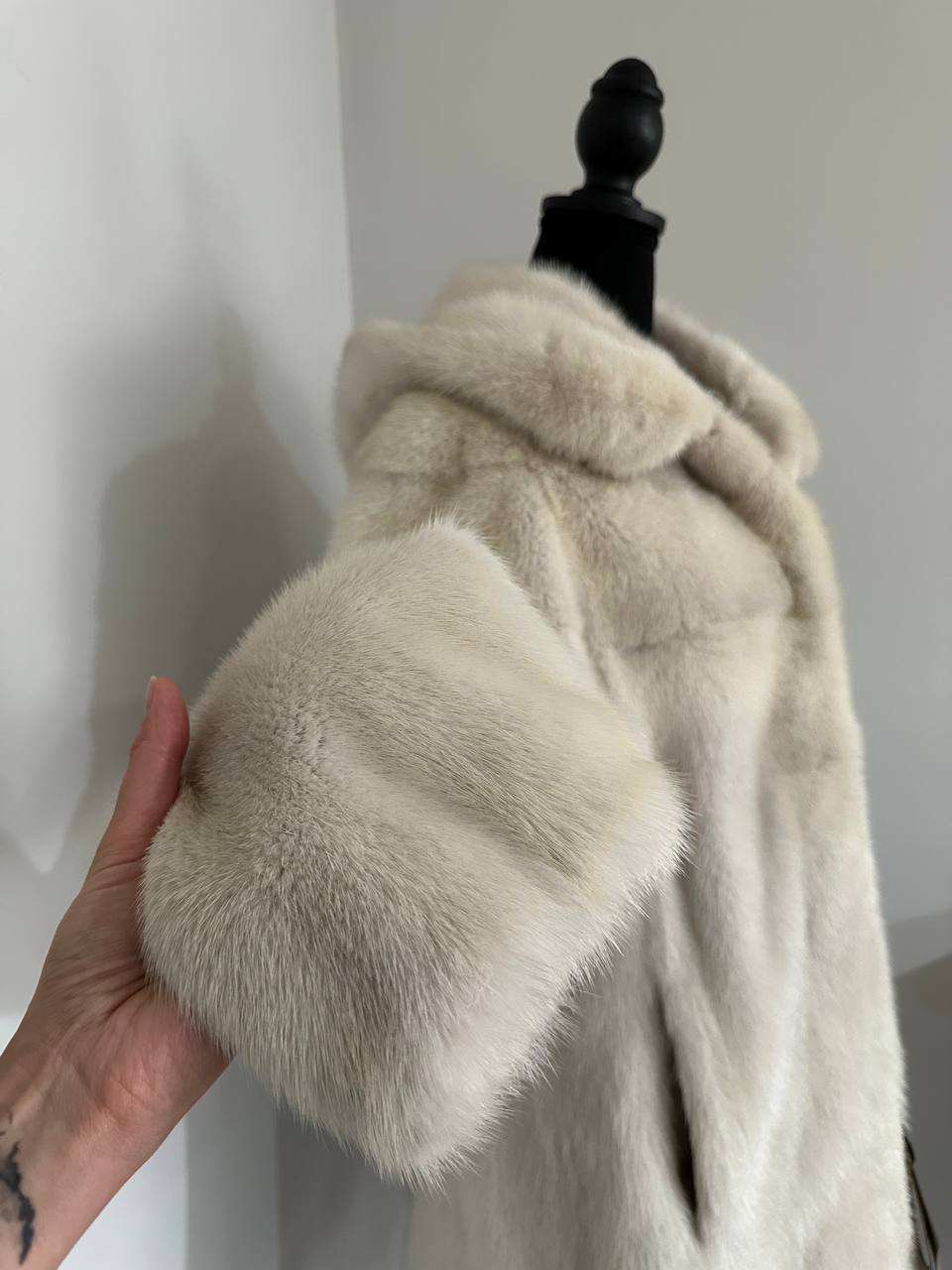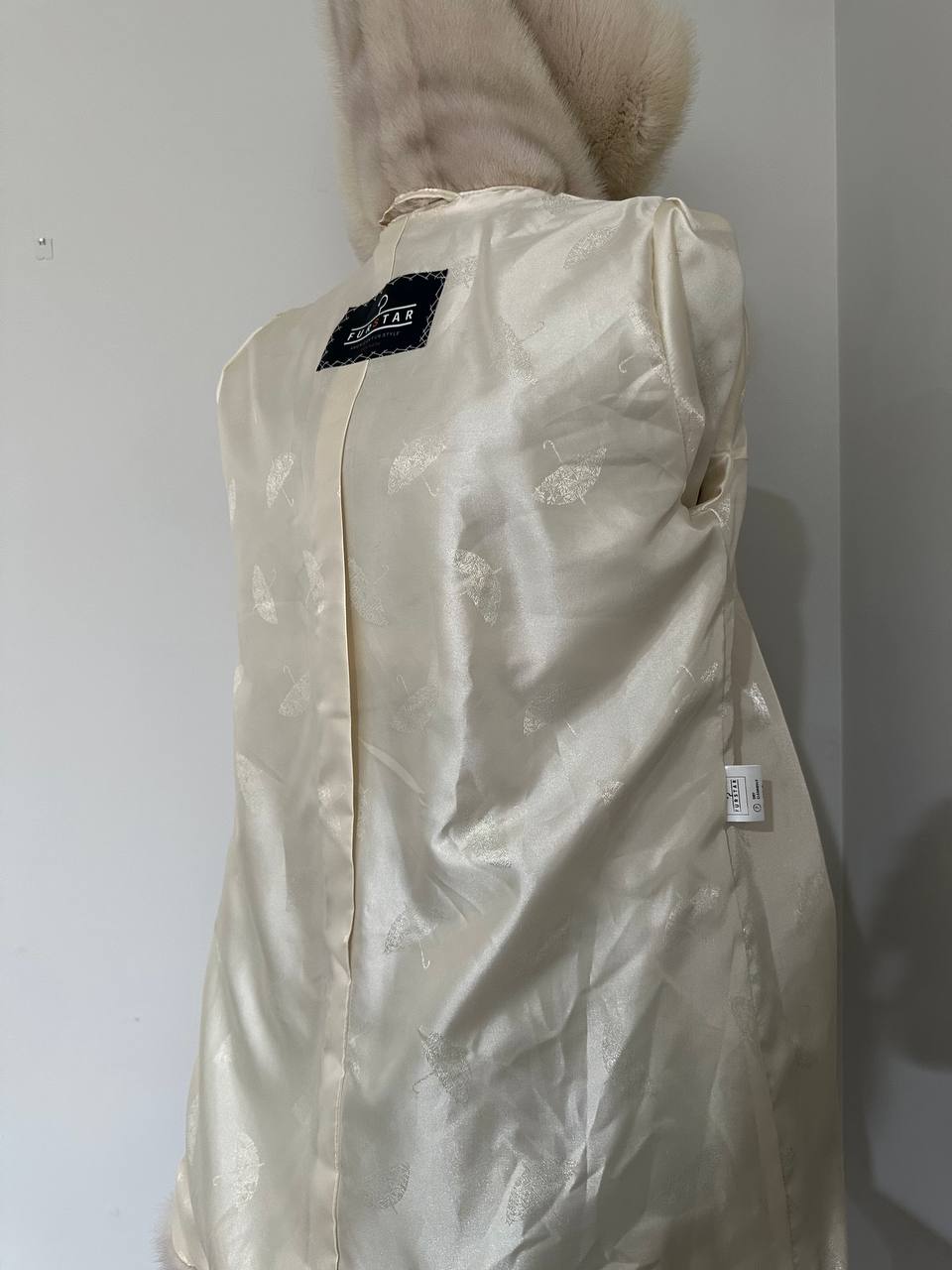 New mink coat size S made of luxurious Finnish mink in ivory color, solid plates with HOOD. natural color. The model is straight, fitted with a drawstring at the waist. There is also a drawstring in sleeves - SEE PHOTOES VIDEO. Manufacturer - Ukraine FURSTAR. There are 2 pockets. Fastens with hooks. The fur is thick, soft, shiny, silky, the fur coat is very warm, a chic model. Viscose lining with a beautiful pattern. The hem is sewn, handmade.