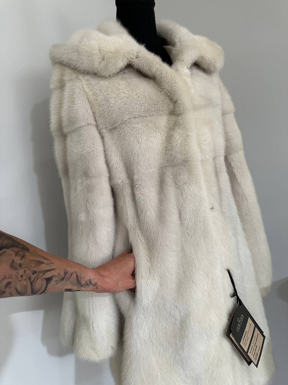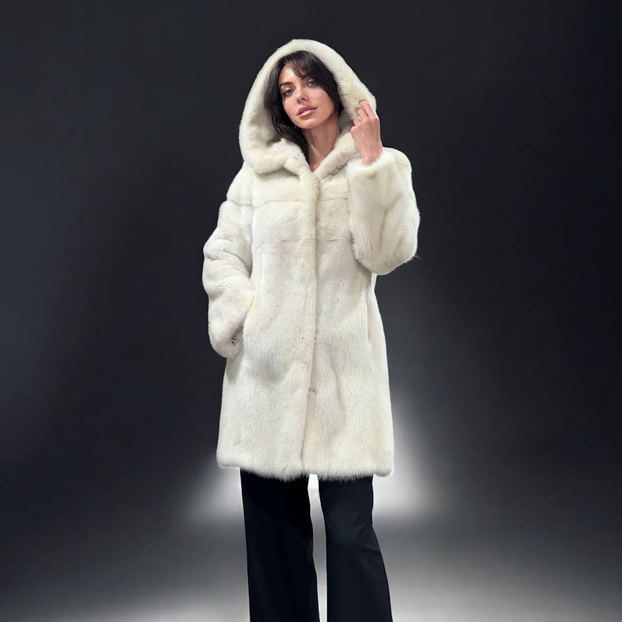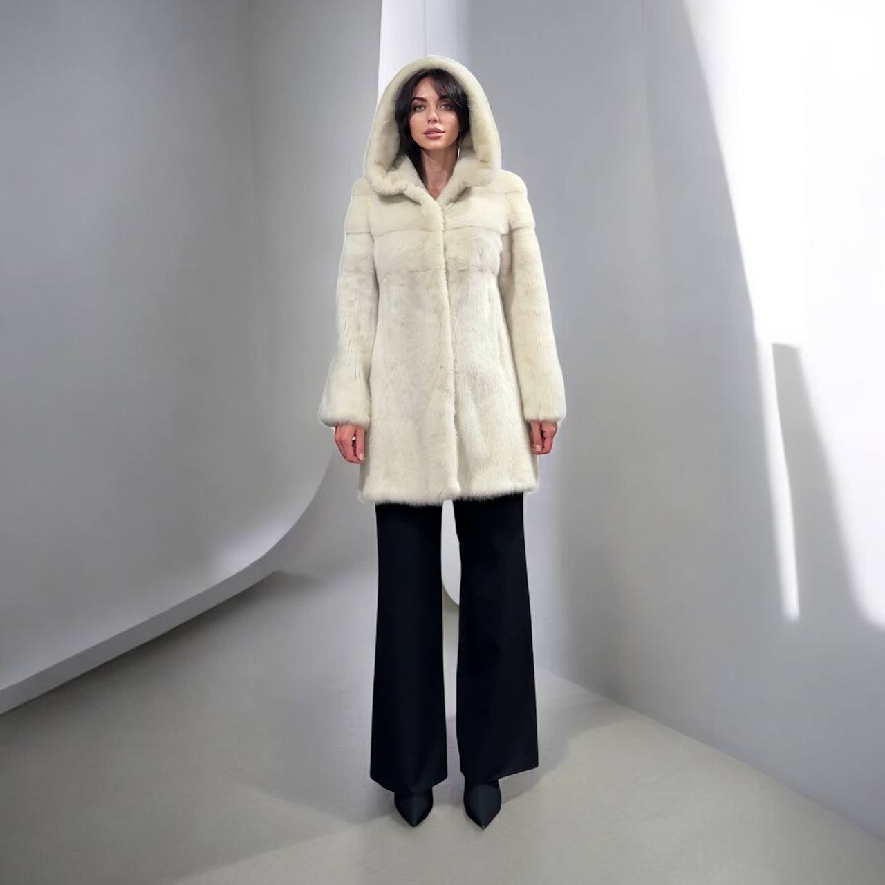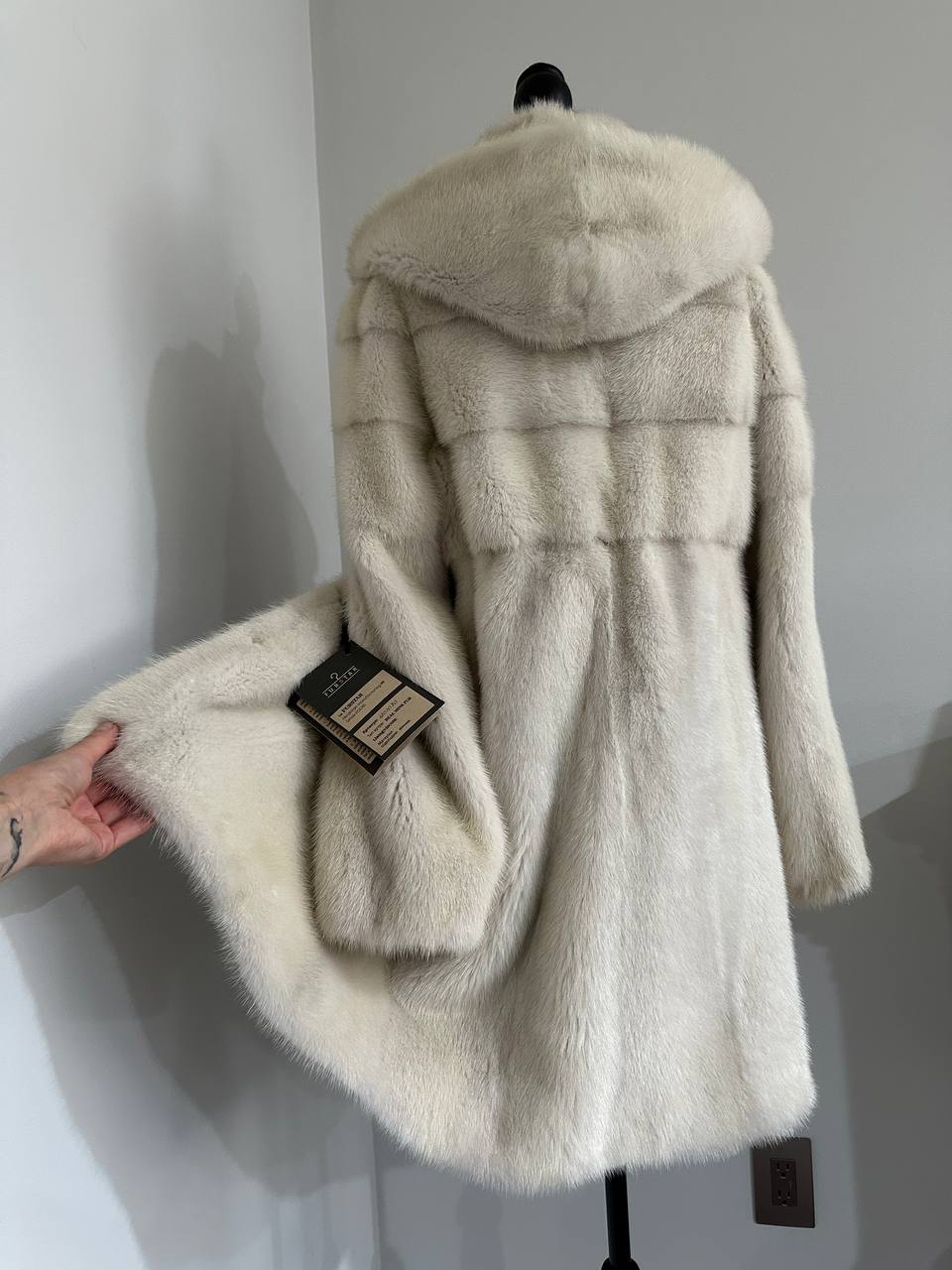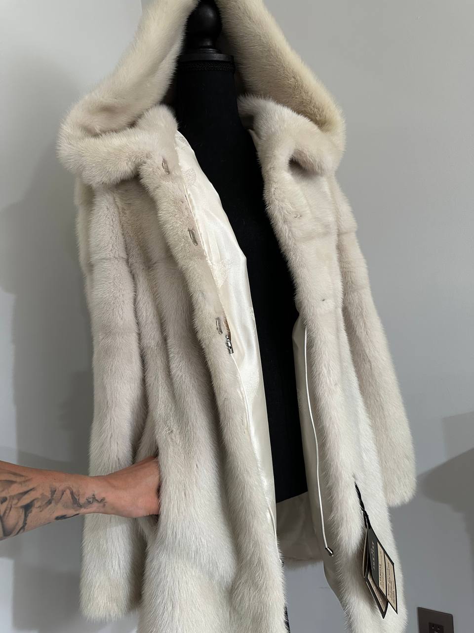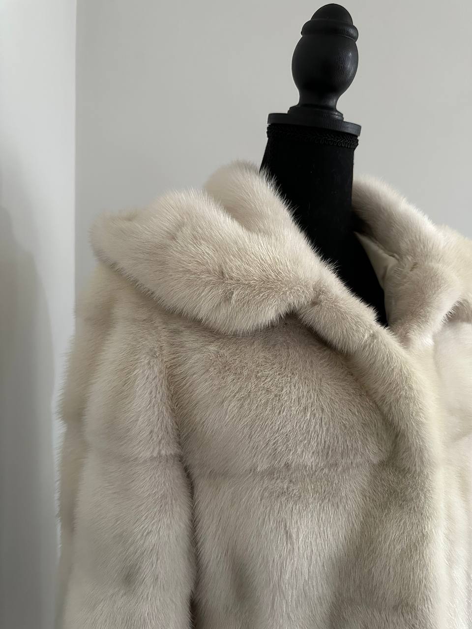 New mink coat size S made of luxurious Finnish mink in ivory color, solid plates with HOOD. natural color. The model is straight, fitted with a drawstring at the waist. There is also a drawstring in sleeves - SEE PHOTOES VIDEO. Manufacturer - Ukraine FURSTAR. There are 2 pockets. Fastens with hooks. The fur is thick, soft, shiny, silky, the fur coat is very warm, a chic model. Viscose lining with a beautiful pattern. The hem is sewn, handmade.