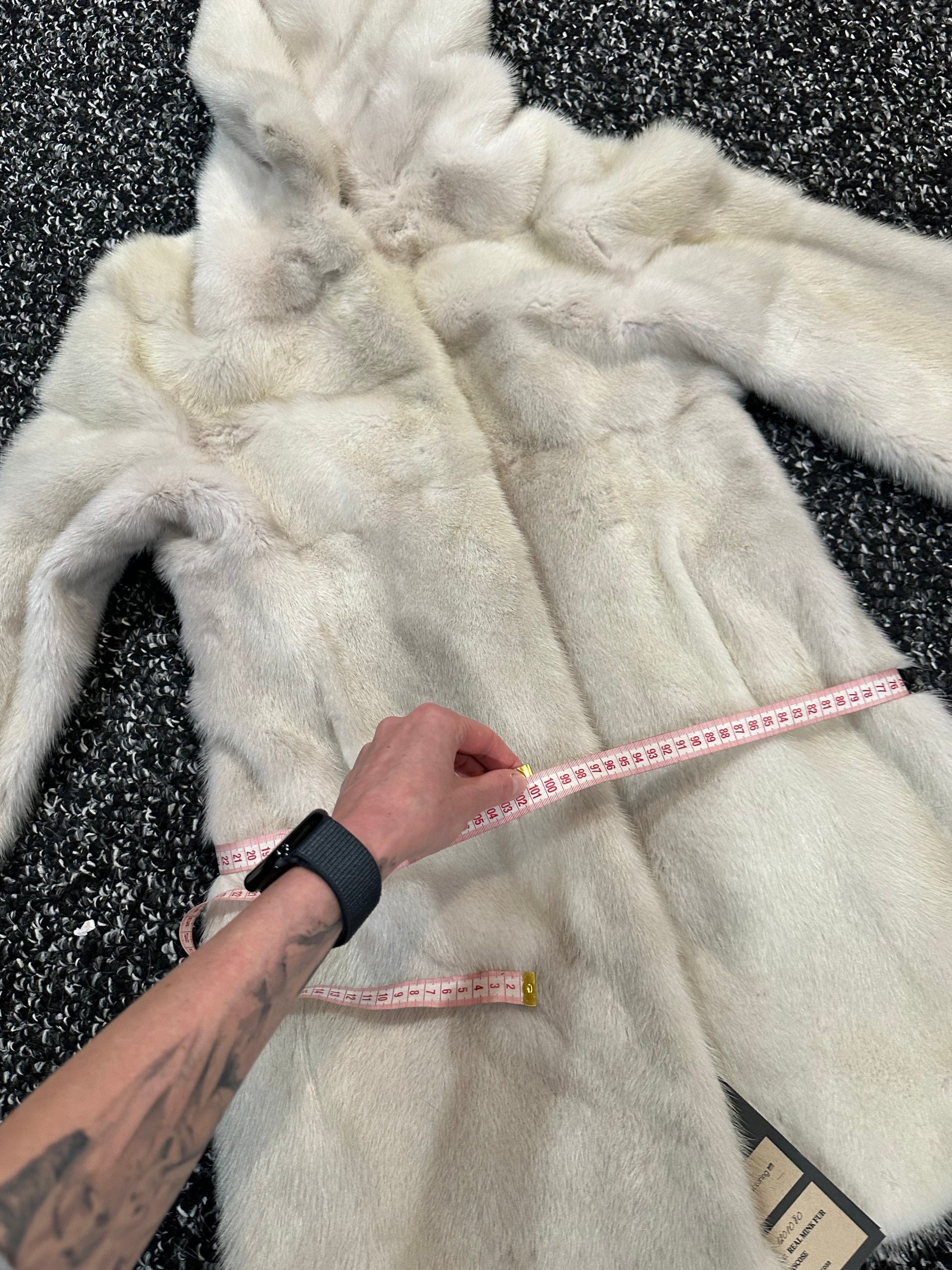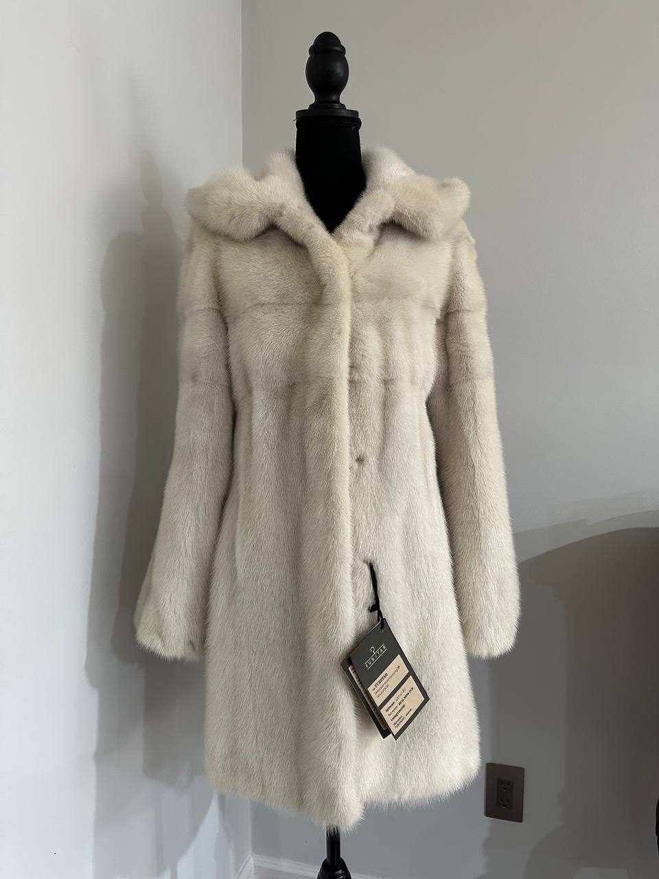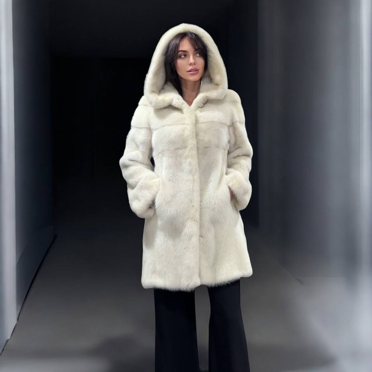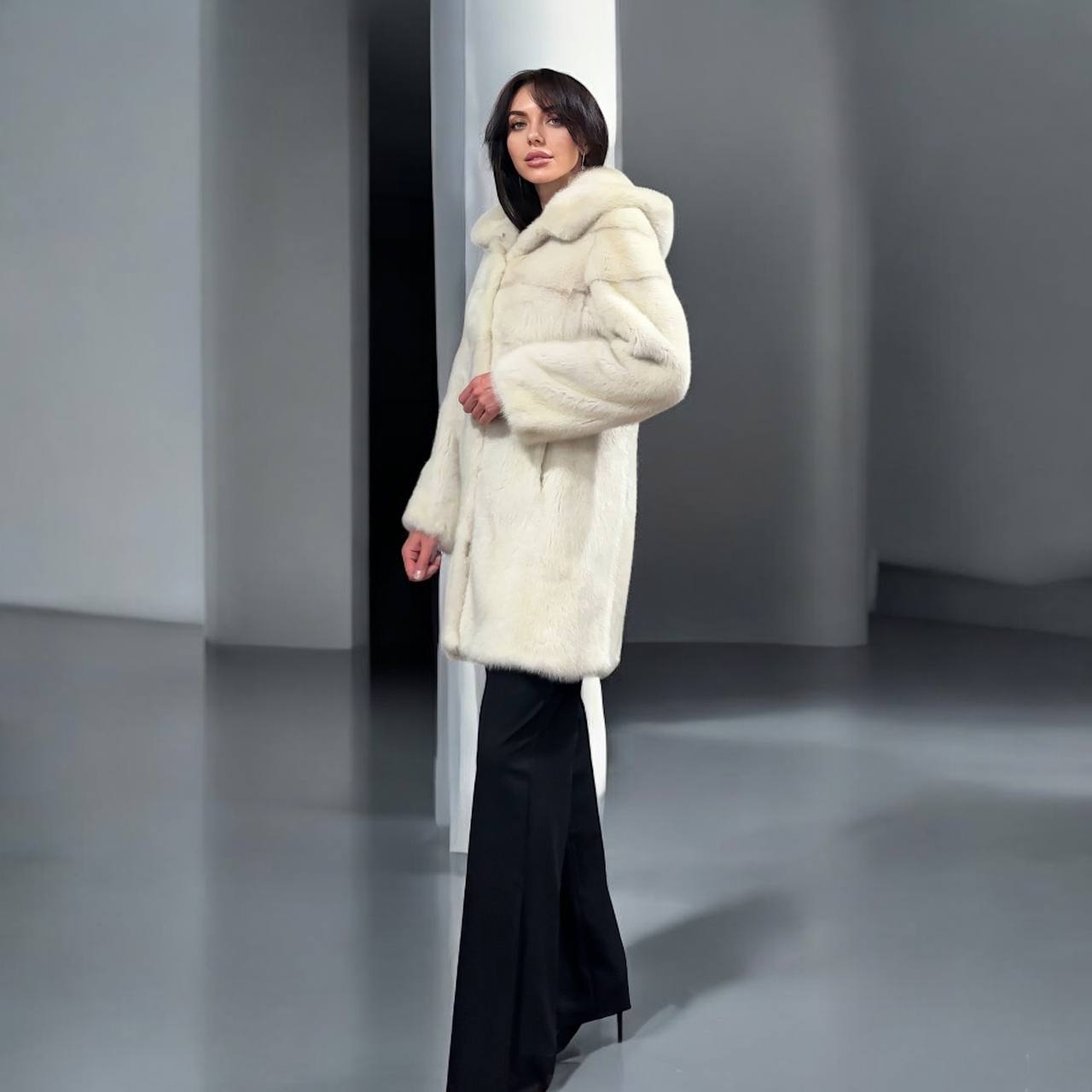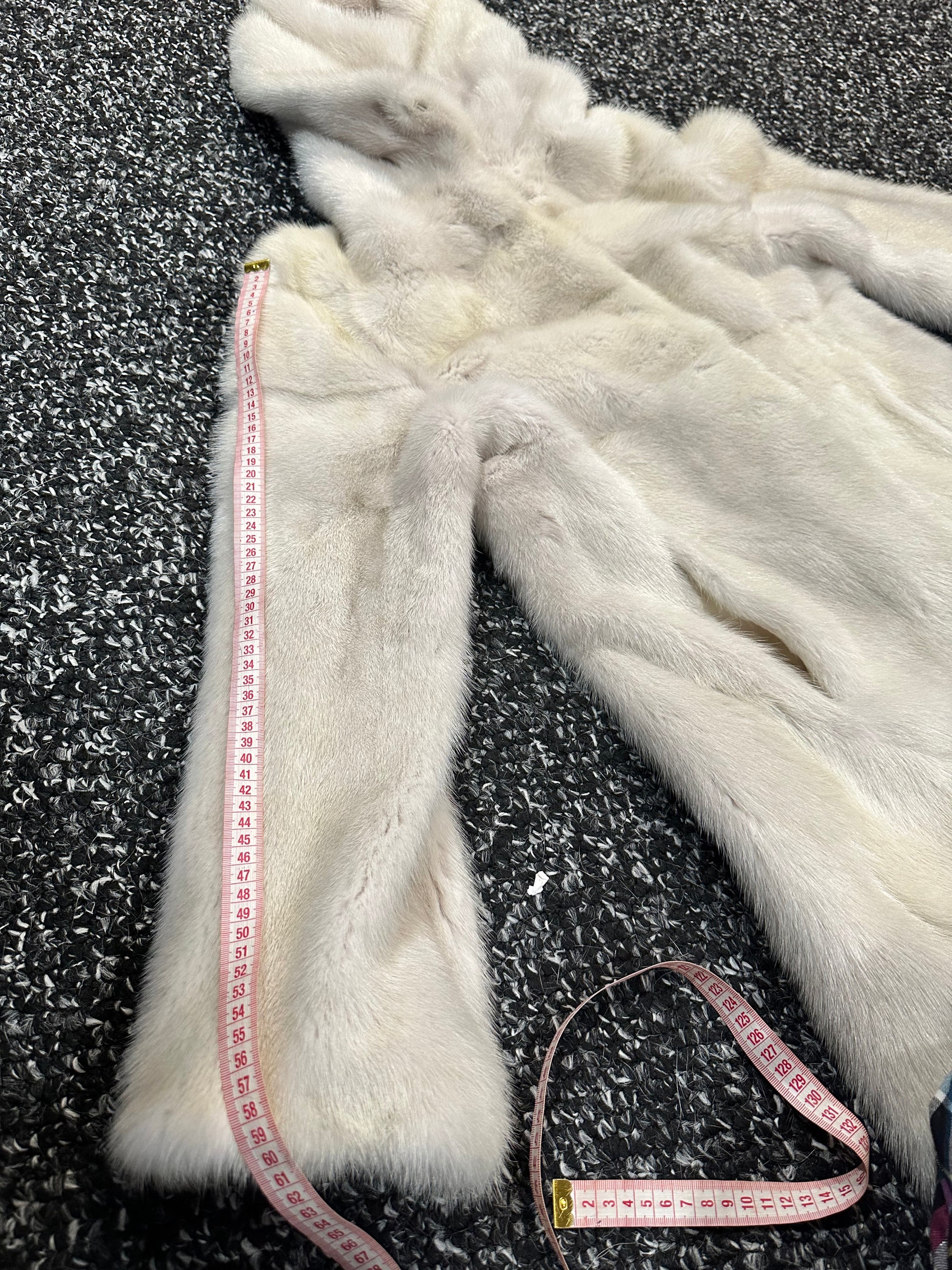 New mink coat size S made of luxurious Finnish mink in ivory color, solid plates with HOOD. natural color. The model is straight, fitted with a drawstring at the waist. There is also a drawstring in sleeves - SEE PHOTOES VIDEO. Manufacturer - Ukraine FURSTAR. There are 2 pockets. Fastens with hooks. The fur is thick, soft, shiny, silky, the fur coat is very warm, a chic model. Viscose lining with a beautiful pattern. The hem is sewn, handmade.