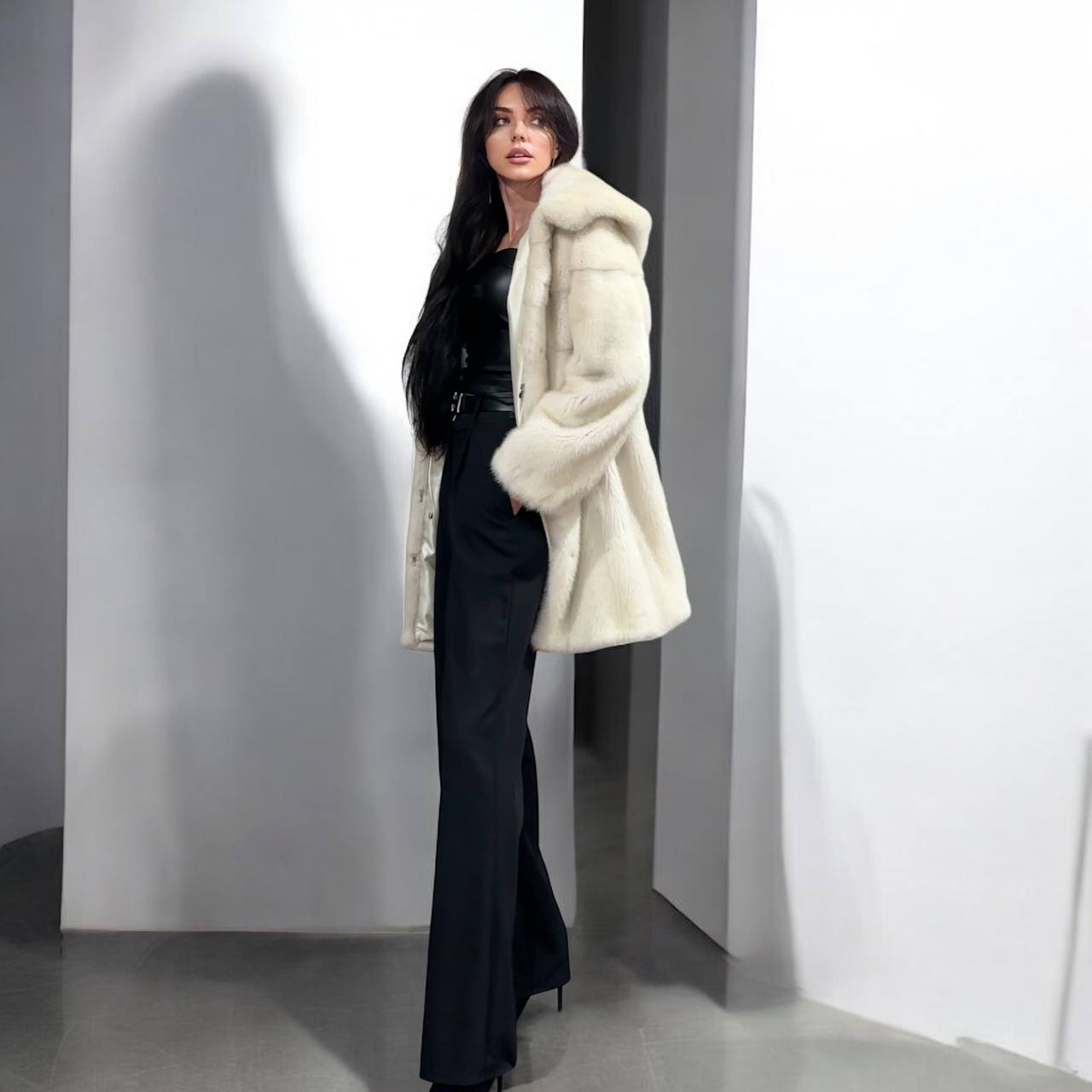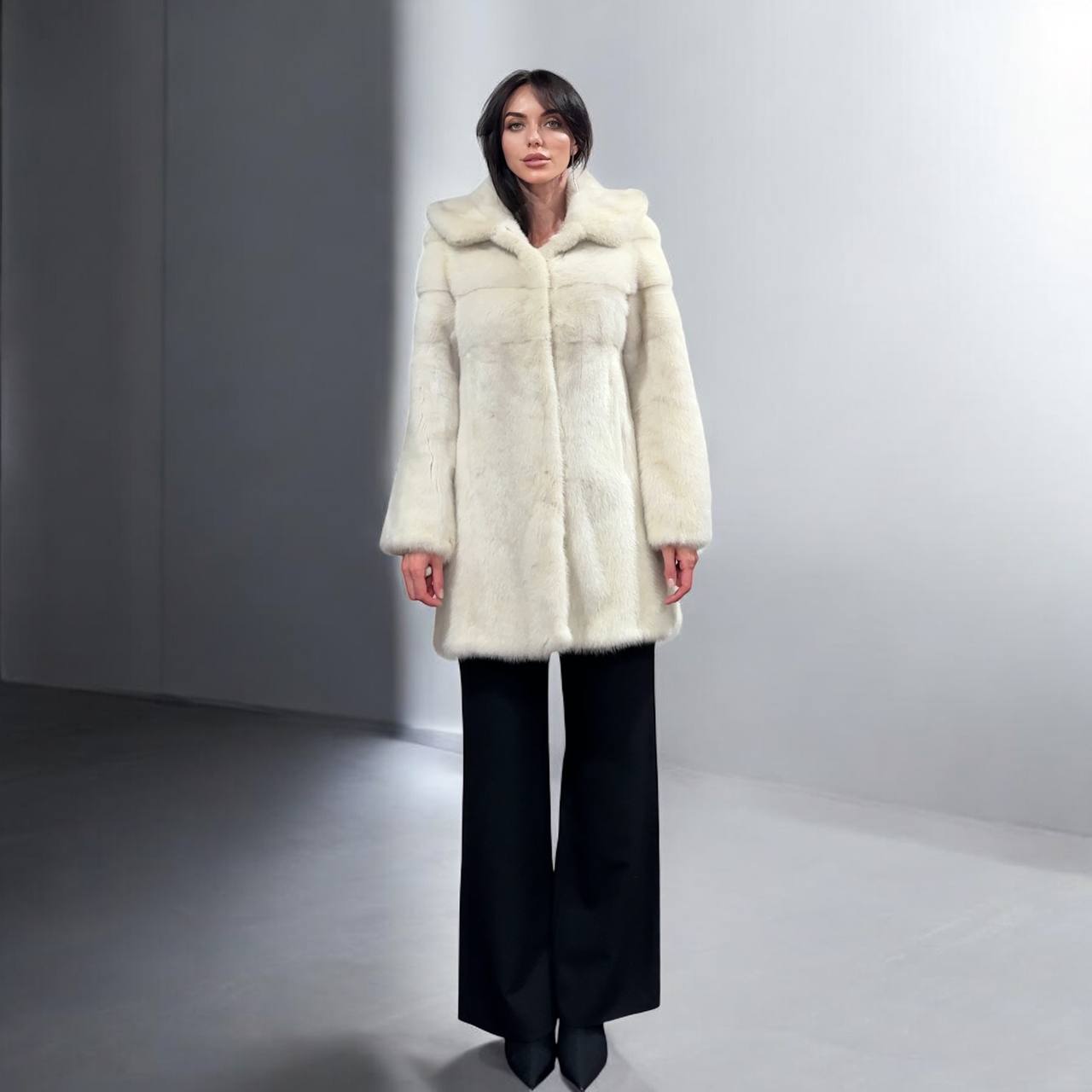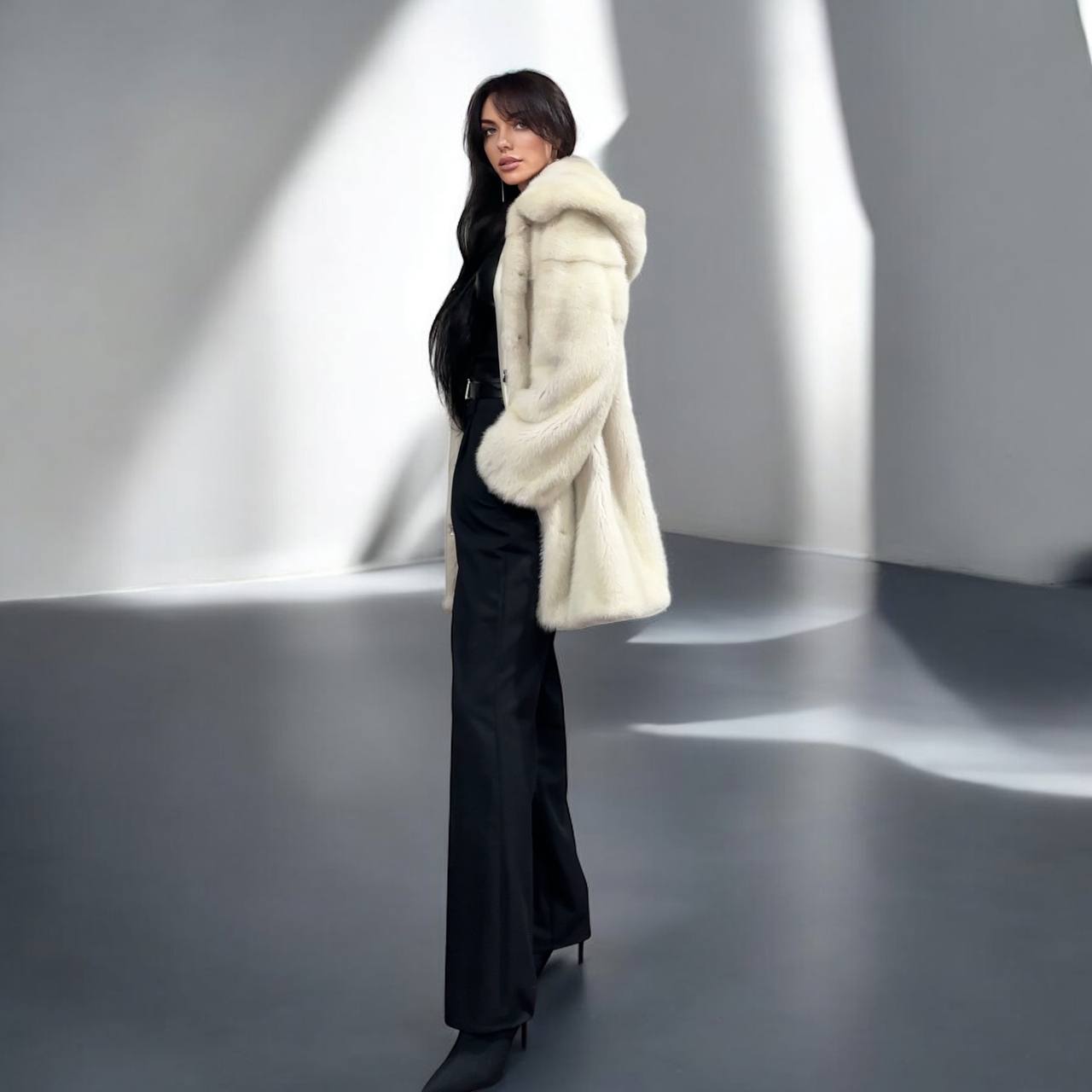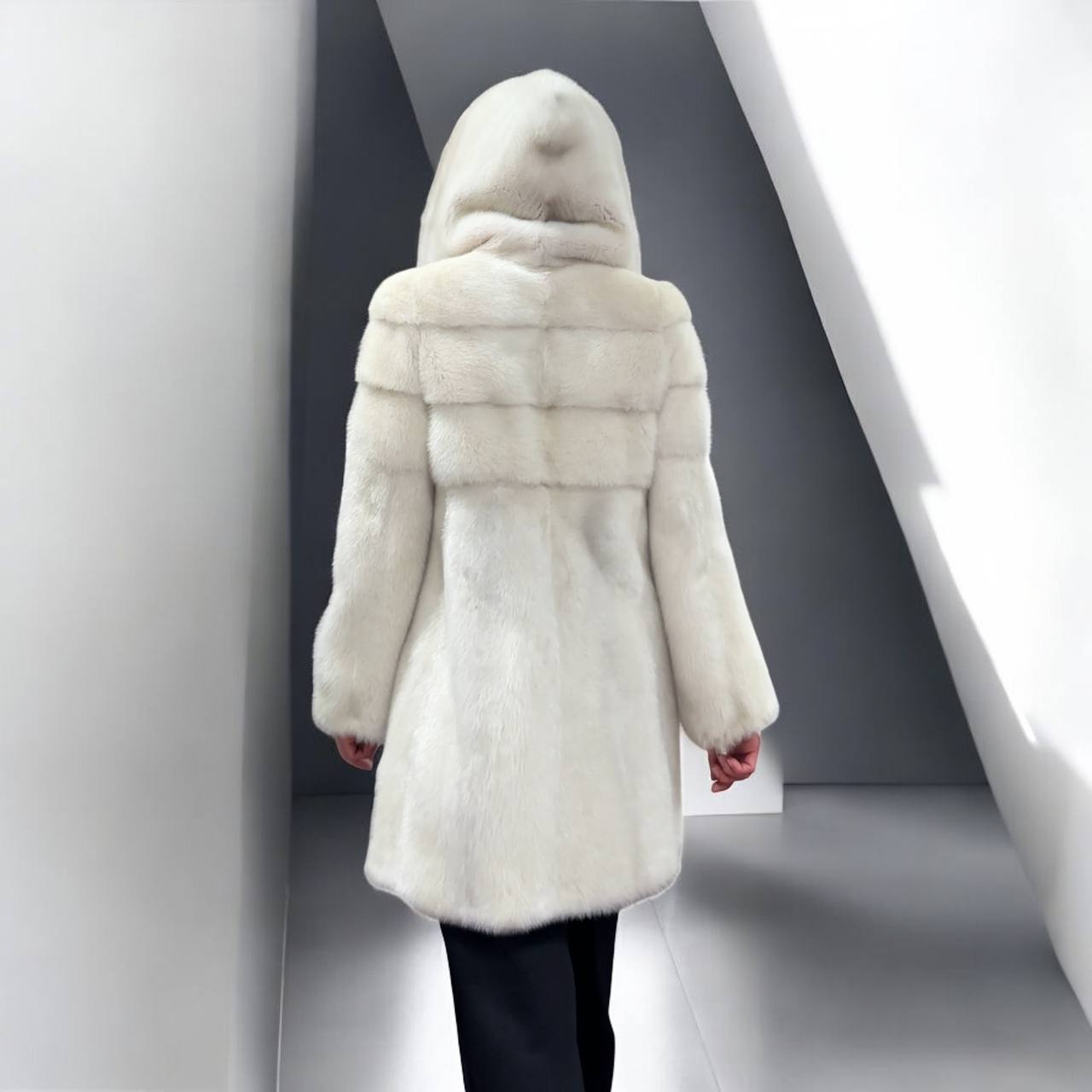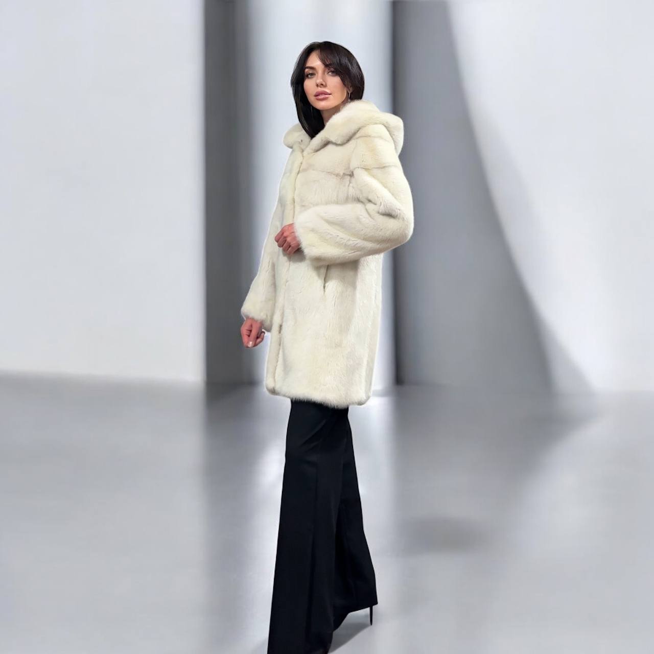 New mink coat size S made of luxurious Finnish mink in ivory color, solid plates with HOOD. natural color. The model is straight, fitted with a drawstring at the waist. There is also a drawstring in sleeves - SEE PHOTOES VIDEO. Manufacturer - Ukraine FURSTAR. There are 2 pockets. Fastens with hooks. The fur is thick, soft, shiny, silky, the fur coat is very warm, a chic model. Viscose lining with a beautiful pattern. The hem is sewn, handmade.