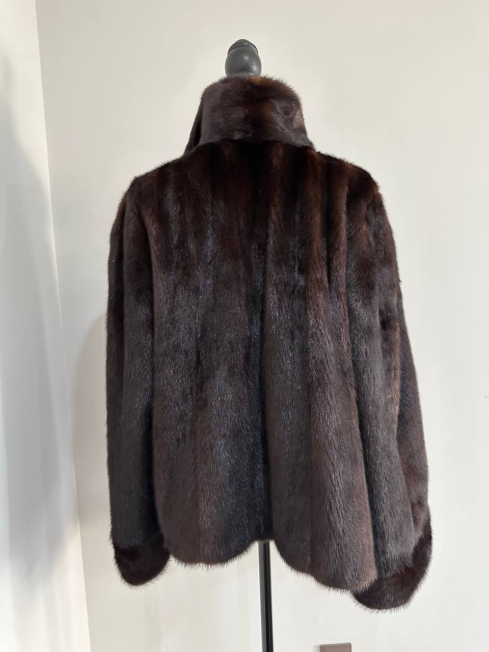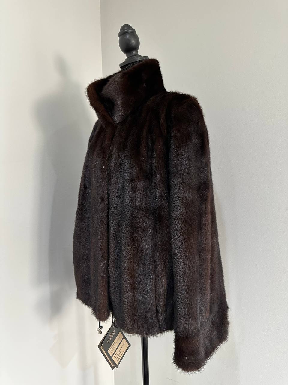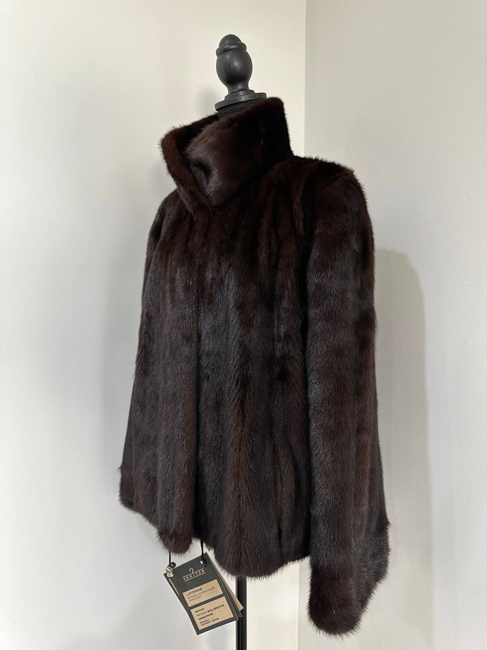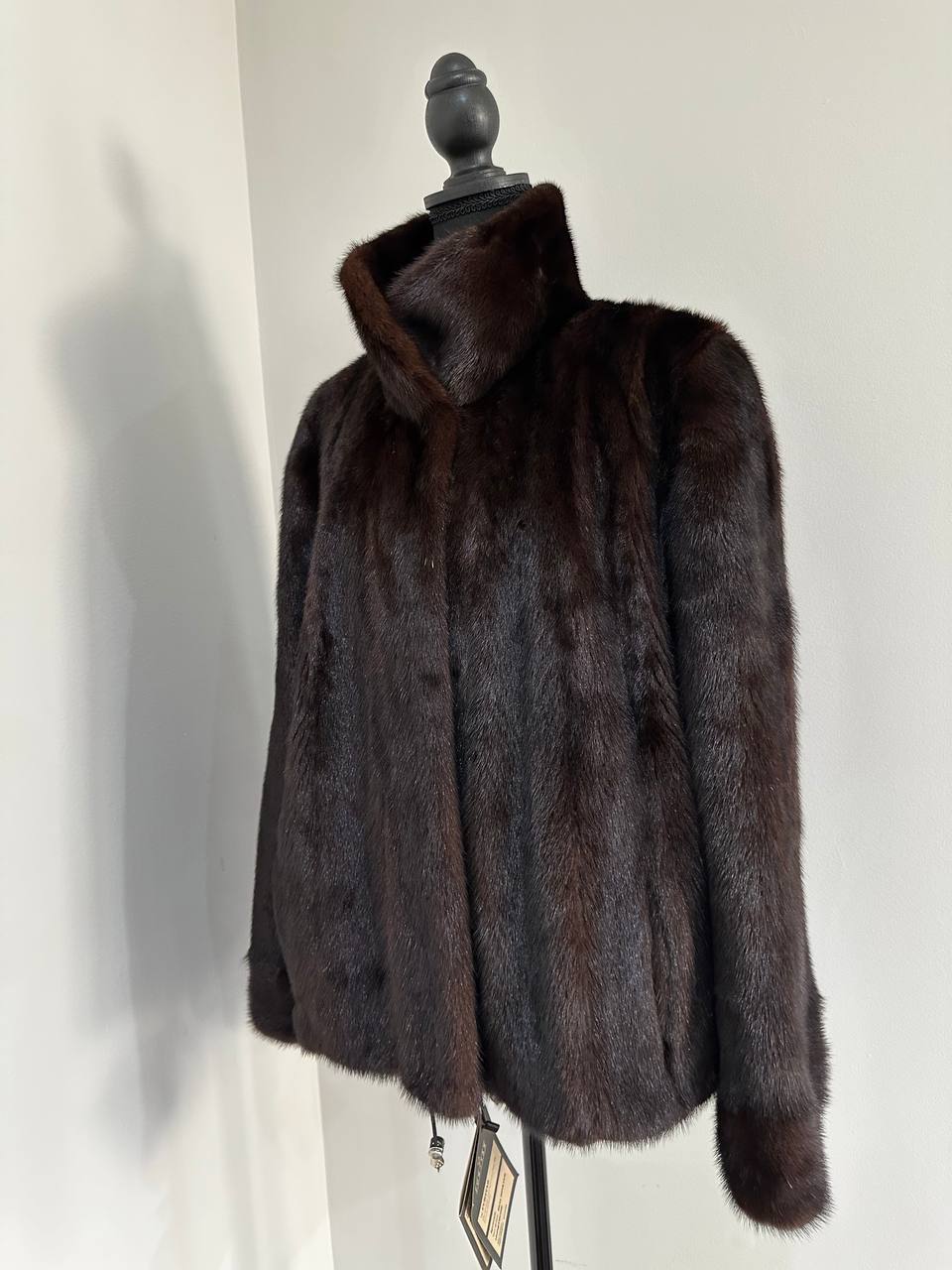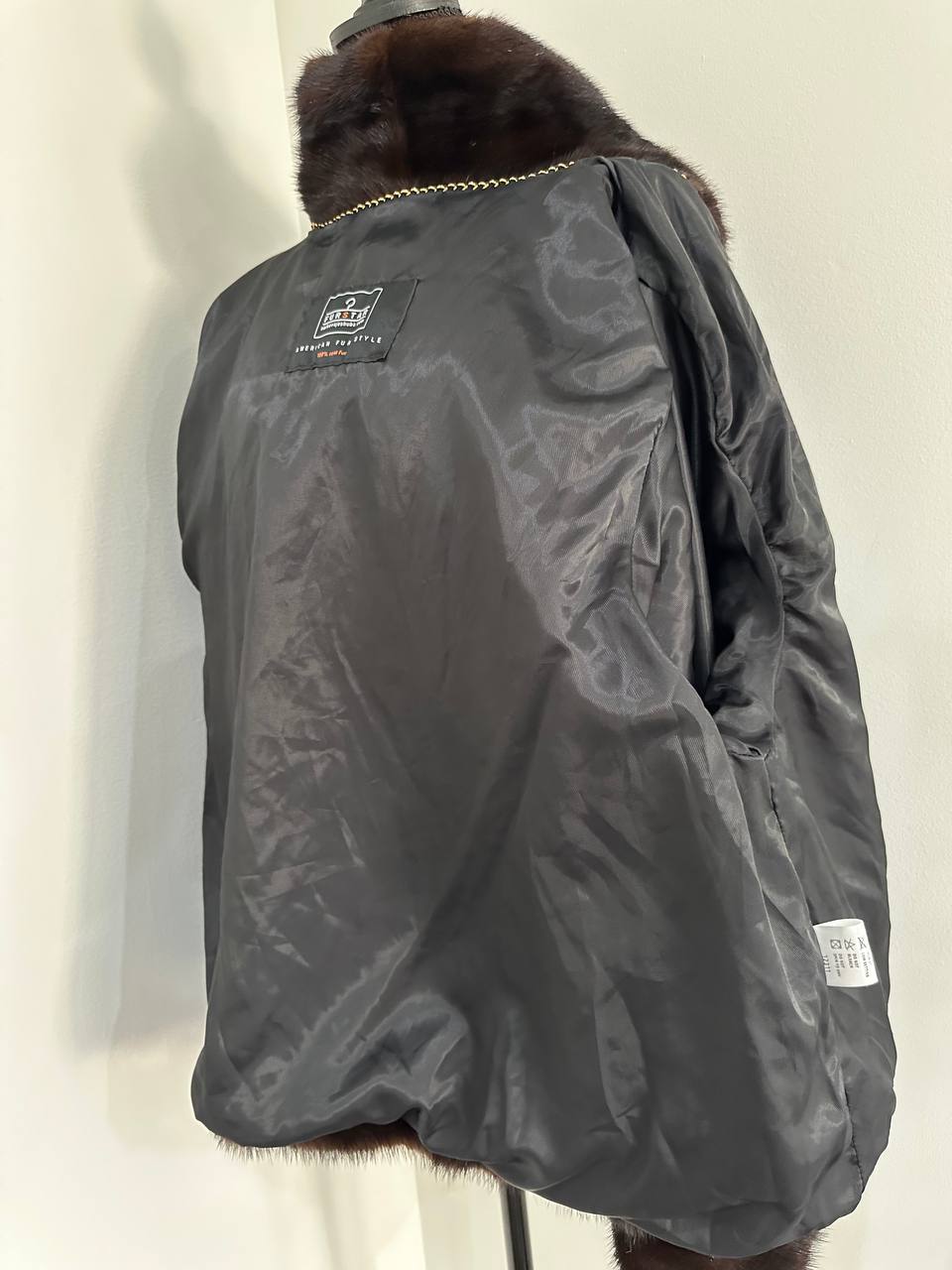 Women's stylish short Real fur coat 2XL size made of natural dark brown mink, natural fur color. The model is a bomber jacket, an internal drawstring is sewn on the bottom of the product. Stand collar. There are 2 pockets. The fur is thick, soft, shiny, silky. Fastens with hooks. Viscose lining, sewn on hem - handmade. Producer - Ukrainian brand FURSTAR