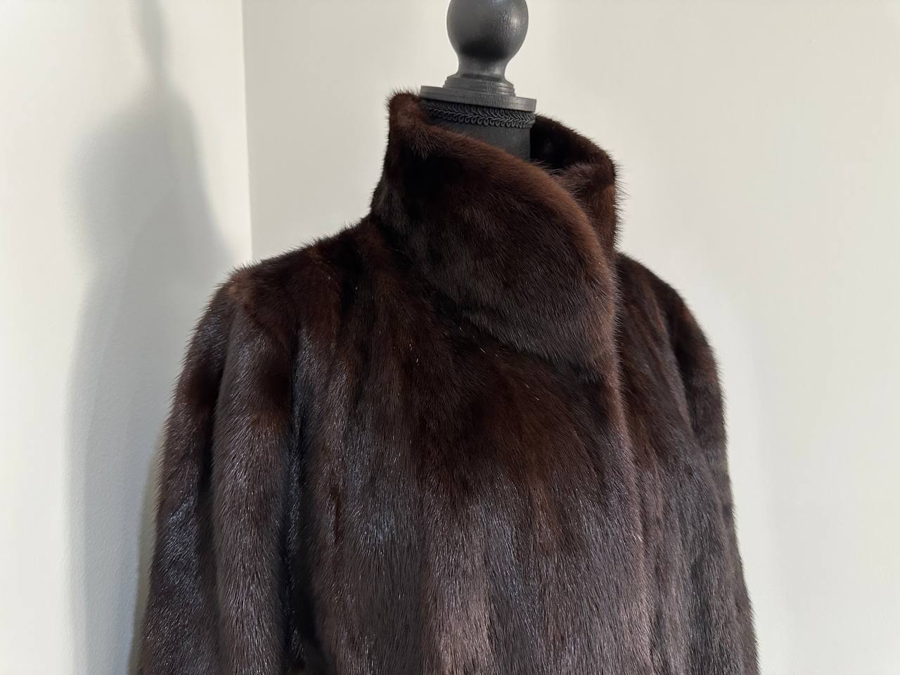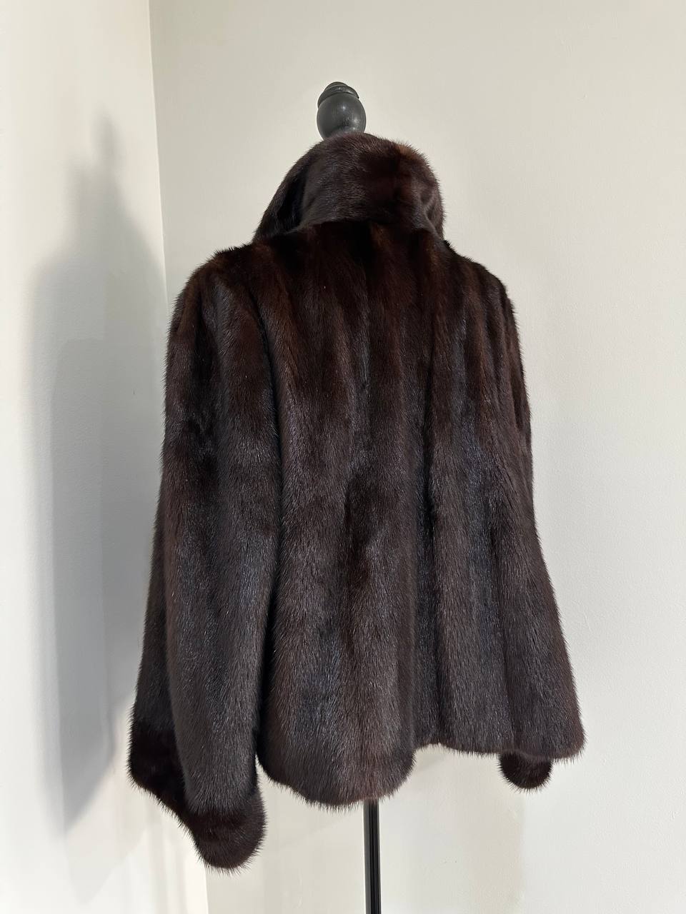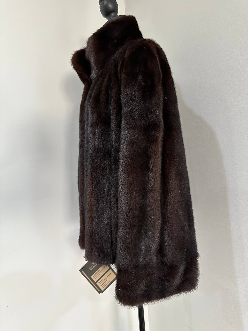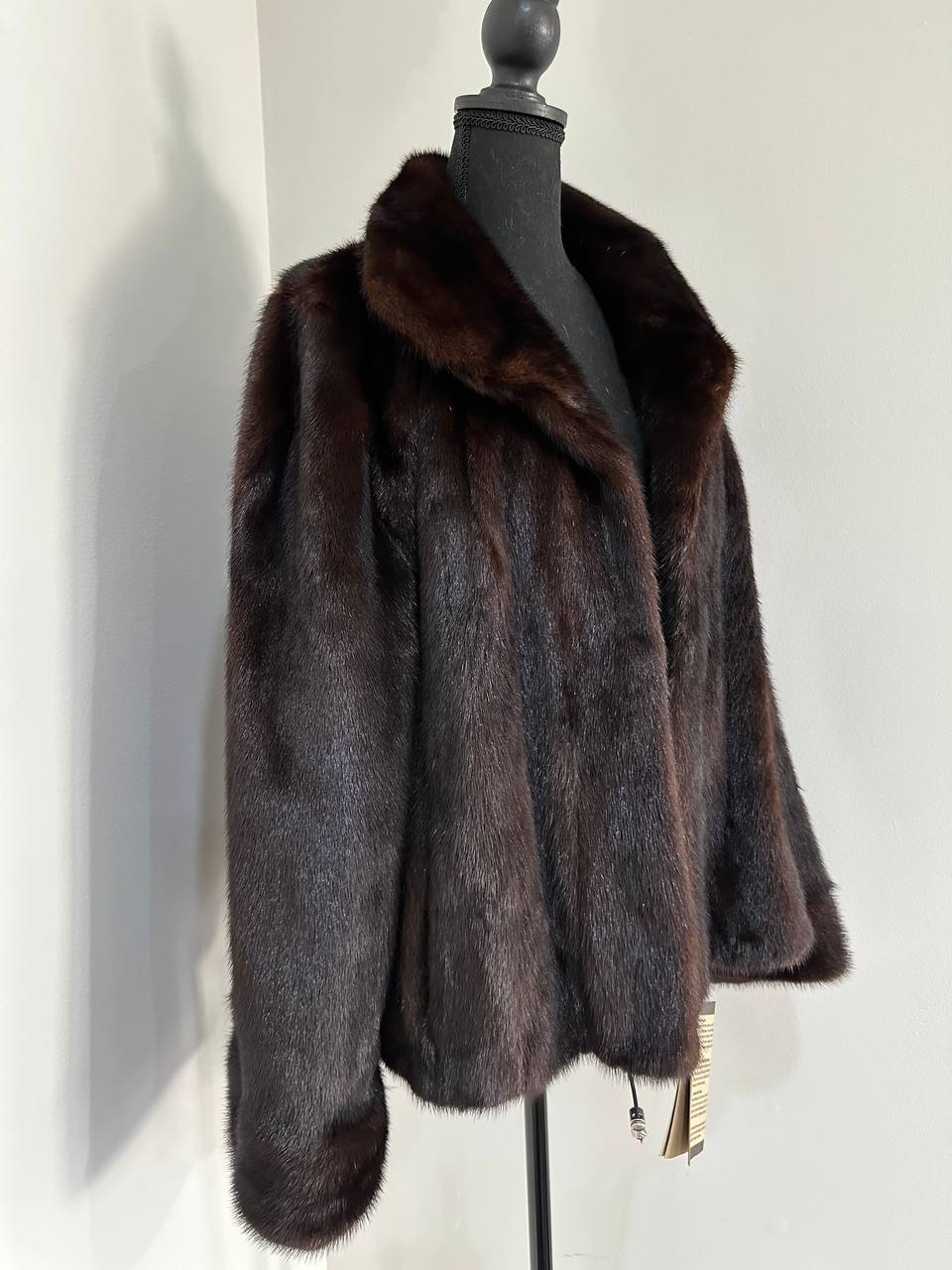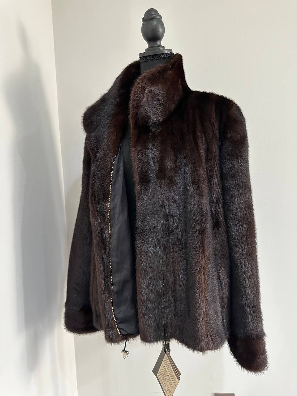 Women's stylish short Real fur coat 2XL size made of natural dark brown mink, natural fur color. The model is a bomber jacket, an internal drawstring is sewn on the bottom of the product. Stand collar. There are 2 pockets. The fur is thick, soft, shiny, silky. Fastens with hooks. Viscose lining, sewn on hem - handmade. Producer - Ukrainian brand FURSTAR