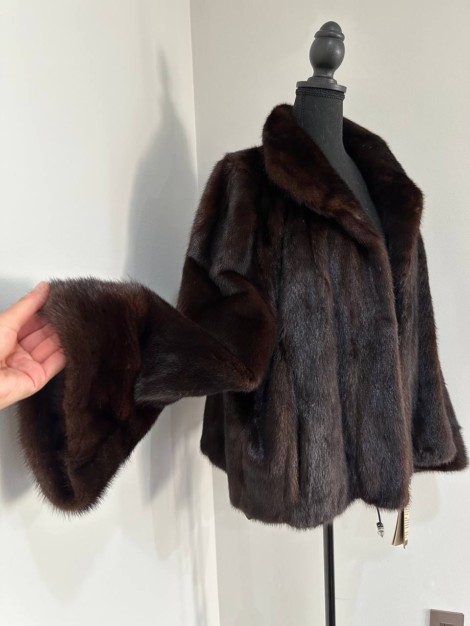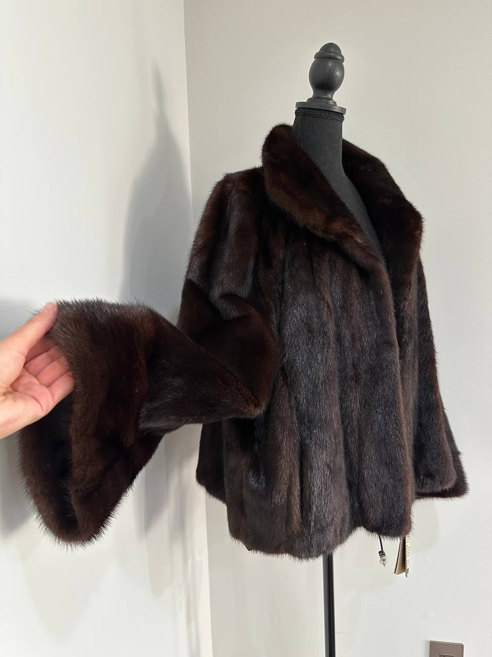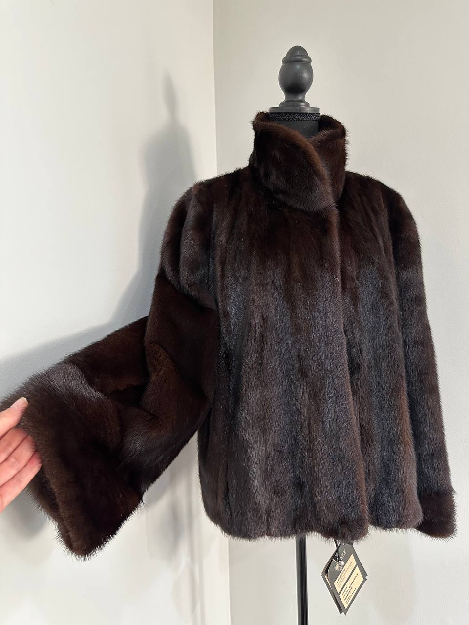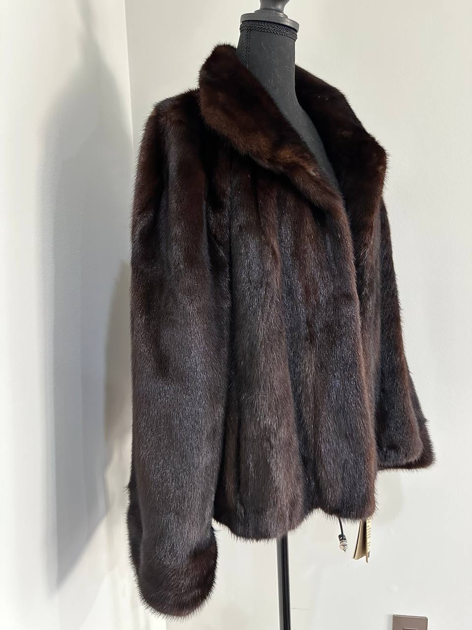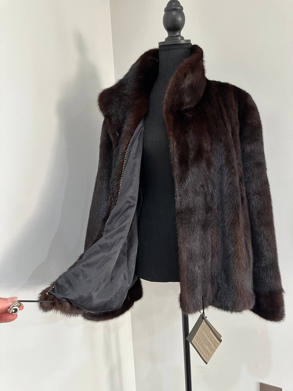 Women's stylish short Real fur coat 2XL size made of natural dark brown mink, natural fur color. The model is a bomber jacket, an internal drawstring is sewn on the bottom of the product. Stand collar. There are 2 pockets. The fur is thick, soft, shiny, silky. Fastens with hooks. Viscose lining, sewn on hem - handmade. Producer - Ukrainian brand FURSTAR