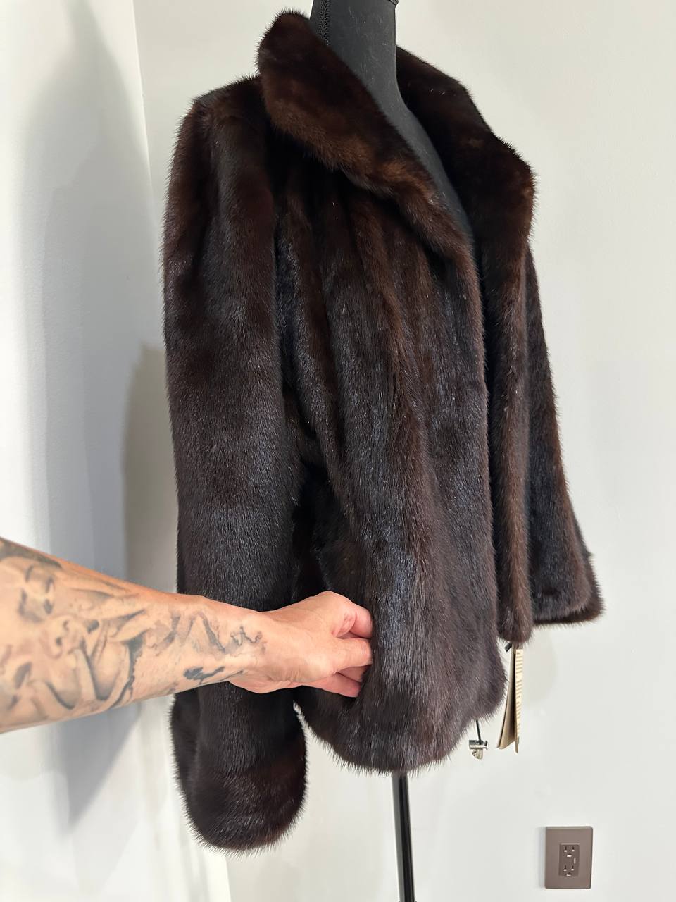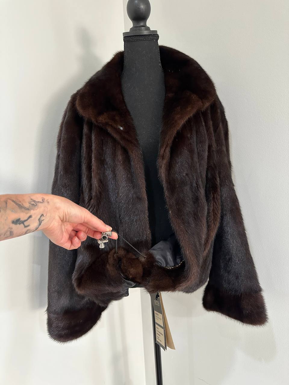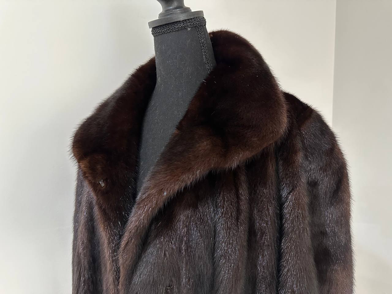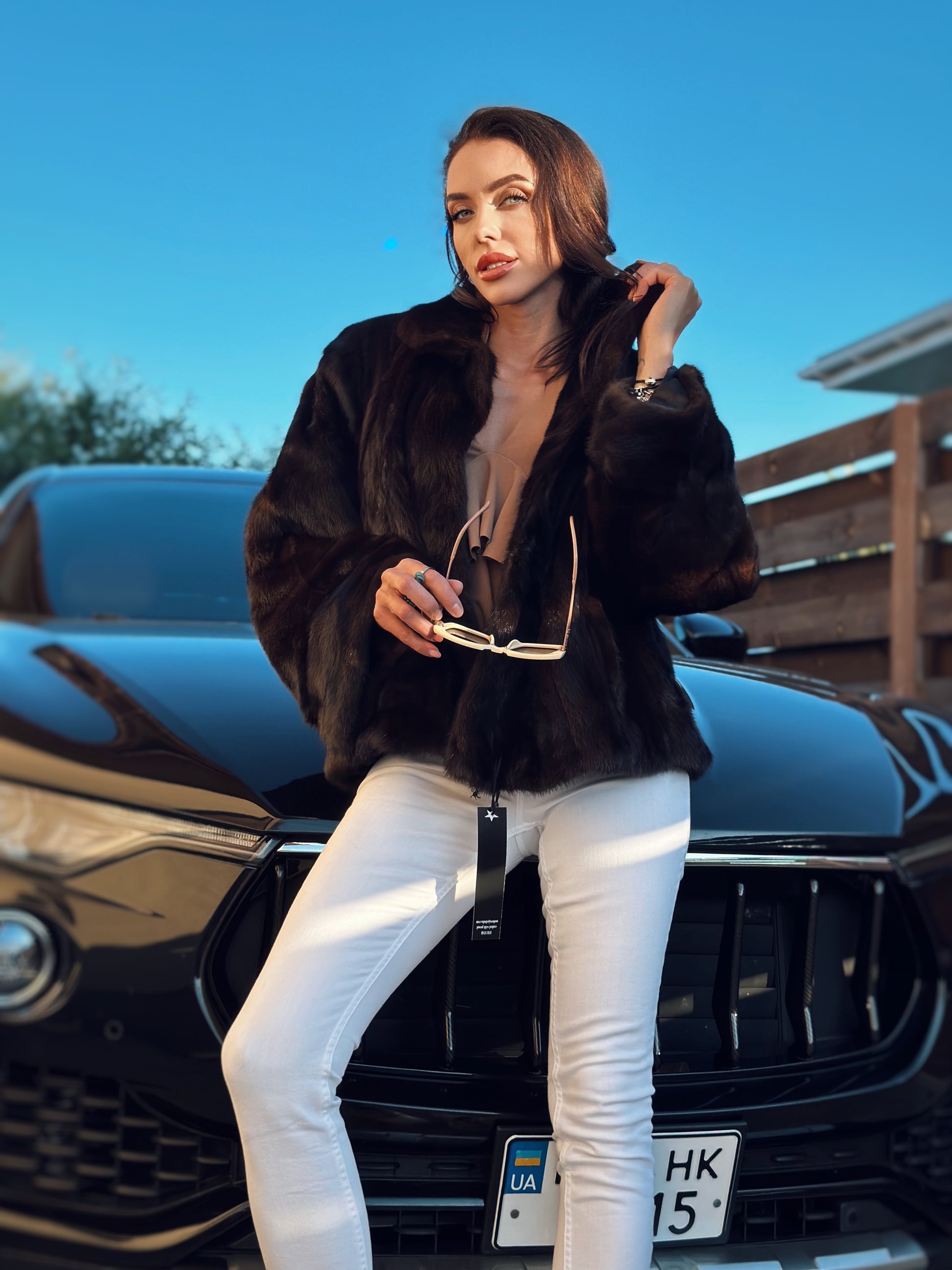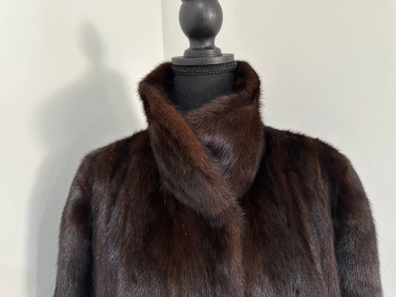 Women's stylish short Real fur coat 2XL size made of natural dark brown mink, natural fur color. The model is a bomber jacket, an internal drawstring is sewn on the bottom of the product. Stand collar. There are 2 pockets. The fur is thick, soft, shiny, silky. Fastens with hooks. Viscose lining, sewn on hem - handmade. Producer - Ukrainian brand FURSTAR