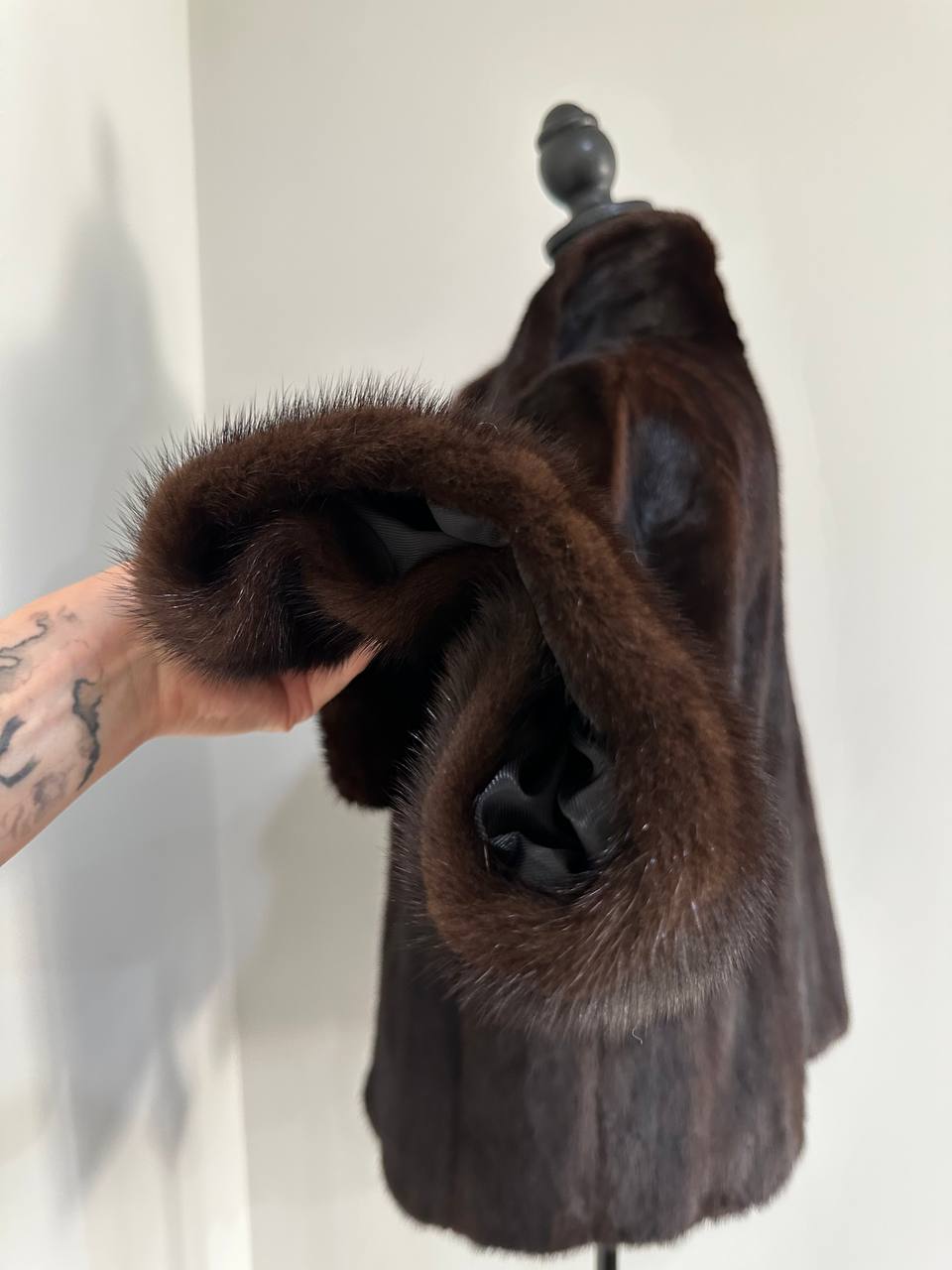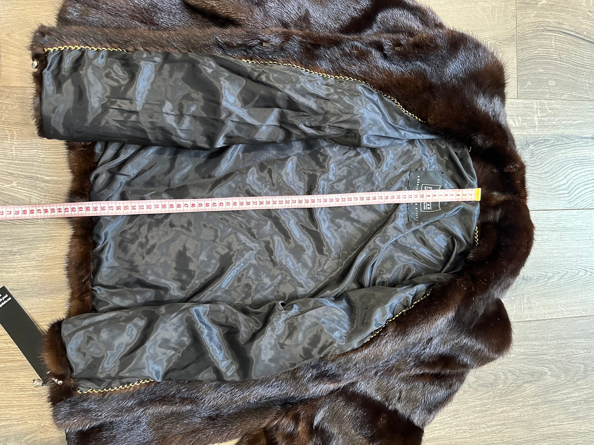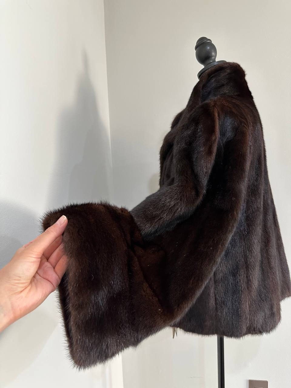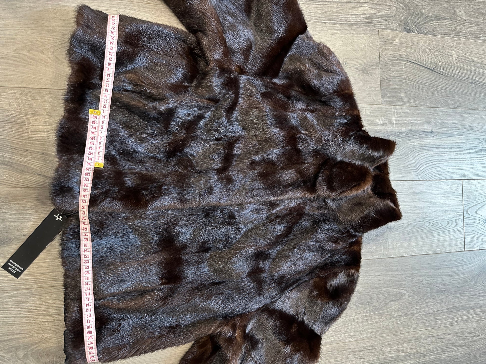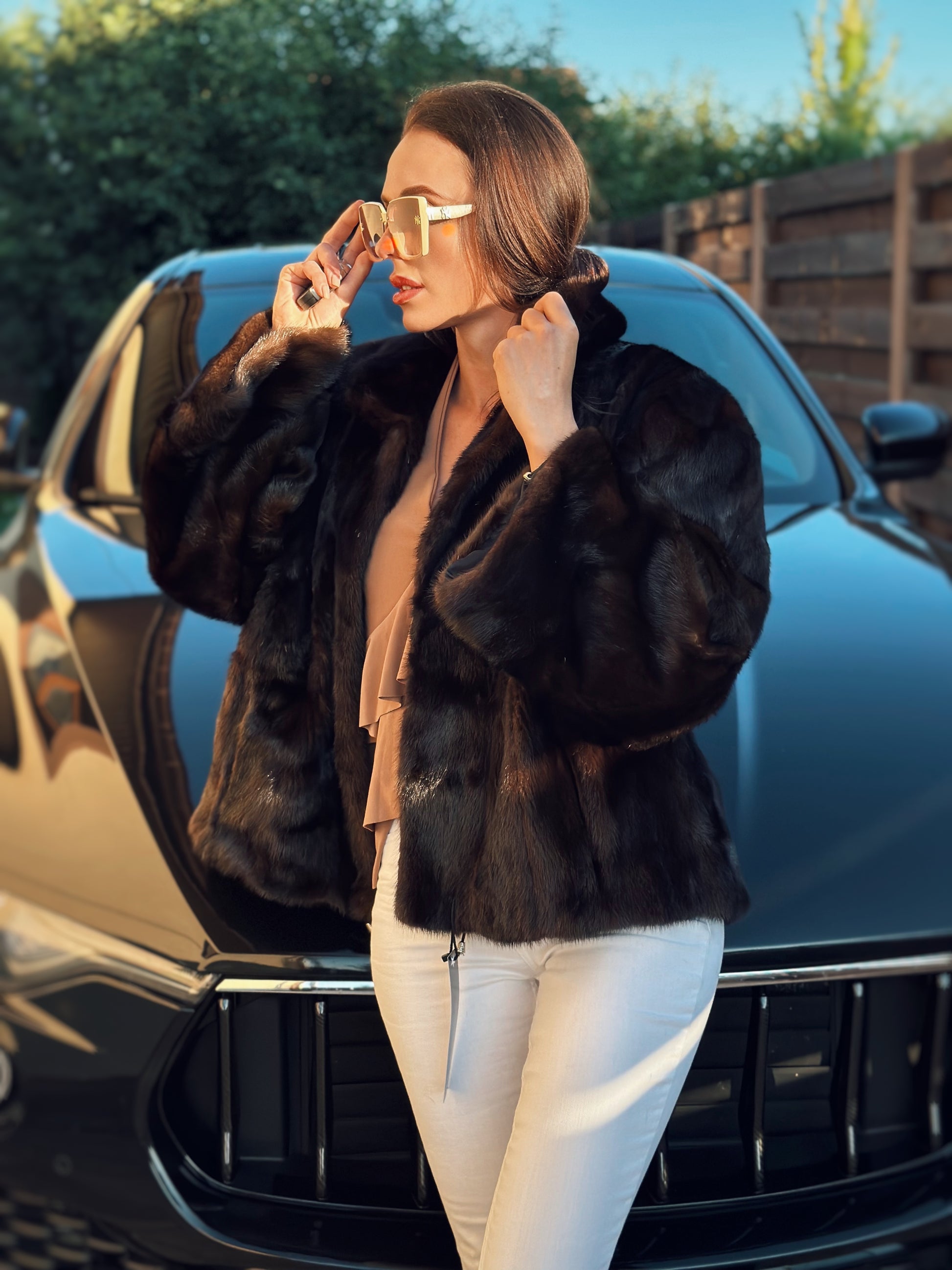 Women's stylish short Real fur coat 2XL size made of natural dark brown mink, natural fur color. The model is a bomber jacket, an internal drawstring is sewn on the bottom of the product. Stand collar. There are 2 pockets. The fur is thick, soft, shiny, silky. Fastens with hooks. Viscose lining, sewn on hem - handmade. Producer - Ukrainian brand FURSTAR
