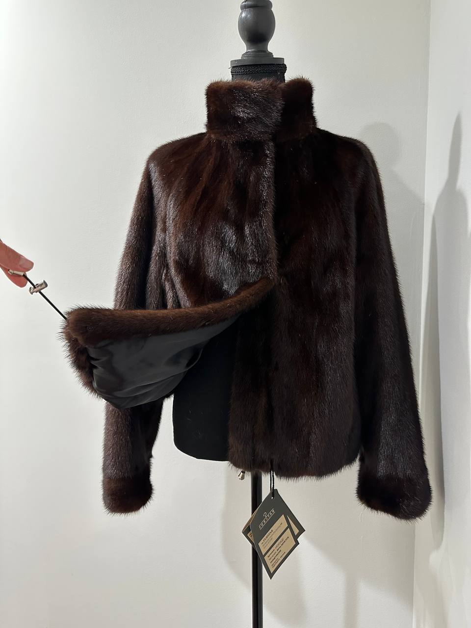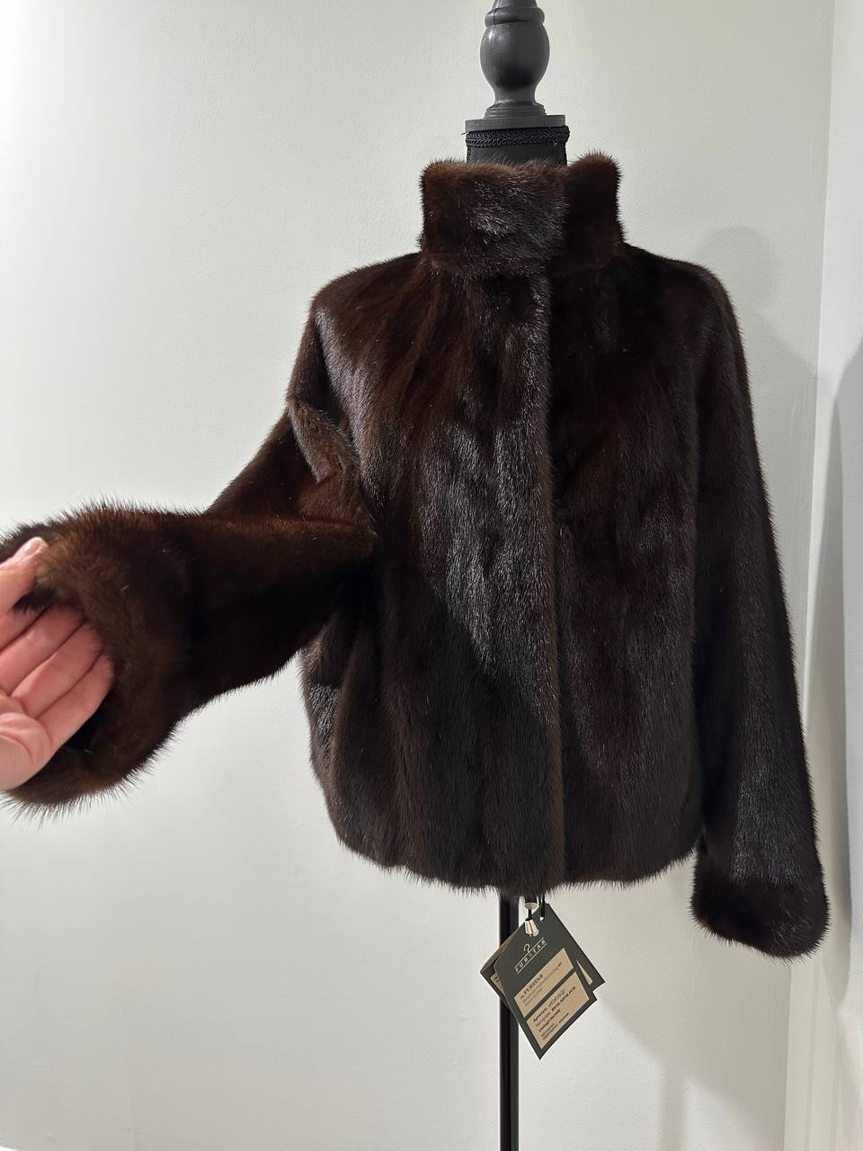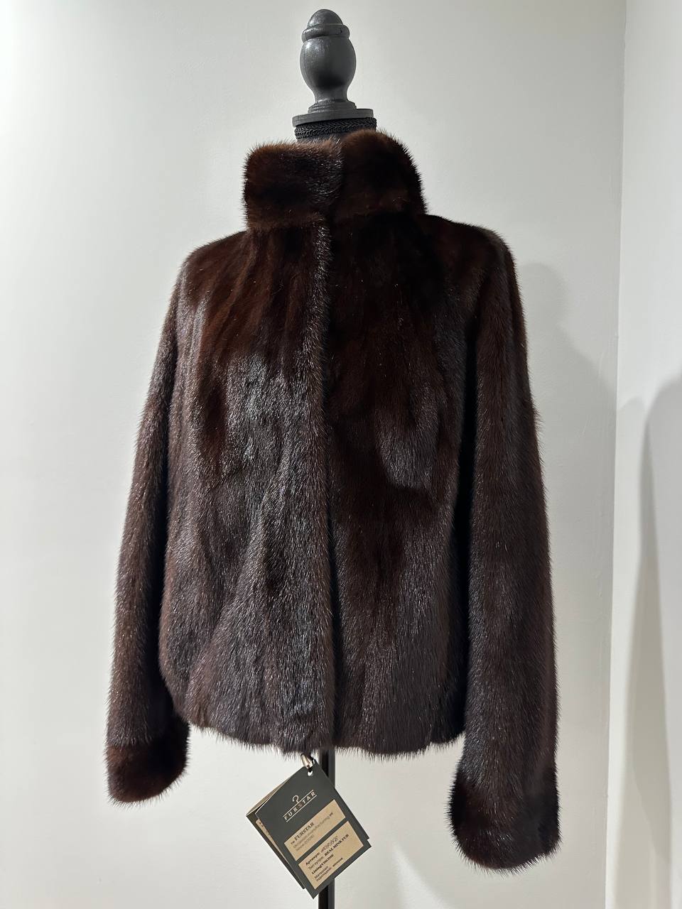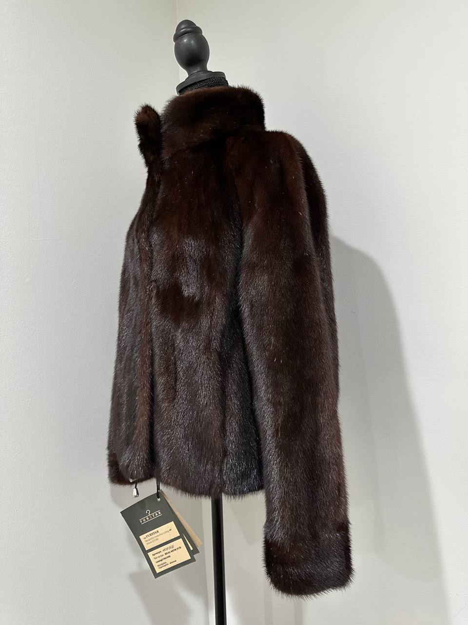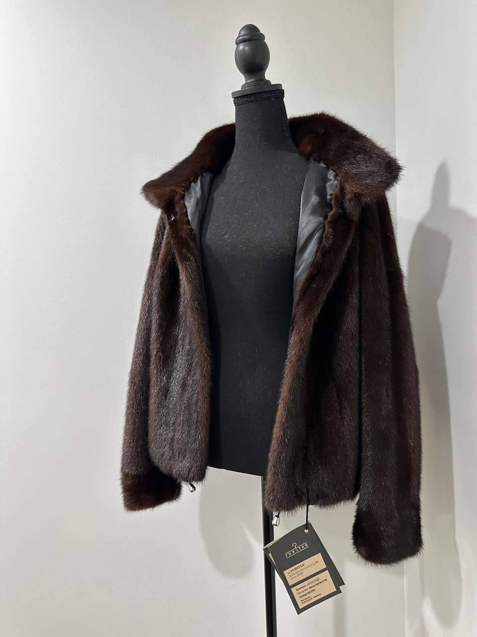 Women's stylish short BOMBER fur coat L size made of natural dark brown mink, natural fur color. The model is a bomber jacket, an internal drawstring is sewn on the bottom of the product. Stand collar. There are 2 pockets. The fur is thick, soft, shiny, silky. Fastened with hooks. Viscose lining, section sewn - handmade. Producer - Ukrainian. A variety of mink - Canadian.