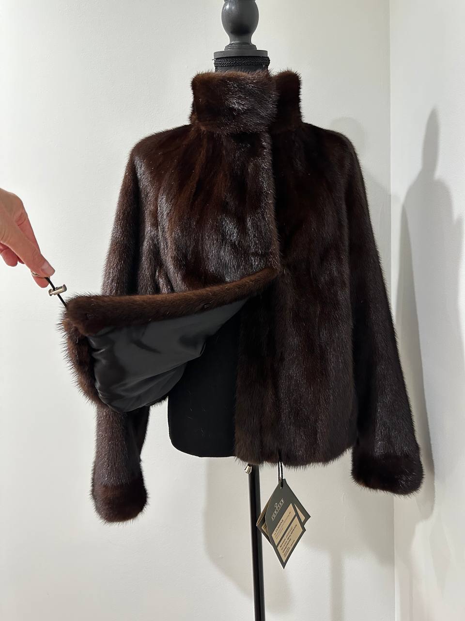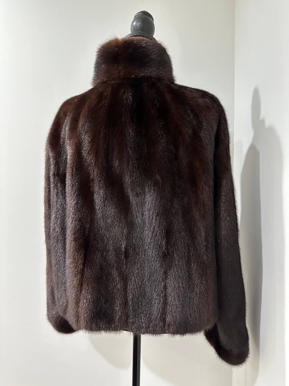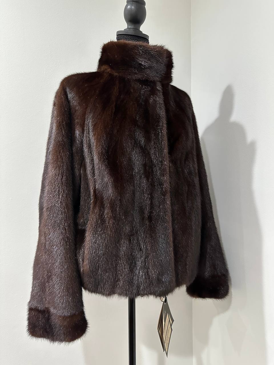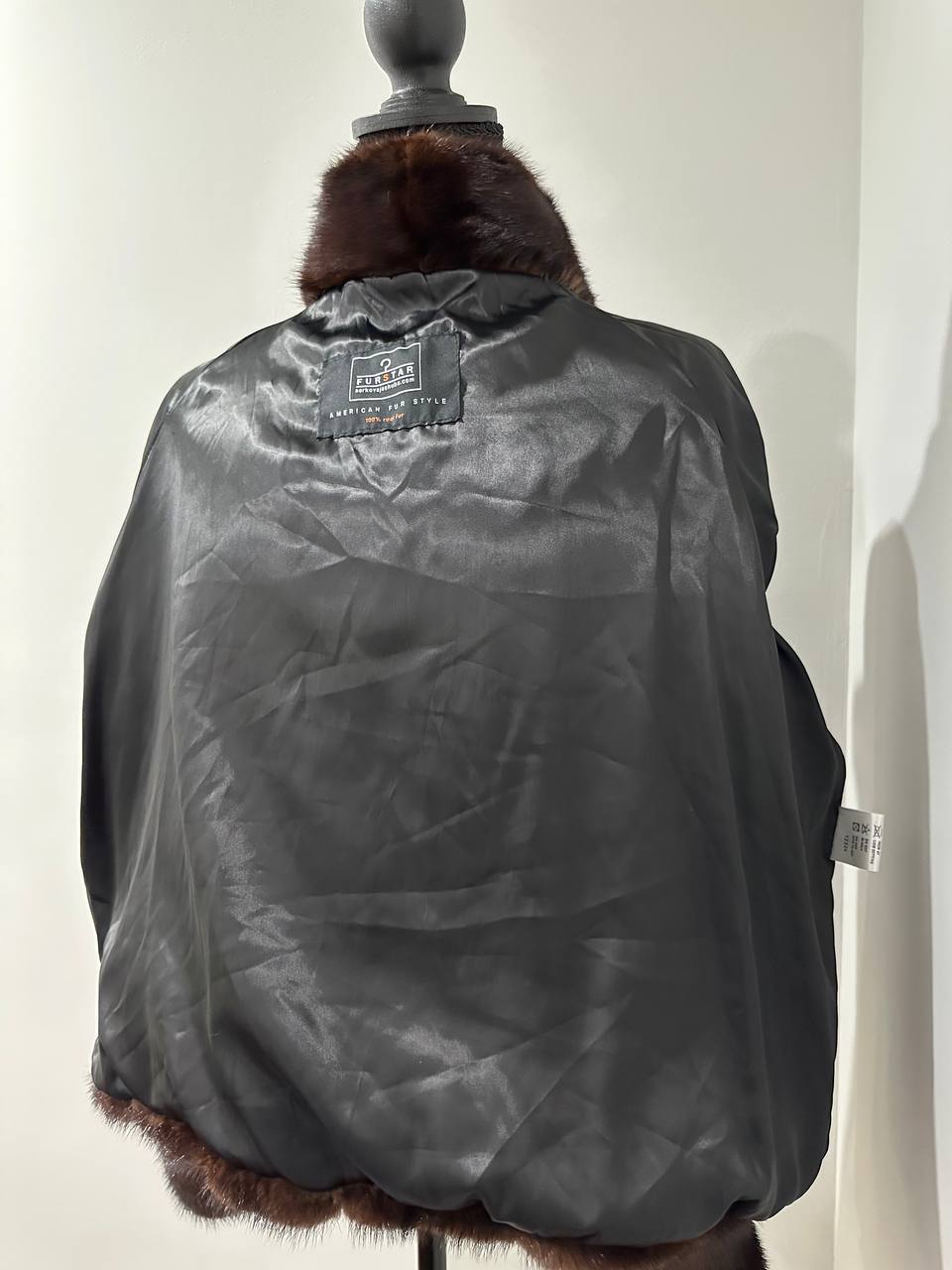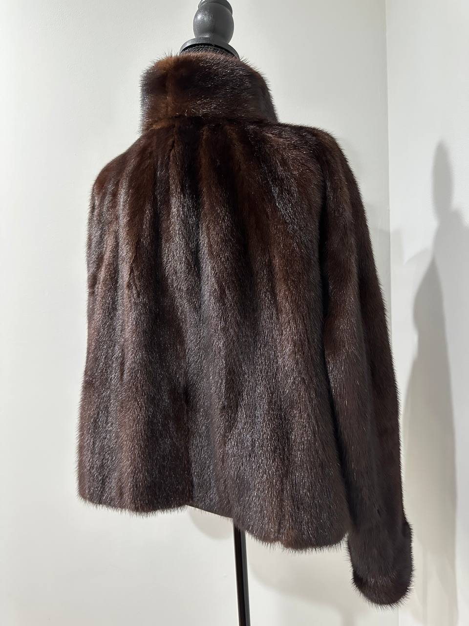 Women's stylish short BOMBER fur coat L size made of natural dark brown mink, natural fur color. The model is a bomber jacket, an internal drawstring is sewn on the bottom of the product. Stand collar. There are 2 pockets. The fur is thick, soft, shiny, silky. Fastened with hooks. Viscose lining, section sewn - handmade. Producer - Ukrainian. A variety of mink - Canadian.