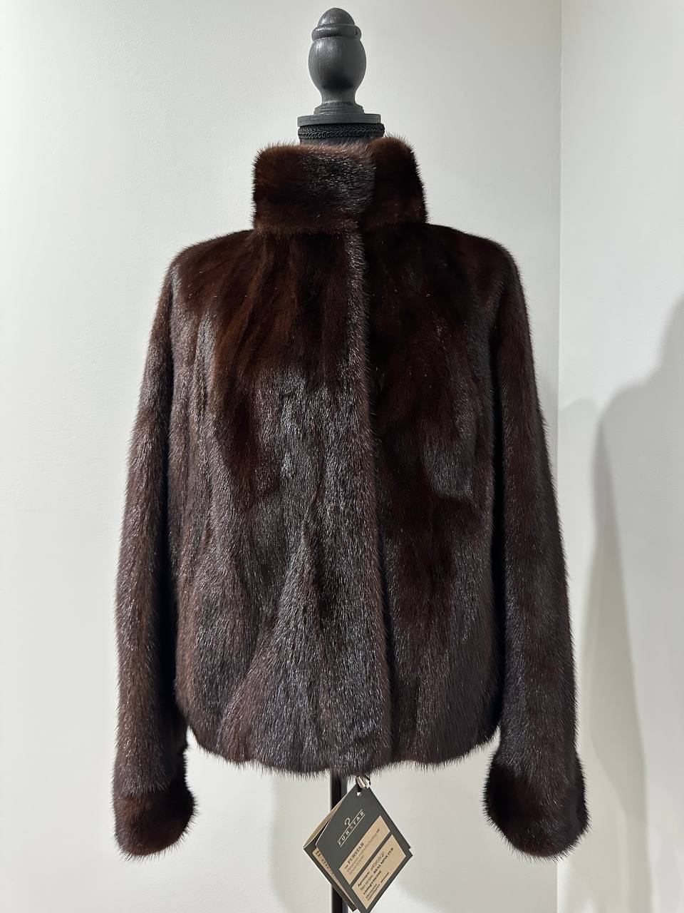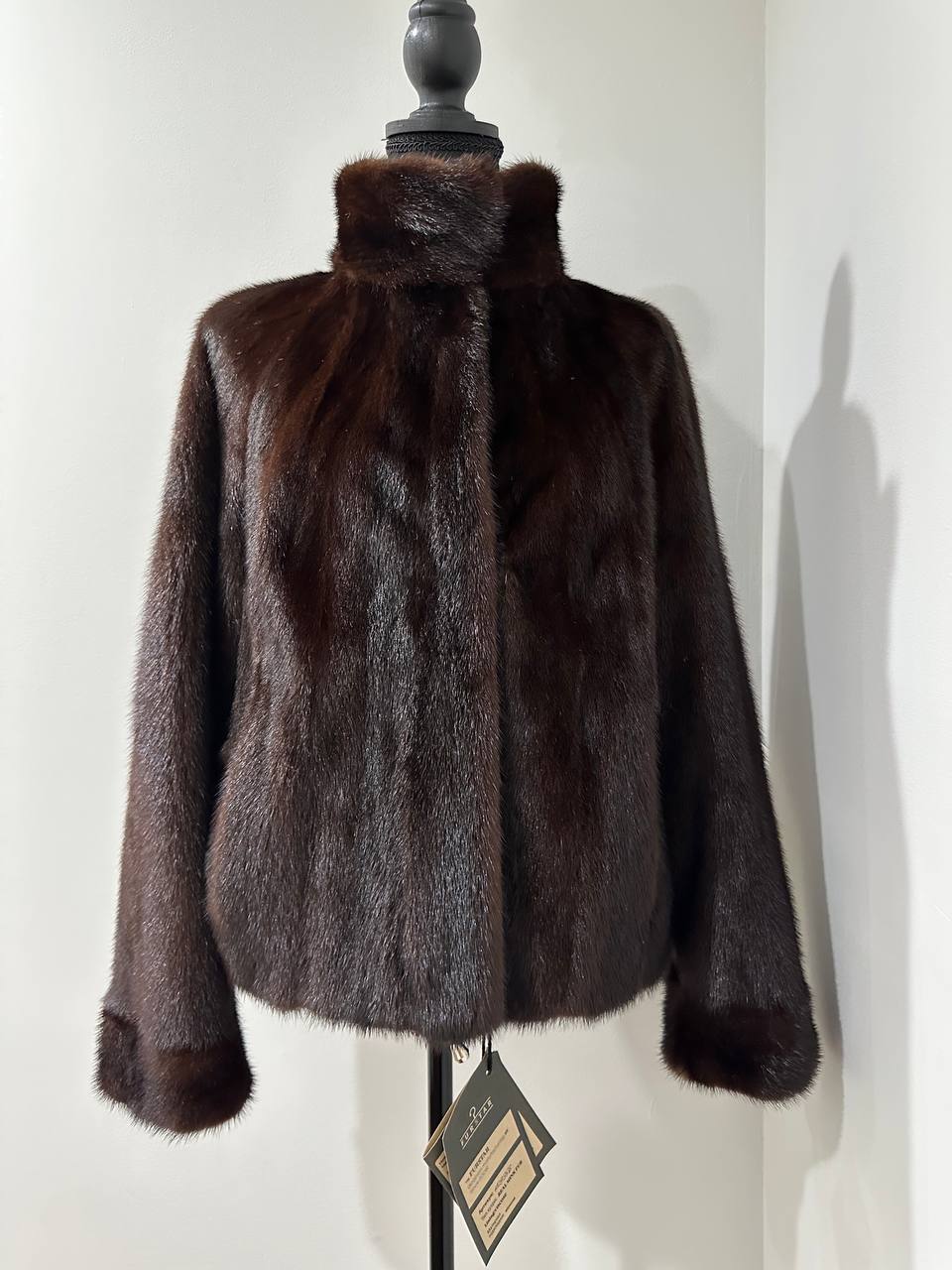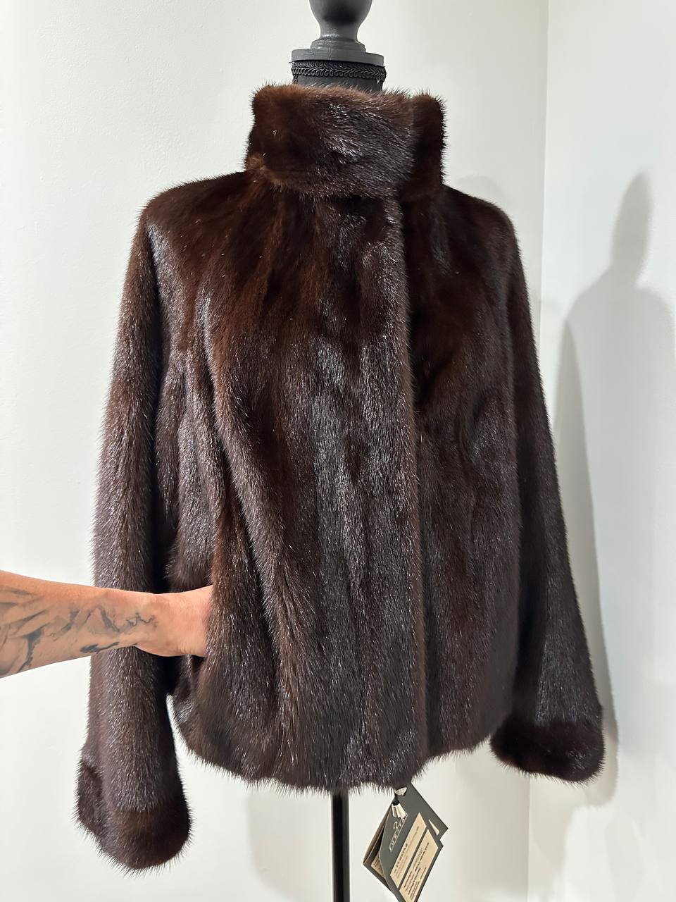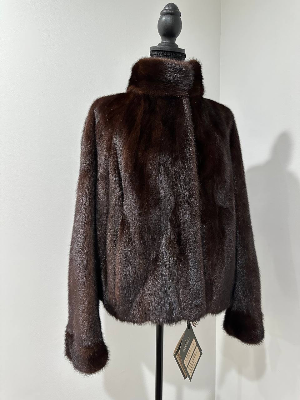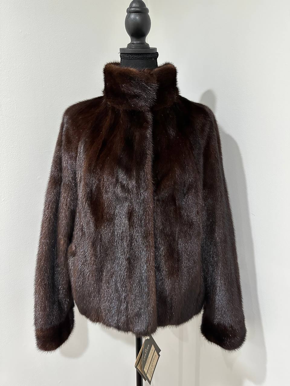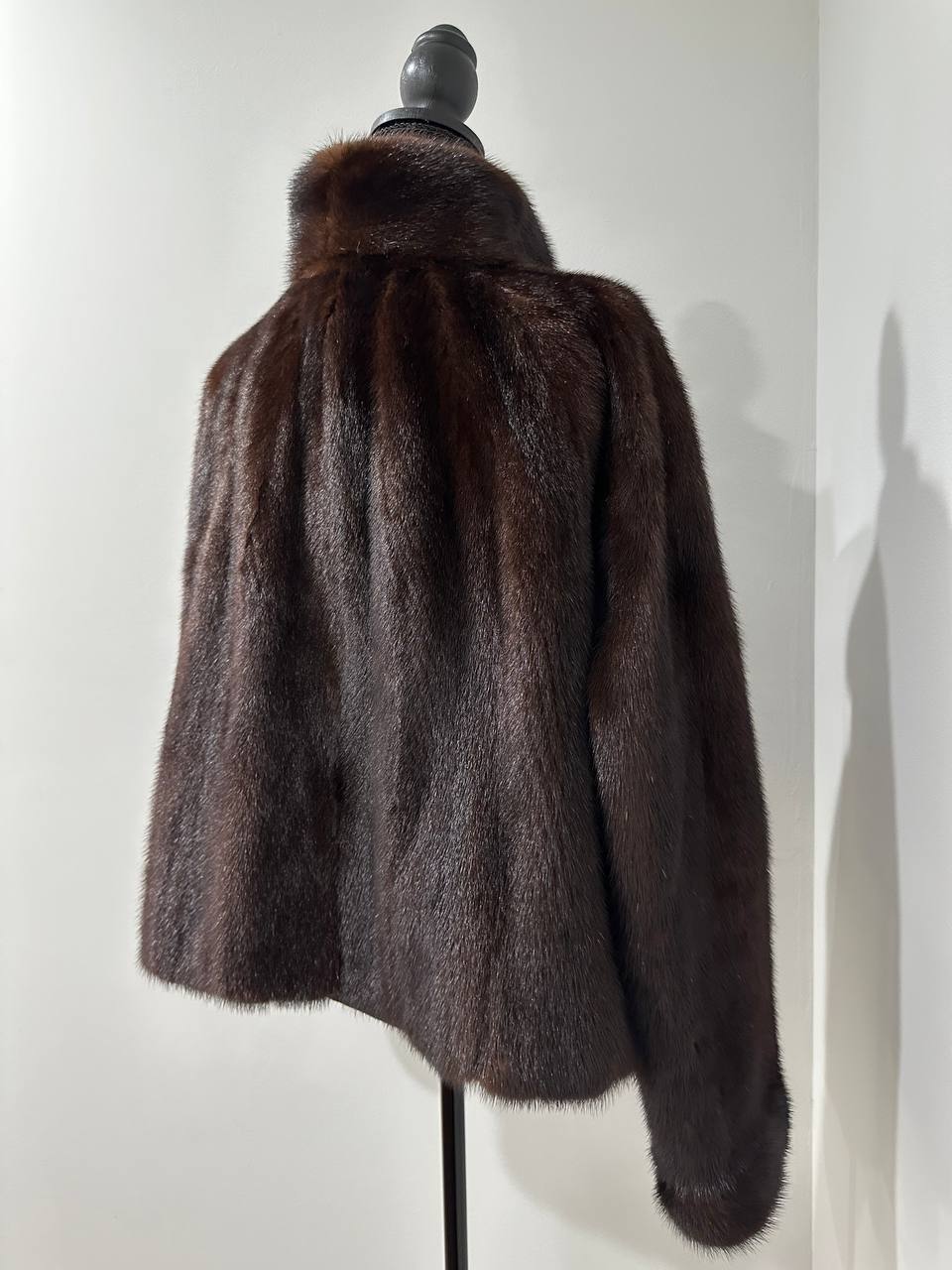 Women's stylish short BOMBER fur coat L size made of natural dark brown mink, natural fur color. The model is a bomber jacket, an internal drawstring is sewn on the bottom of the product. Stand collar. There are 2 pockets. The fur is thick, soft, shiny, silky. Fastened with hooks. Viscose lining, section sewn - handmade. Producer - Ukrainian. A variety of mink - Canadian.