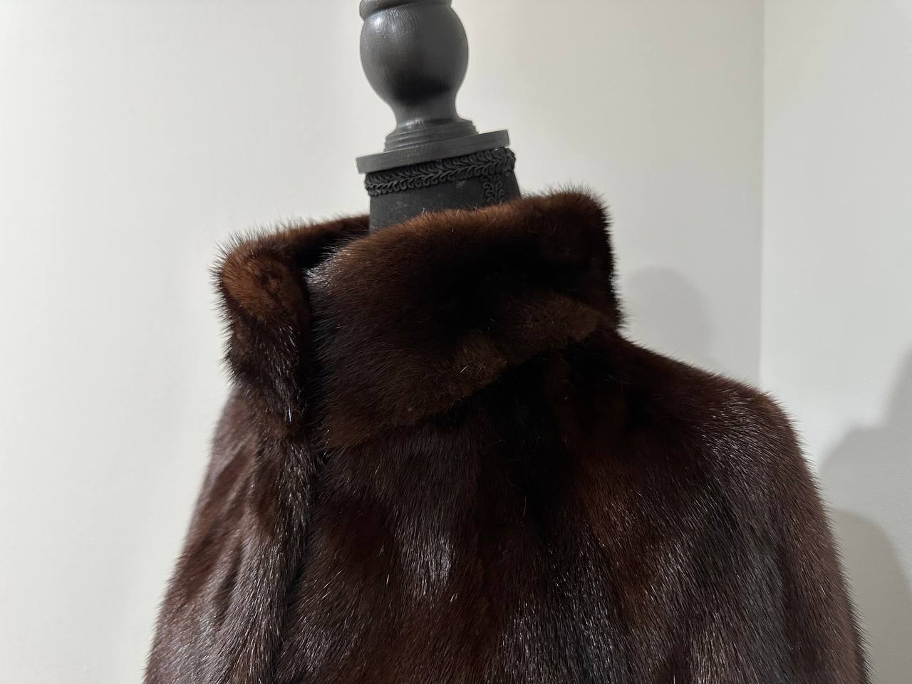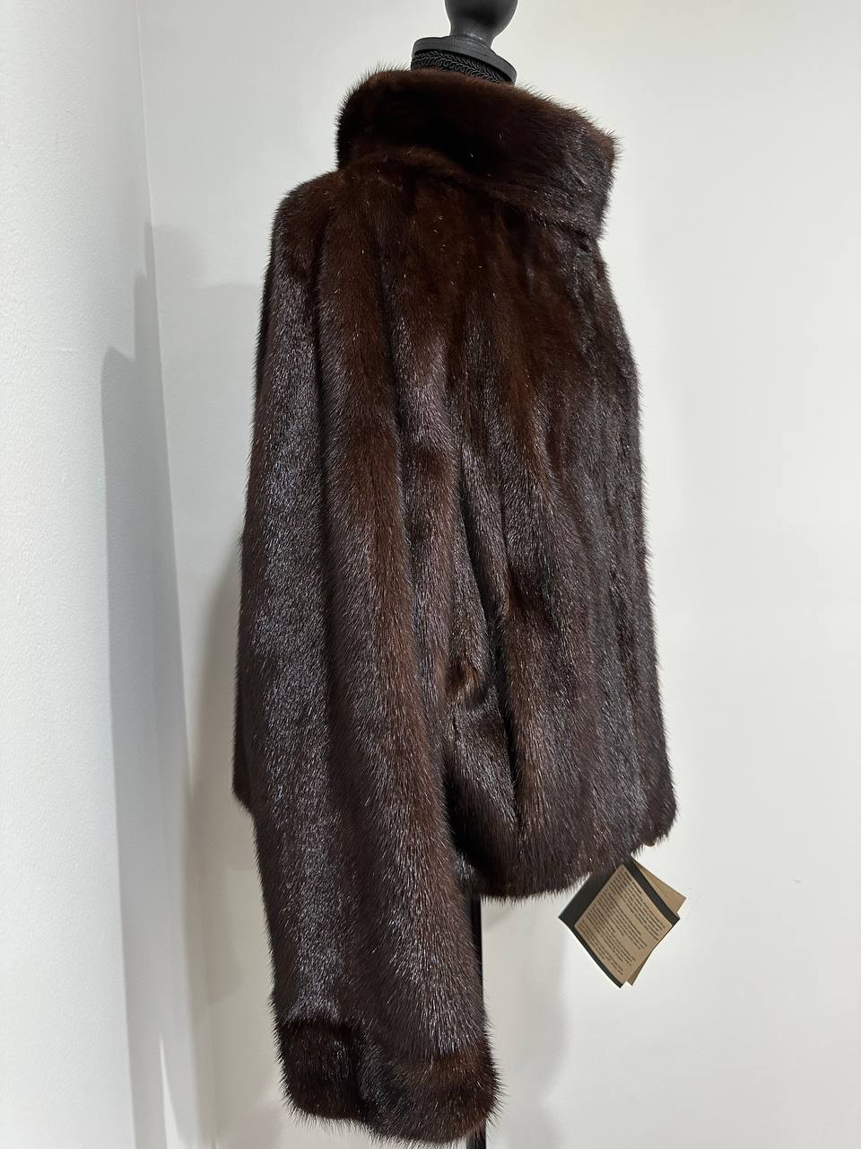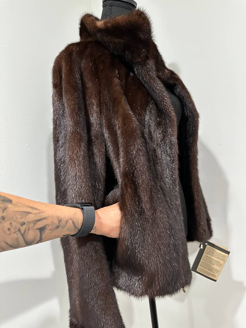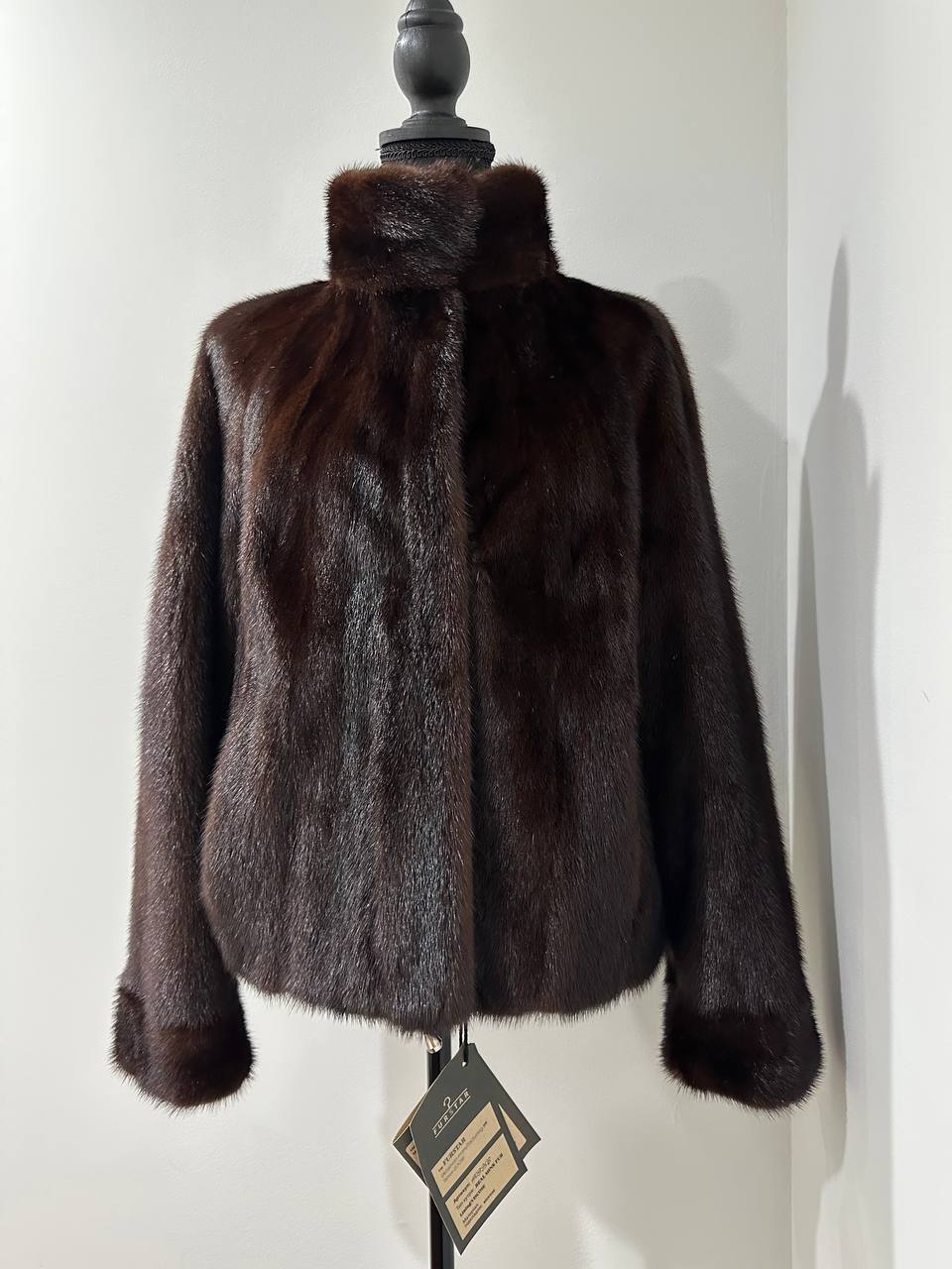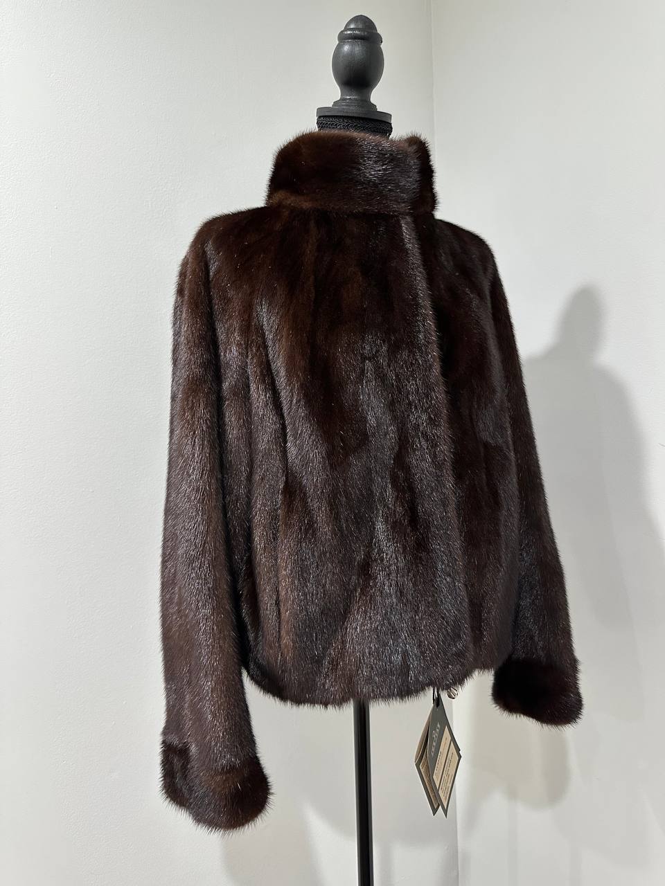 Women's stylish short BOMBER fur coat L size made of natural dark brown mink, natural fur color. The model is a bomber jacket, an internal drawstring is sewn on the bottom of the product. Stand collar. There are 2 pockets. The fur is thick, soft, shiny, silky. Fastened with hooks. Viscose lining, section sewn - handmade. Producer - Ukrainian. A variety of mink - Canadian.