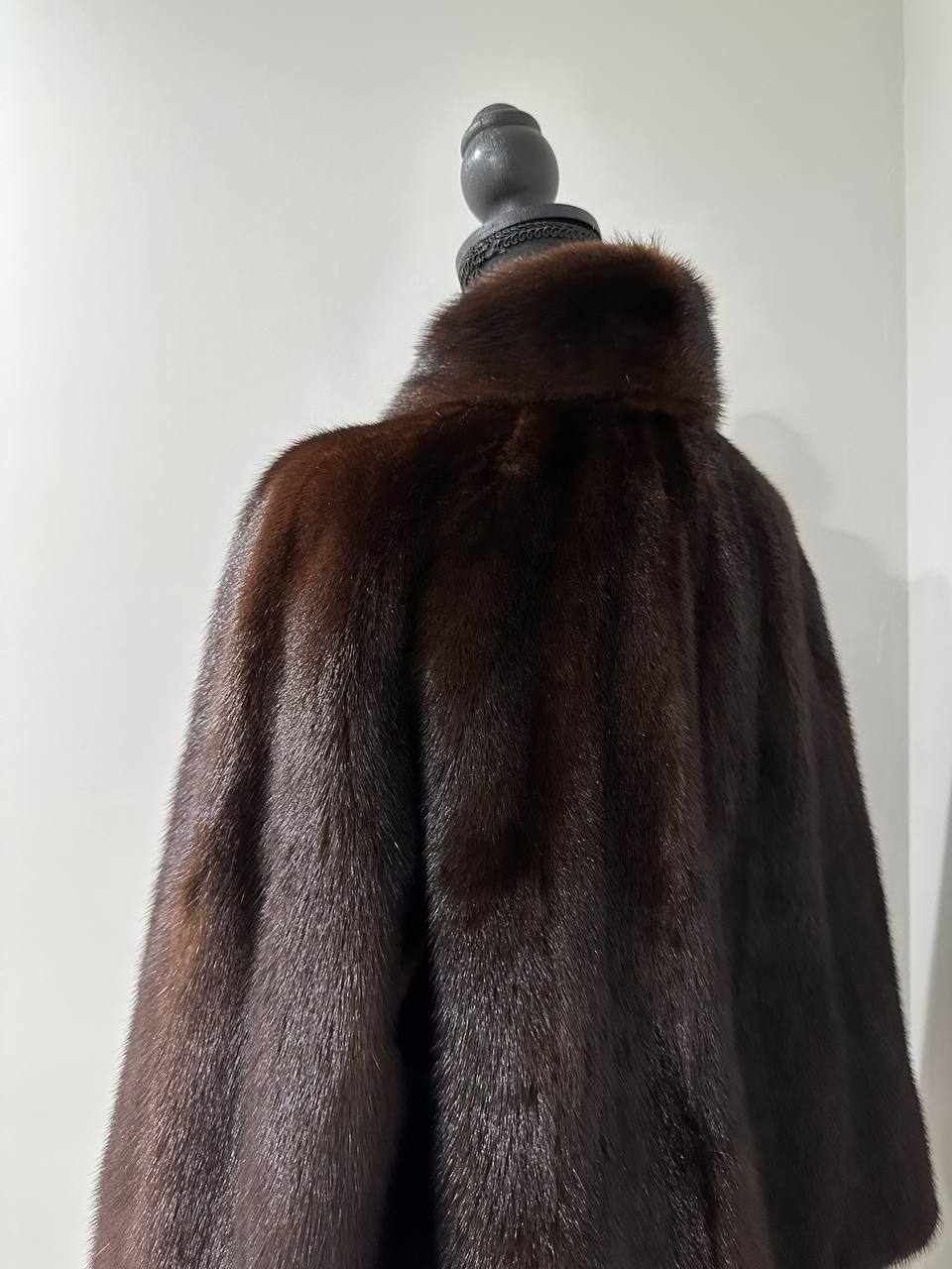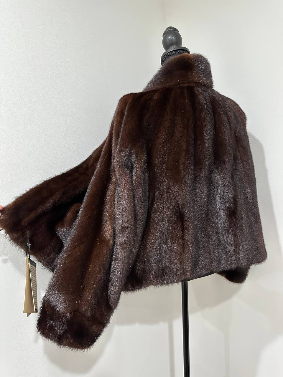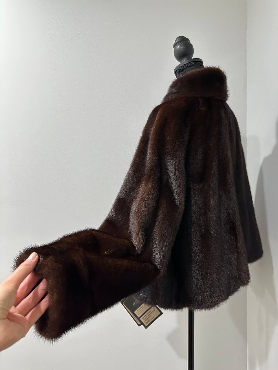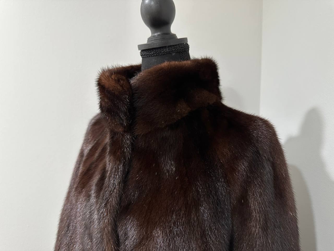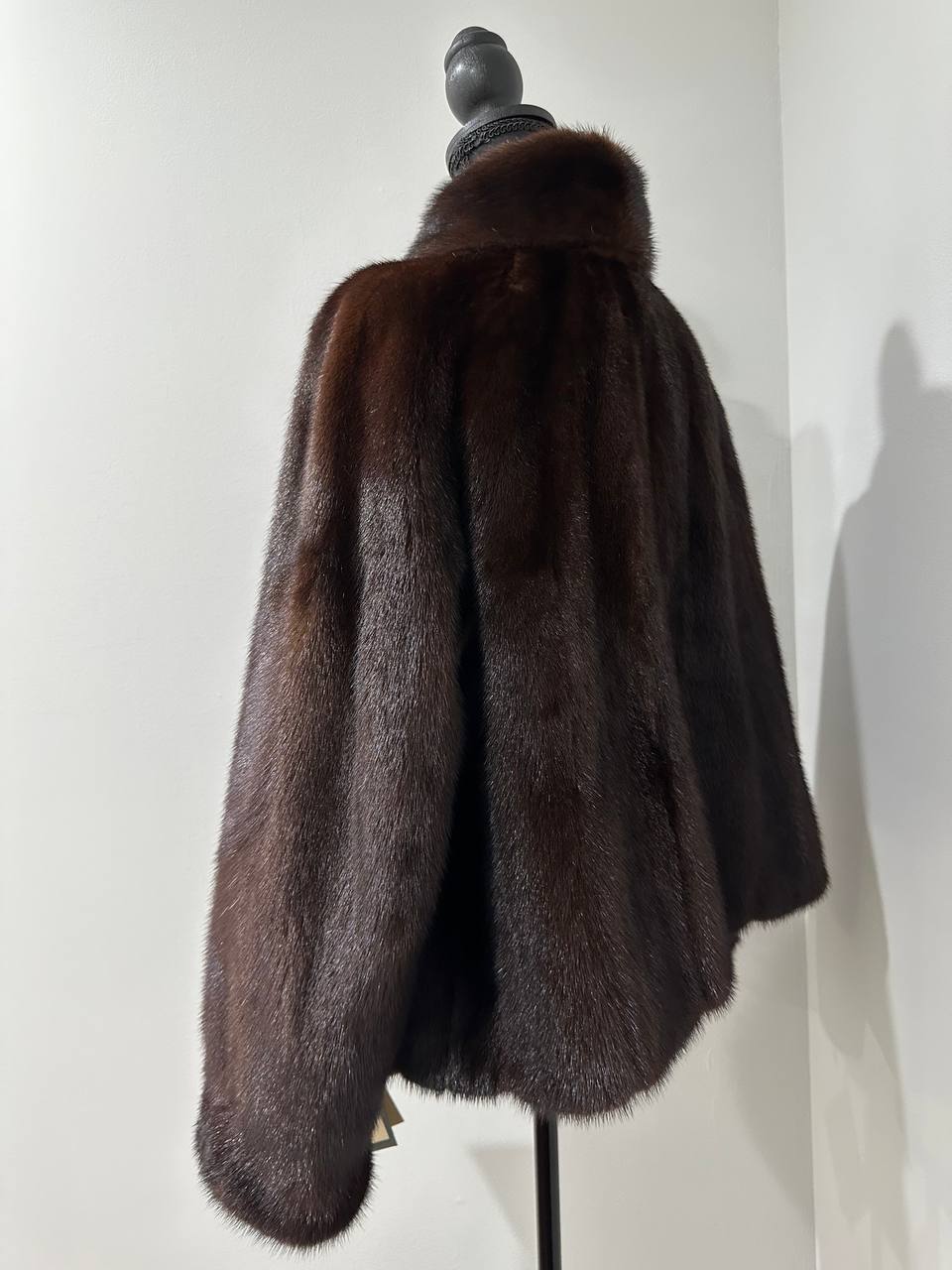 Women's stylish short BOMBER fur coat L size made of natural dark brown mink, natural fur color. The model is a bomber jacket, an internal drawstring is sewn on the bottom of the product. Stand collar. There are 2 pockets. The fur is thick, soft, shiny, silky. Fastened with hooks. Viscose lining, section sewn - handmade. Producer - Ukrainian. A variety of mink - Canadian.