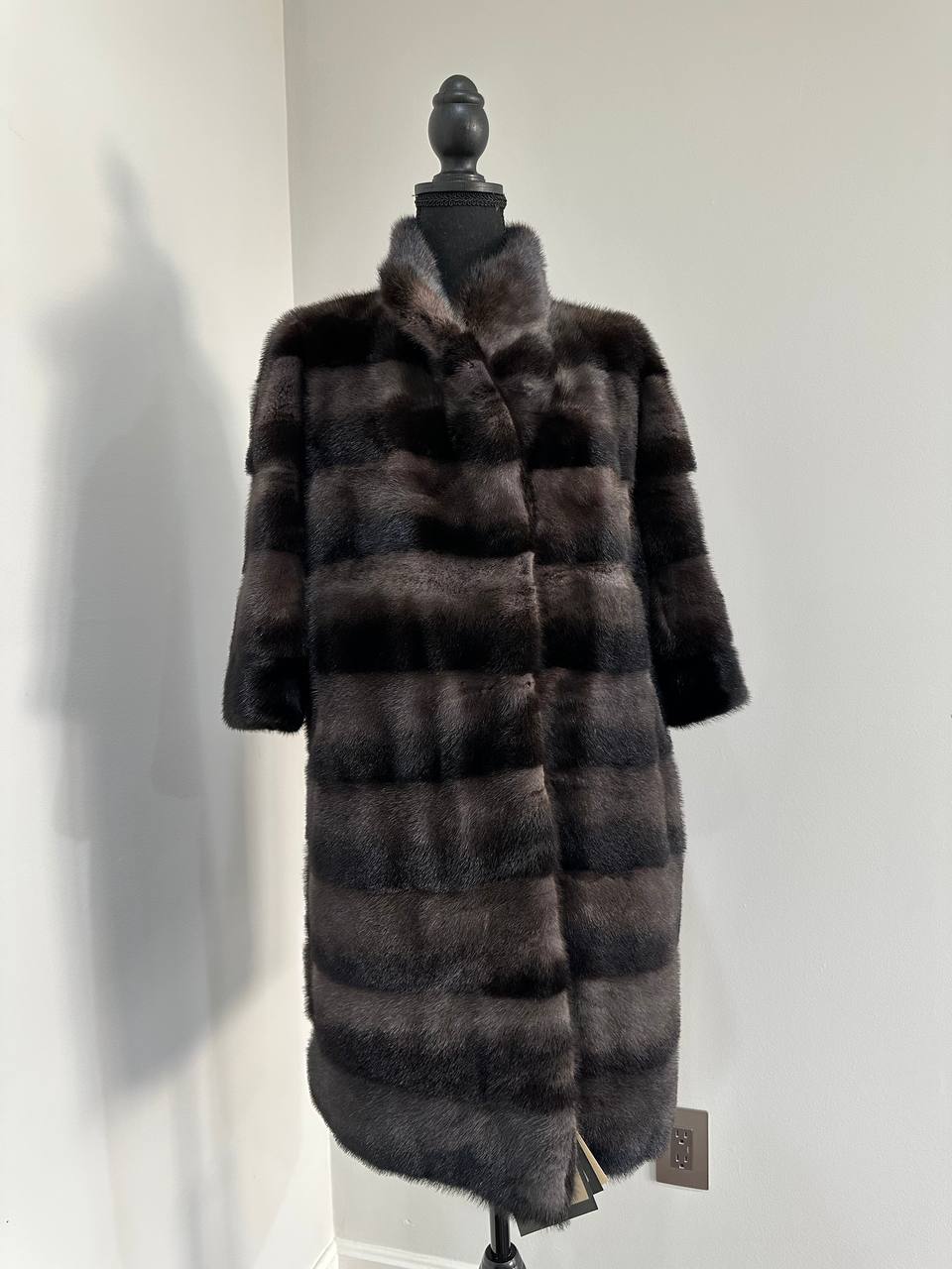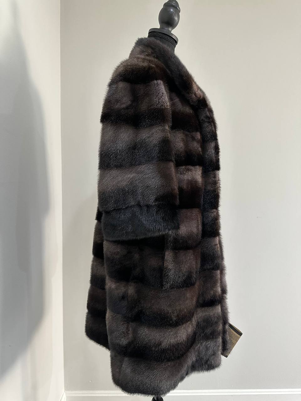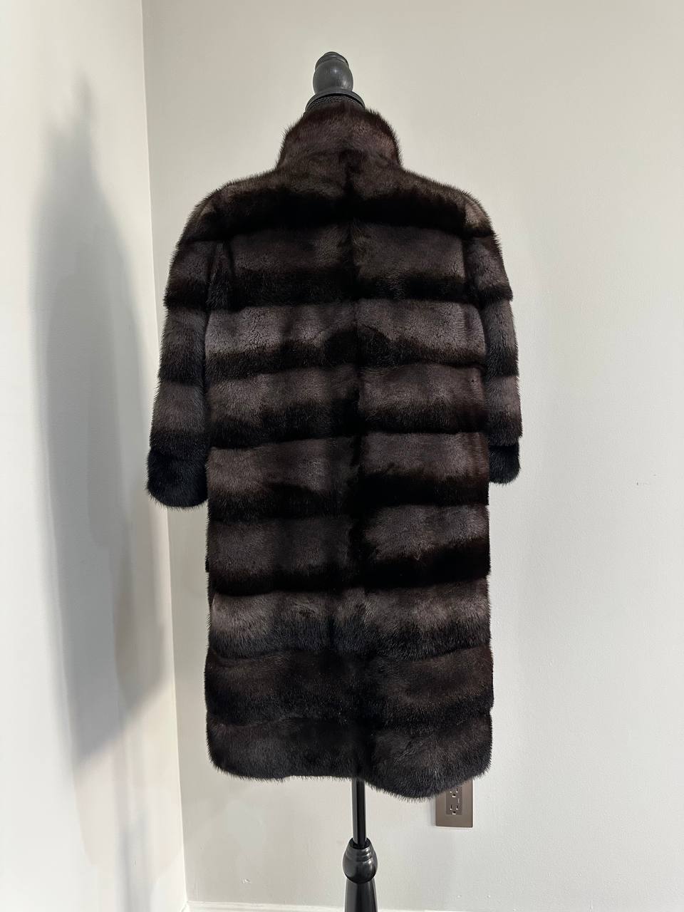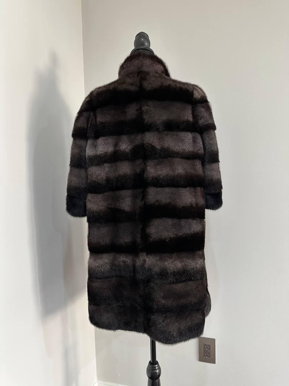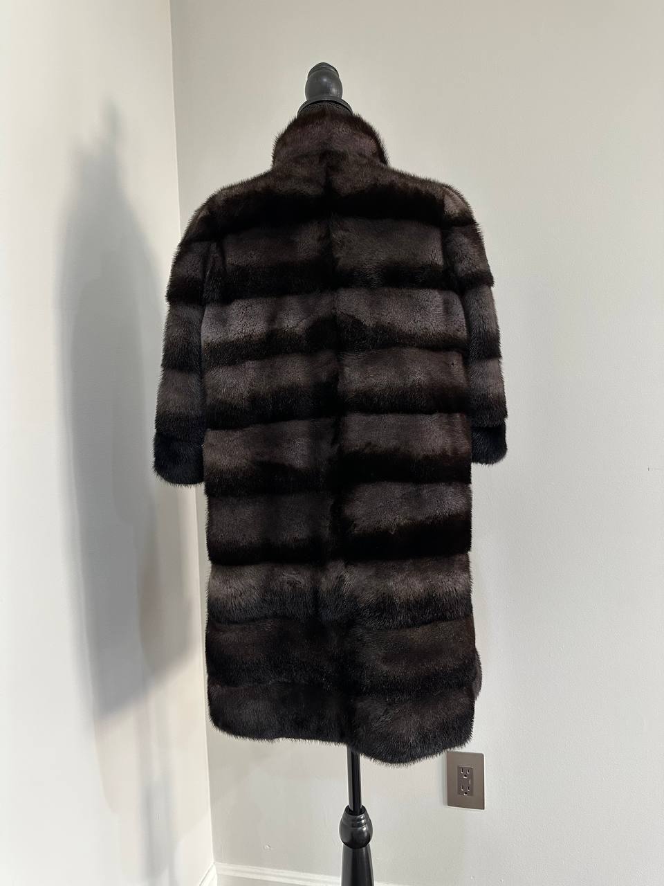 Indulge in timeless luxury with this authentic FURSTAR mink fur coat, exquisitely crafted from the finest quality pelts. This striking piece features deep amethyst and almost black horizontal striping, creating a captivating play of shadows and elegance. The unique two-tone palette reveals a subtle violet sheen under the light, evoking sophistication with every movement.