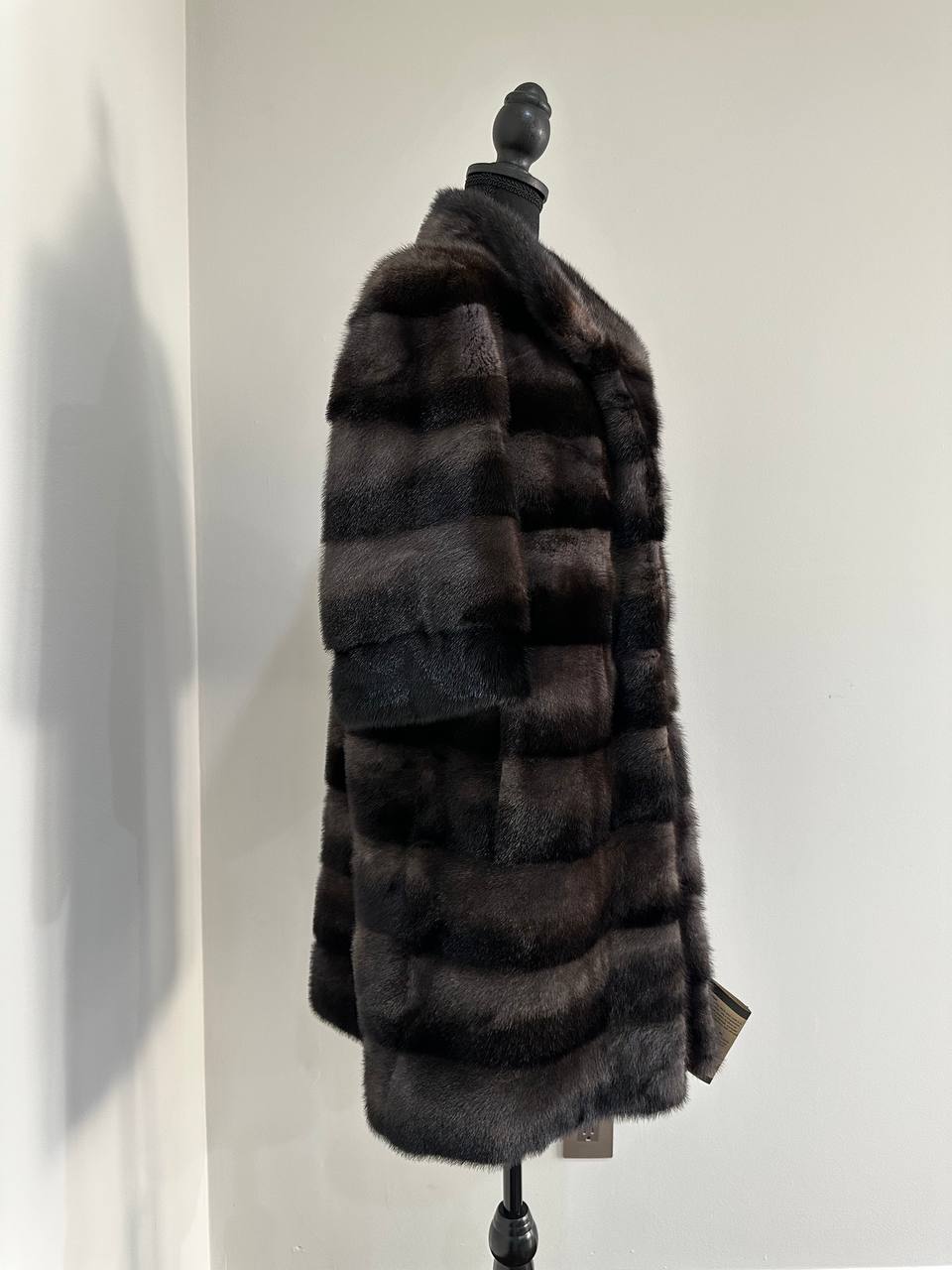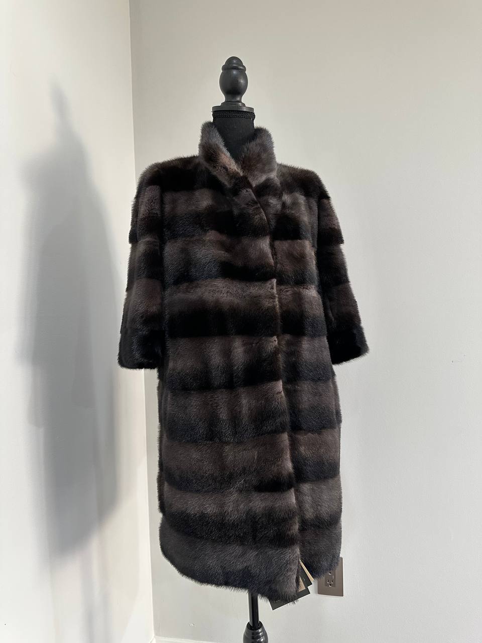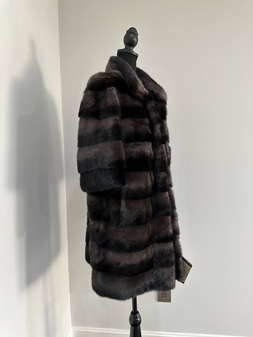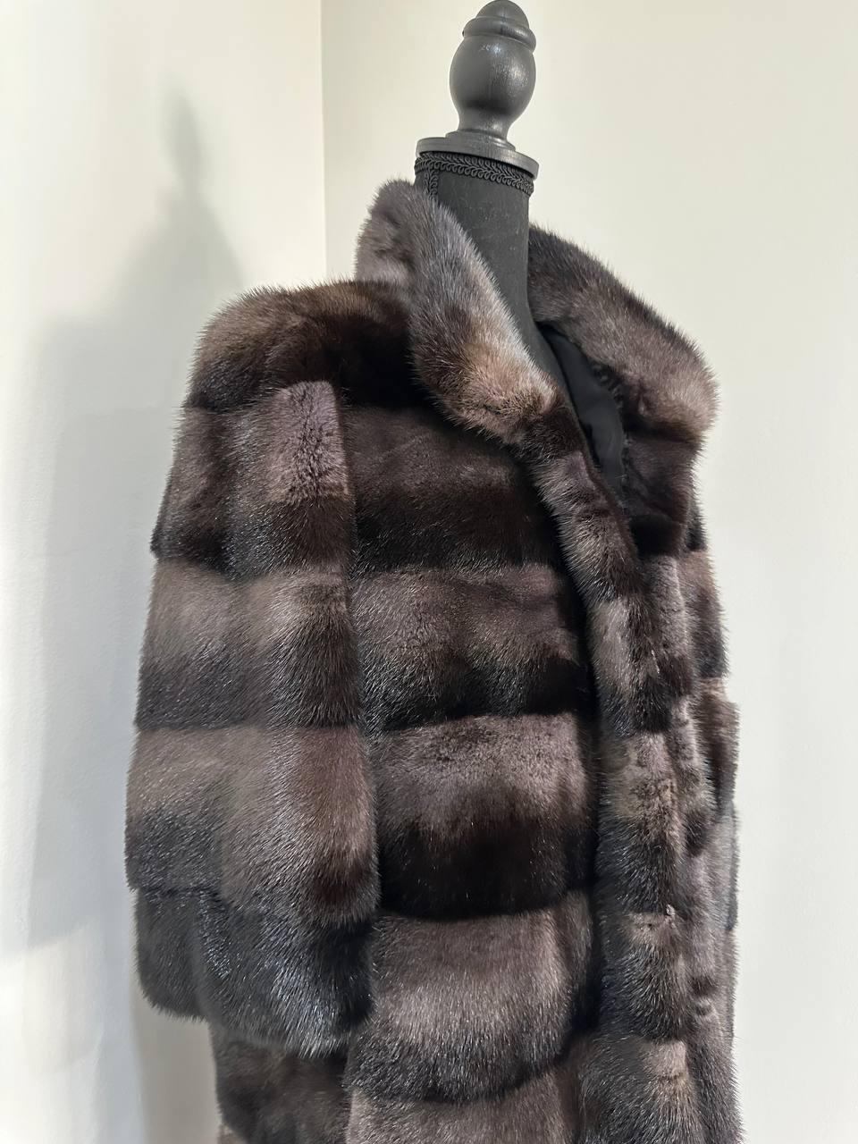 Indulge in timeless luxury with this authentic FURSTAR mink fur coat, exquisitely crafted from the finest quality pelts. This striking piece features deep amethyst and almost black horizontal striping, creating a captivating play of shadows and elegance. The unique two-tone palette reveals a subtle violet sheen under the light, evoking sophistication with every movement.
