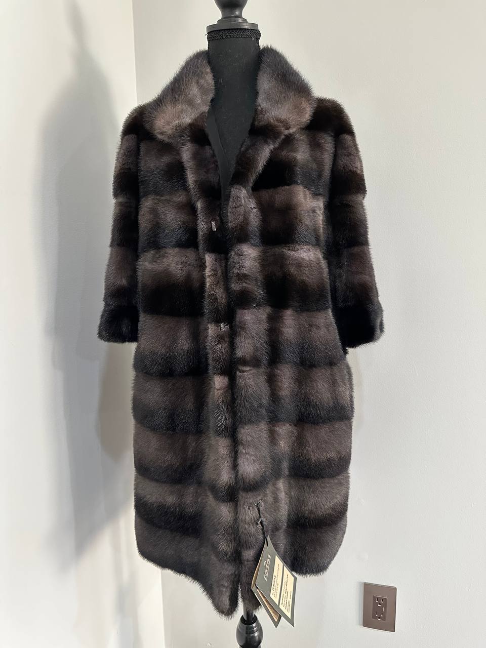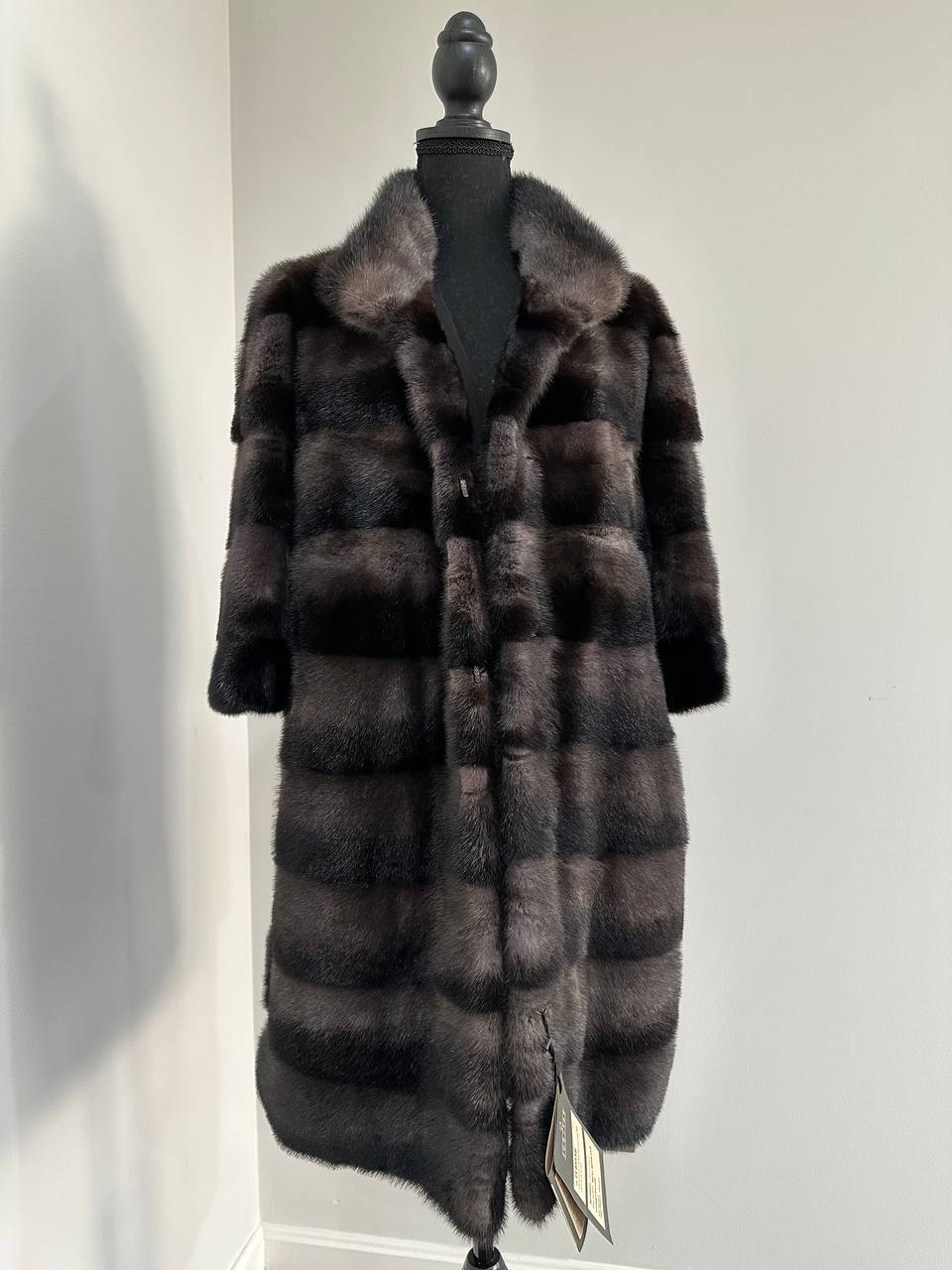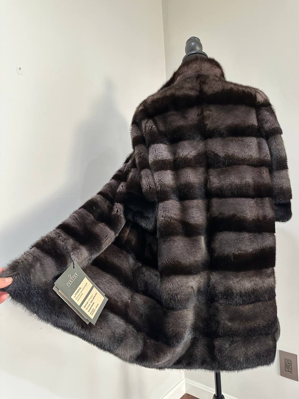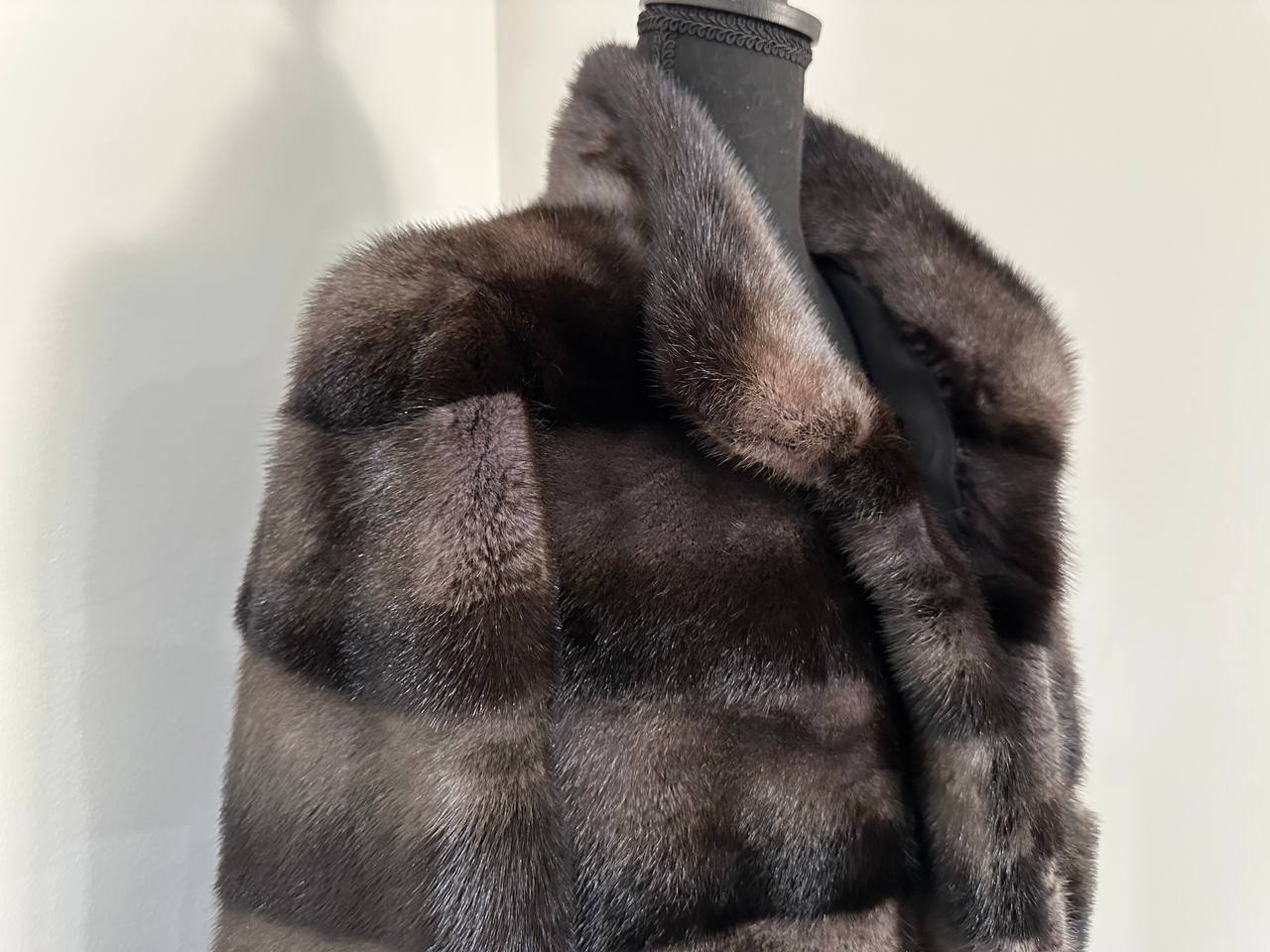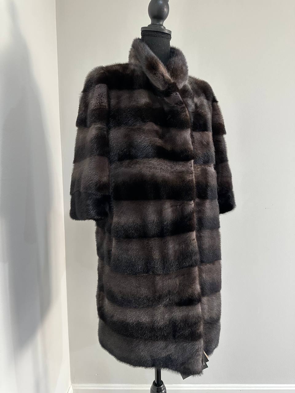 Indulge in timeless luxury with this authentic FURSTAR mink fur coat, exquisitely crafted from the finest quality pelts. This striking piece features deep amethyst and almost black horizontal striping, creating a captivating play of shadows and elegance. The unique two-tone palette reveals a subtle violet sheen under the light, evoking sophistication with every movement.