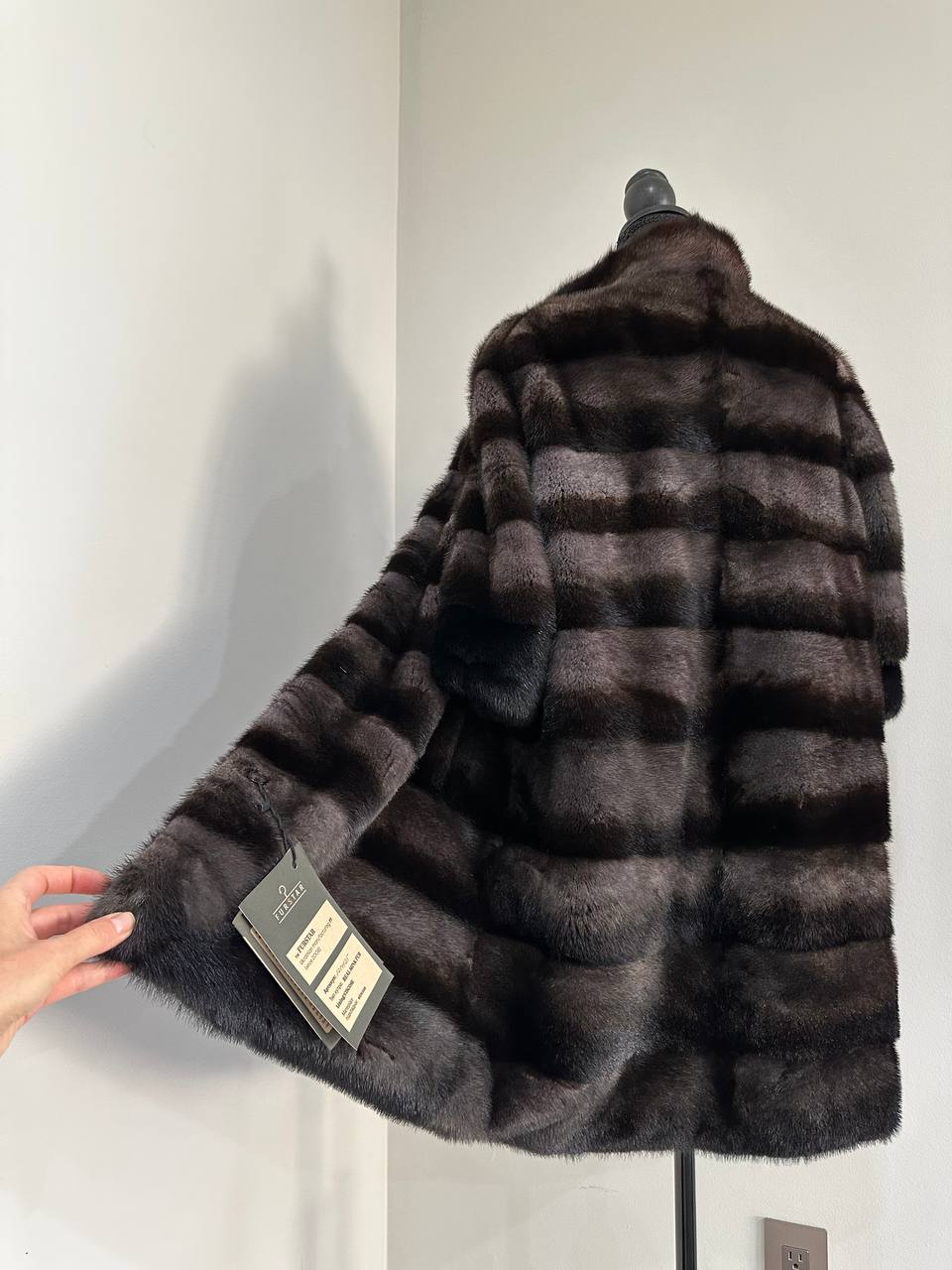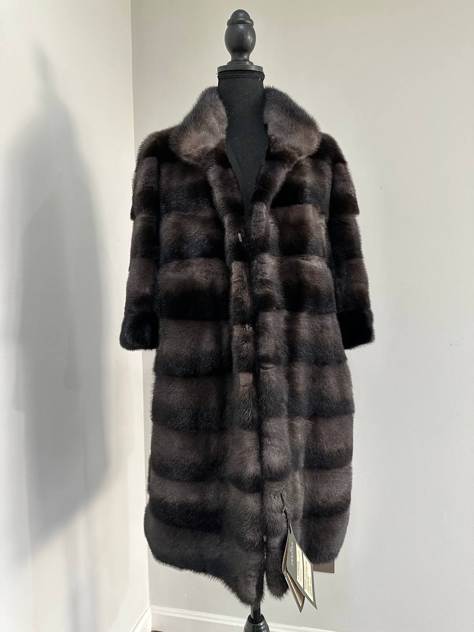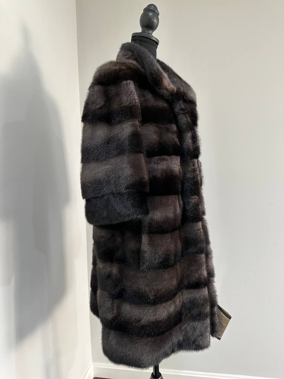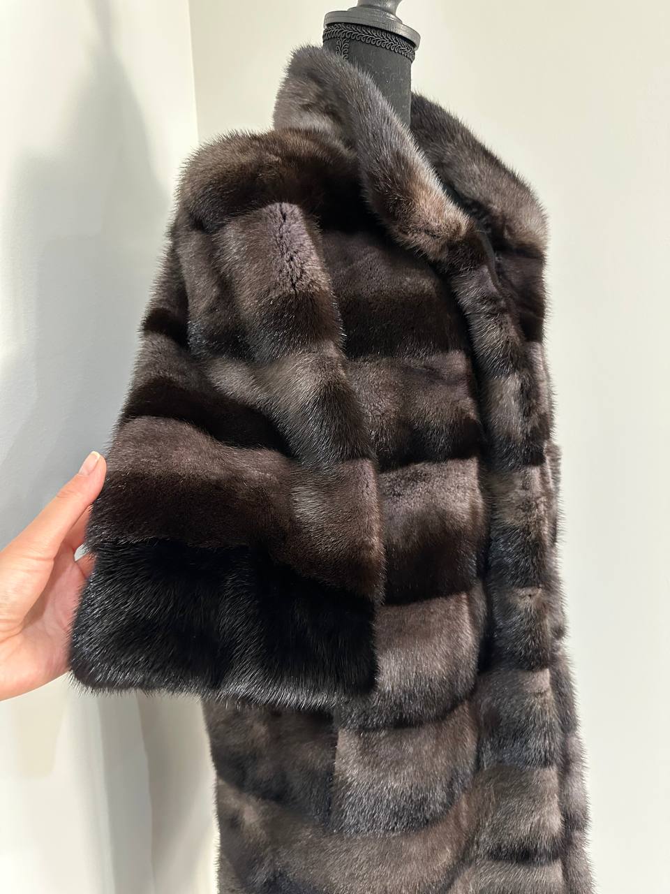 Indulge in timeless luxury with this authentic FURSTAR mink fur coat, exquisitely crafted from the finest quality pelts. This striking piece features deep amethyst and almost black horizontal striping, creating a captivating play of shadows and elegance. The unique two-tone palette reveals a subtle violet sheen under the light, evoking sophistication with every movement.