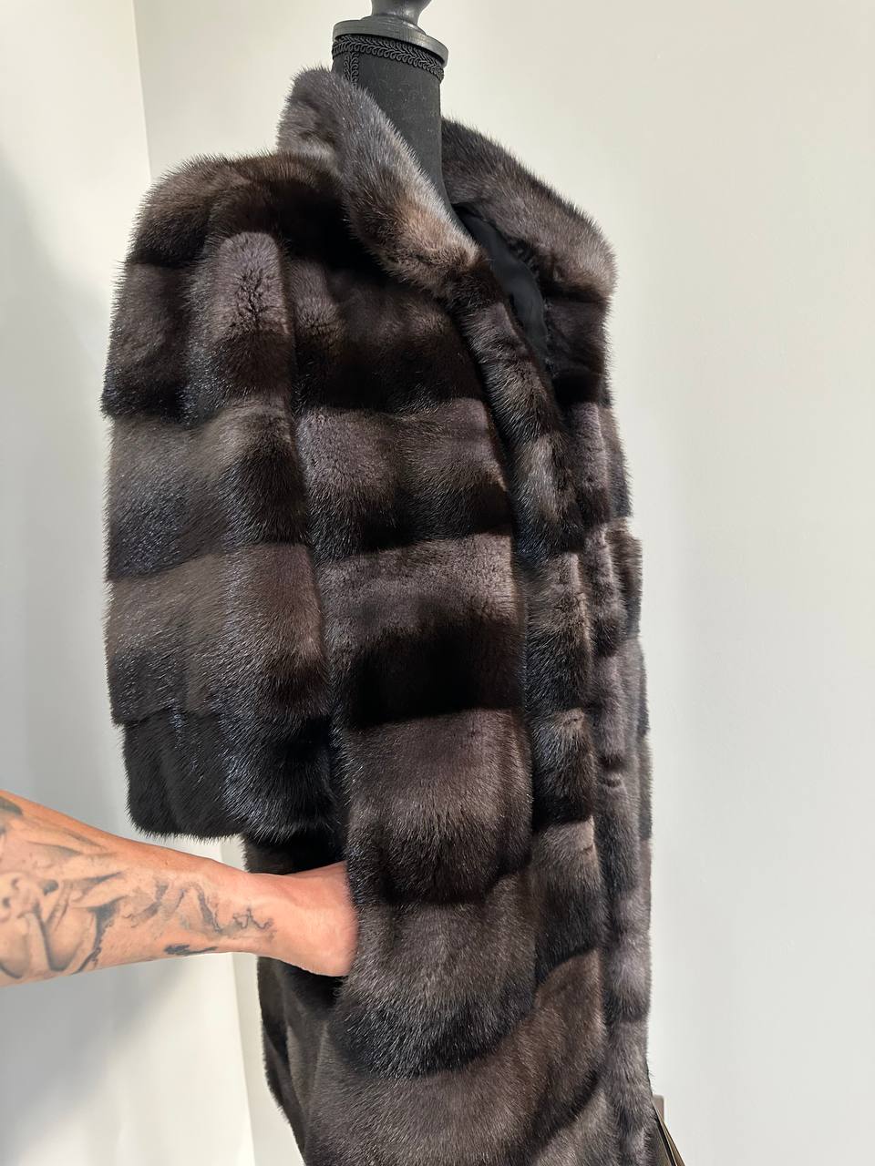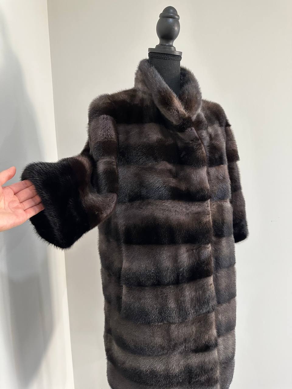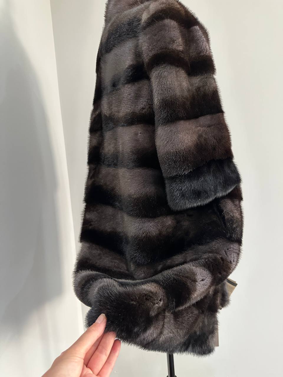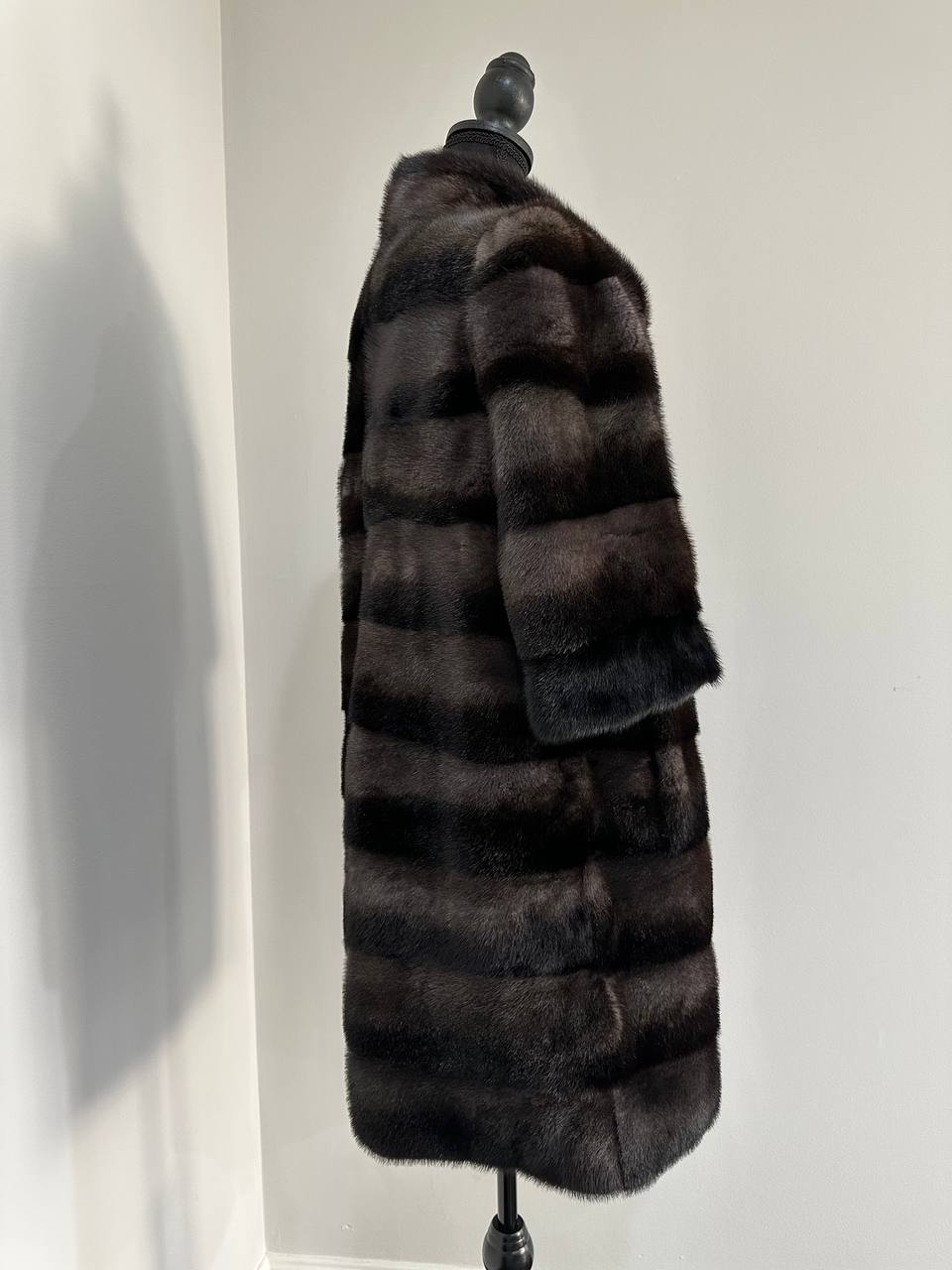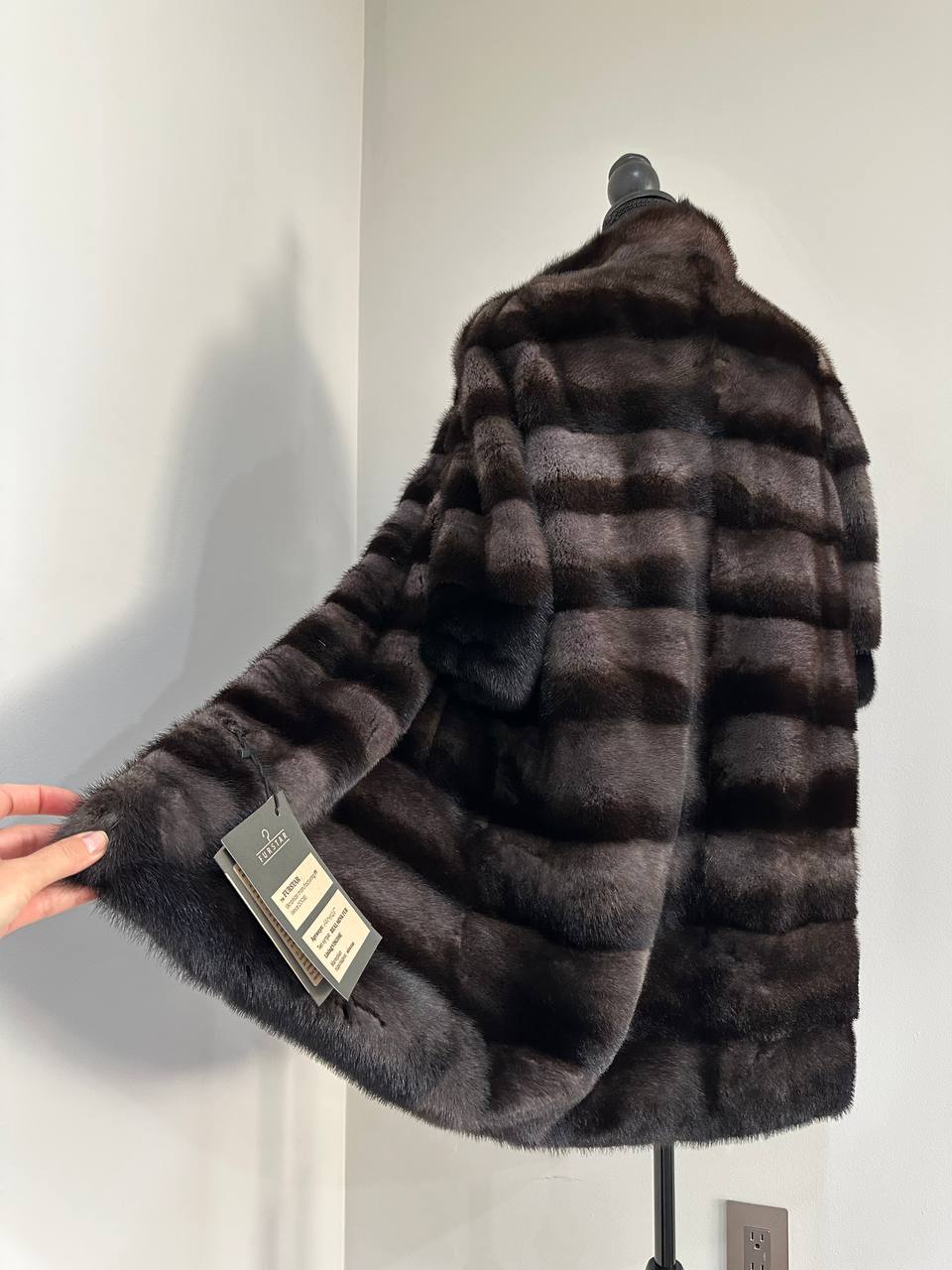 Indulge in timeless luxury with this authentic FURSTAR mink fur coat, exquisitely crafted from the finest quality pelts. This striking piece features deep amethyst and almost black horizontal striping, creating a captivating play of shadows and elegance. The unique two-tone palette reveals a subtle violet sheen under the light, evoking sophistication with every movement.