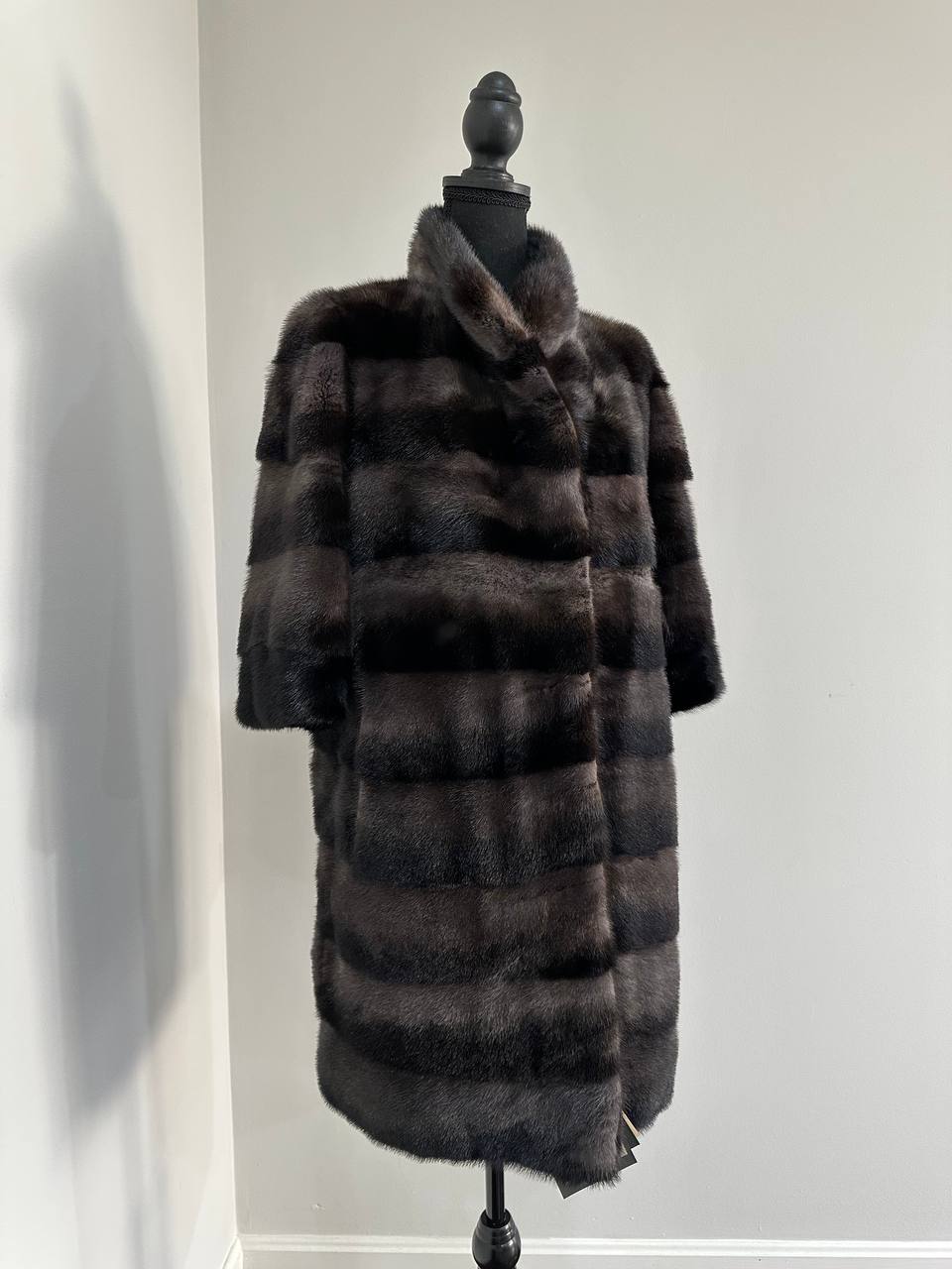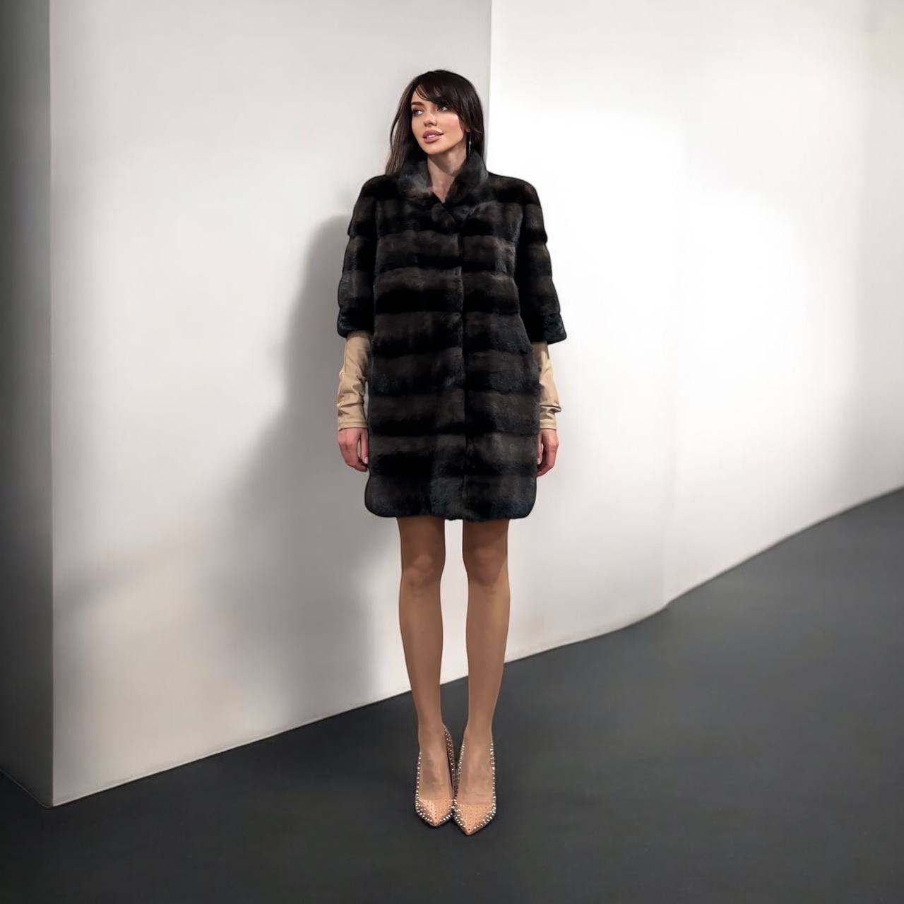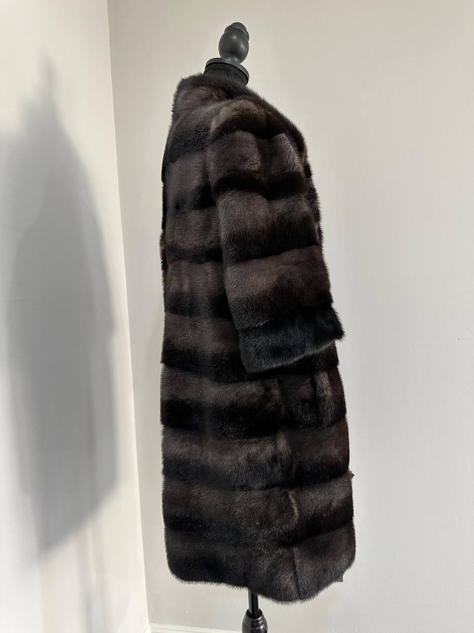 Women's Real mink FUR coat - 2 colors - dark deep brown almost black and purple. solid plates laid horizontally. The model is straight. The sleeves are short. Stand collar. There are 2 external pockets. Manufacturer - Ukrainian brand FURSTAR. The mink color is with darkened backs, one of the rarest shades. Viscose lining, sewn hem (handmade). Fastens with hooks.