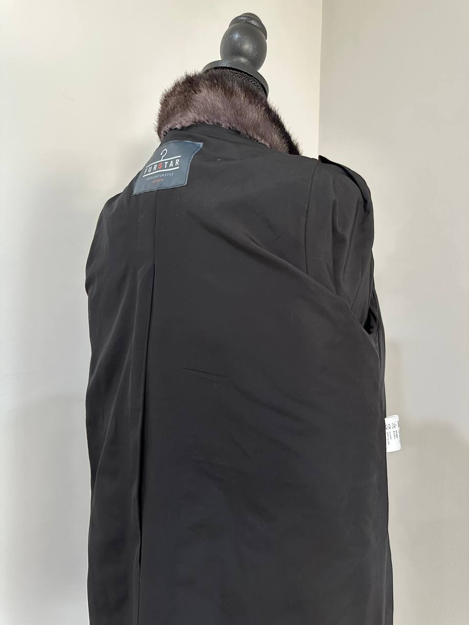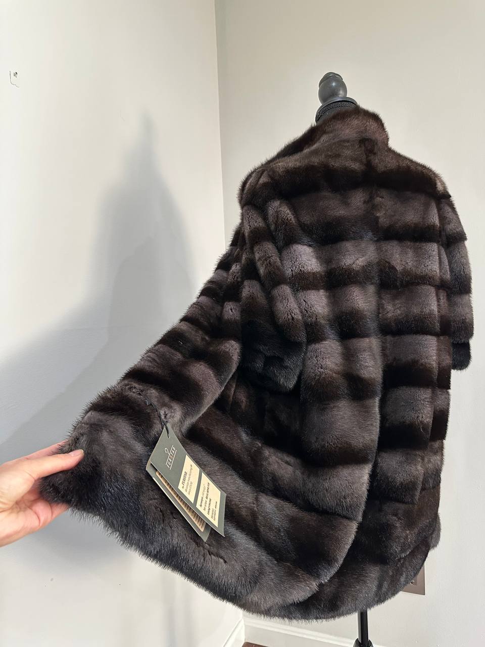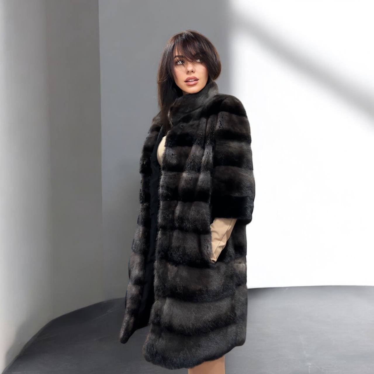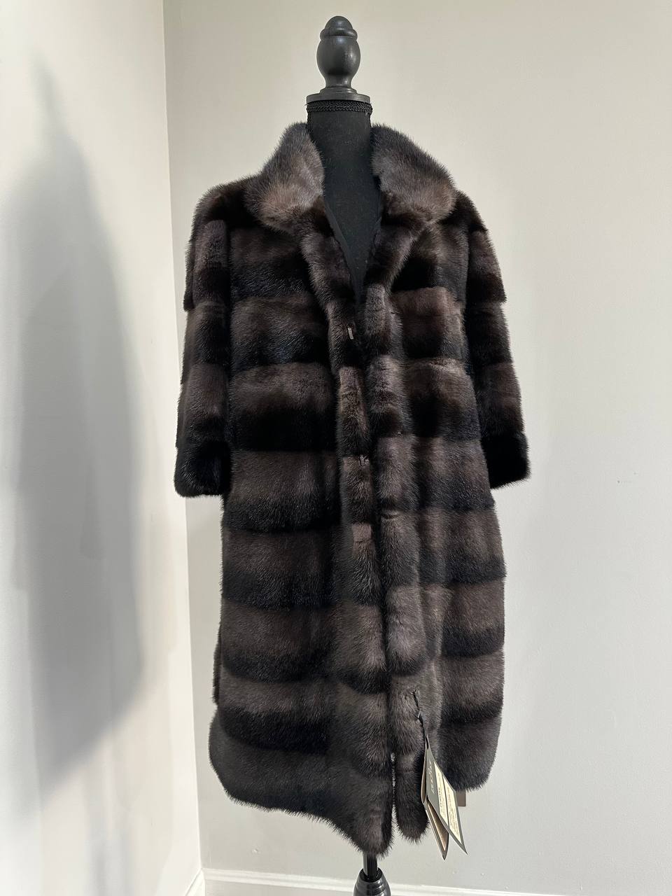 Women's Real mink FUR coat - 2 colors - dark deep brown almost black and purple. solid plates laid horizontally. The model is straight. The sleeves are short. Stand collar. There are 2 external pockets. Manufacturer - Ukrainian brand FURSTAR. The mink color is with darkened backs, one of the rarest shades. Viscose lining, sewn hem (handmade). Fastens with hooks.
