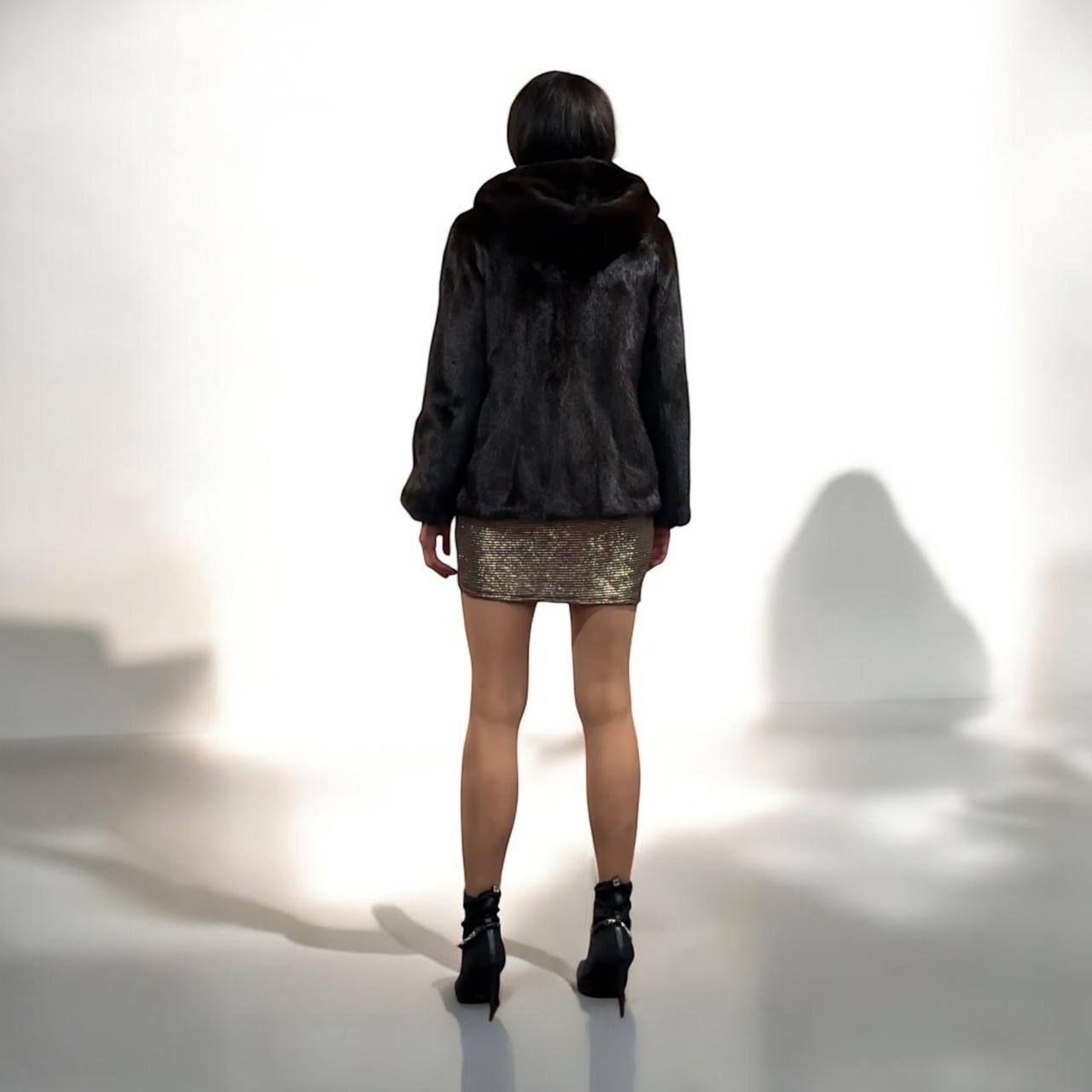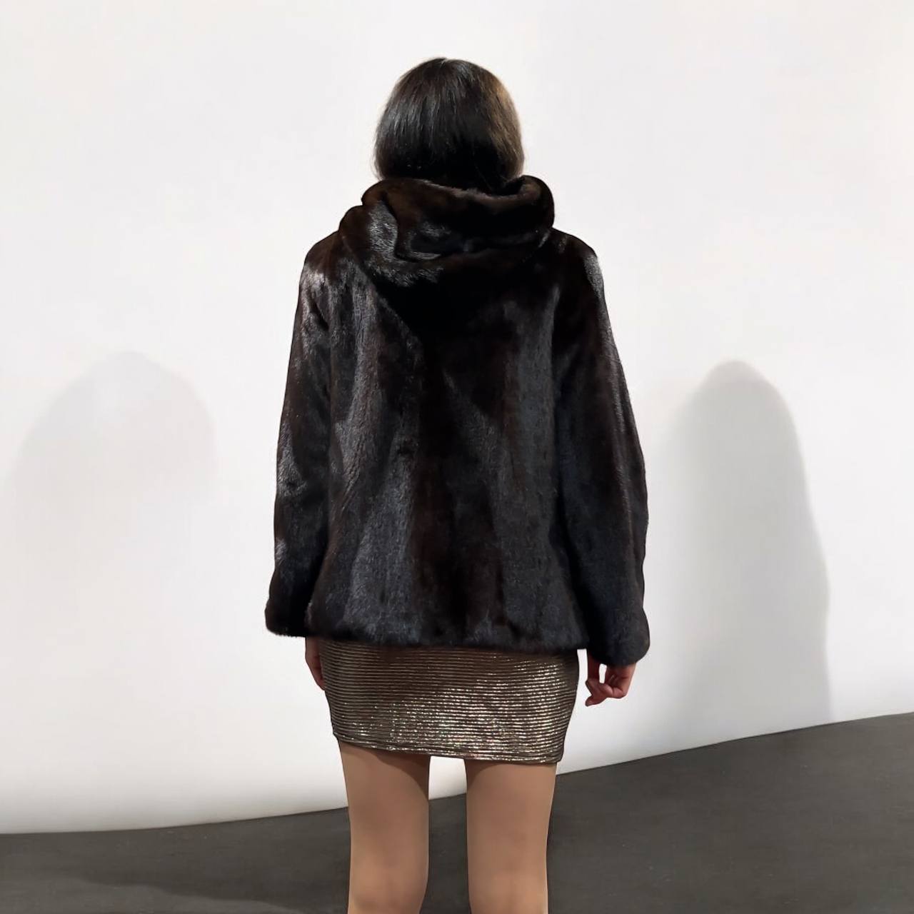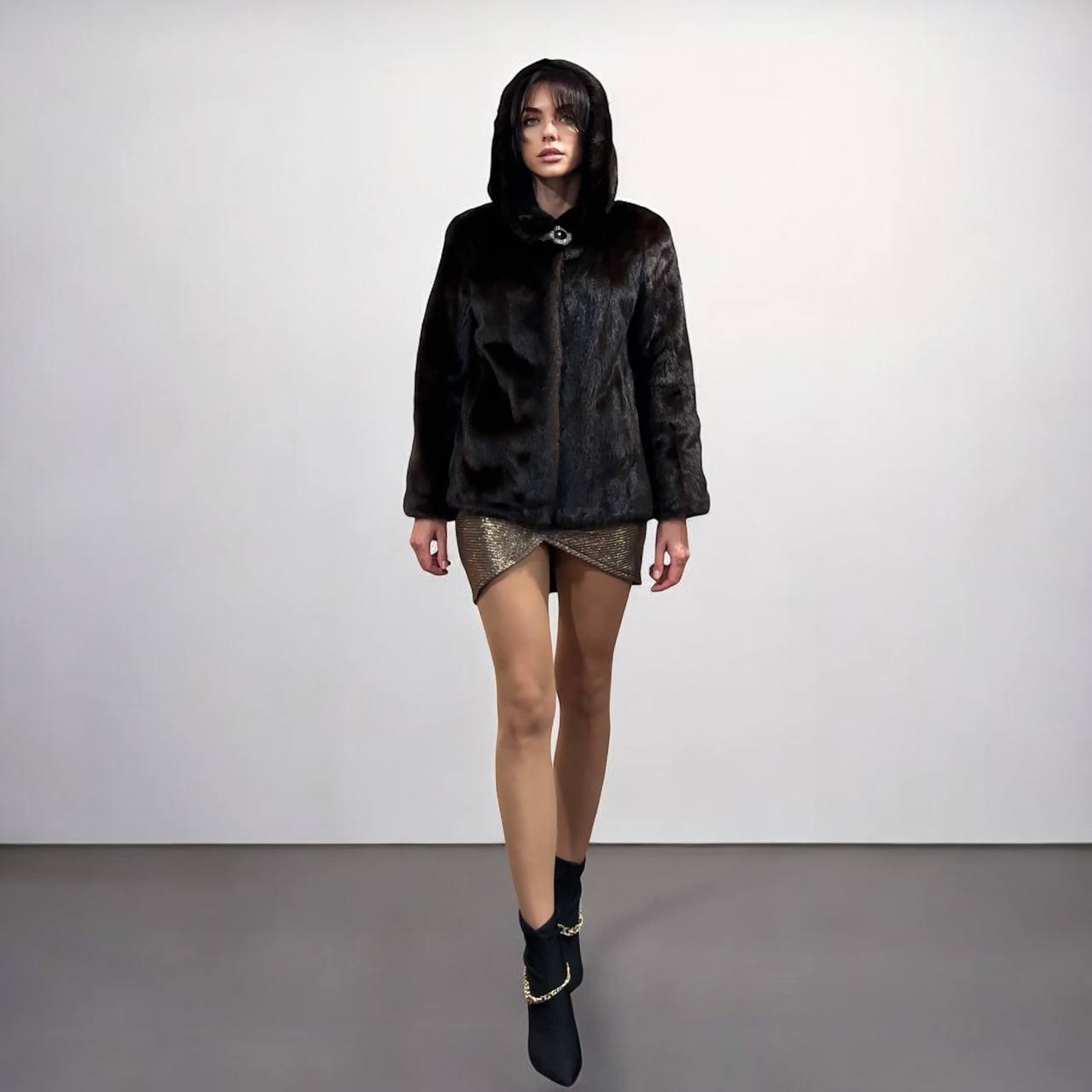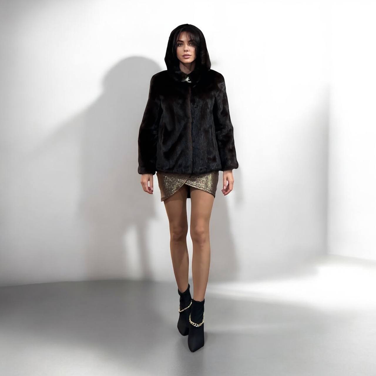 Women's mink fur FULL SKINS coat with a hood size S model bomber. Color - deep dark brown, natural color. The sleeves are long. There are 2 pockets. Fastens with hooks. Ukrainian manufacturer trade mark FURSTAR. Mink - soft, shiny pile, fluffy, beautiful shade. Hand-sewn viscose lining.