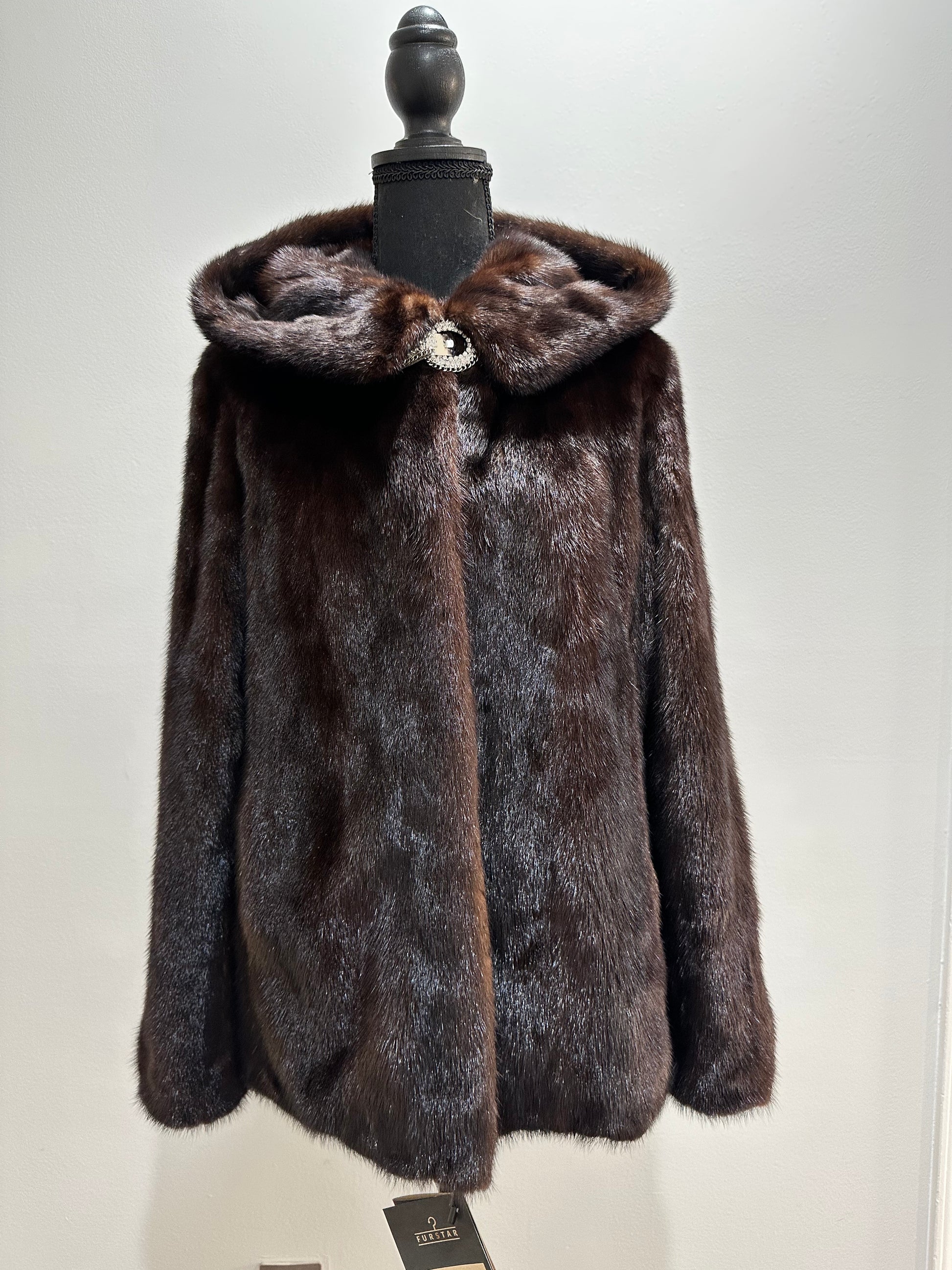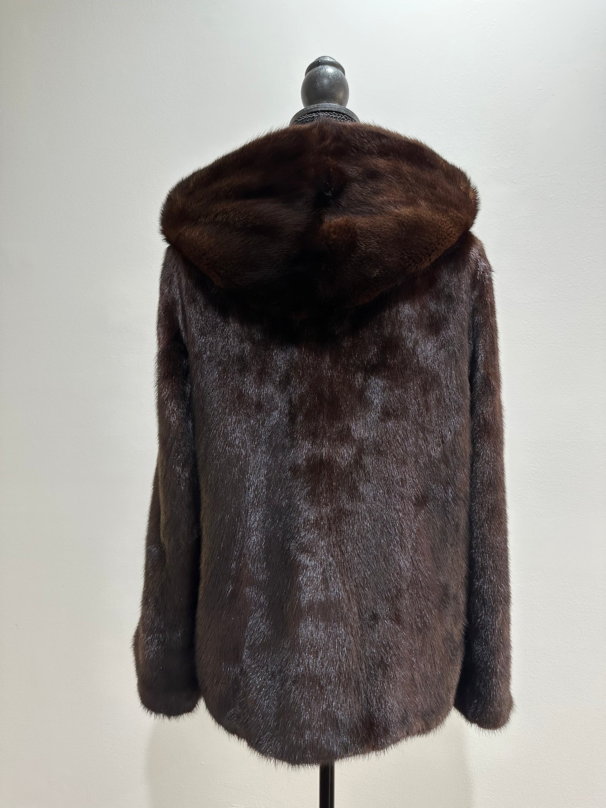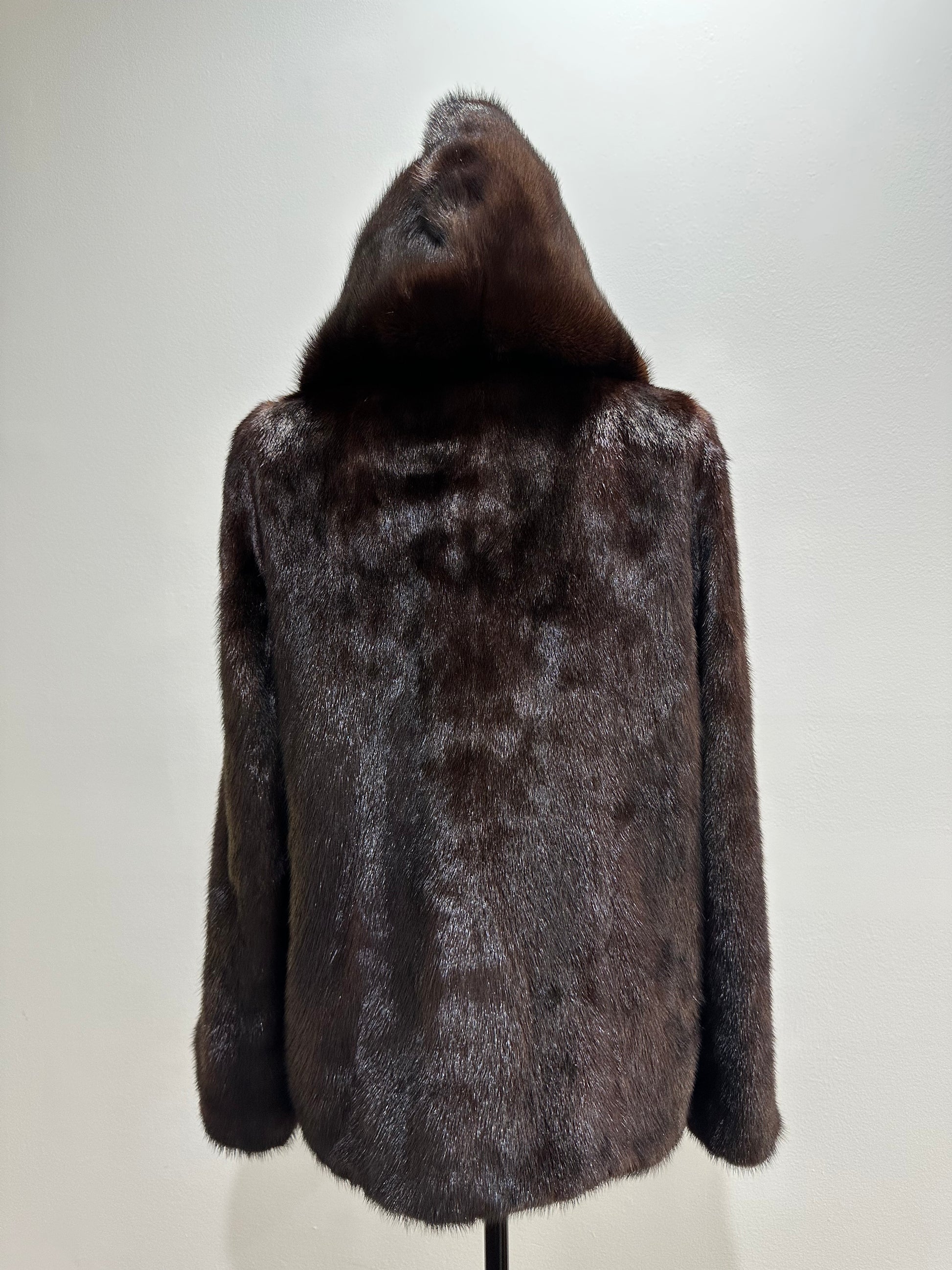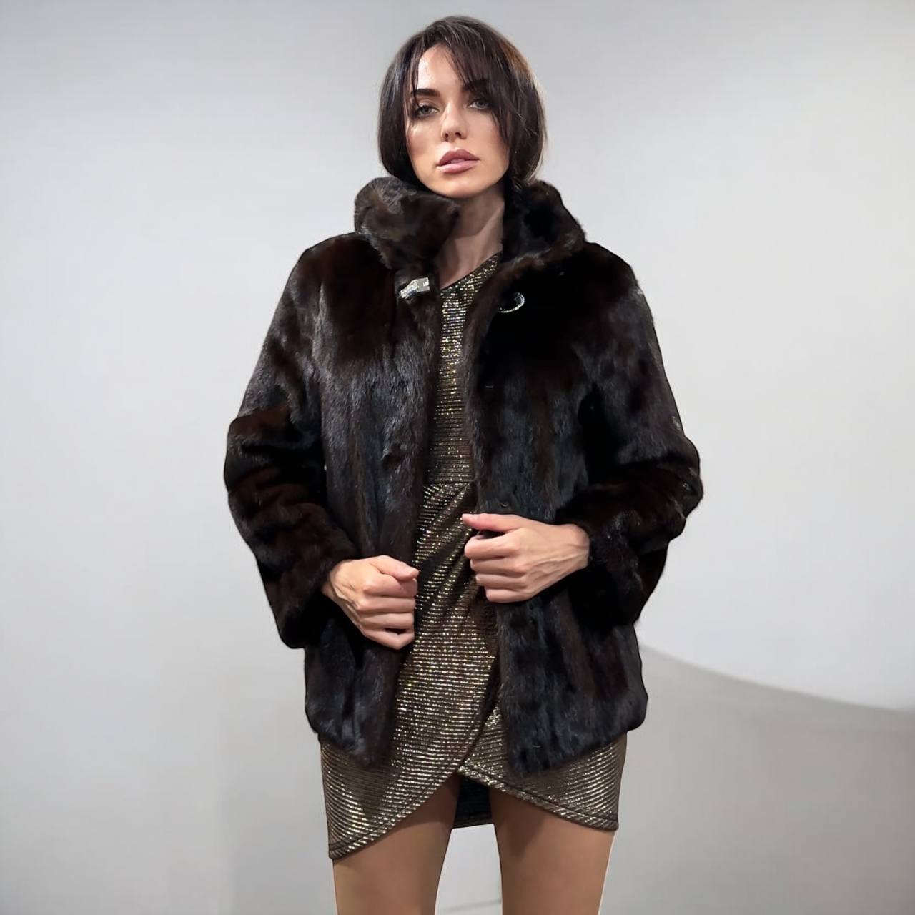 Women's mink fur FULL SKINS coat with a hood size S model bomber. Color - deep dark brown, natural color. The sleeves are long. There are 2 pockets. Fastens with hooks. Ukrainian manufacturer trade mark FURSTAR. Mink - soft, shiny pile, fluffy, beautiful shade. Hand-sewn viscose lining.