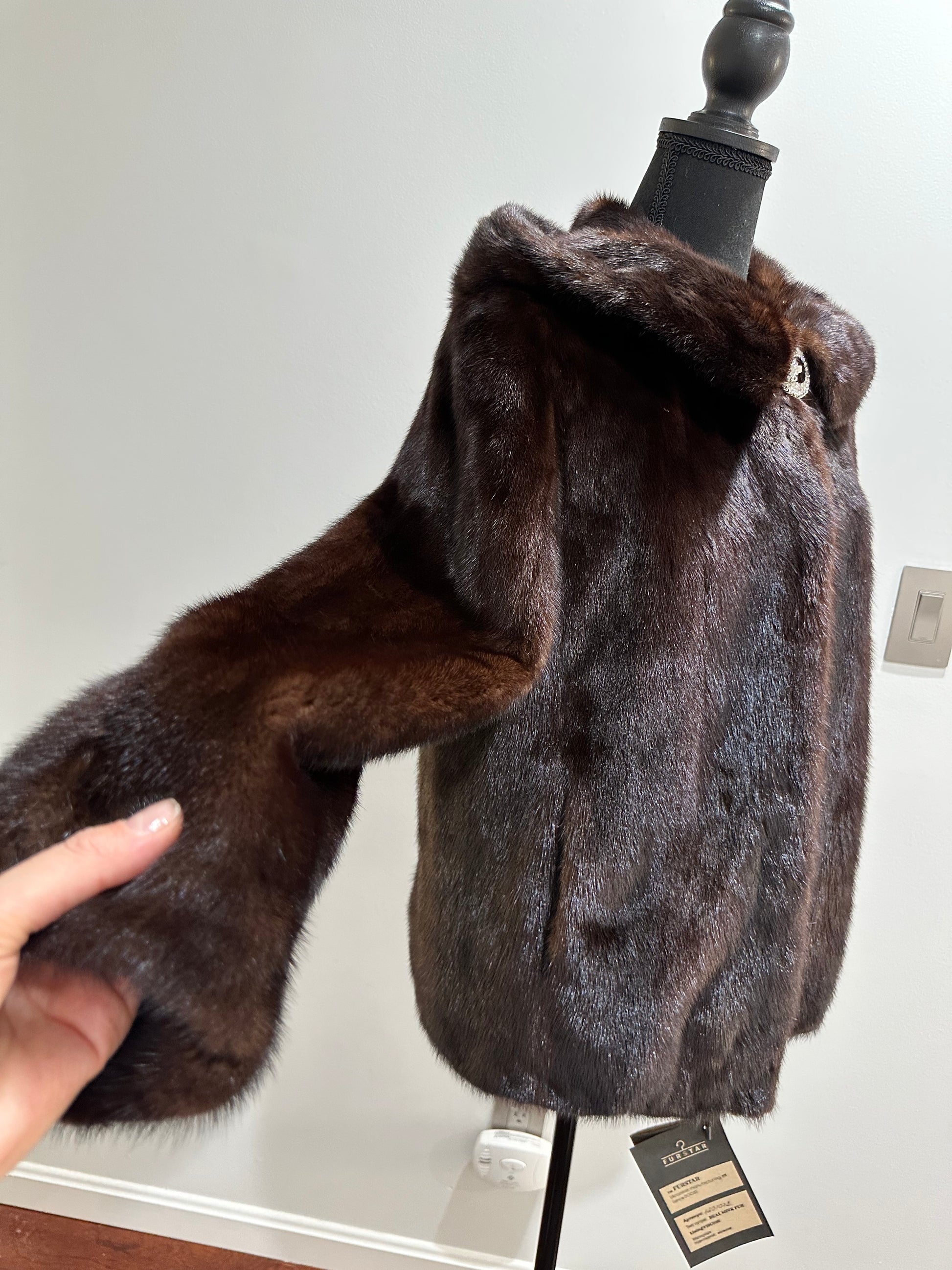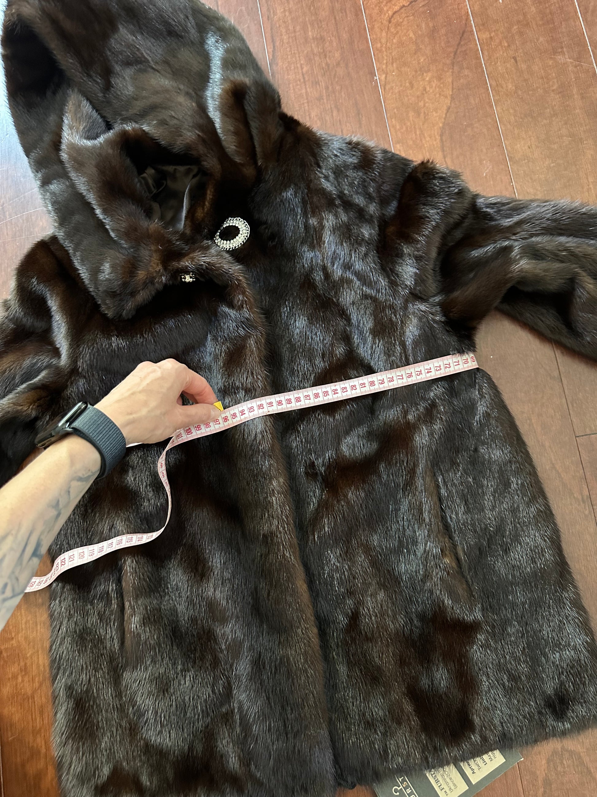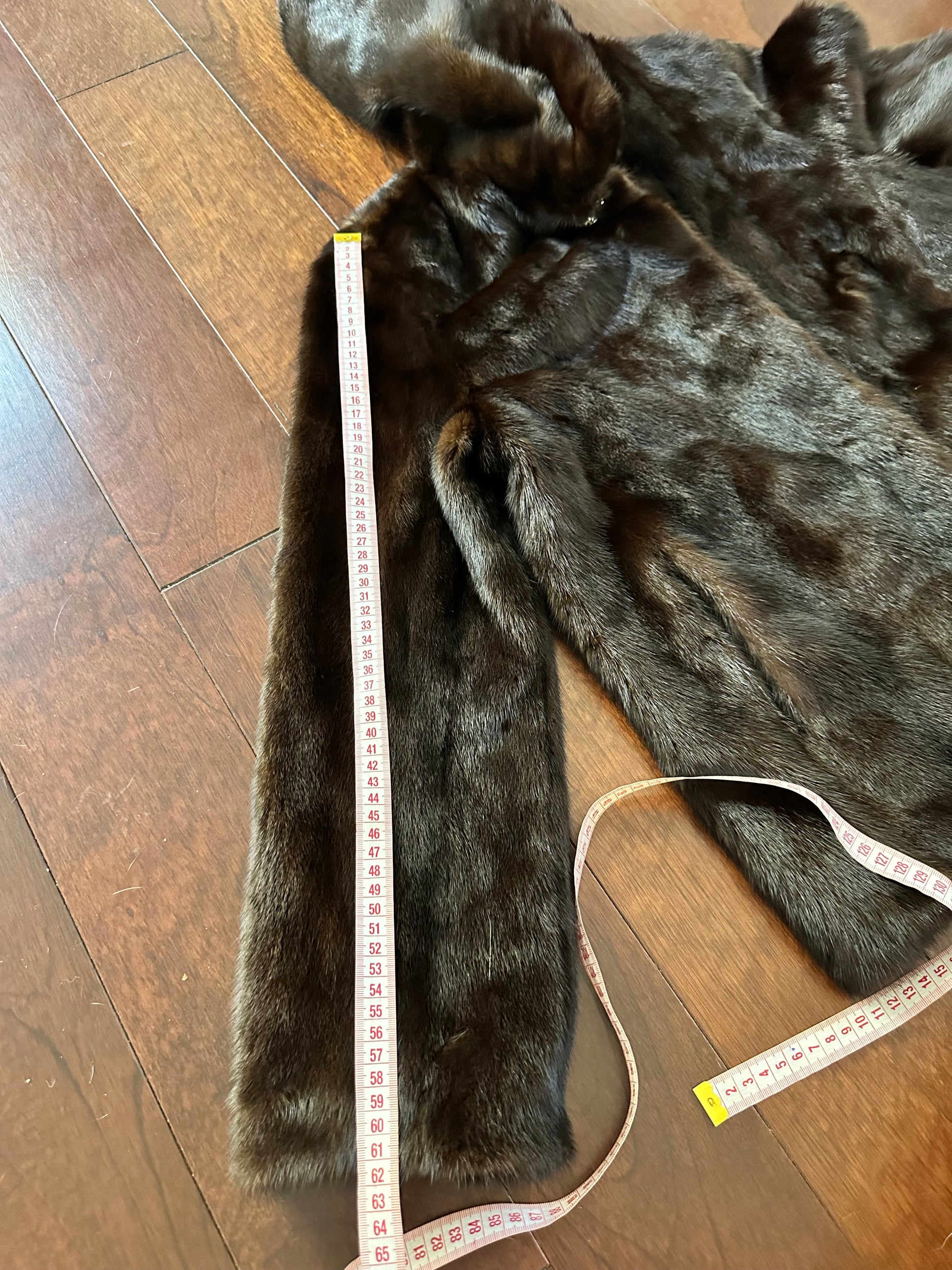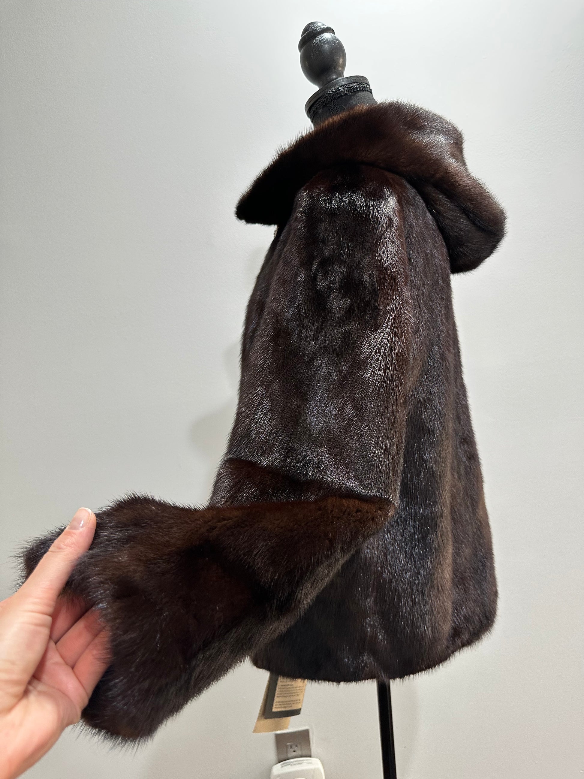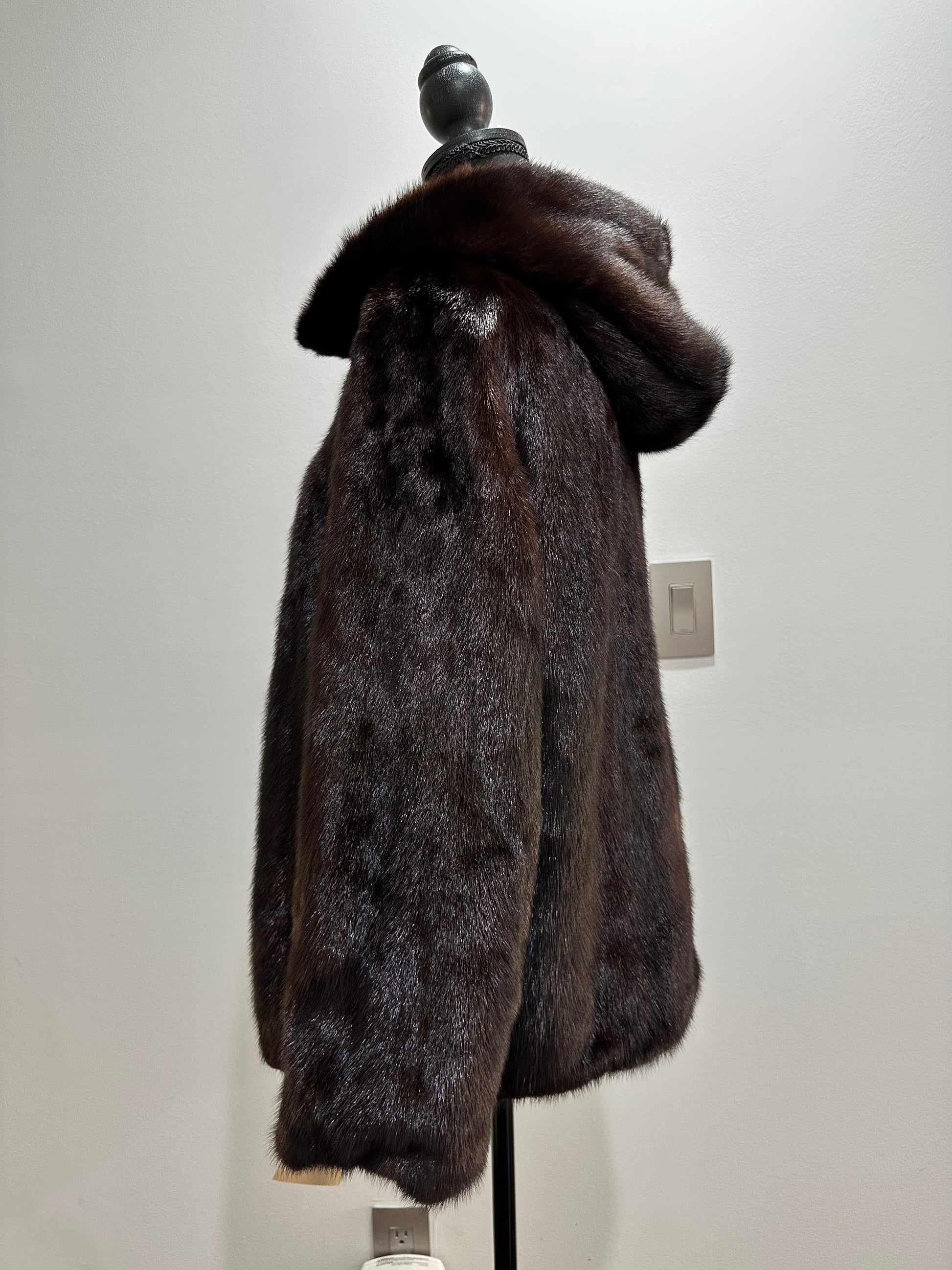 Women's mink fur FULL SKINS coat with a hood size S model bomber. Color - deep dark brown, natural color. The sleeves are long. There are 2 pockets. Fastens with hooks. Ukrainian manufacturer trade mark FURSTAR. Mink - soft, shiny pile, fluffy, beautiful shade. Hand-sewn viscose lining.