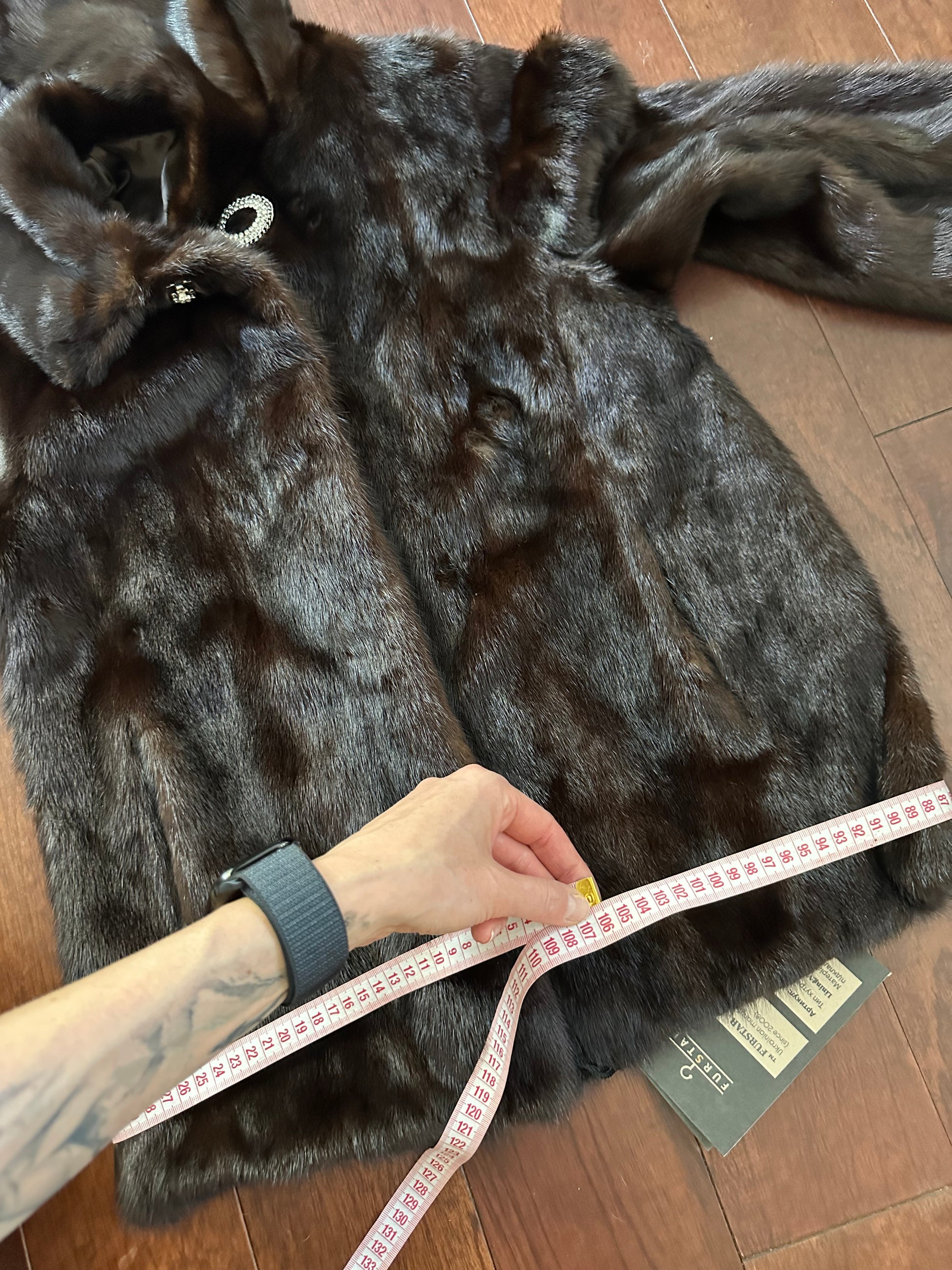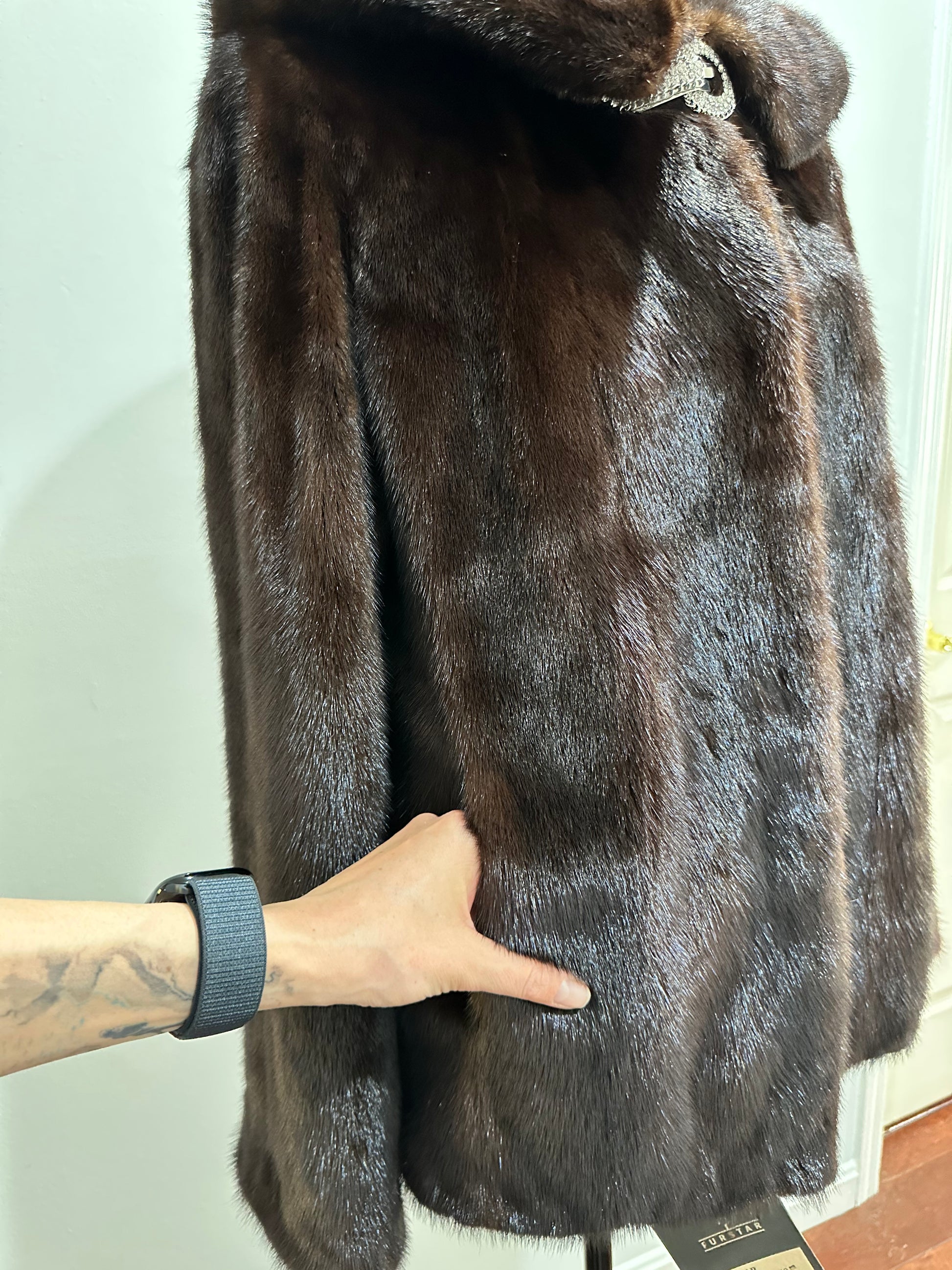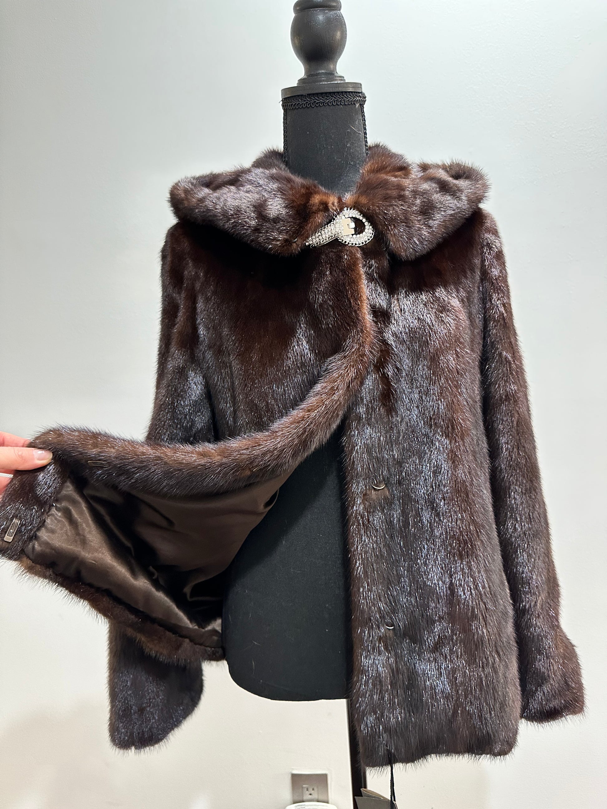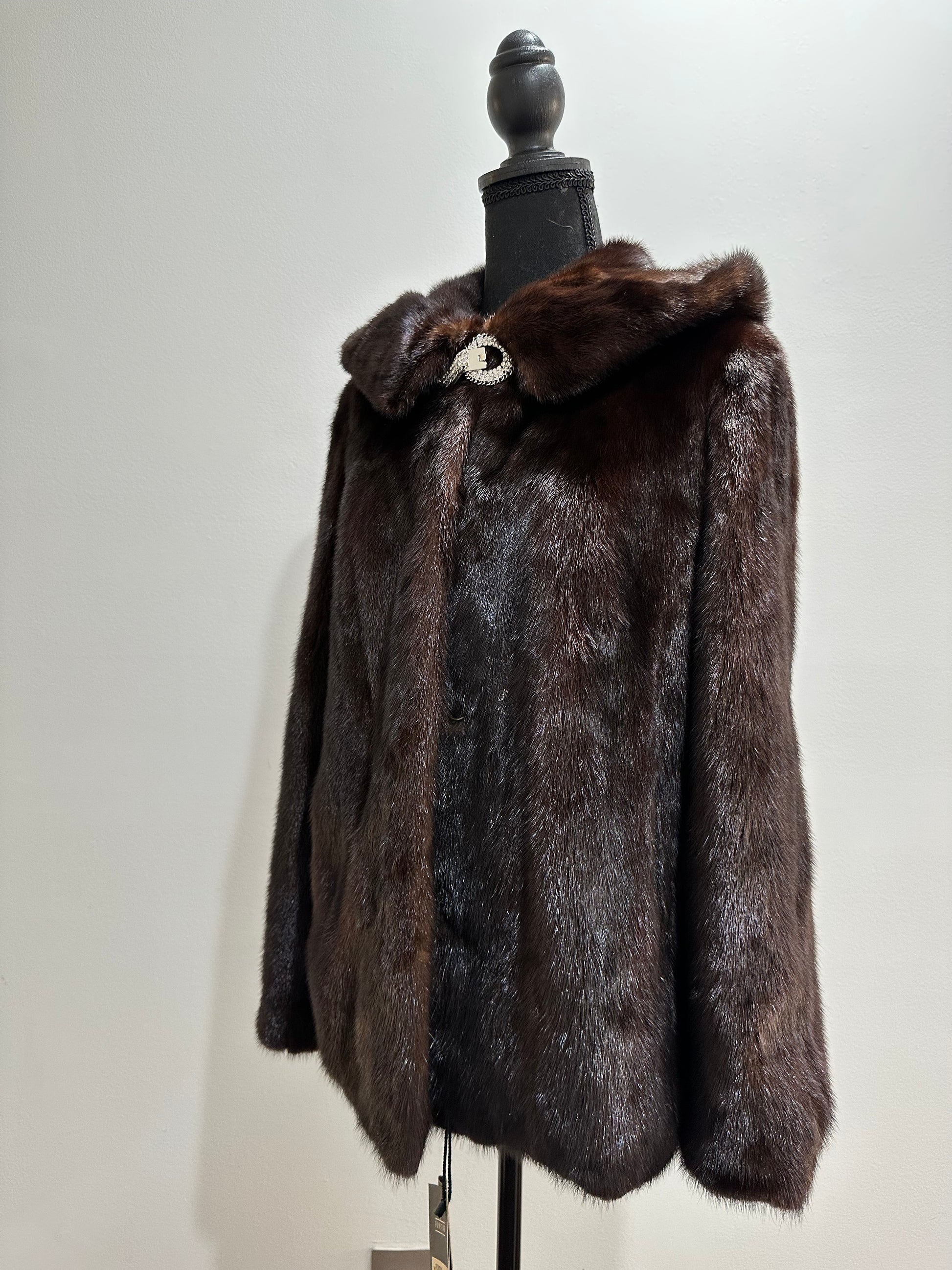 Women's mink fur FULL SKINS coat with a hood size S model bomber. Color - deep dark brown, natural color. The sleeves are long. There are 2 pockets. Fastens with hooks. Ukrainian manufacturer trade mark FURSTAR. Mink - soft, shiny pile, fluffy, beautiful shade. Hand-sewn viscose lining.