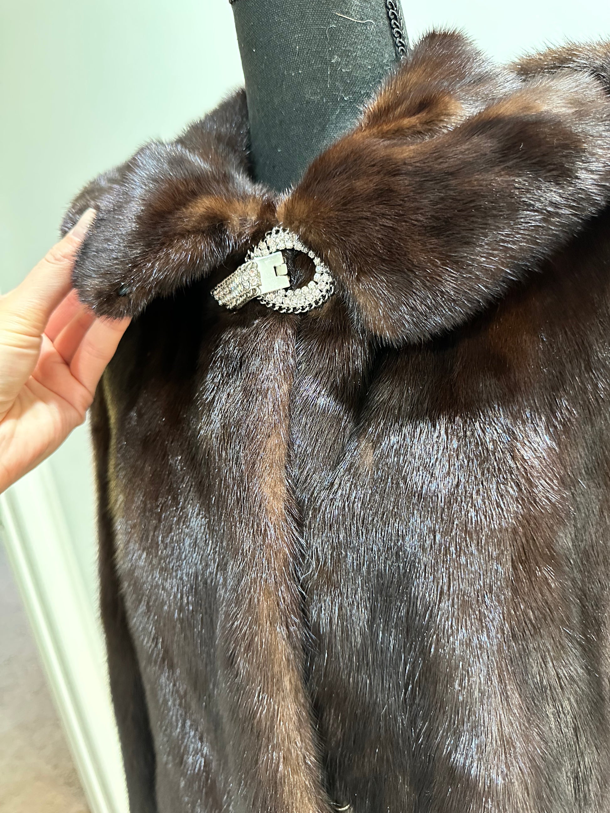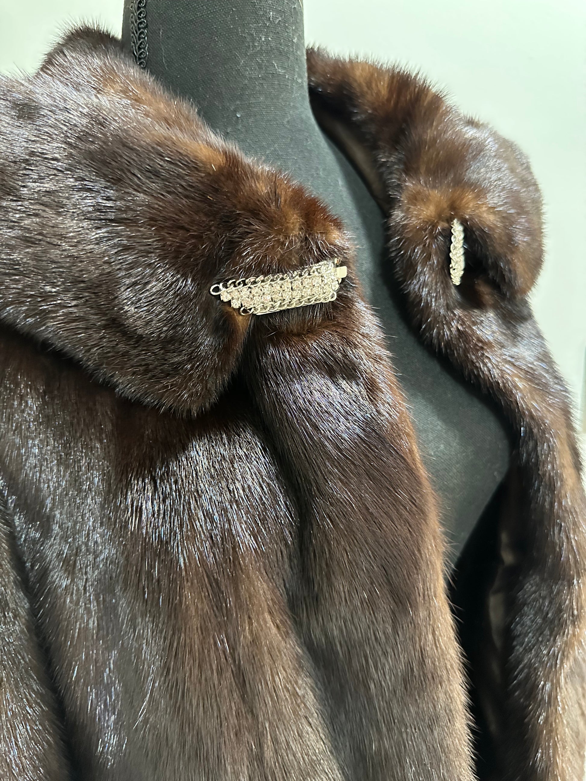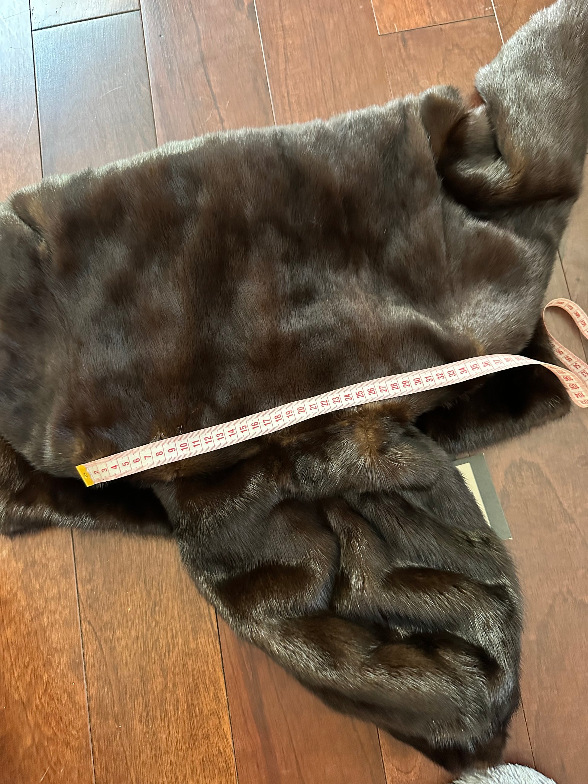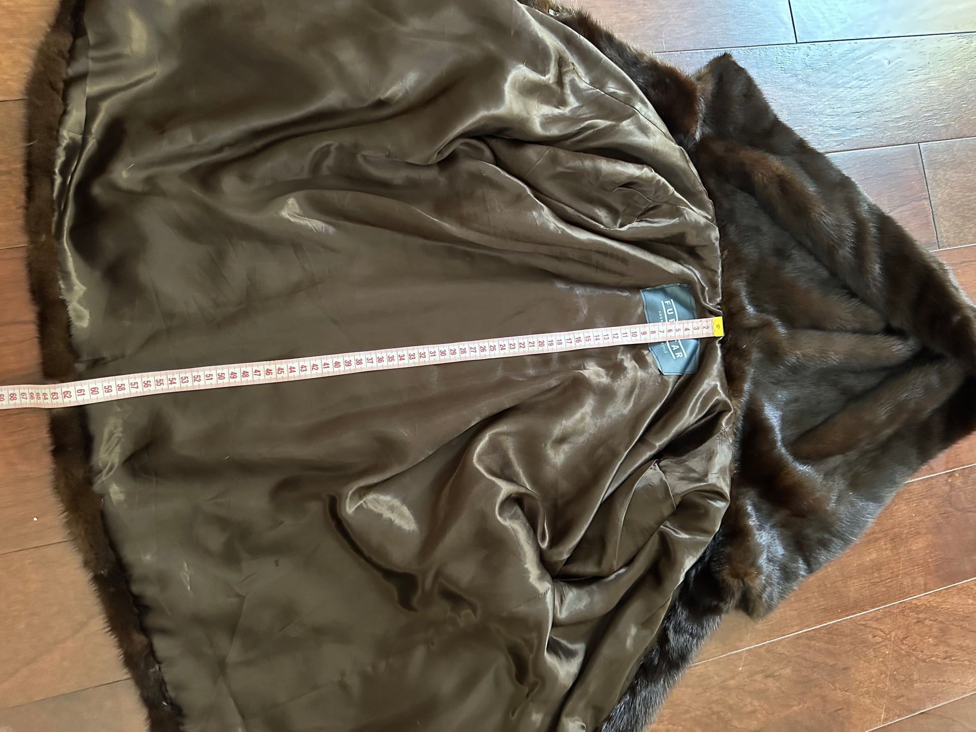 Women's mink fur FULL SKINS coat with a hood size S model bomber. Color - deep dark brown, natural color. The sleeves are long. There are 2 pockets. Fastens with hooks. Ukrainian manufacturer trade mark FURSTAR. Mink - soft, shiny pile, fluffy, beautiful shade. Hand-sewn viscose lining.
