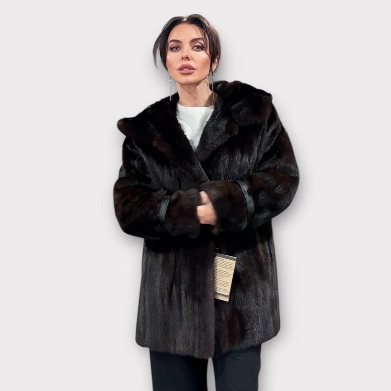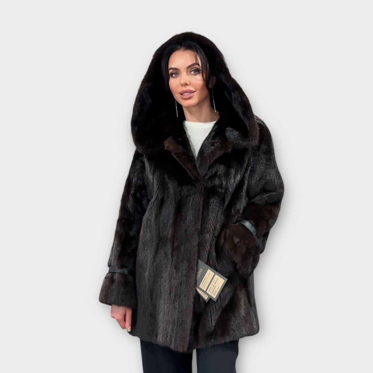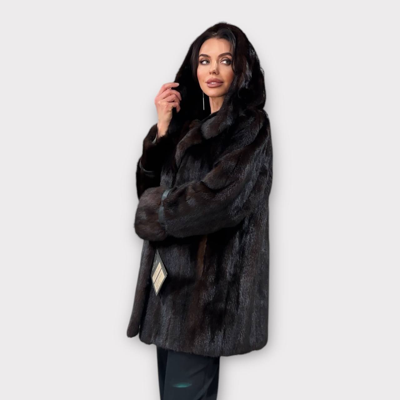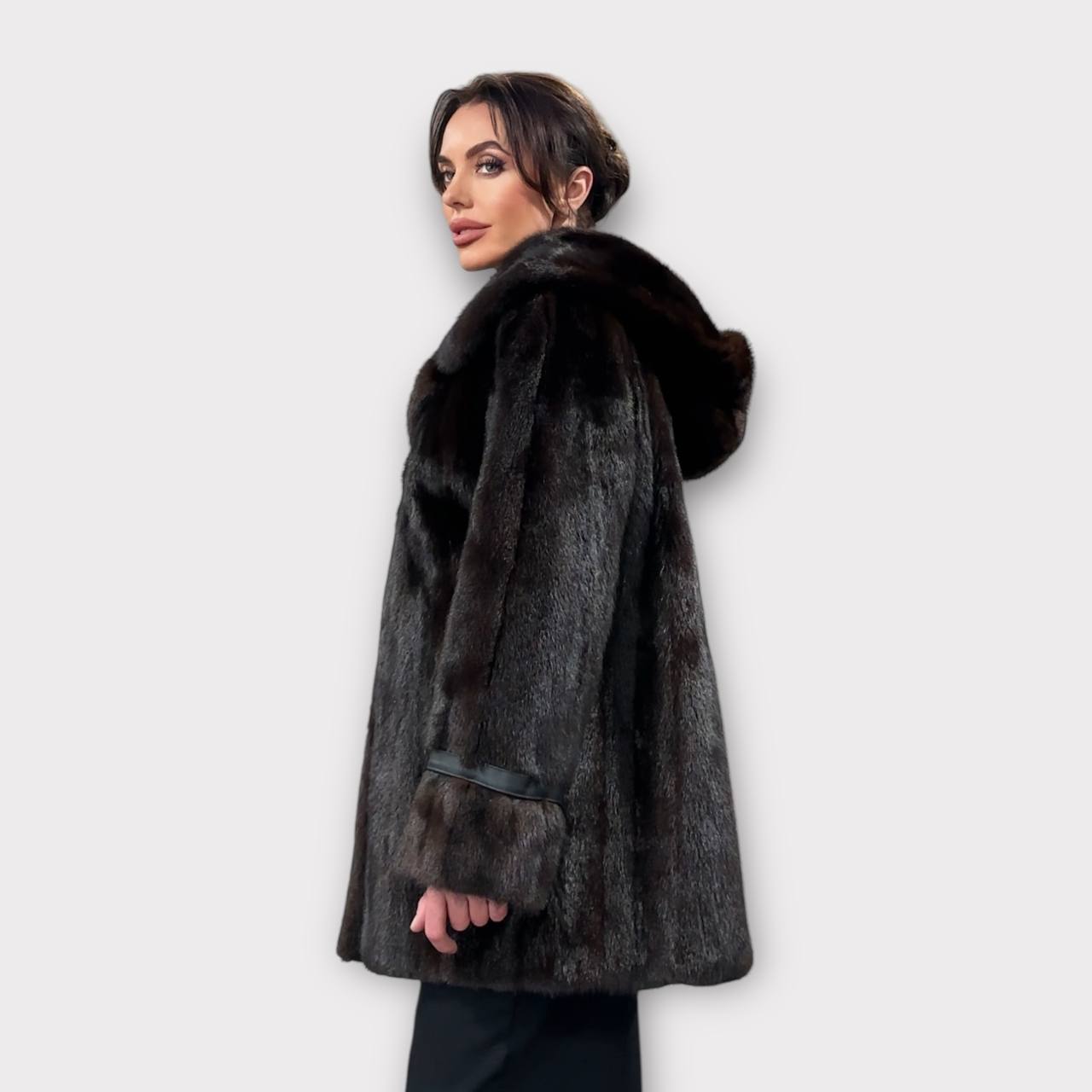 Women's mink fur FULL SKINS coat with a hood size L model bomber. Color - deep dark brown, natural color. The sleeves are long. There are 2 pockets. Fastens with hooks. Ukrainian manufacturer trade mark FURSTAR. Mink - soft, shiny pile, fluffy, beautiful shade. Hand-sewn viscose lining.