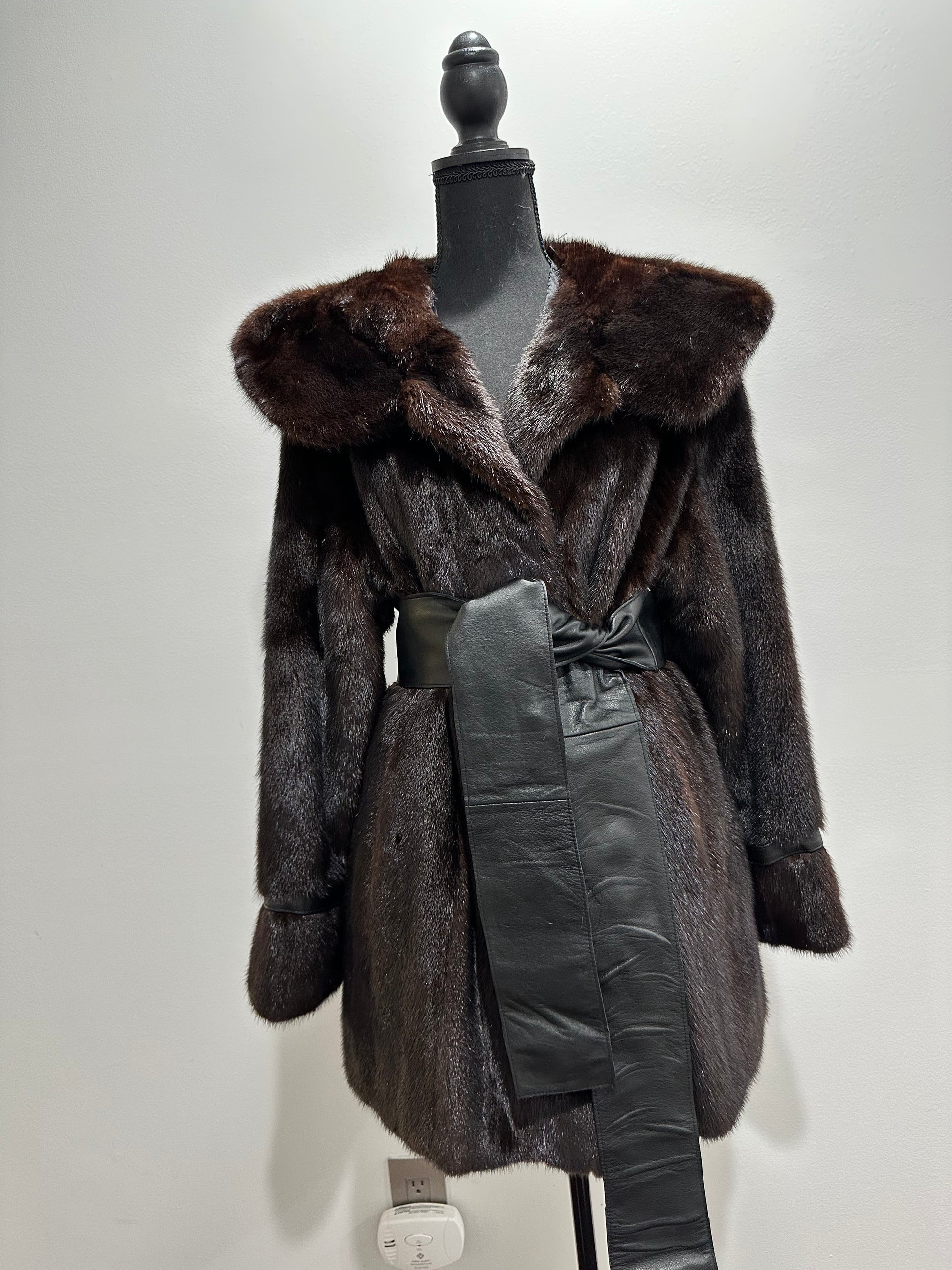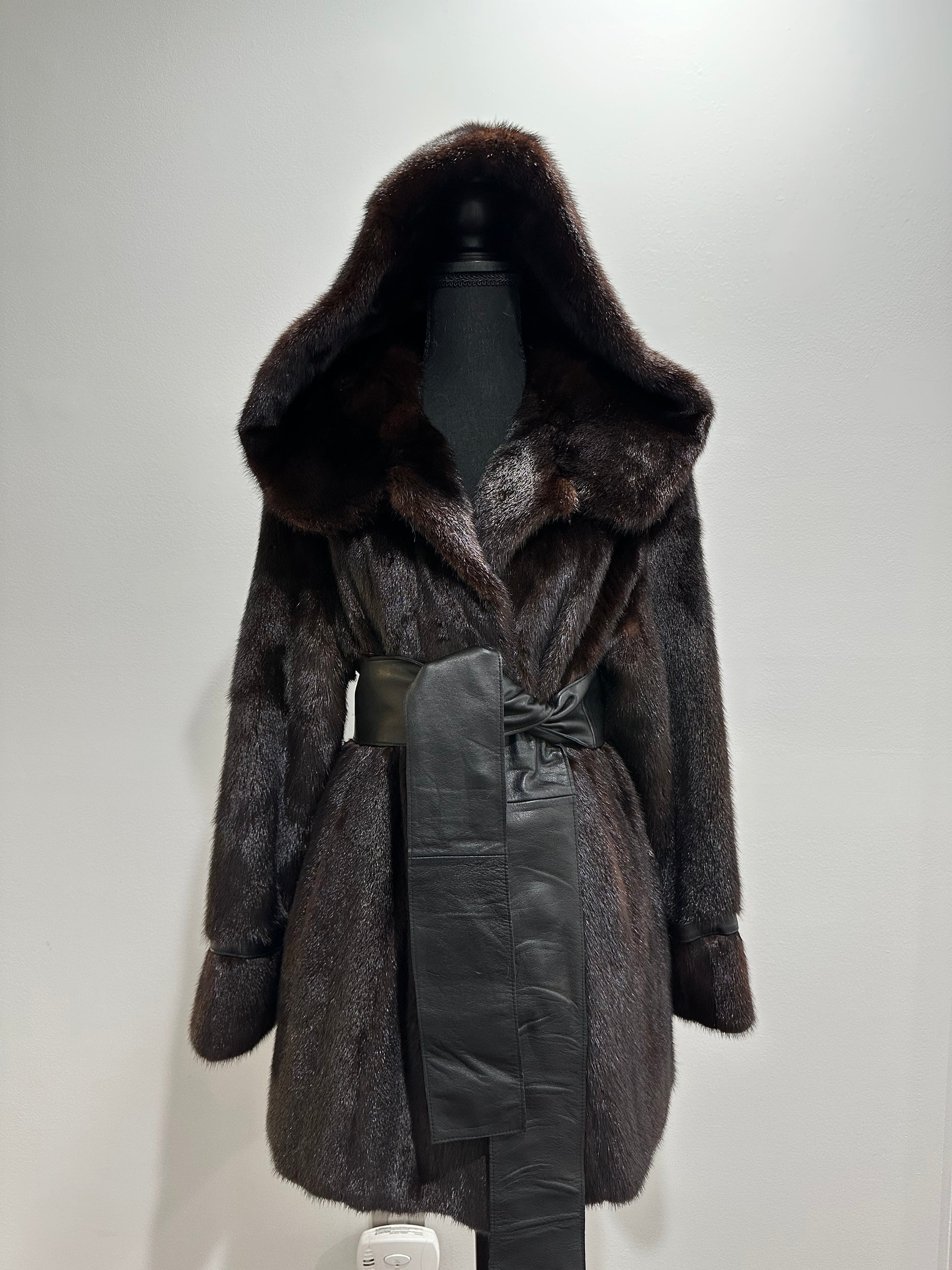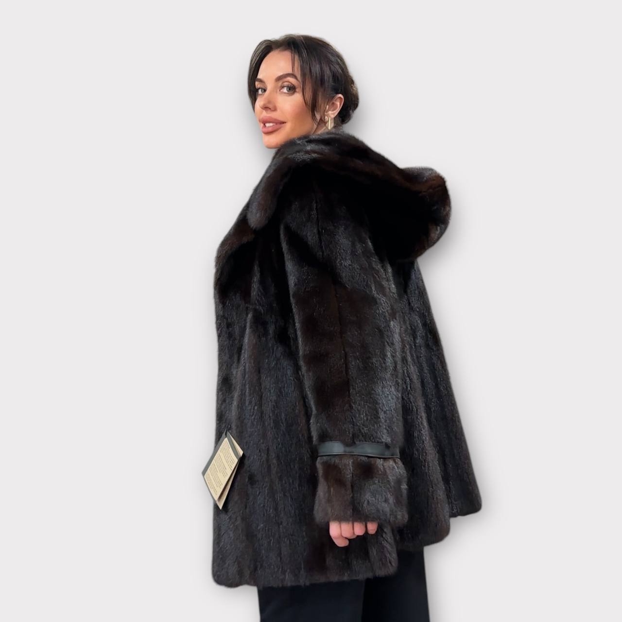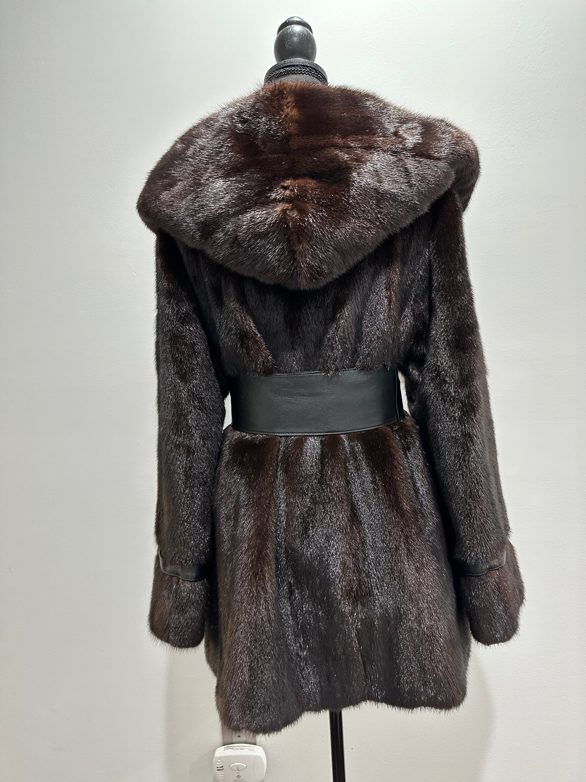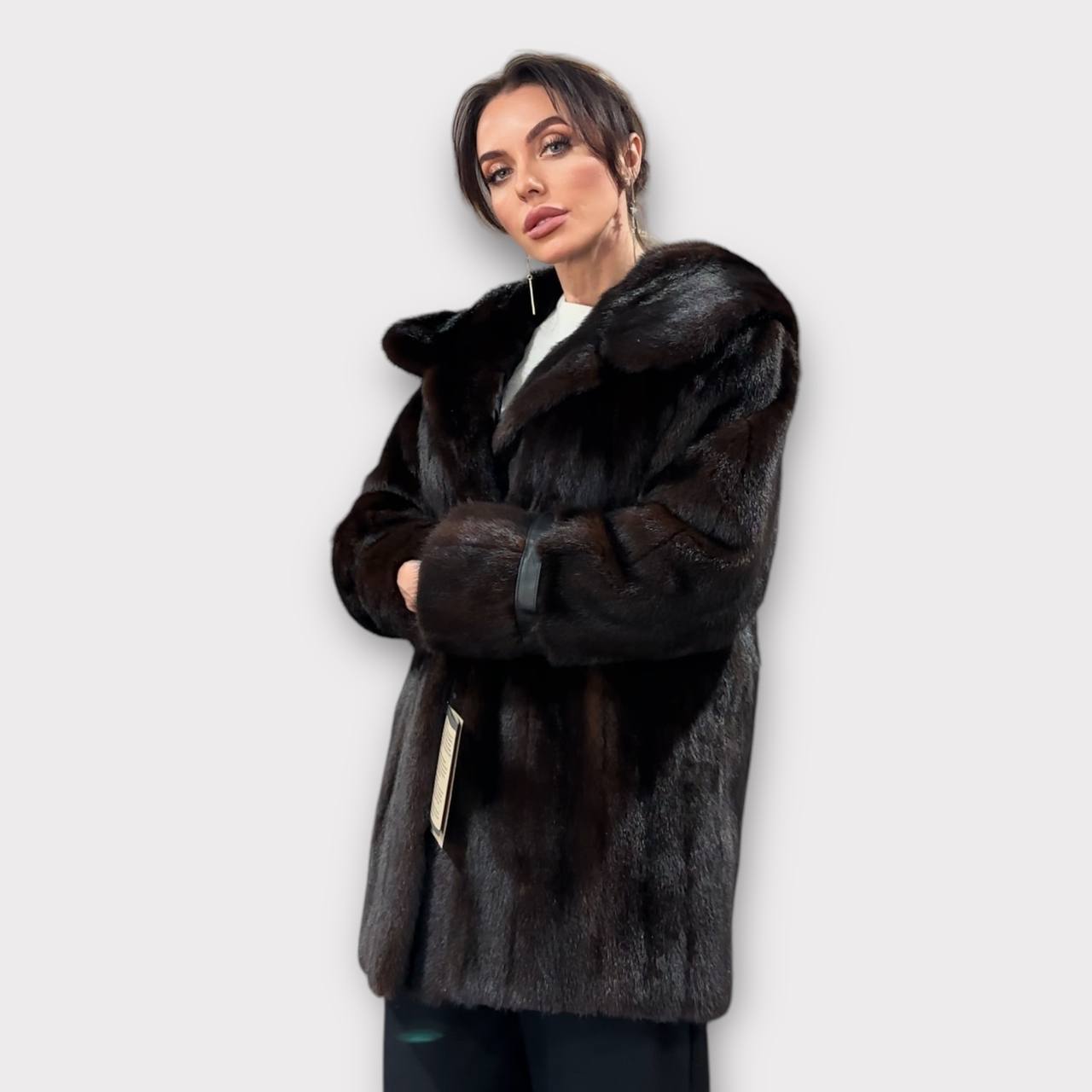 Women's mink fur FULL SKINS coat with a hood size L model bomber. Color - deep dark brown, natural color. The sleeves are long. There are 2 pockets. Fastens with hooks. Ukrainian manufacturer trade mark FURSTAR. Mink - soft, shiny pile, fluffy, beautiful shade. Hand-sewn viscose lining.