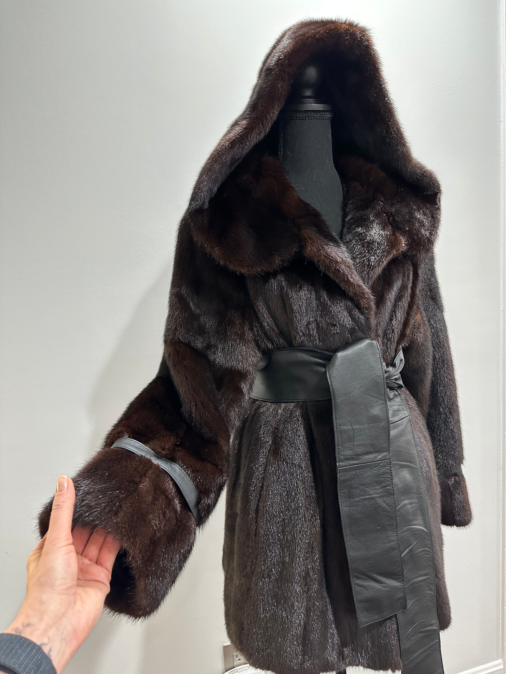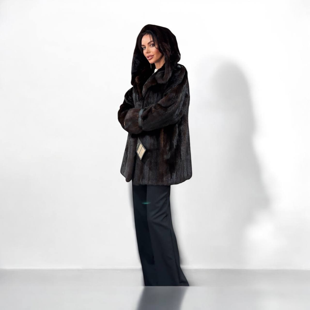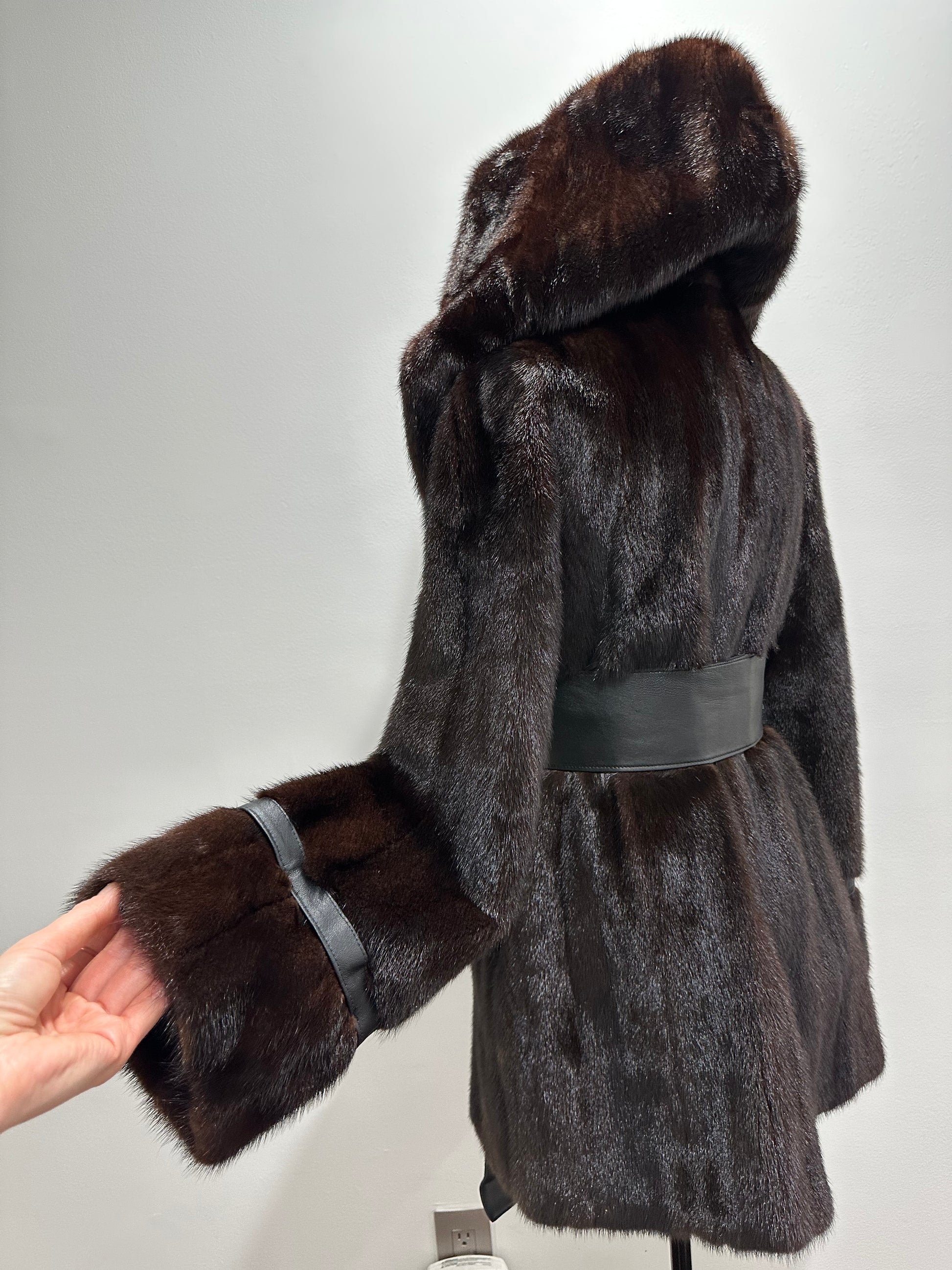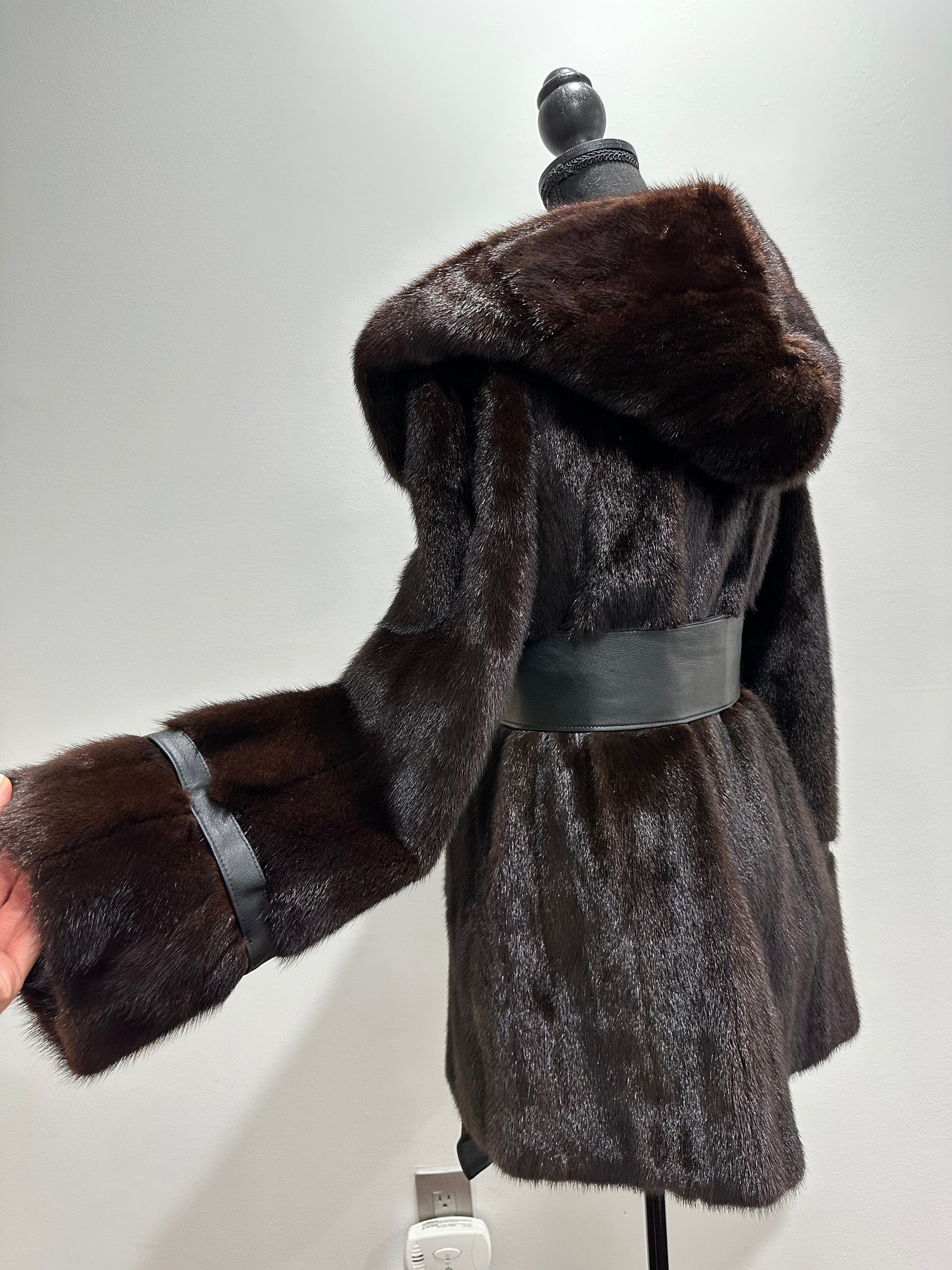Women's mink fur FULL SKINS coat with a hood size L model bomber. Color - deep dark brown, natural color. The sleeves are long. There are 2 pockets. Fastens with hooks. Ukrainian manufacturer trade mark FURSTAR. Mink - soft, shiny pile, fluffy, beautiful shade. Hand-sewn viscose lining.