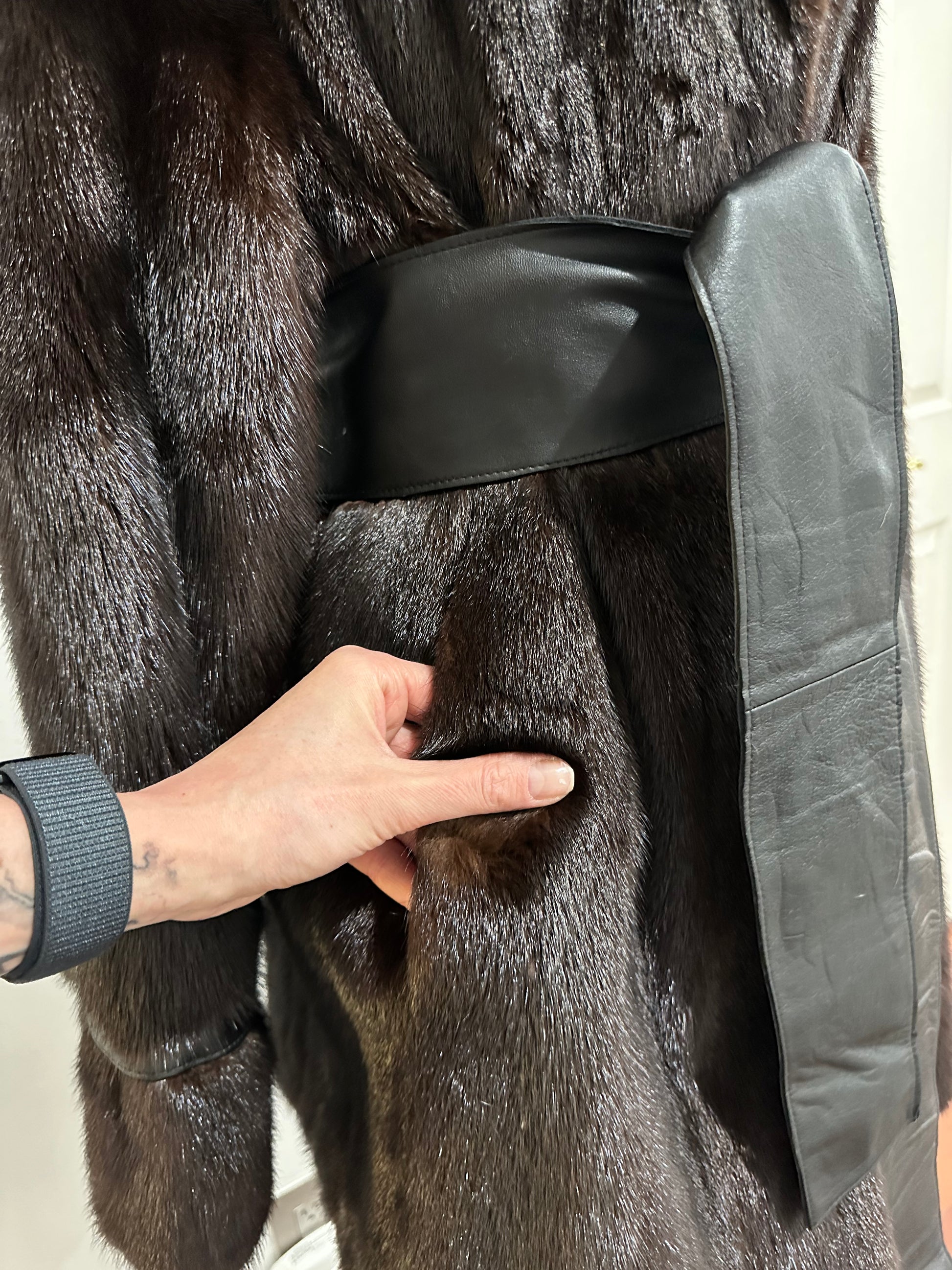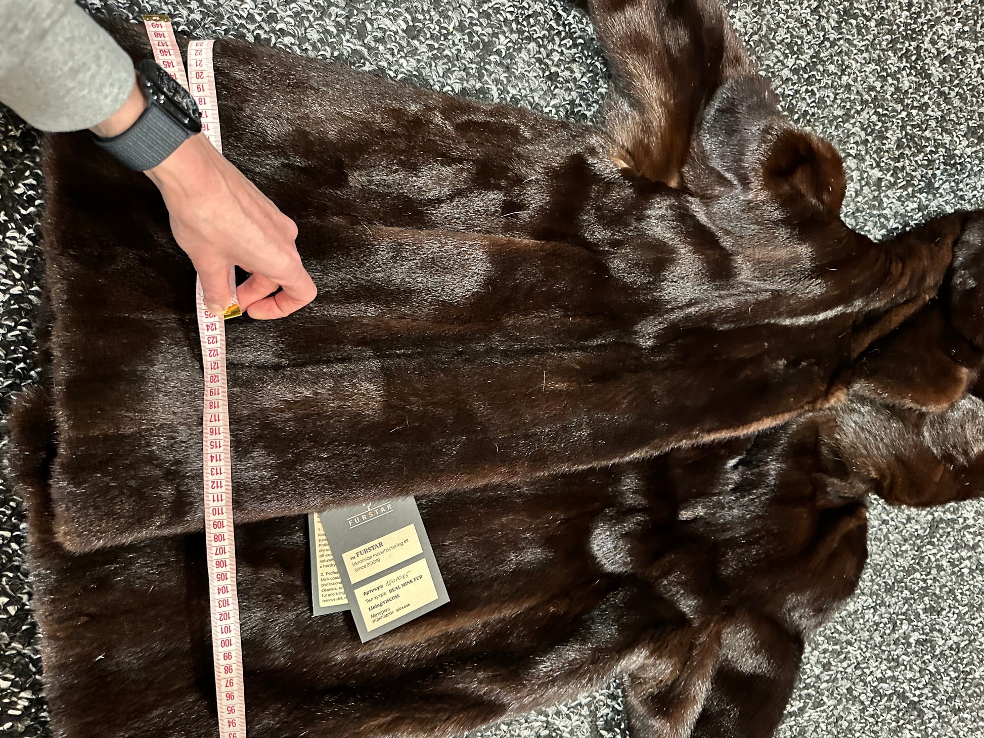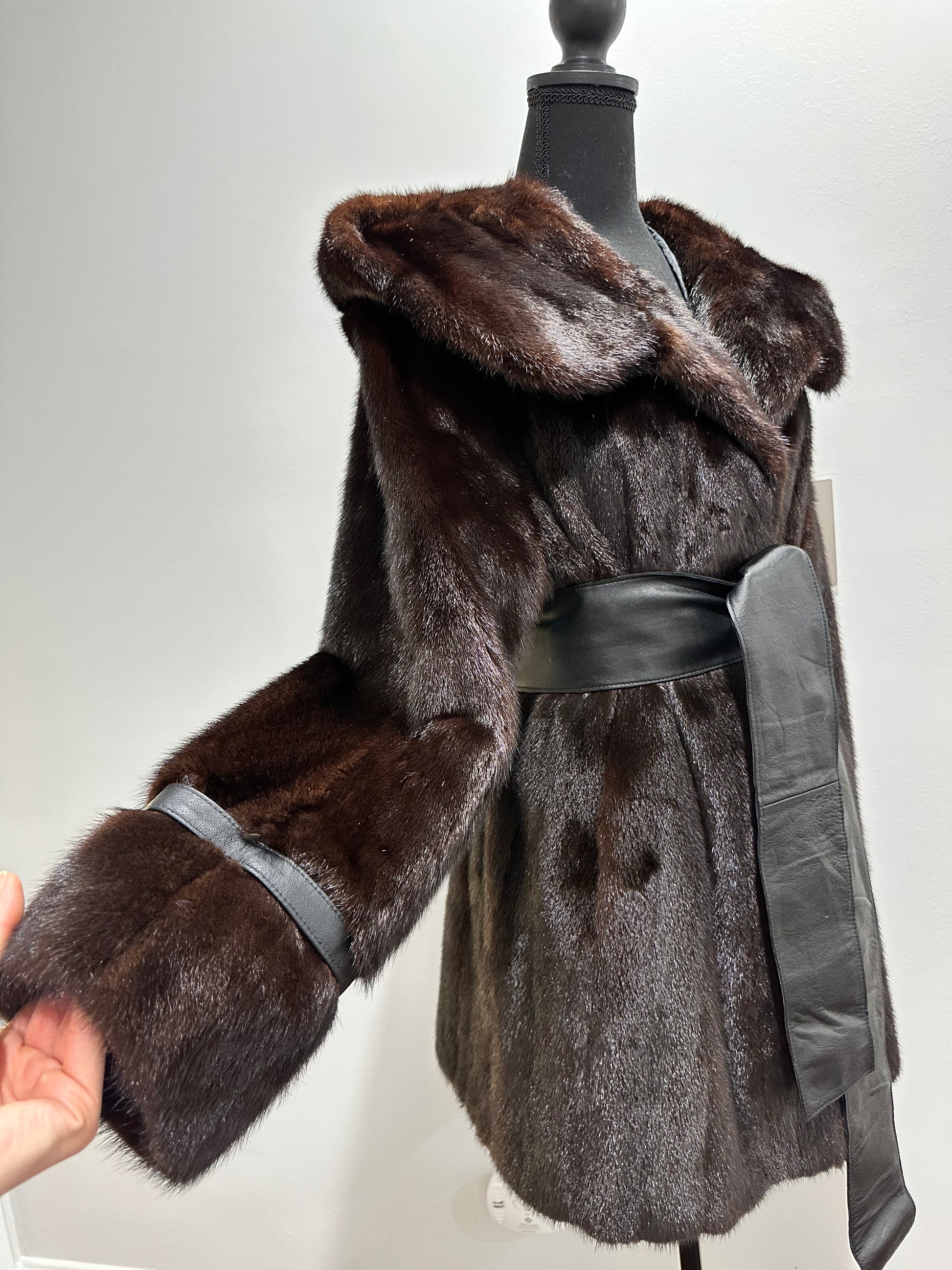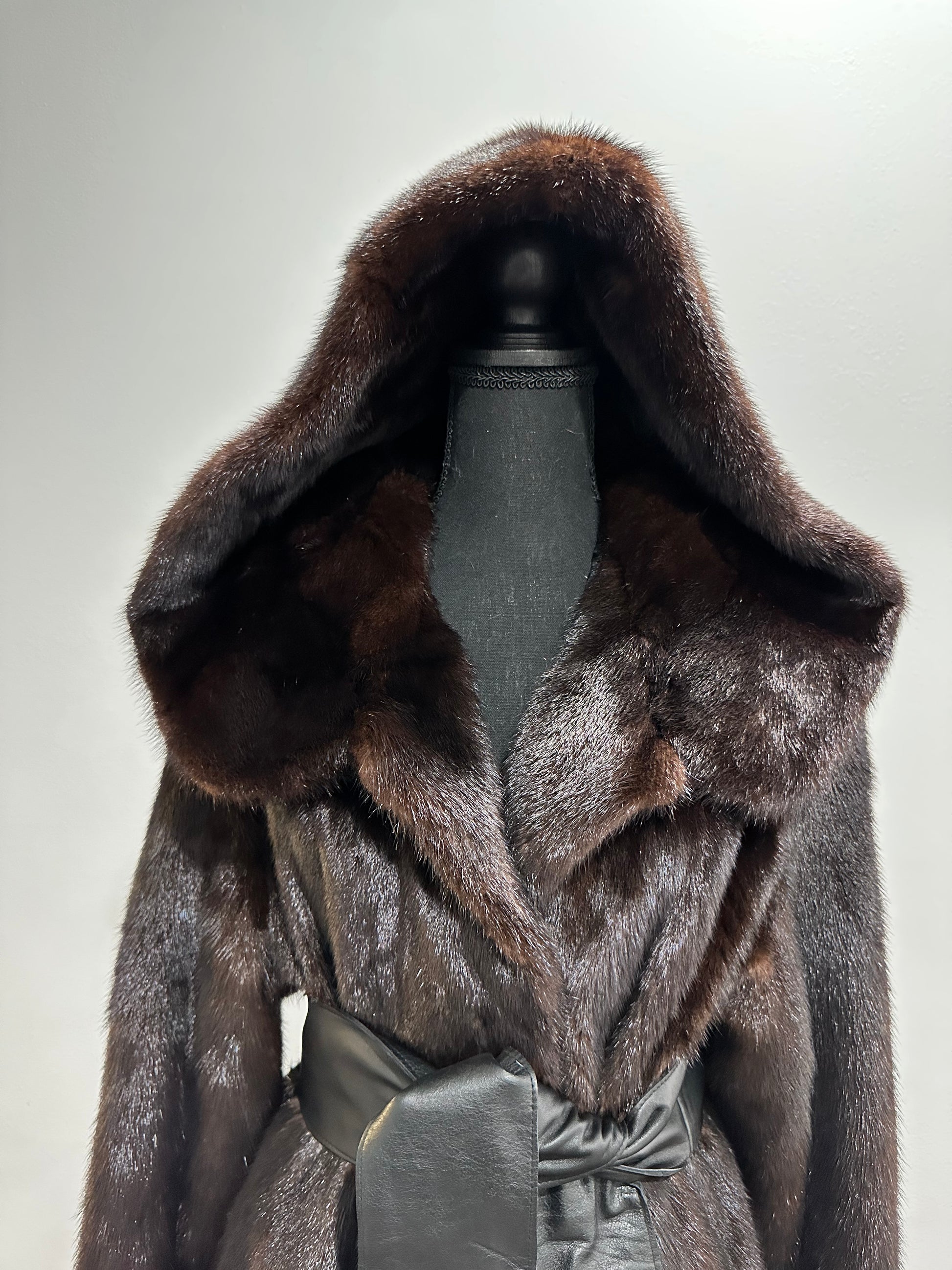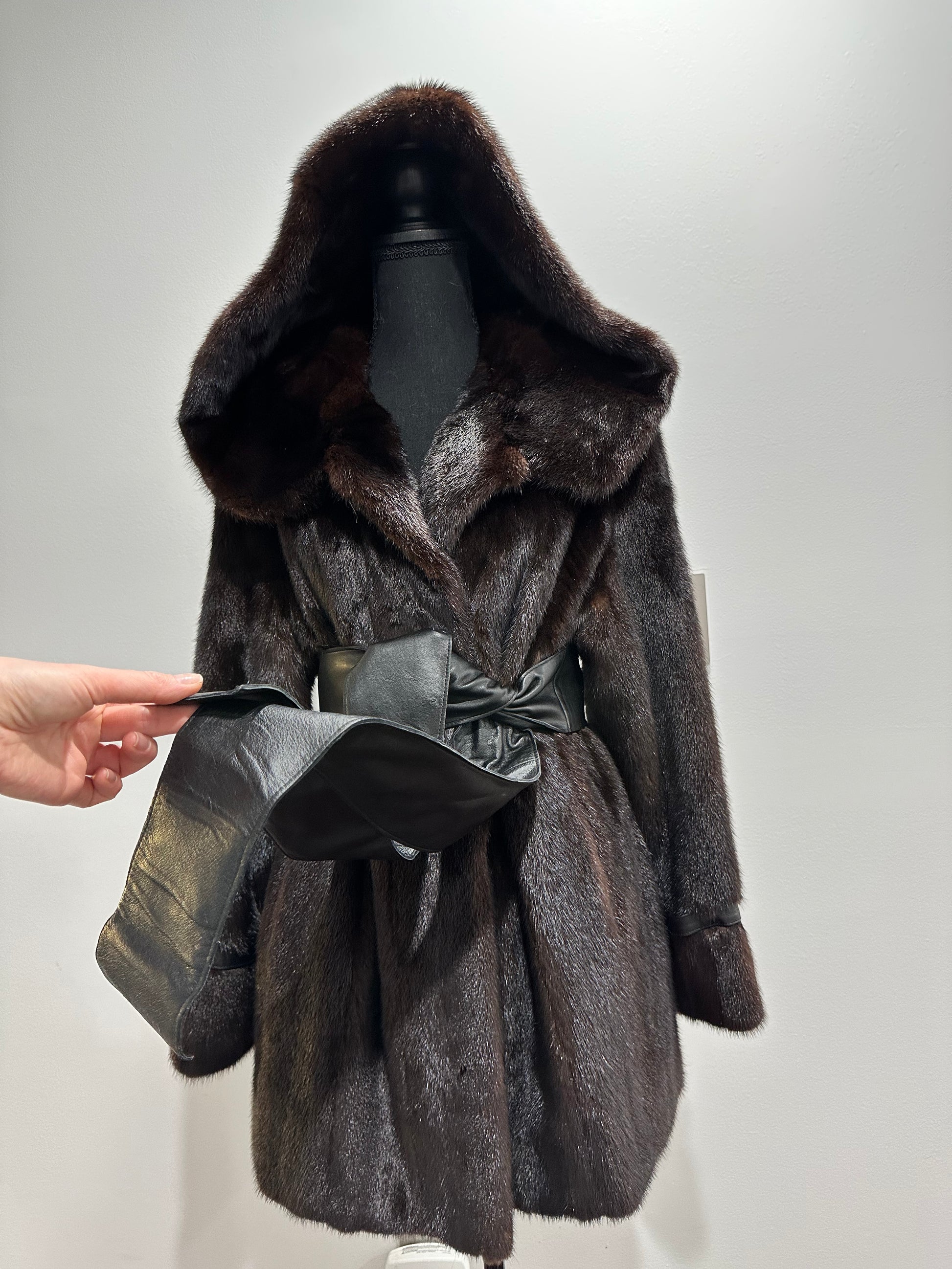 Women's mink fur FULL SKINS coat with a hood size L model bomber. Color - deep dark brown, natural color. The sleeves are long. There are 2 pockets. Fastens with hooks. Ukrainian manufacturer trade mark FURSTAR. Mink - soft, shiny pile, fluffy, beautiful shade. Hand-sewn viscose lining.