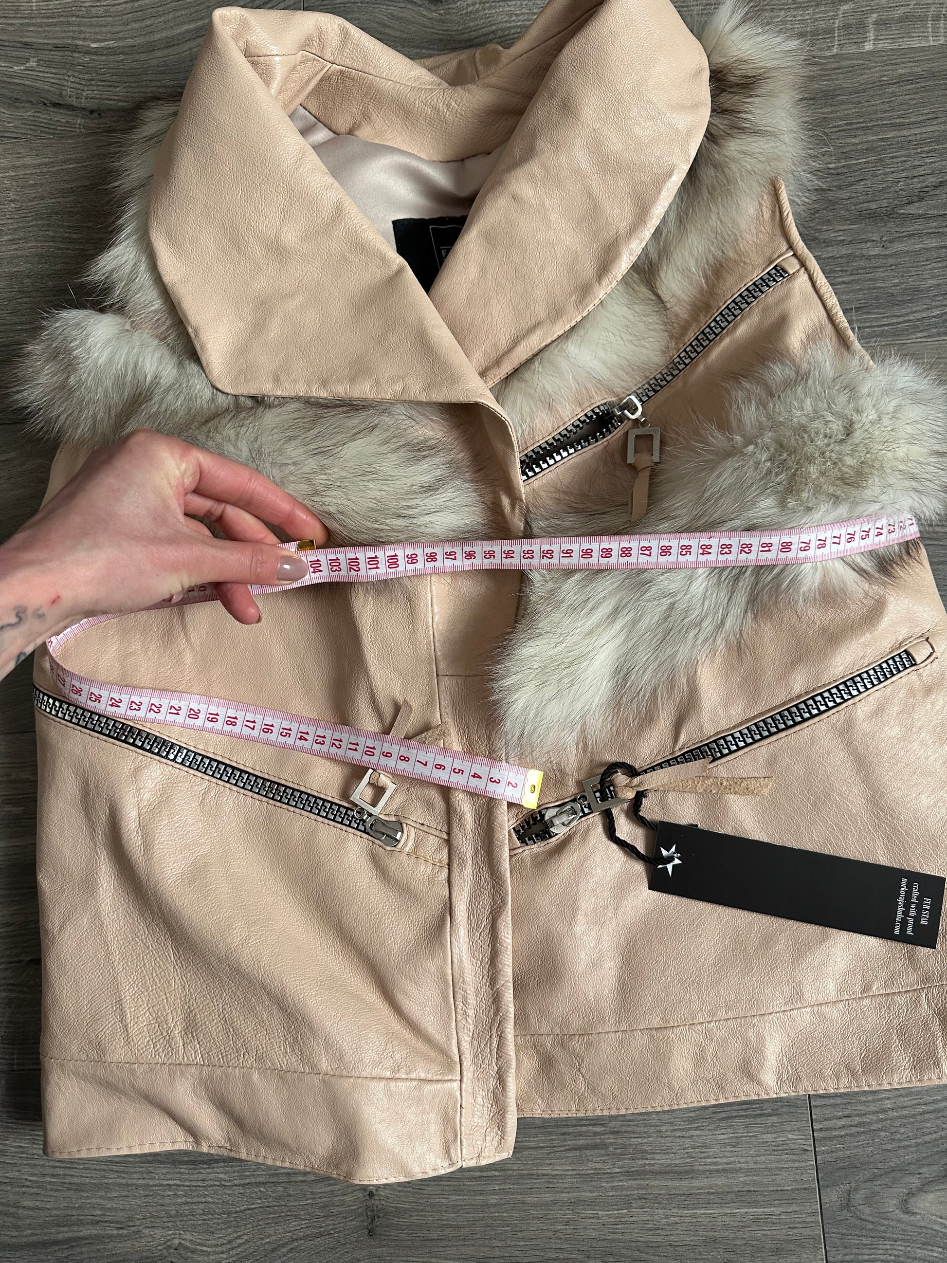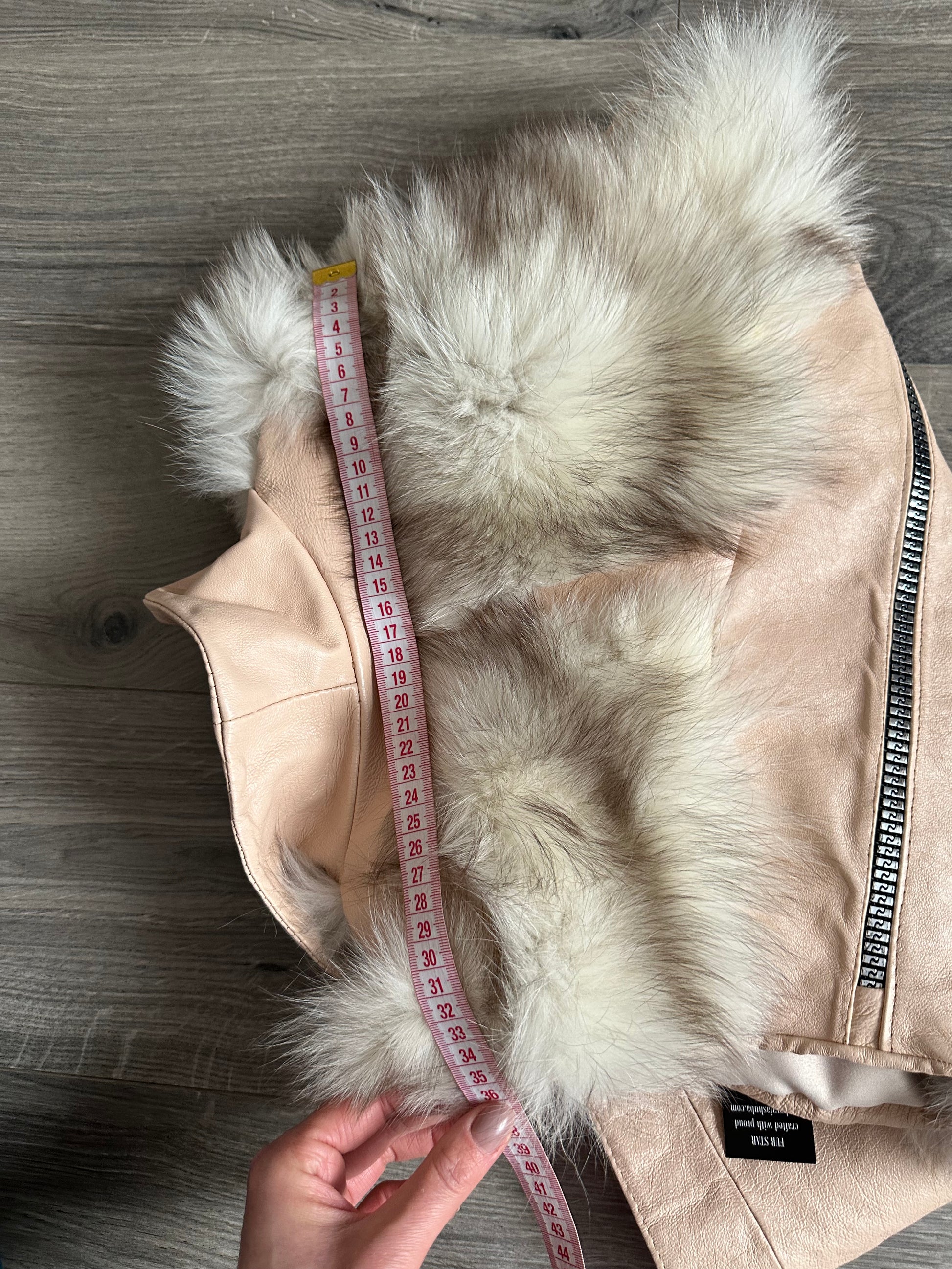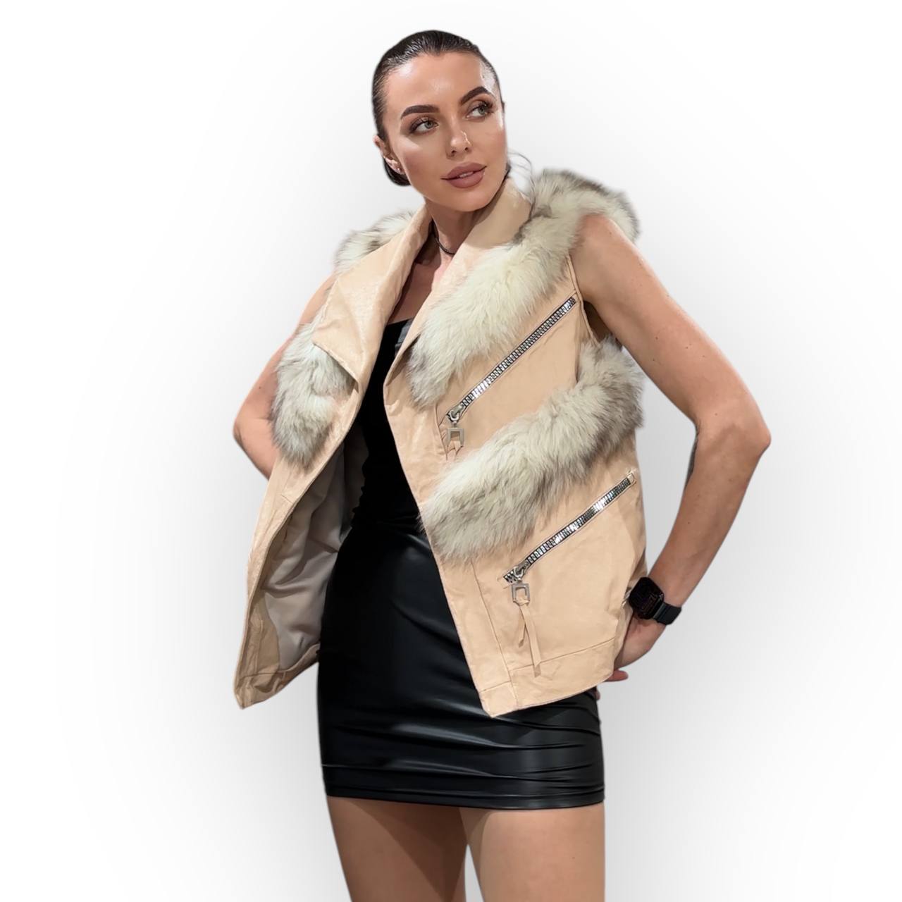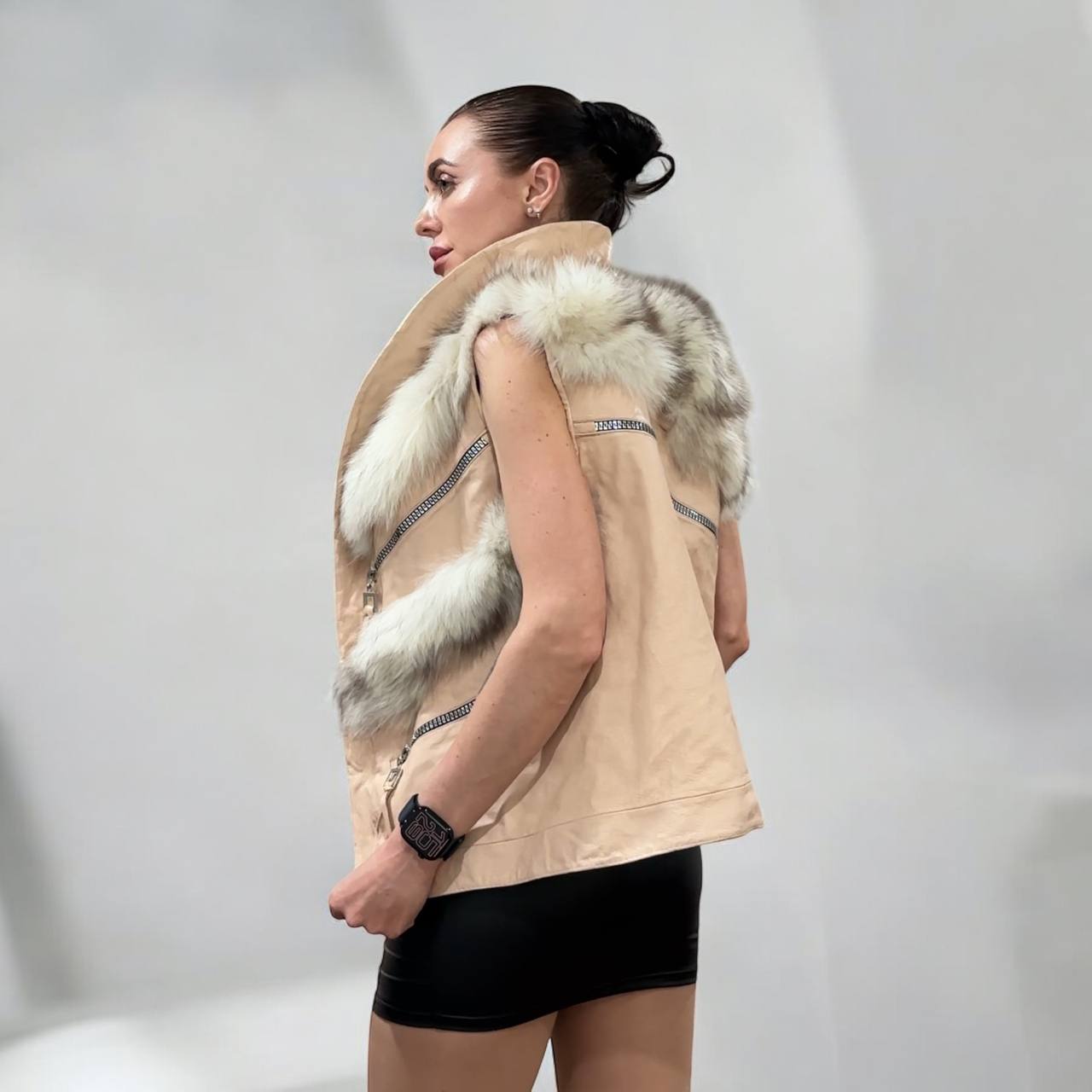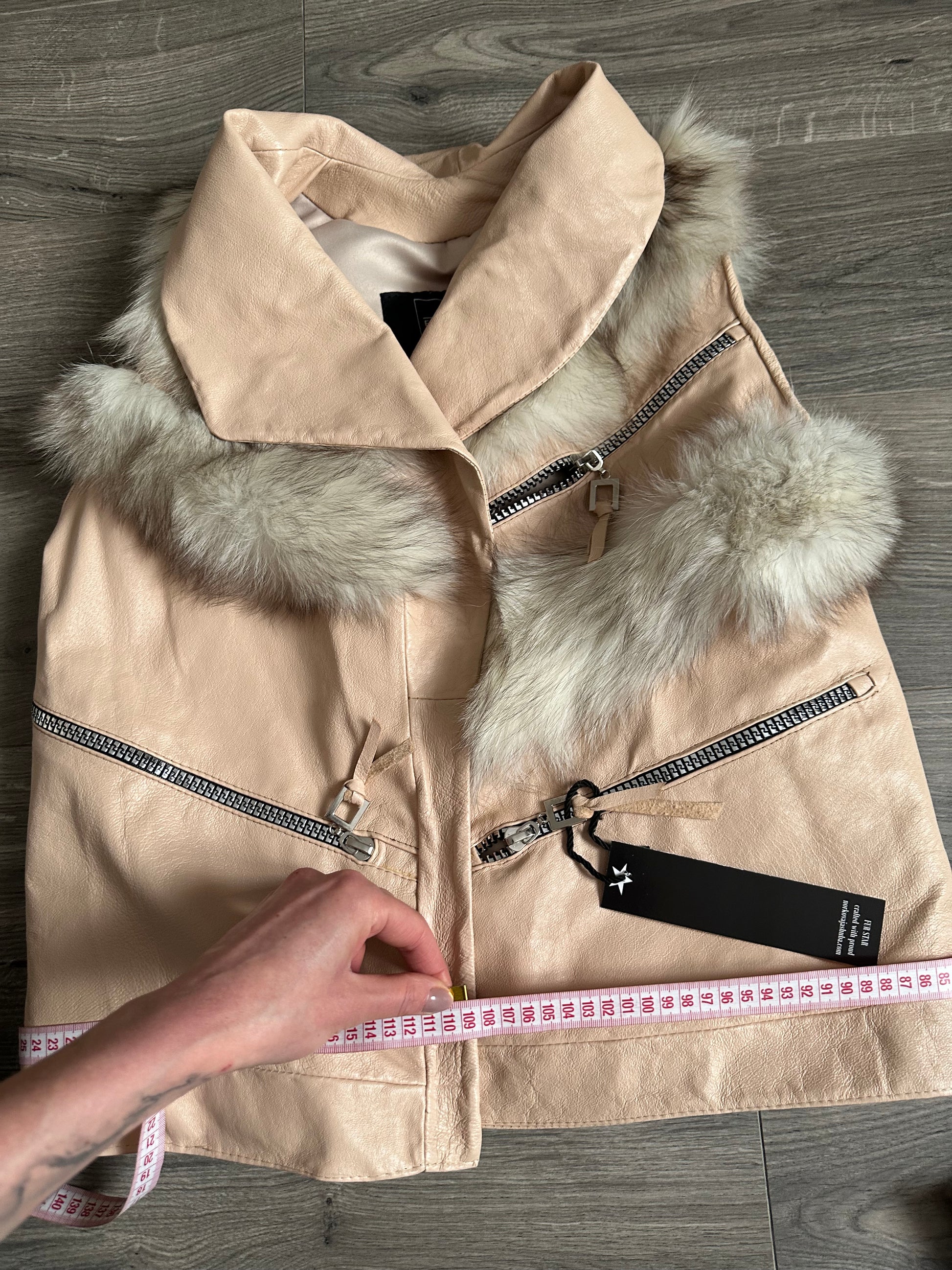 Women's vest made of natural fox fur and genuine leather cream color Size S. Exclusive vest in which you will be irresistible and unique. Fur - fluffy, thick, warm, natural color. Skin - natural cream color. The vest is decorated with snakes. There are 2 pockets. The model is straight. The collar is wide, asymmetrical. There are no fasteners. Viscose lining, hand-sewn. Ukrainian manufacturer.