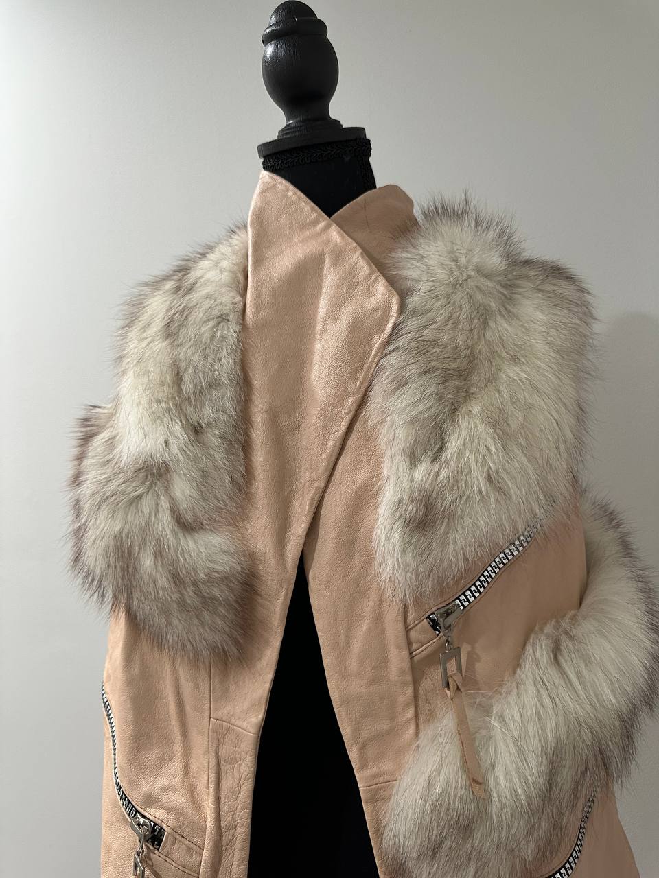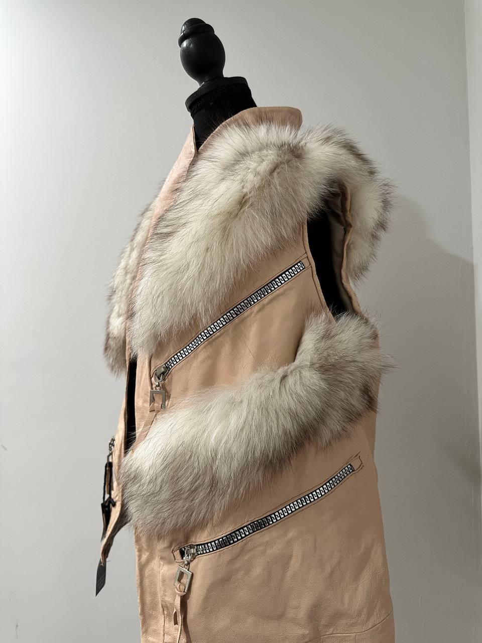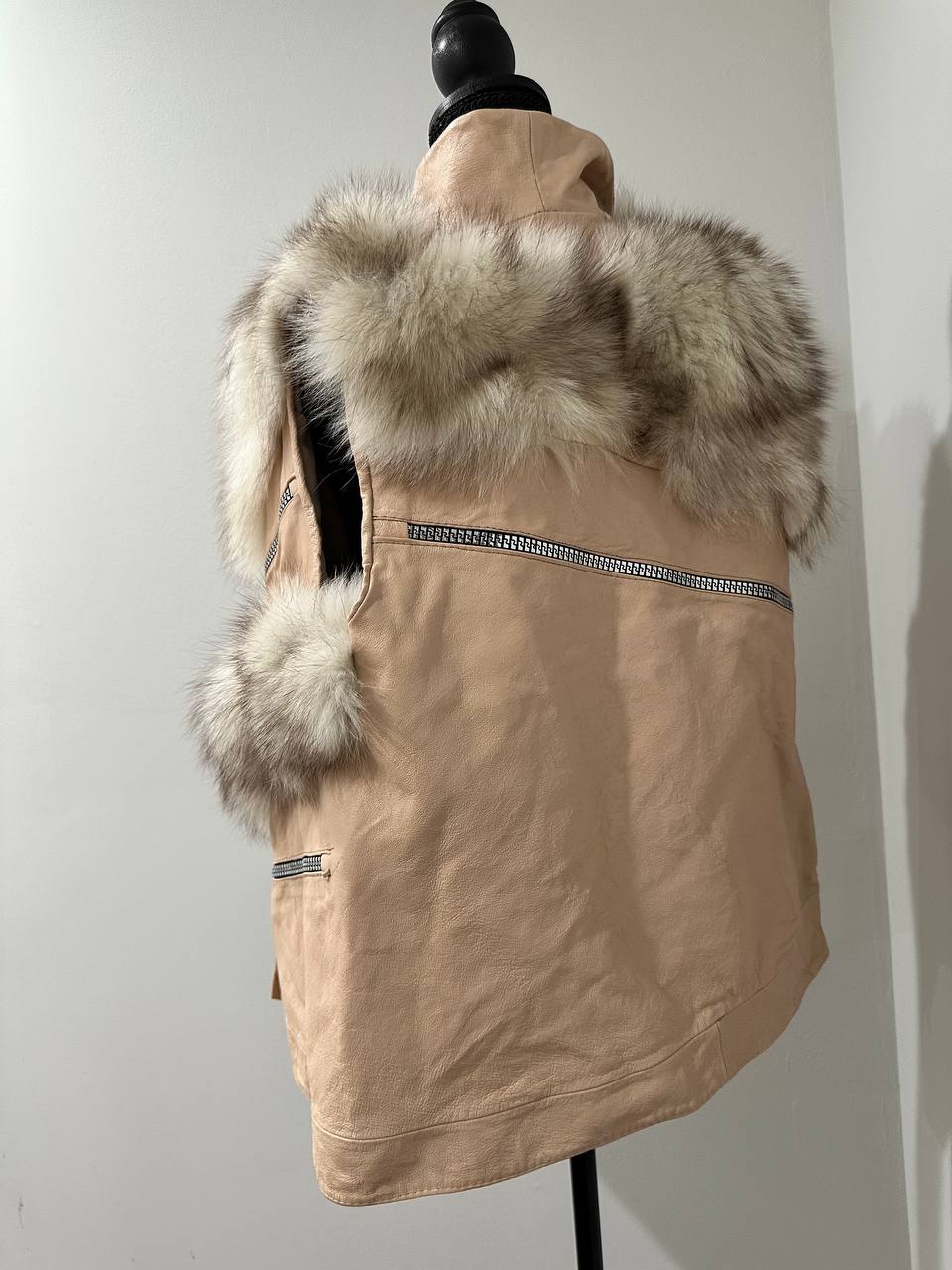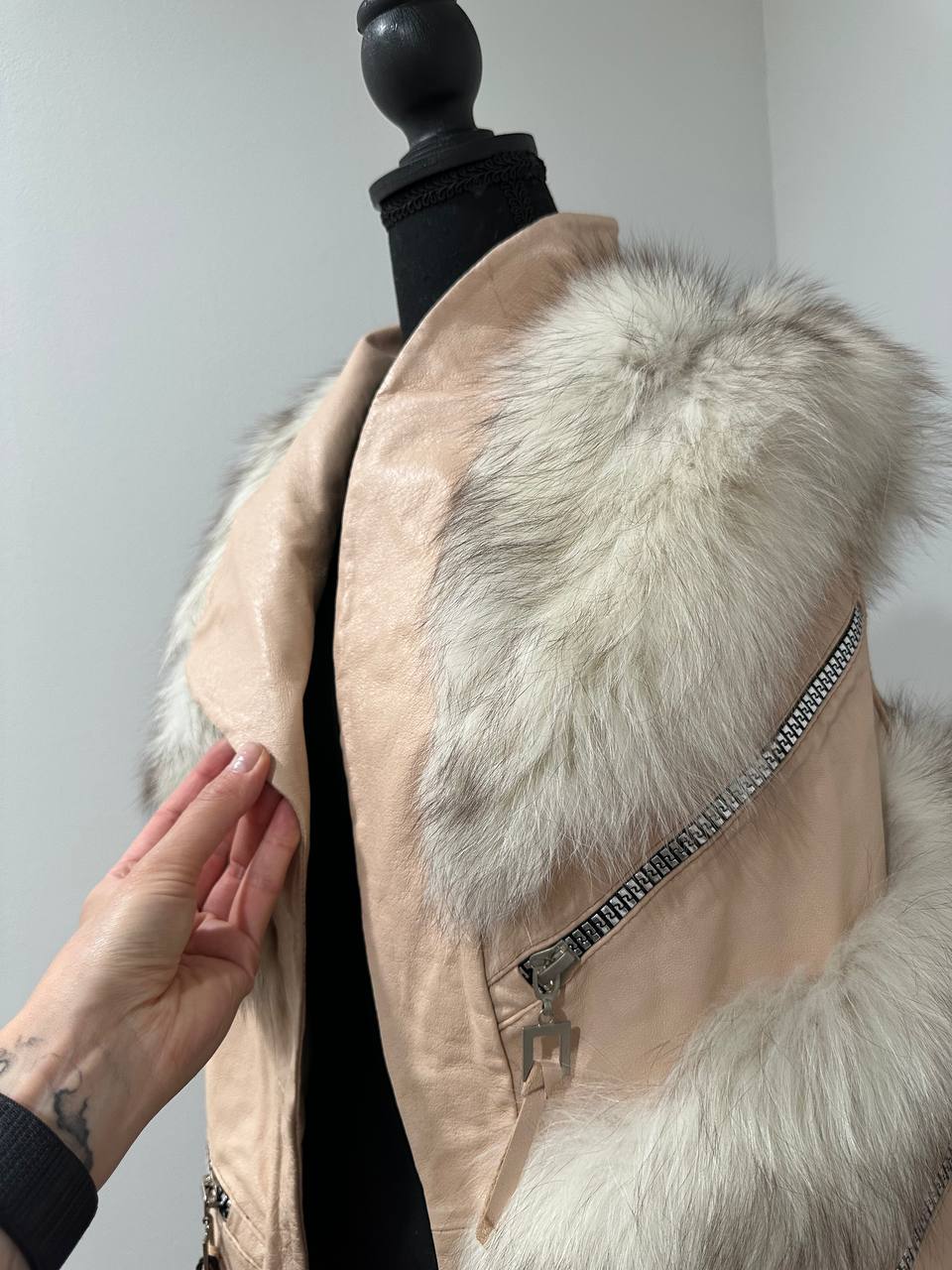 Women's vest made of natural fox fur and genuine leather cream color Size S. Exclusive vest in which you will be irresistible and unique. Fur - fluffy, thick, warm, natural color. Skin - natural cream color. The vest is decorated with snakes. There are 2 pockets. The model is straight. The collar is wide, asymmetrical. There are no fasteners. Viscose lining, hand-sewn. Ukrainian manufacturer.