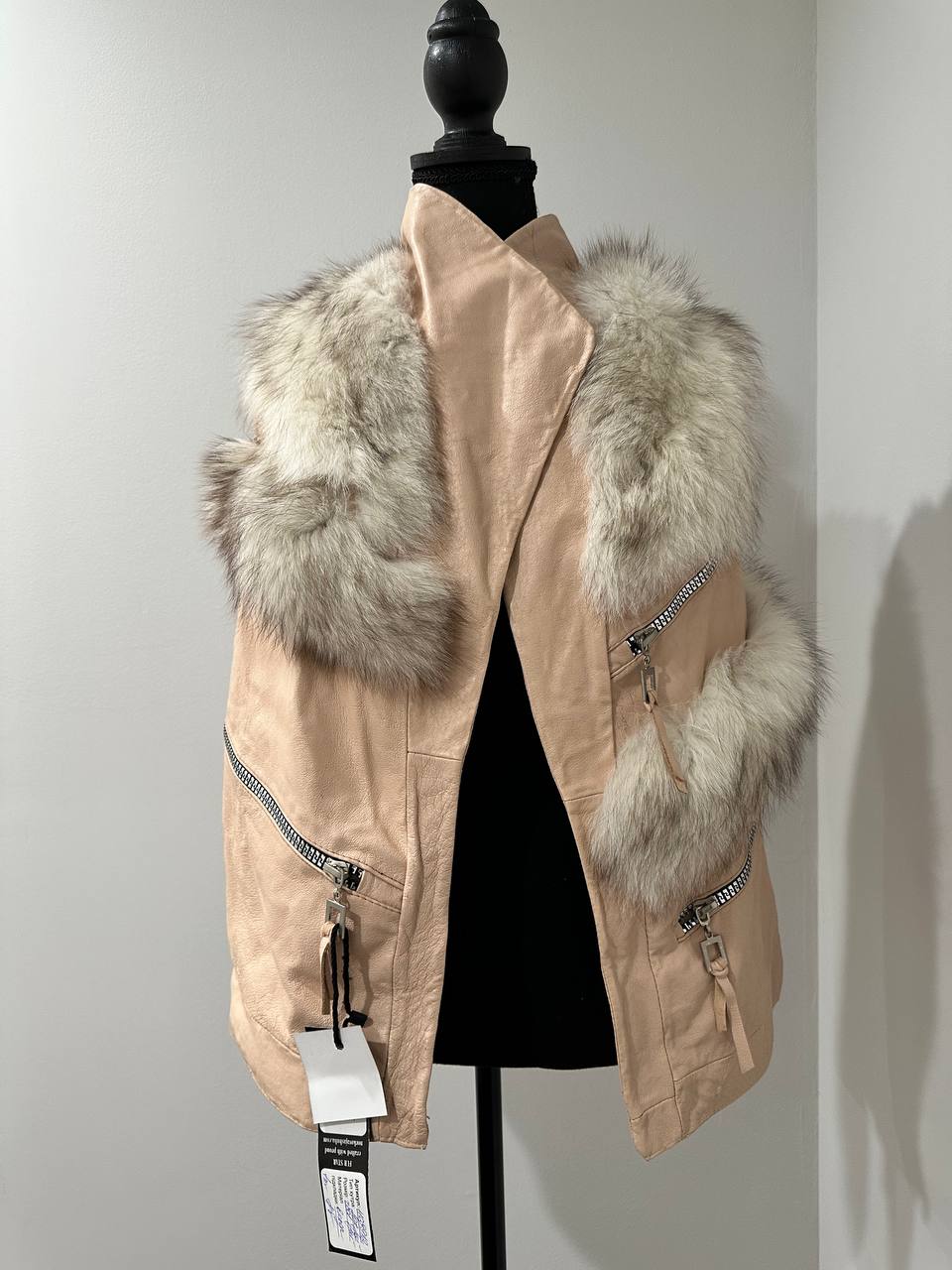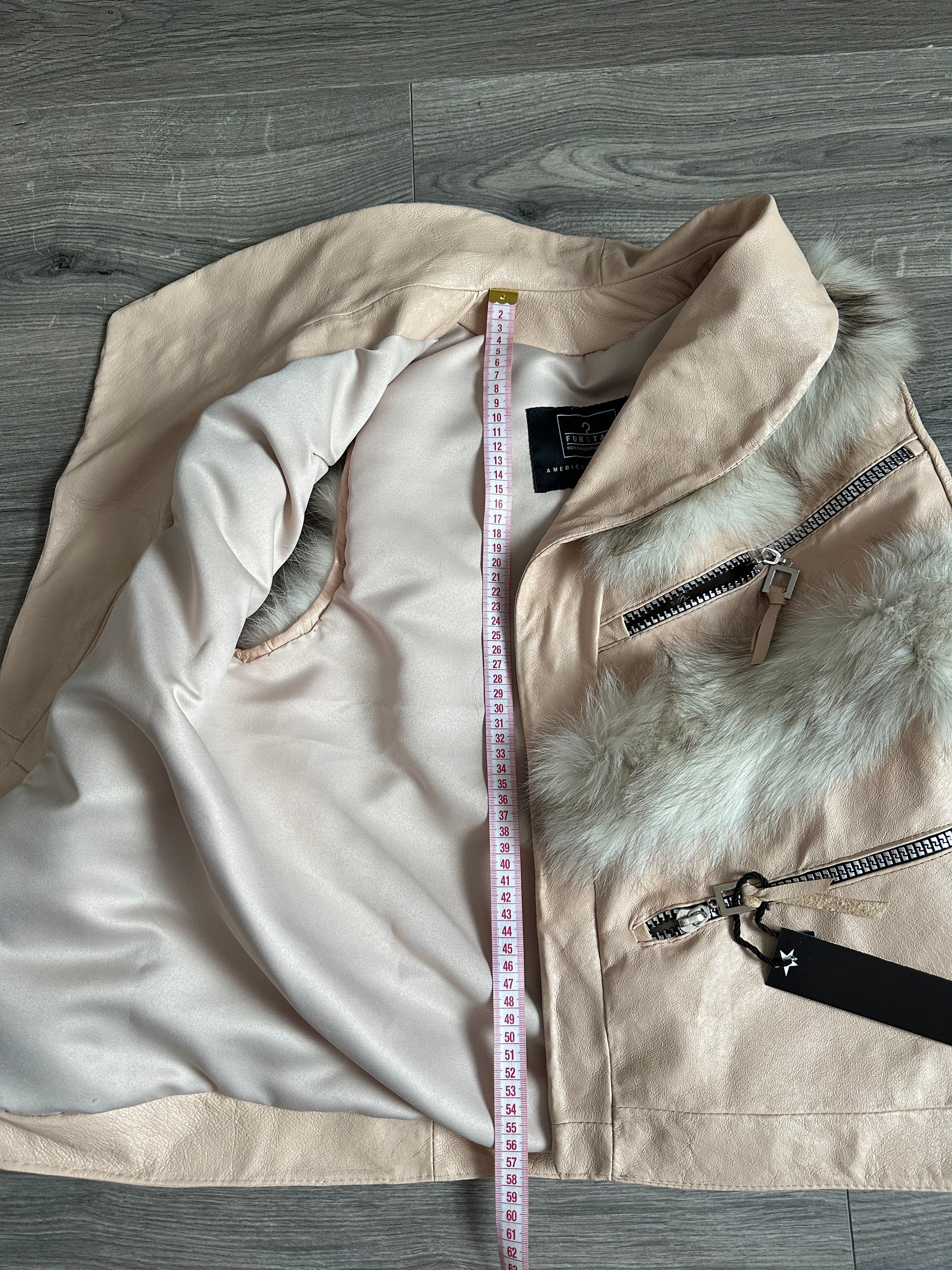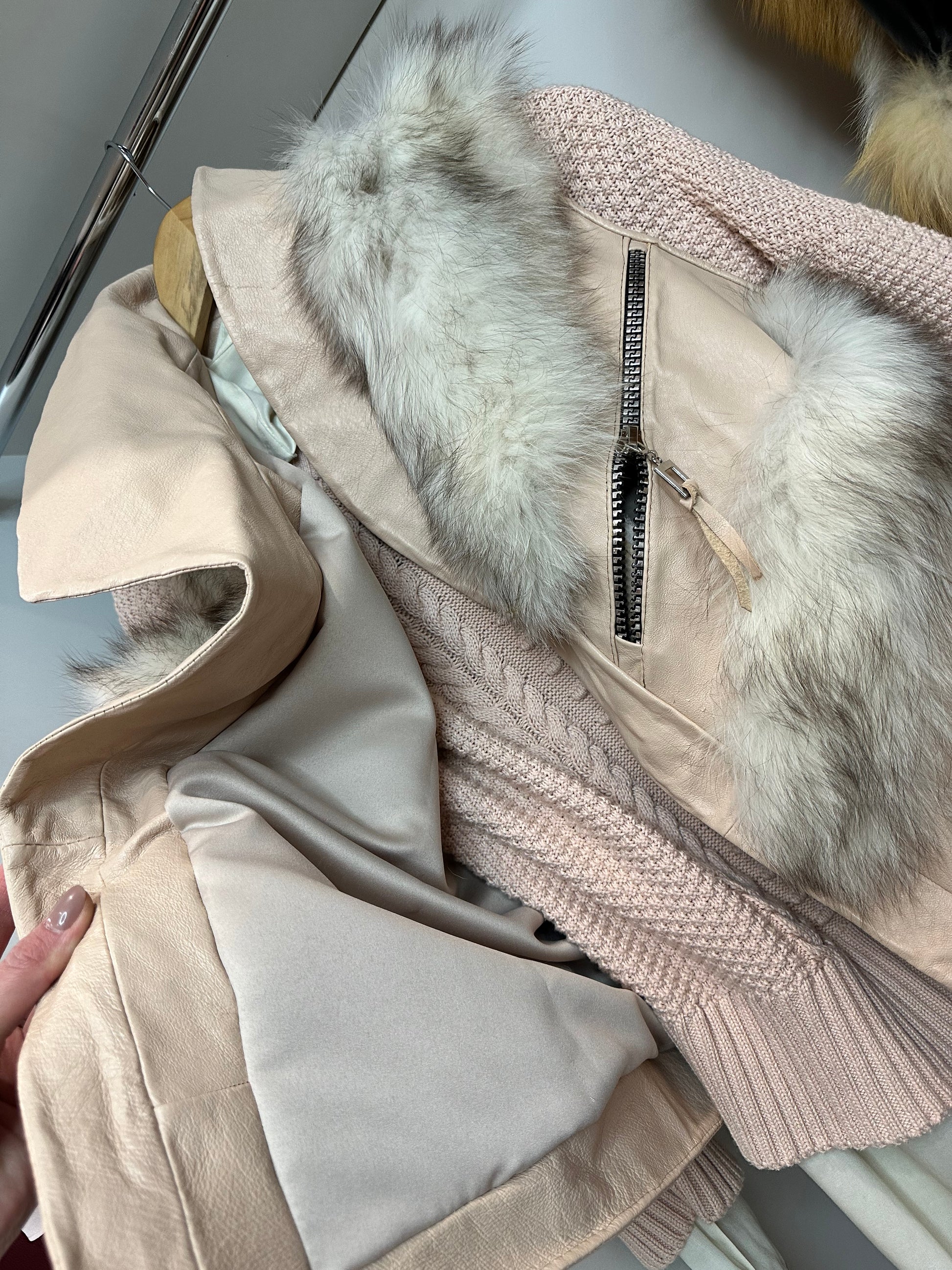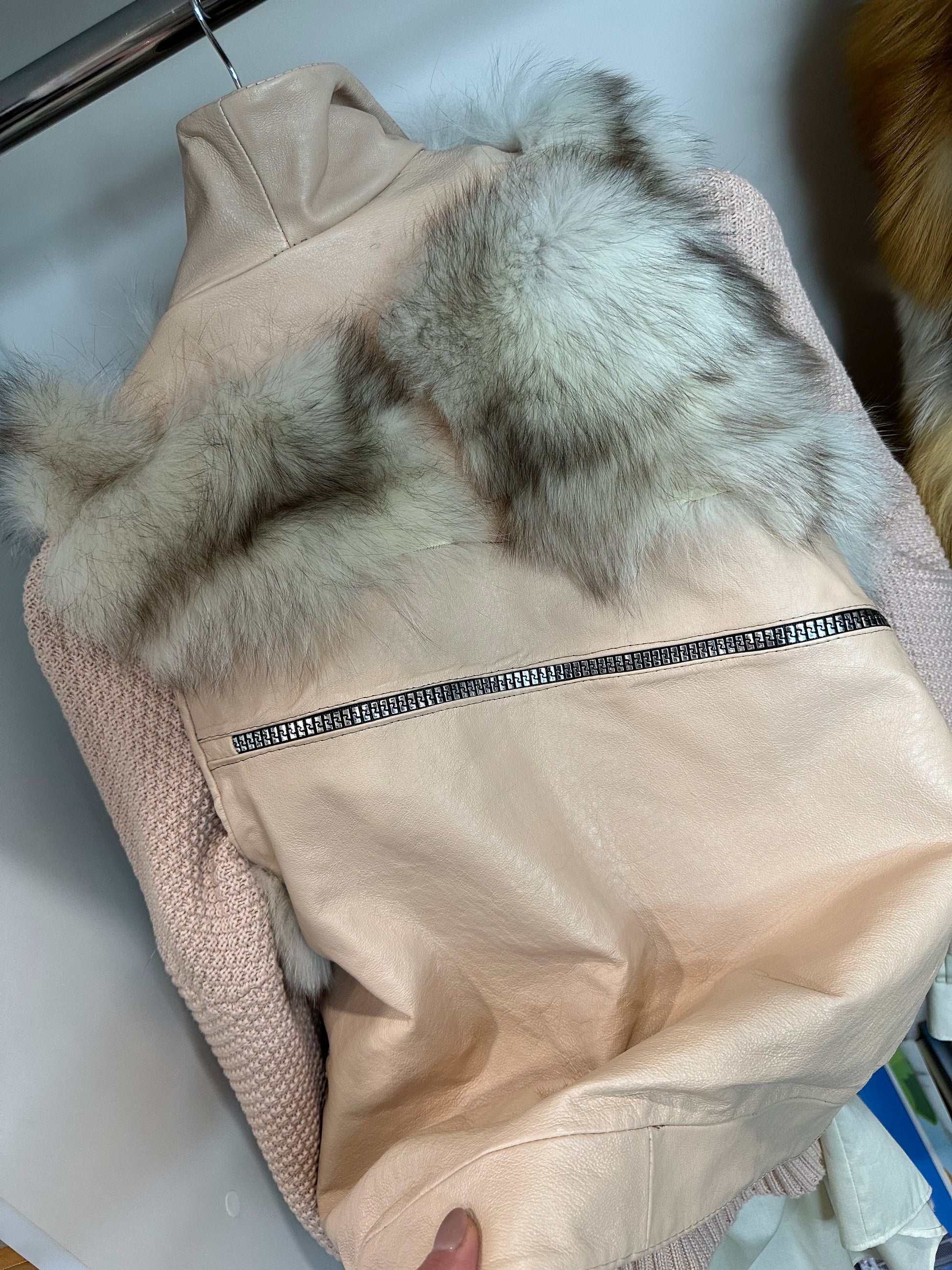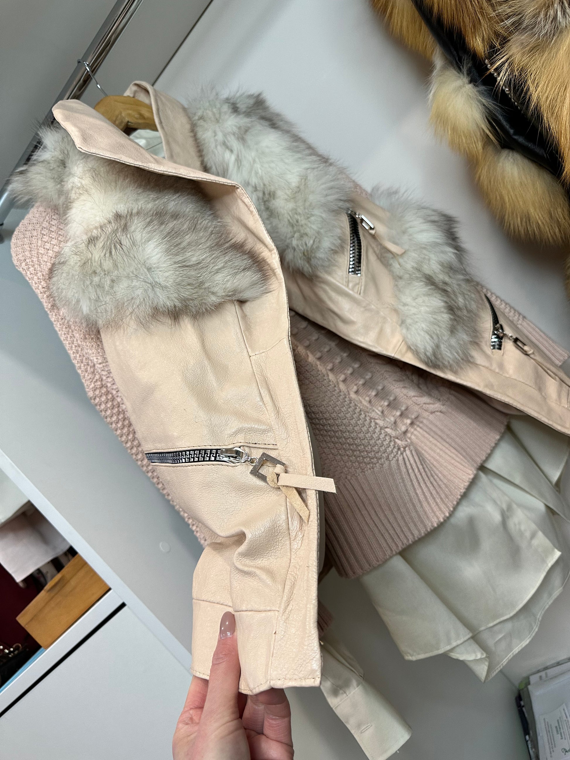Women's vest made of natural fox fur and genuine leather cream color Size S. Exclusive vest in which you will be irresistible and unique. Fur - fluffy, thick, warm, natural color. Skin - natural cream color. The vest is decorated with snakes. There are 2 pockets. The model is straight. The collar is wide, asymmetrical. There are no fasteners. Viscose lining, hand-sewn. Ukrainian manufacturer.