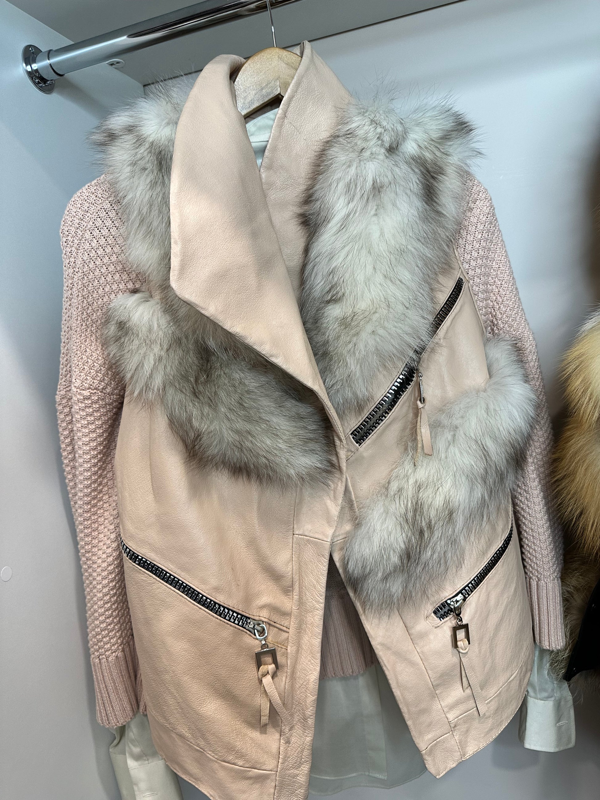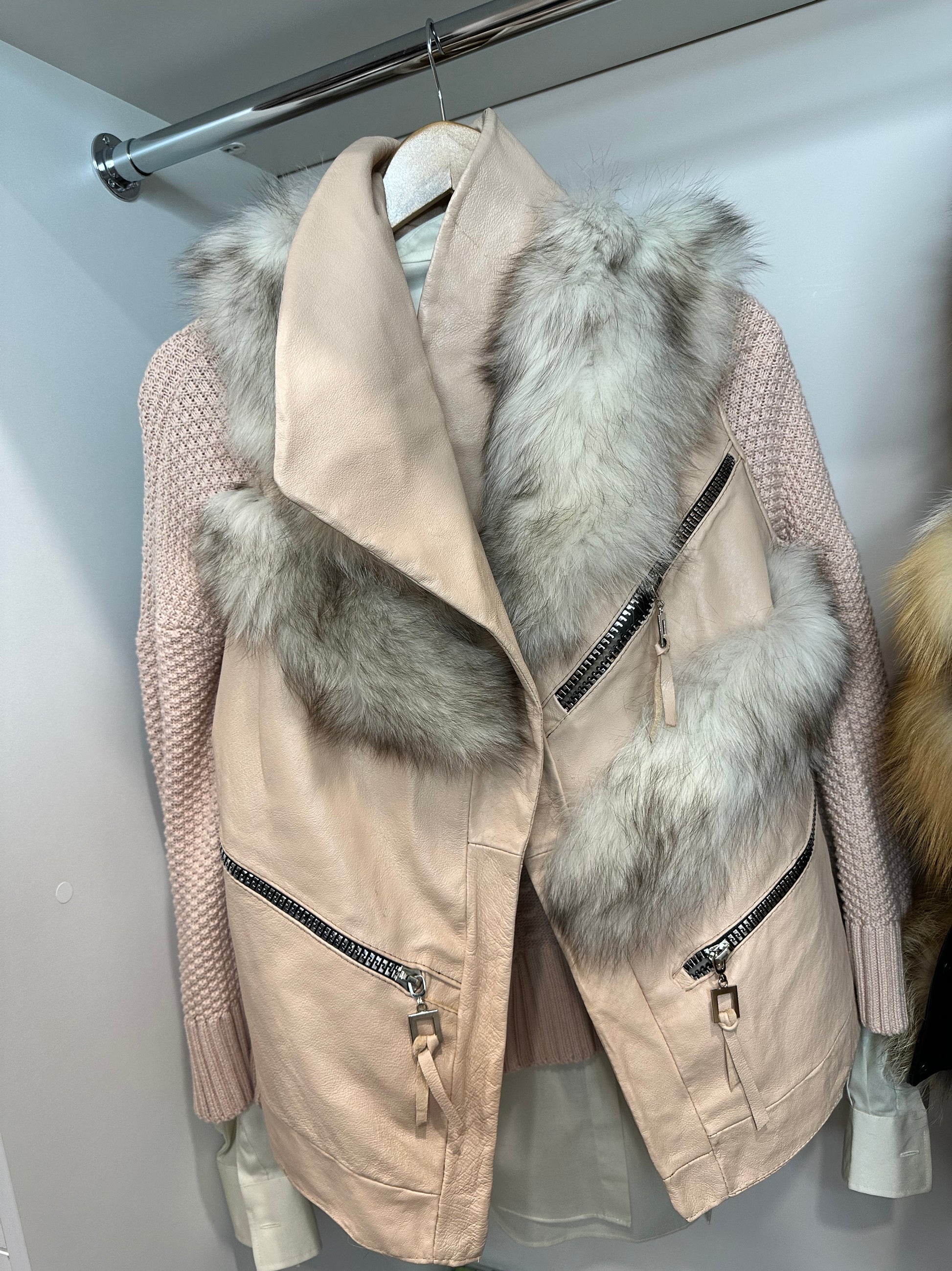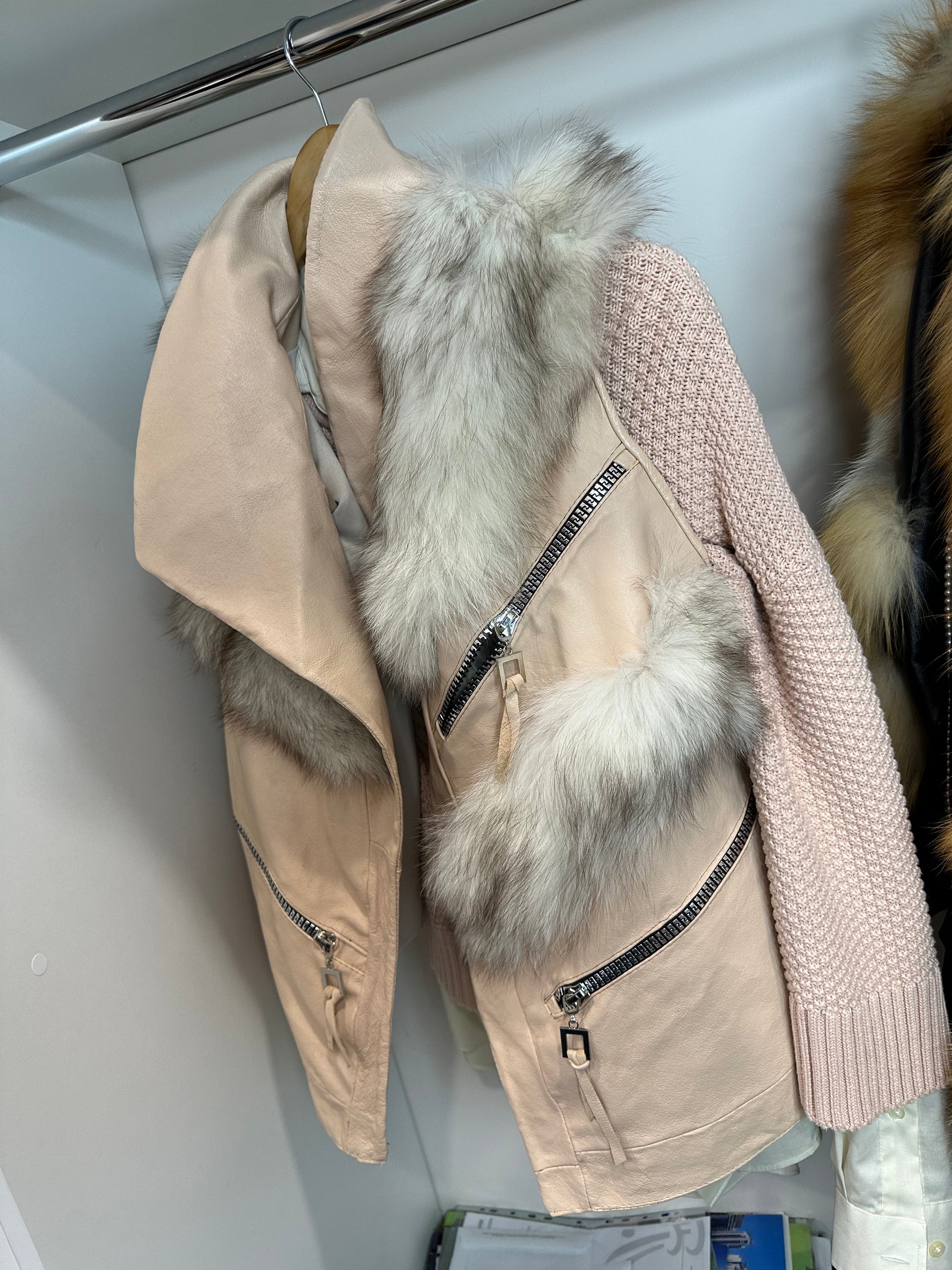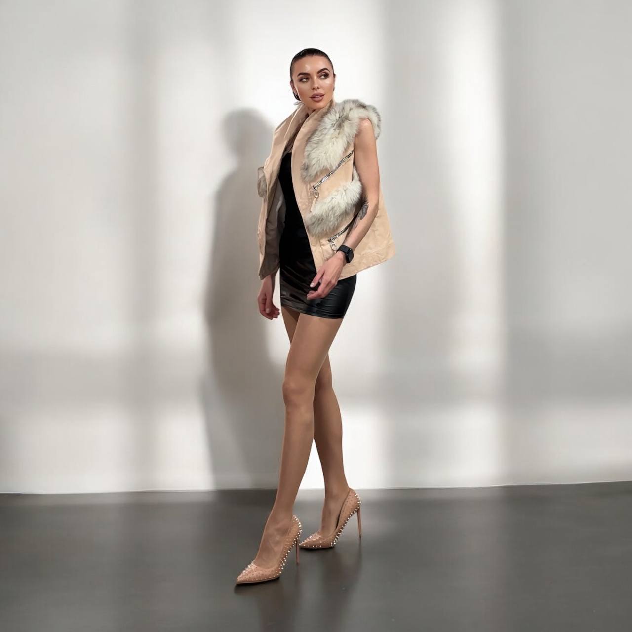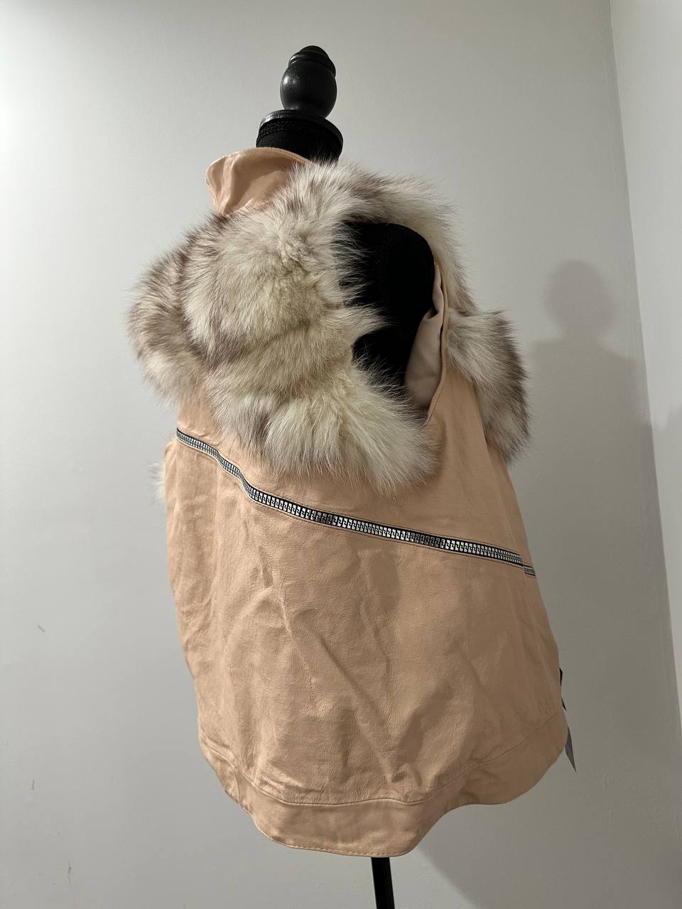 Women's vest made of natural fox fur and genuine leather cream color Size S. Exclusive vest in which you will be irresistible and unique. Fur - fluffy, thick, warm, natural color. Skin - natural cream color. The vest is decorated with snakes. There are 2 pockets. The model is straight. The collar is wide, asymmetrical. There are no fasteners. Viscose lining, hand-sewn. Ukrainian manufacturer.
