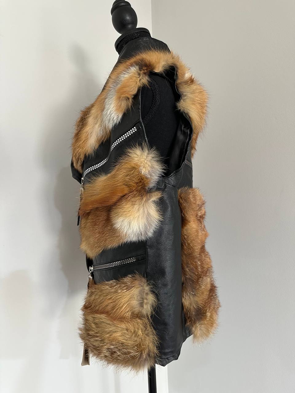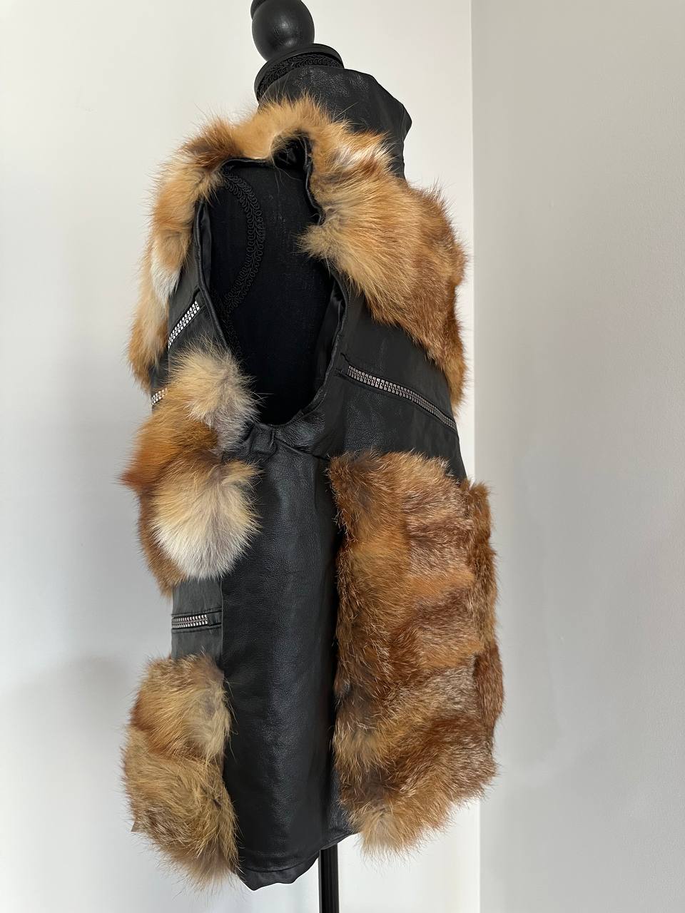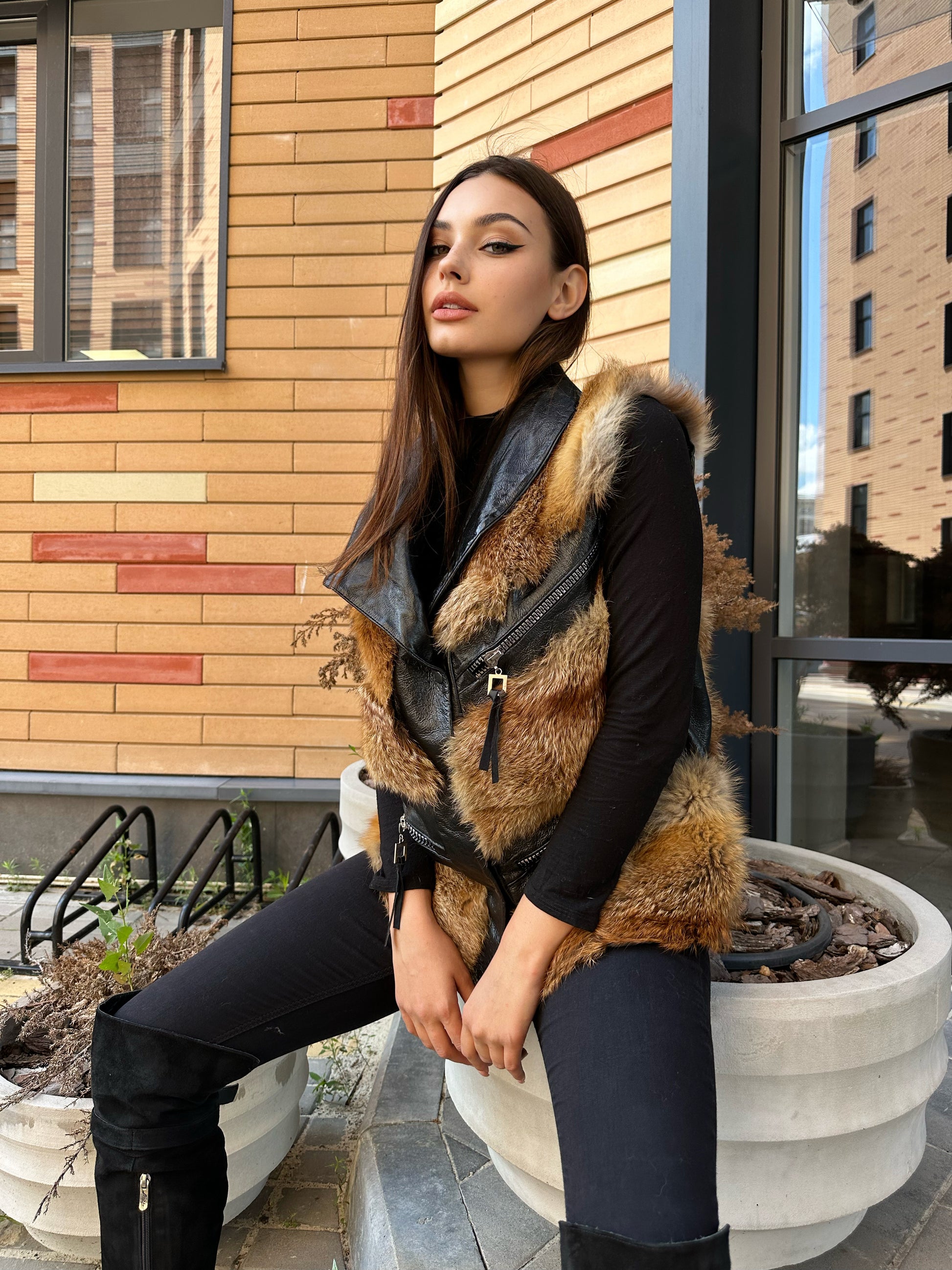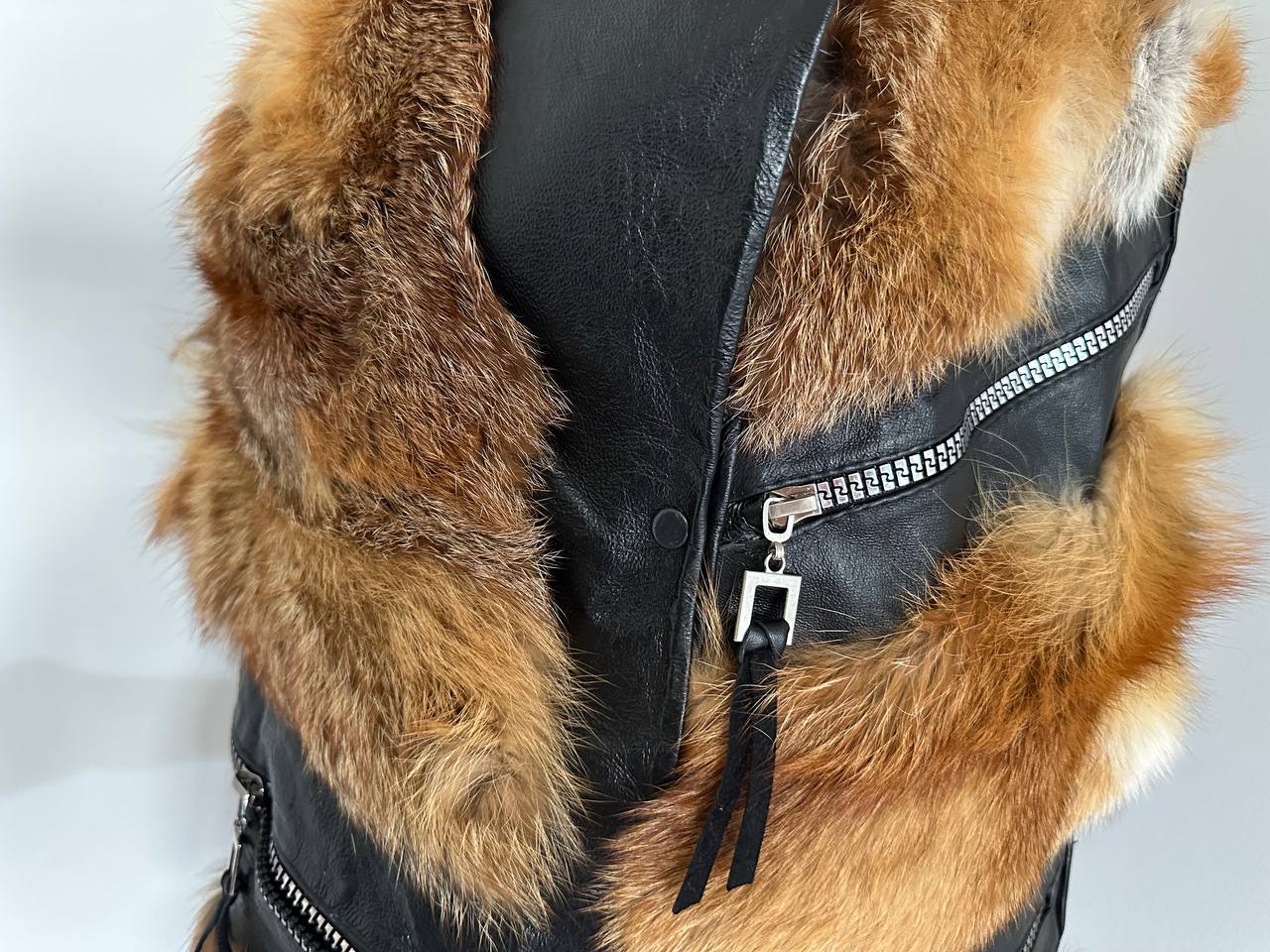 Women's vest made of natural fluffy fox fur and genuine leather Size S. Exclusive vest in which you will be irresistible and unique. Fur - fluffy, thick, warm, natural color. Leather - natural black. The vest is decorated with snakes. The model is straight. The collar is wide, asymmetrical. 2 Pockets - bottom zipper. Fastens with buttons. Viscose lining, hand-sewn. Ukrainian manufacturer.