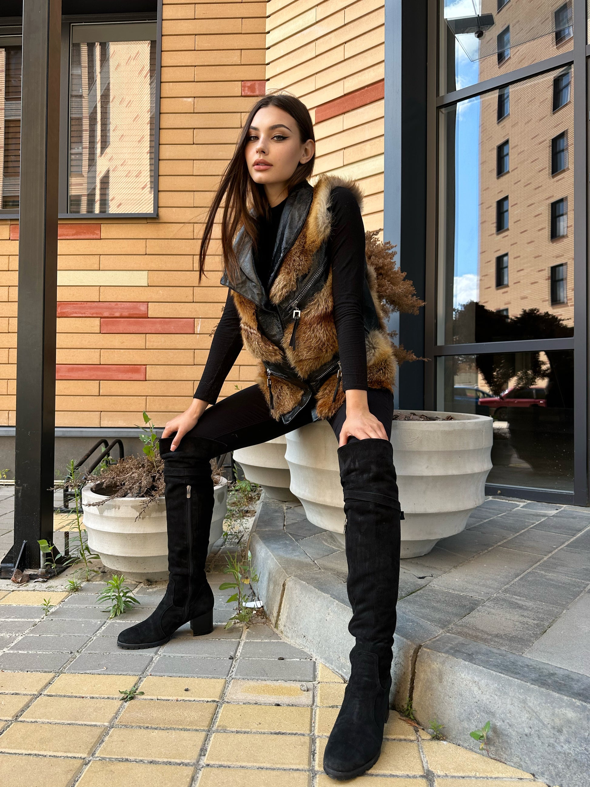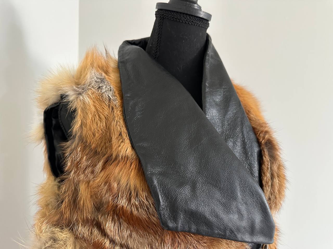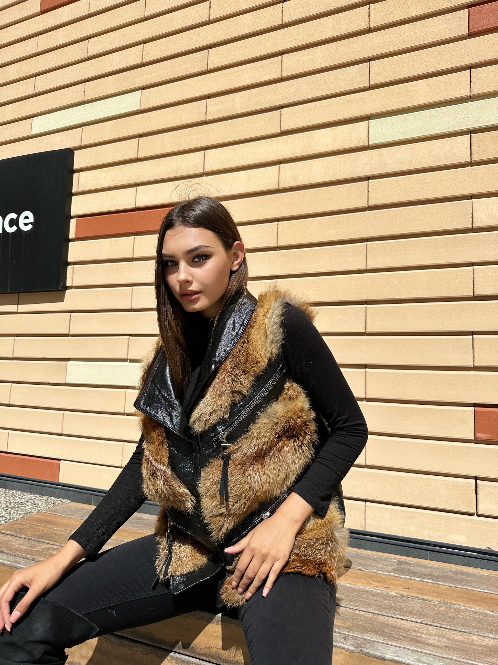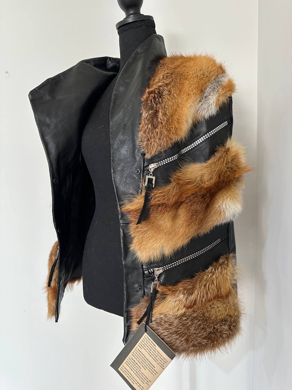 Women's vest made of natural fluffy fox fur and genuine leather Size S. Exclusive vest in which you will be irresistible and unique. Fur - fluffy, thick, warm, natural color. Leather - natural black. The vest is decorated with snakes. The model is straight. The collar is wide, asymmetrical. 2 Pockets - bottom zipper. Fastens with buttons. Viscose lining, hand-sewn. Ukrainian manufacturer.