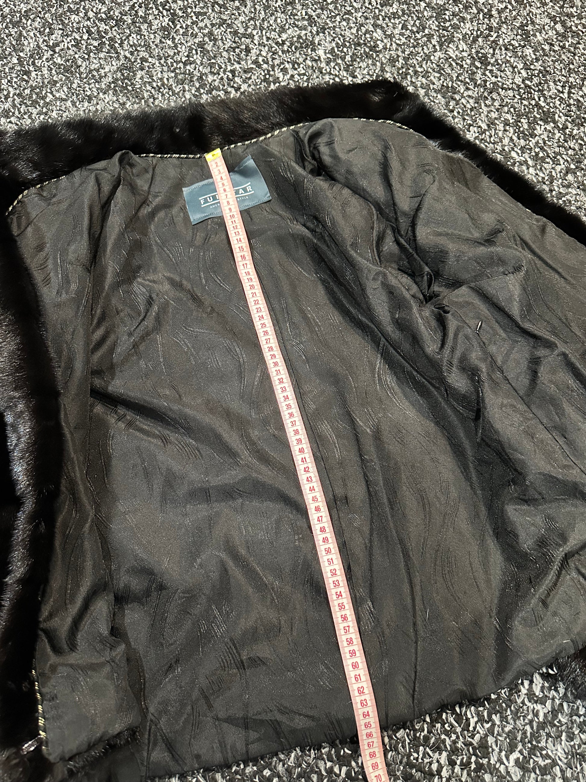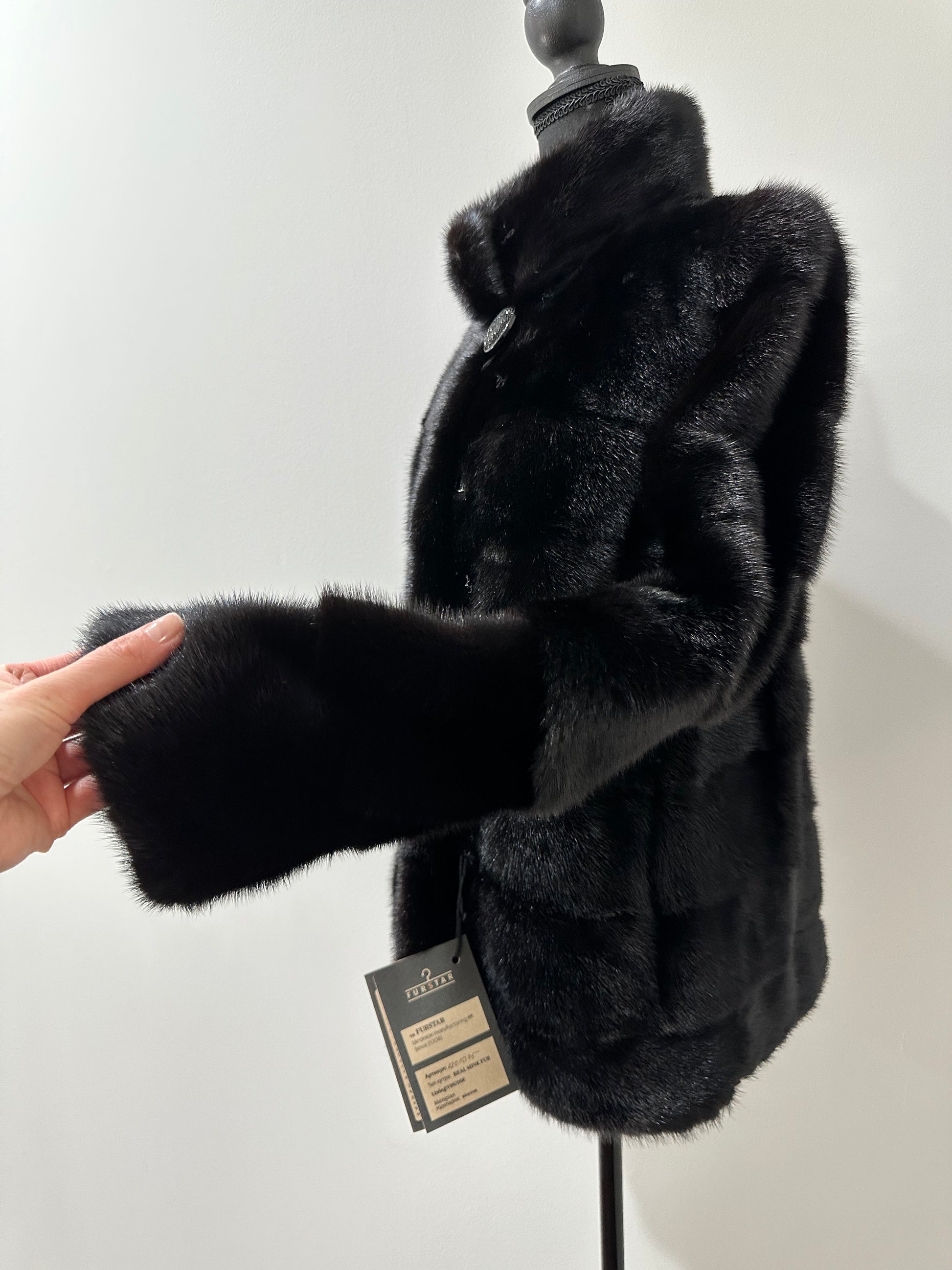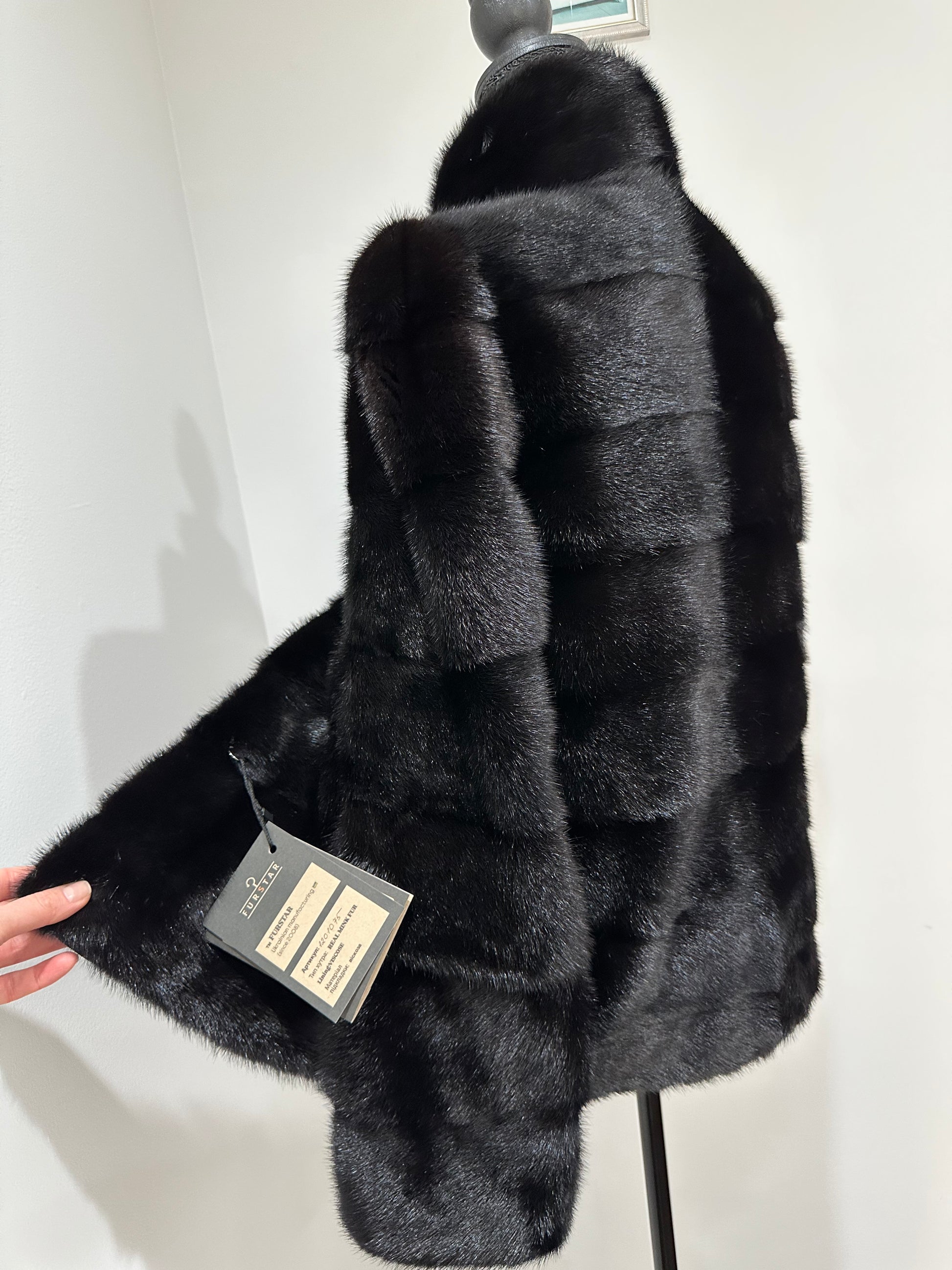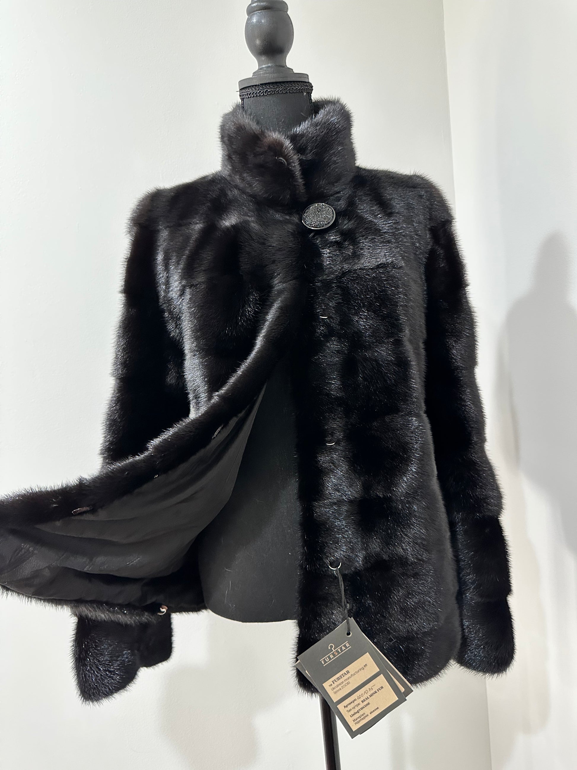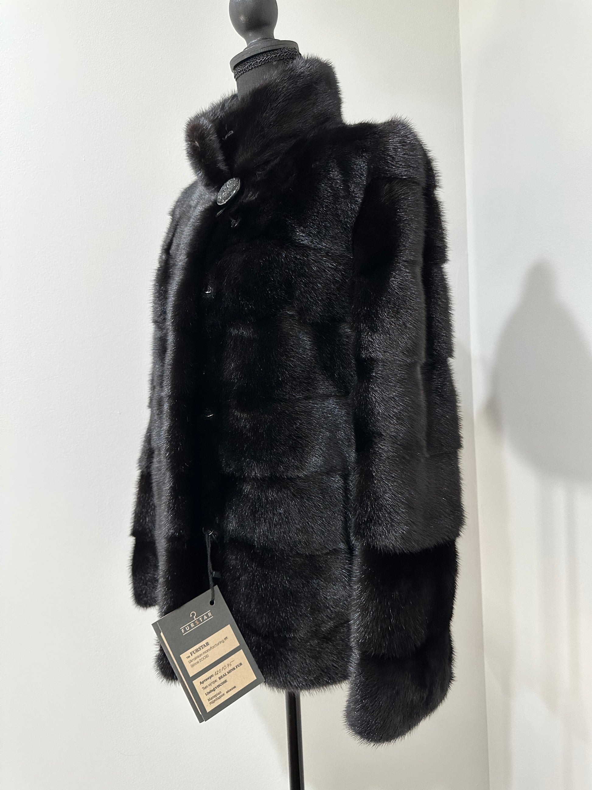 Branded mink coat trade mark FURSTAR, short fur black coat size S mink natural color rich dark black color. Stand up collar with button - see photoes. Close with hooks. Drawstring on the buttom. Fur - soft, fluffy, shiny, natural color. There are 2 pockets. Ukrainian manufacturer. Viscose lining, hand-sewn. Great coat for everyday life.