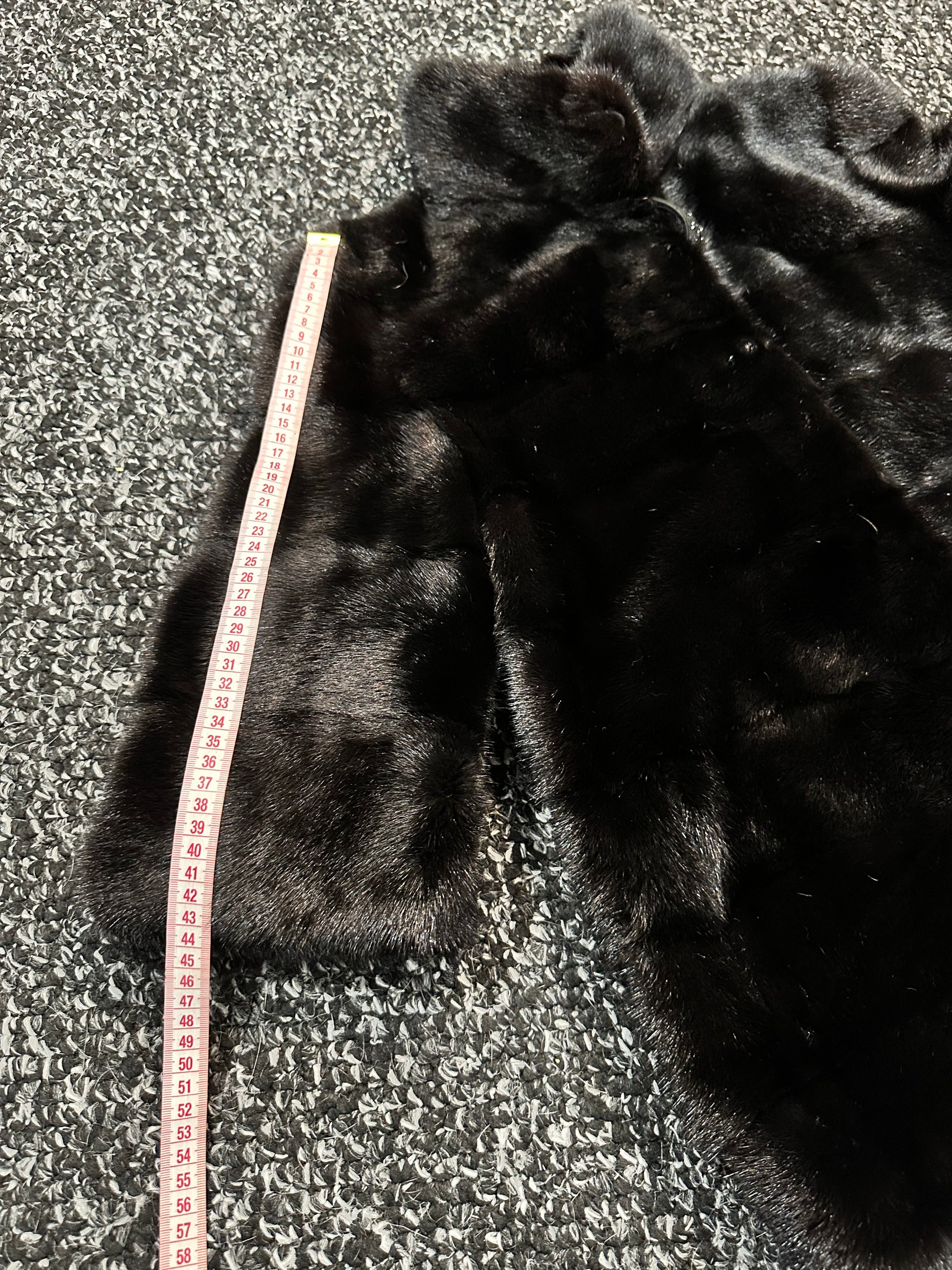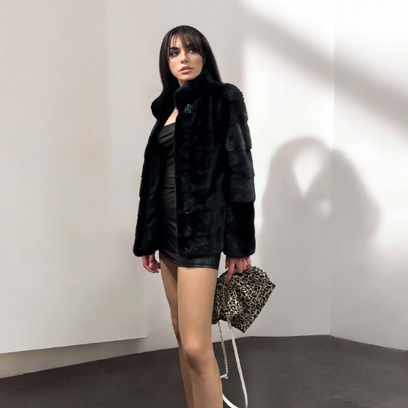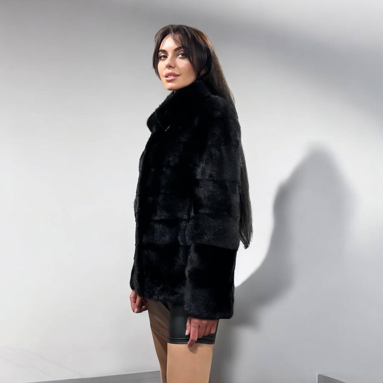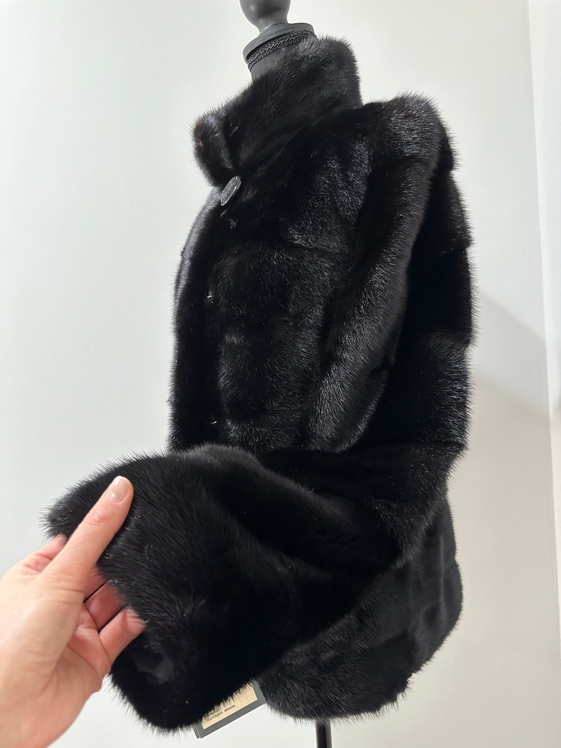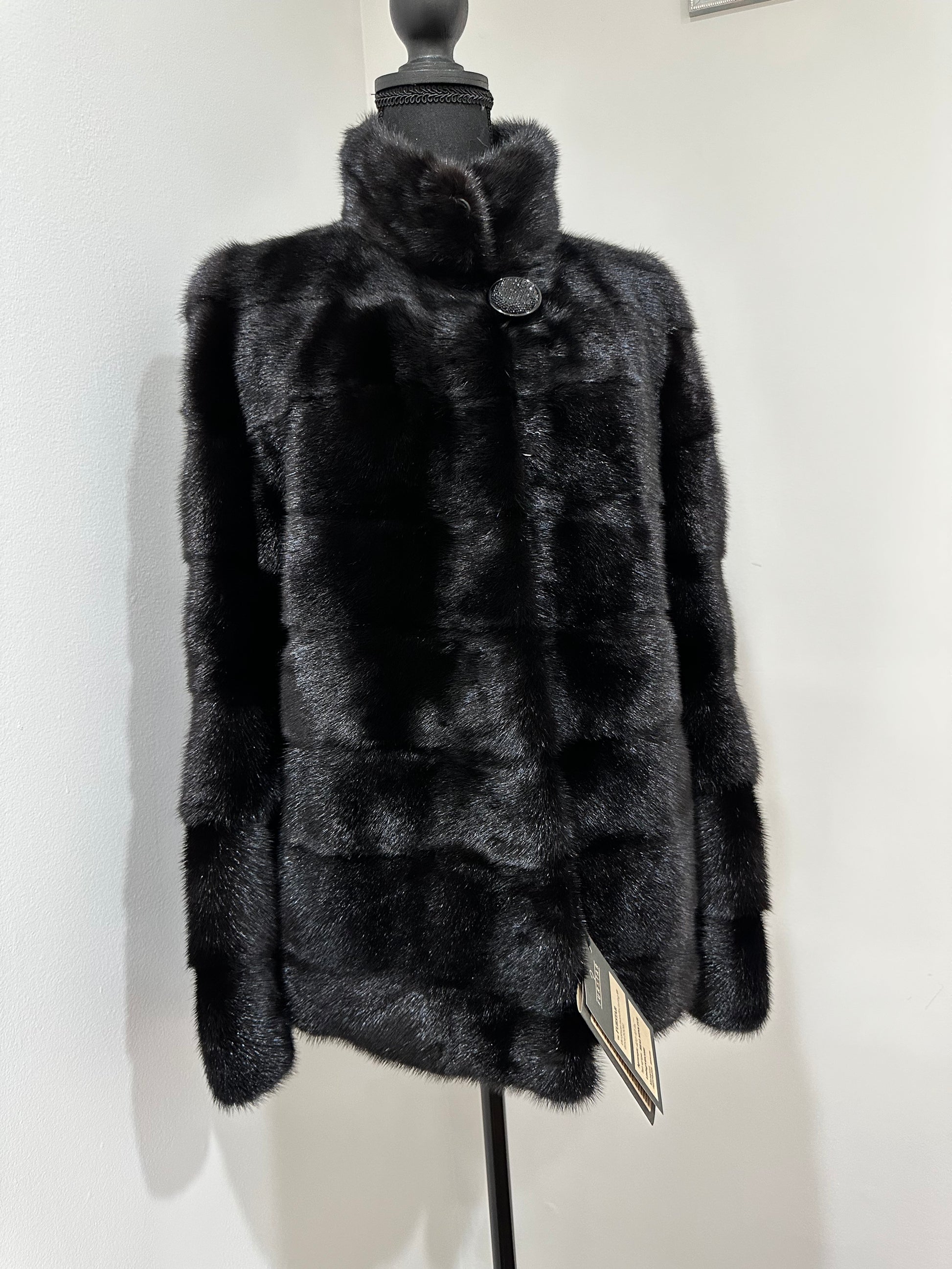 Branded mink coat trade mark FURSTAR, short fur black coat size S mink natural color rich dark black color. Stand up collar with button - see photoes. Close with hooks. Drawstring on the buttom. Fur - soft, fluffy, shiny, natural color. There are 2 pockets. Ukrainian manufacturer. Viscose lining, hand-sewn. Great coat for everyday life.