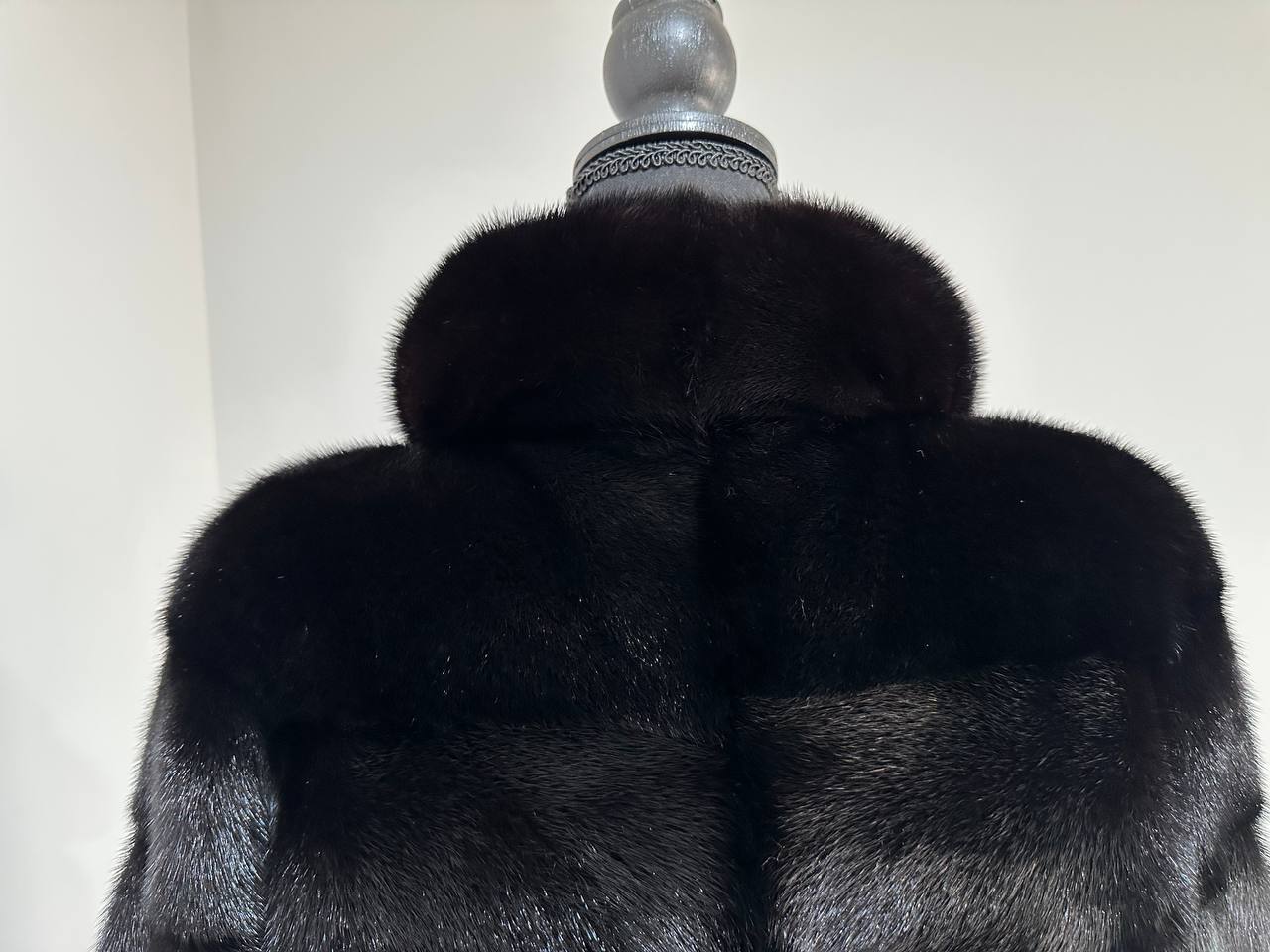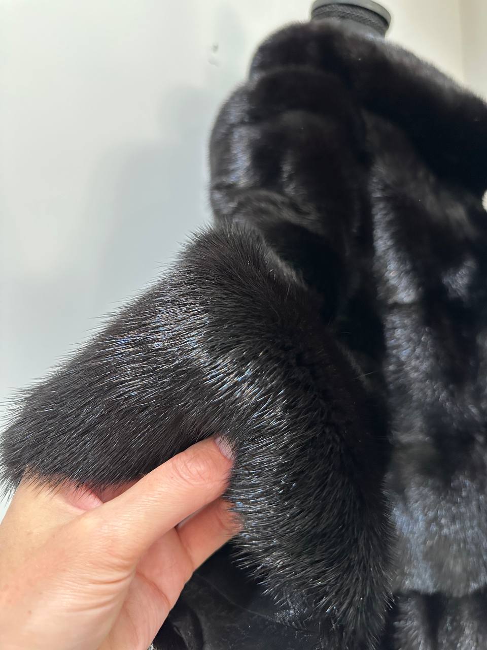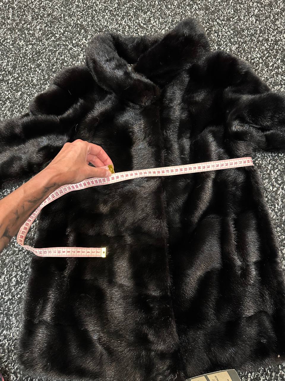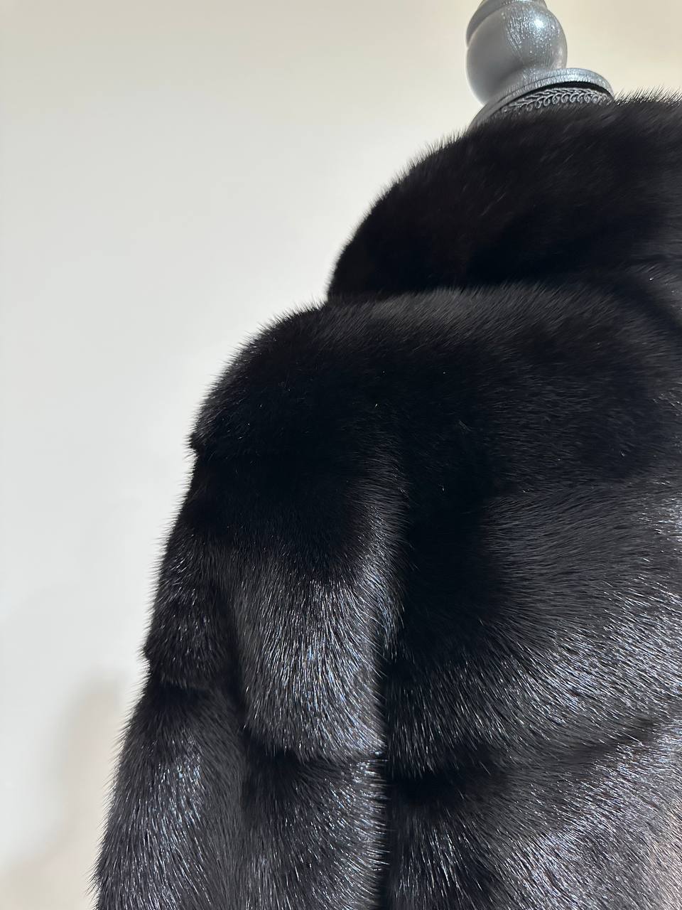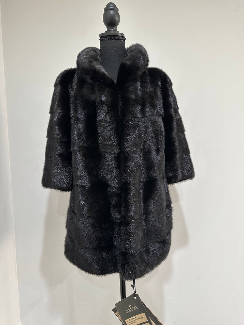 Branded mink coat trade mark FURSTAR, short fur black coat size S mink natural color rich dark black color. Stand up collar. Fur - soft, fluffy, shiny, natural color. There are 2 pockets. Ukrainian manufacturer. Viscose lining, hand-sewn. Great coat for everyday life.