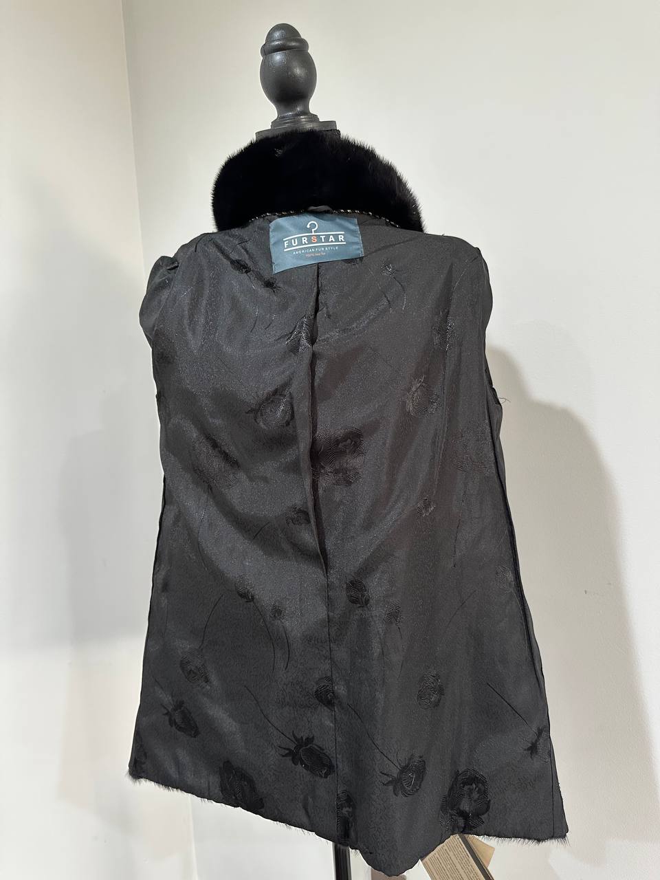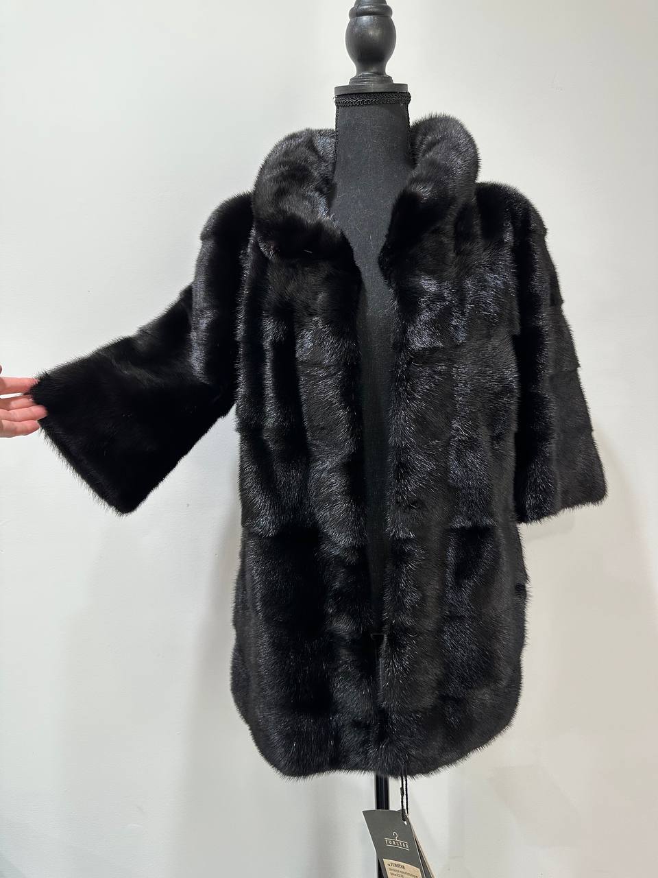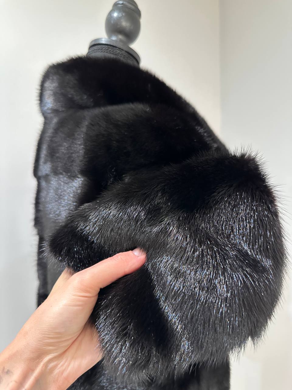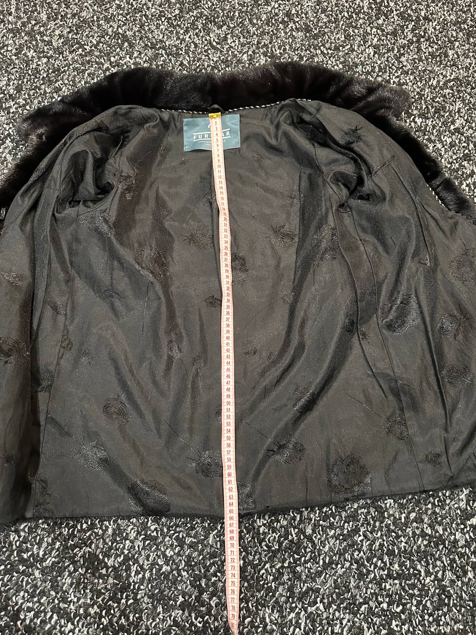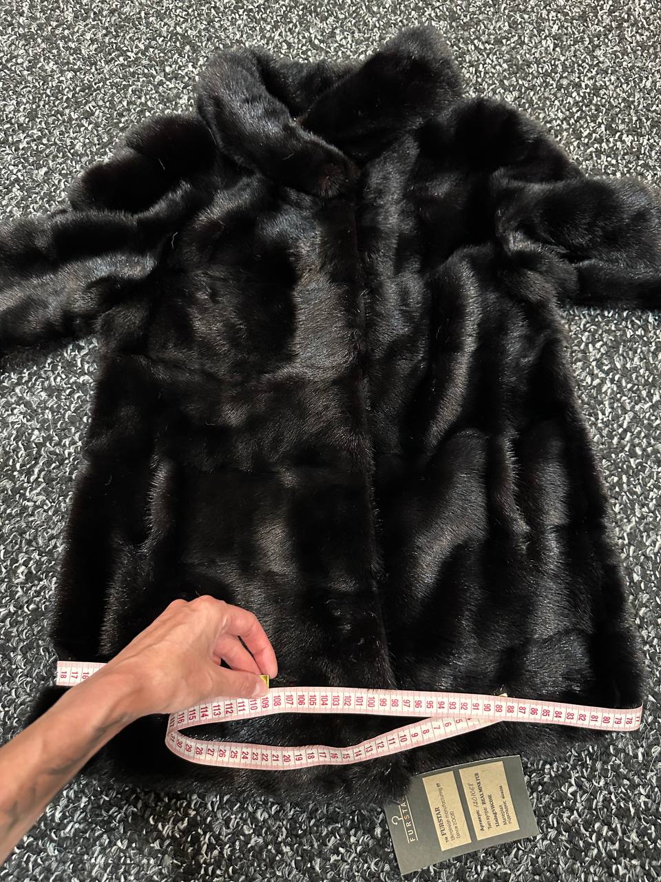 Branded mink coat trade mark FURSTAR, short fur black coat size S mink natural color rich dark black color. Stand up collar. Fur - soft, fluffy, shiny, natural color. There are 2 pockets. Ukrainian manufacturer. Viscose lining, hand-sewn. Great coat for everyday life.