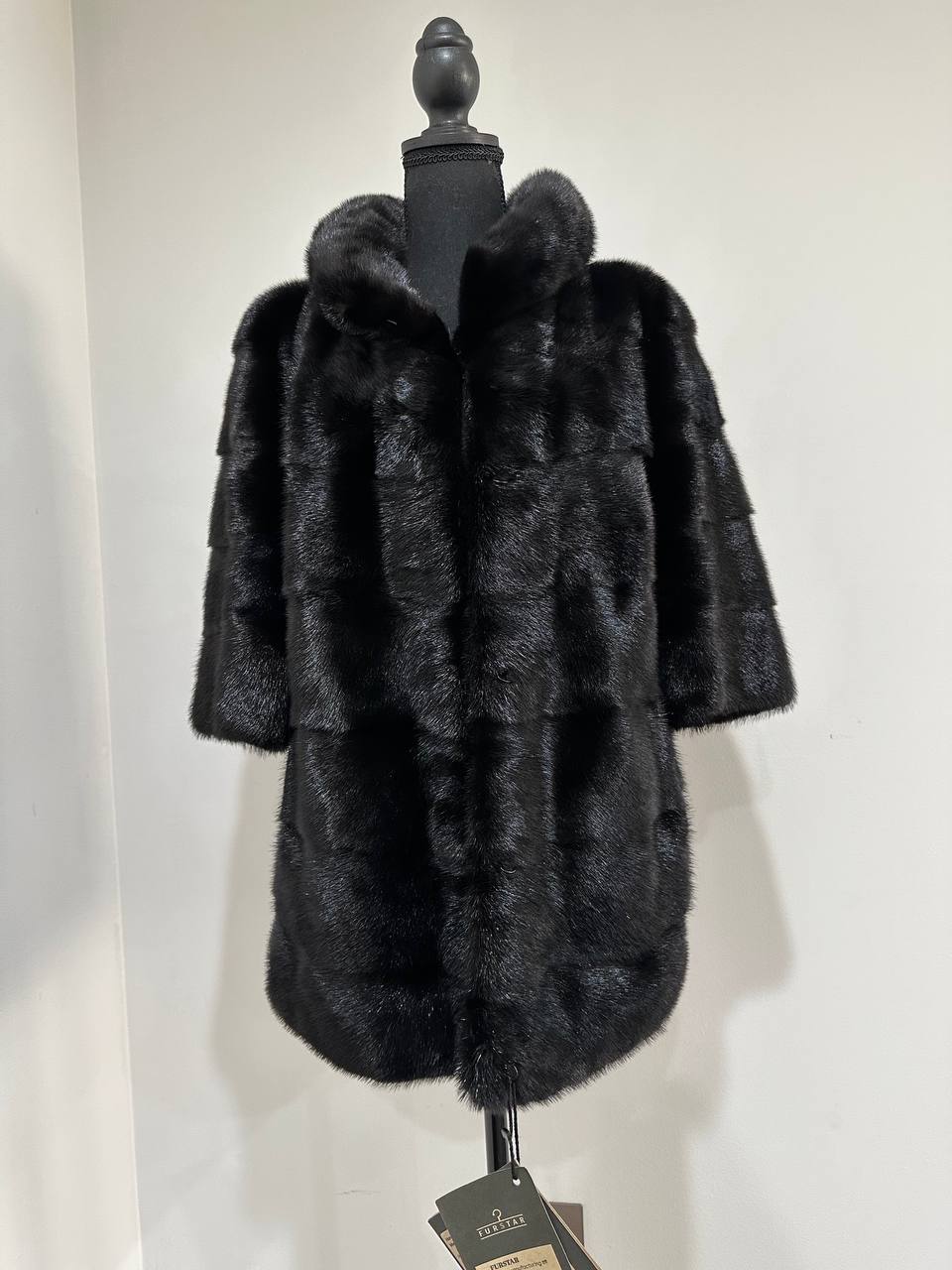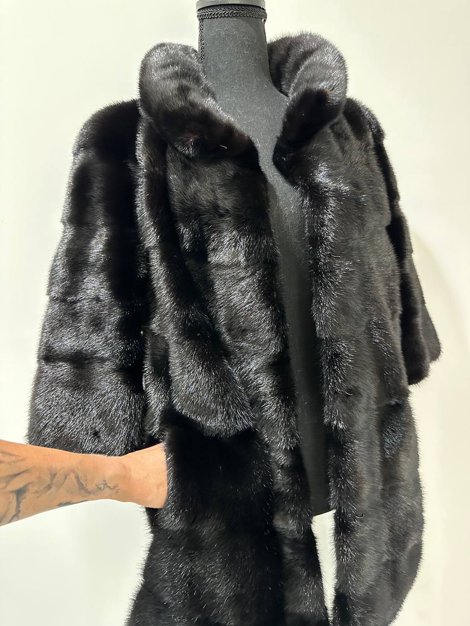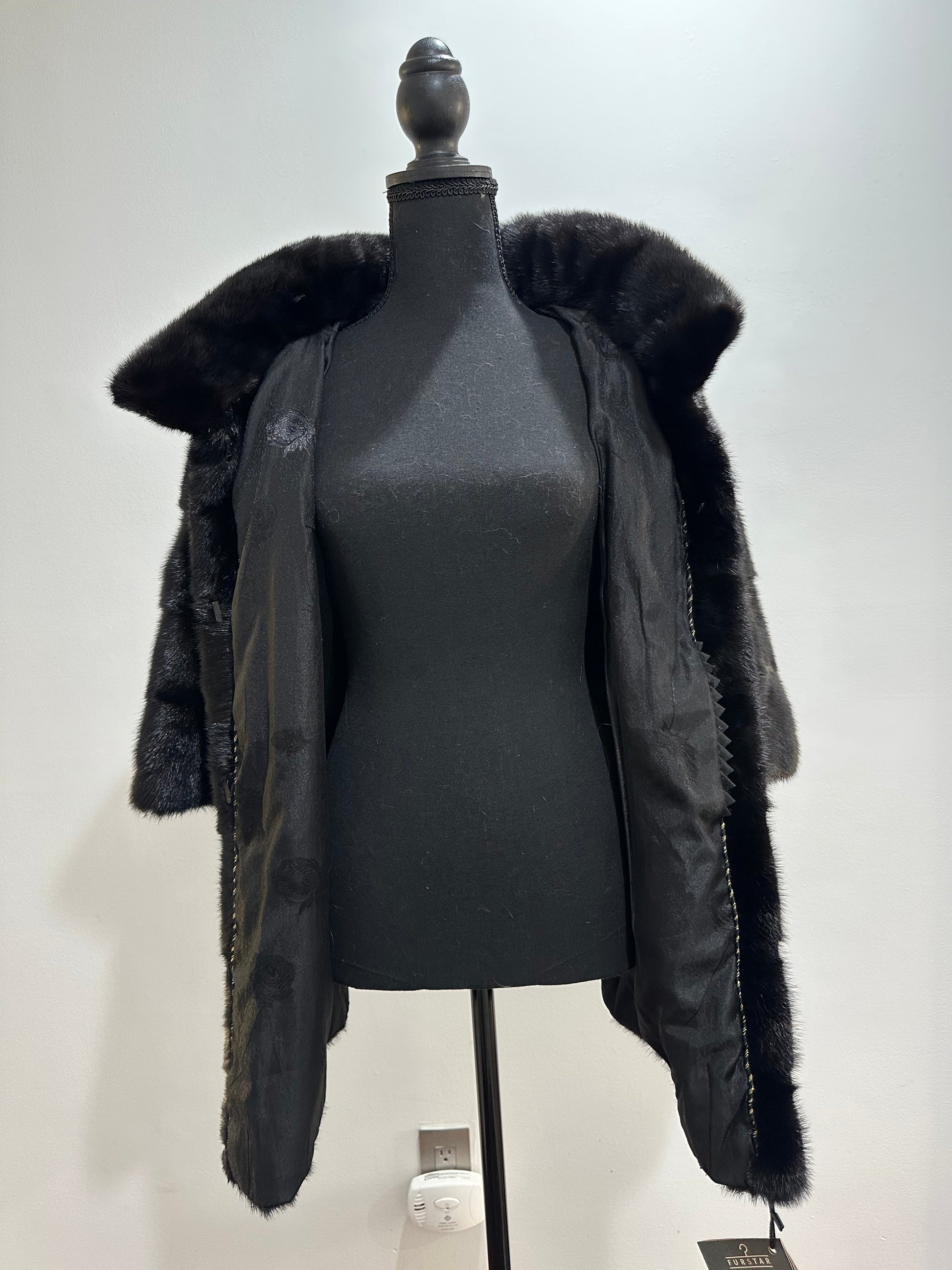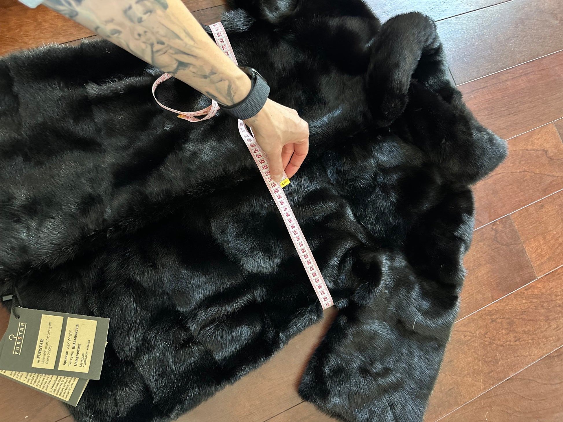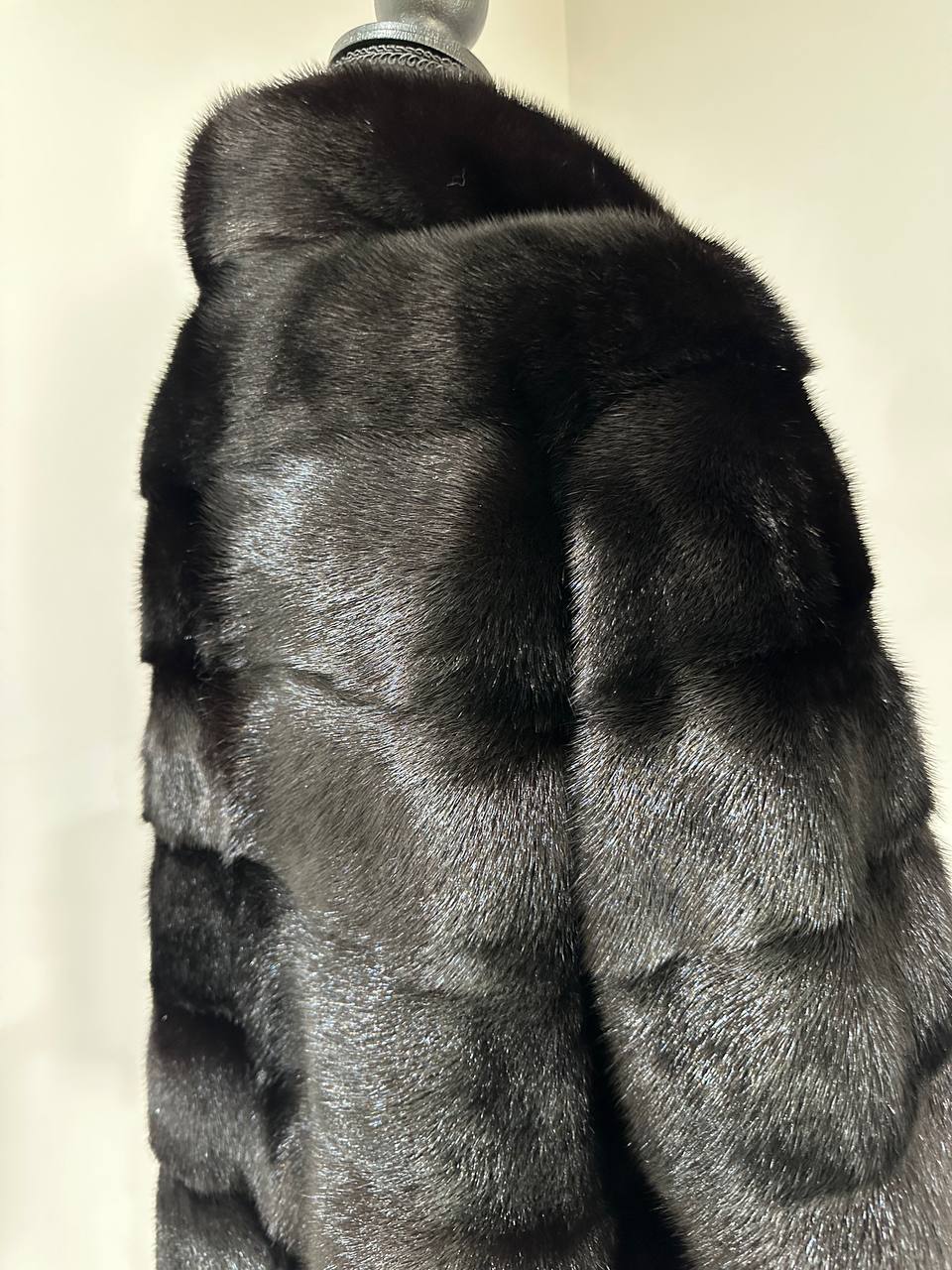 Branded mink coat trade mark FURSTAR, short fur black coat size S mink natural color rich dark black color. Stand up collar. Fur - soft, fluffy, shiny, natural color. There are 2 pockets. Ukrainian manufacturer. Viscose lining, hand-sewn. Great coat for everyday life.