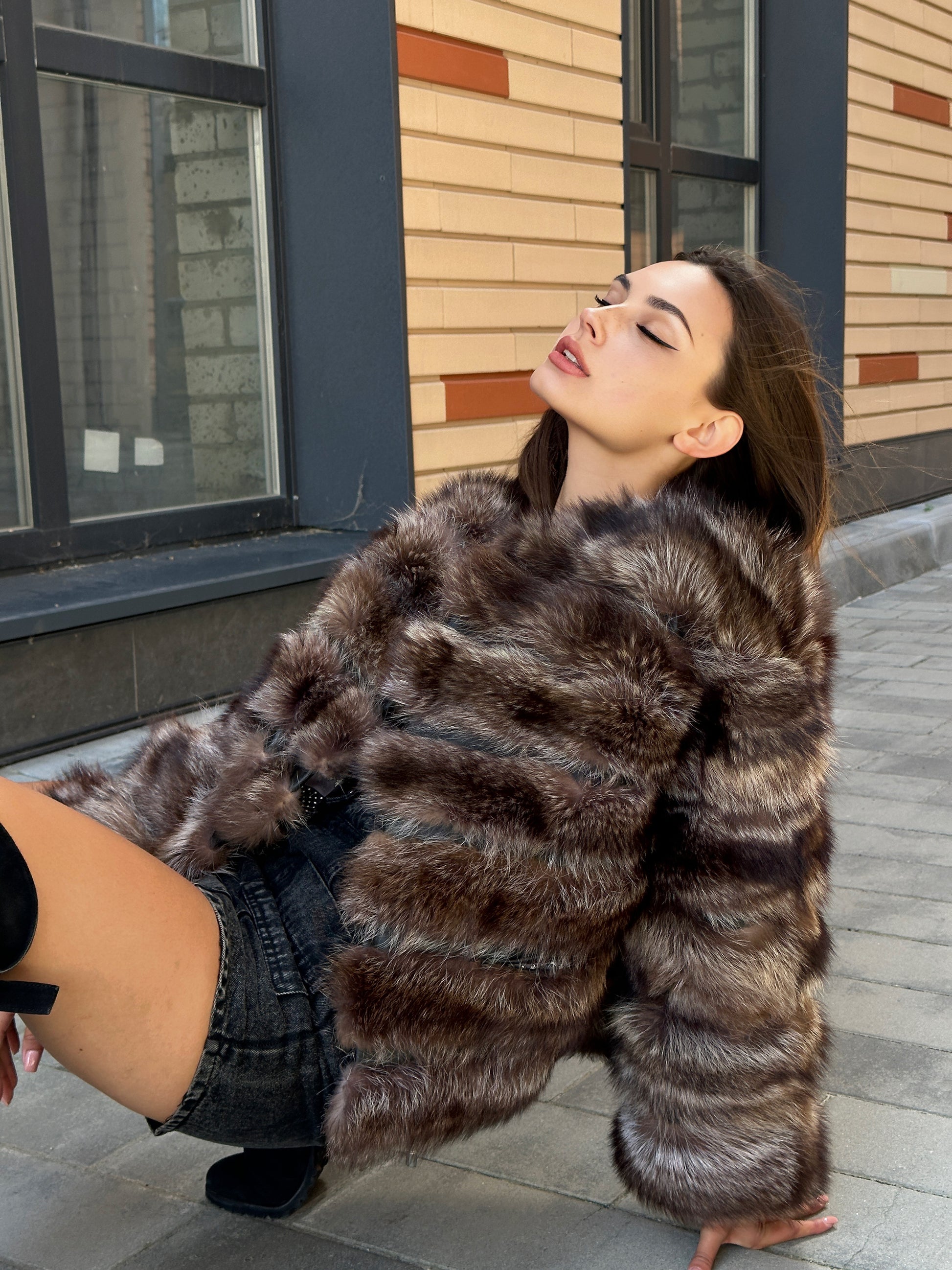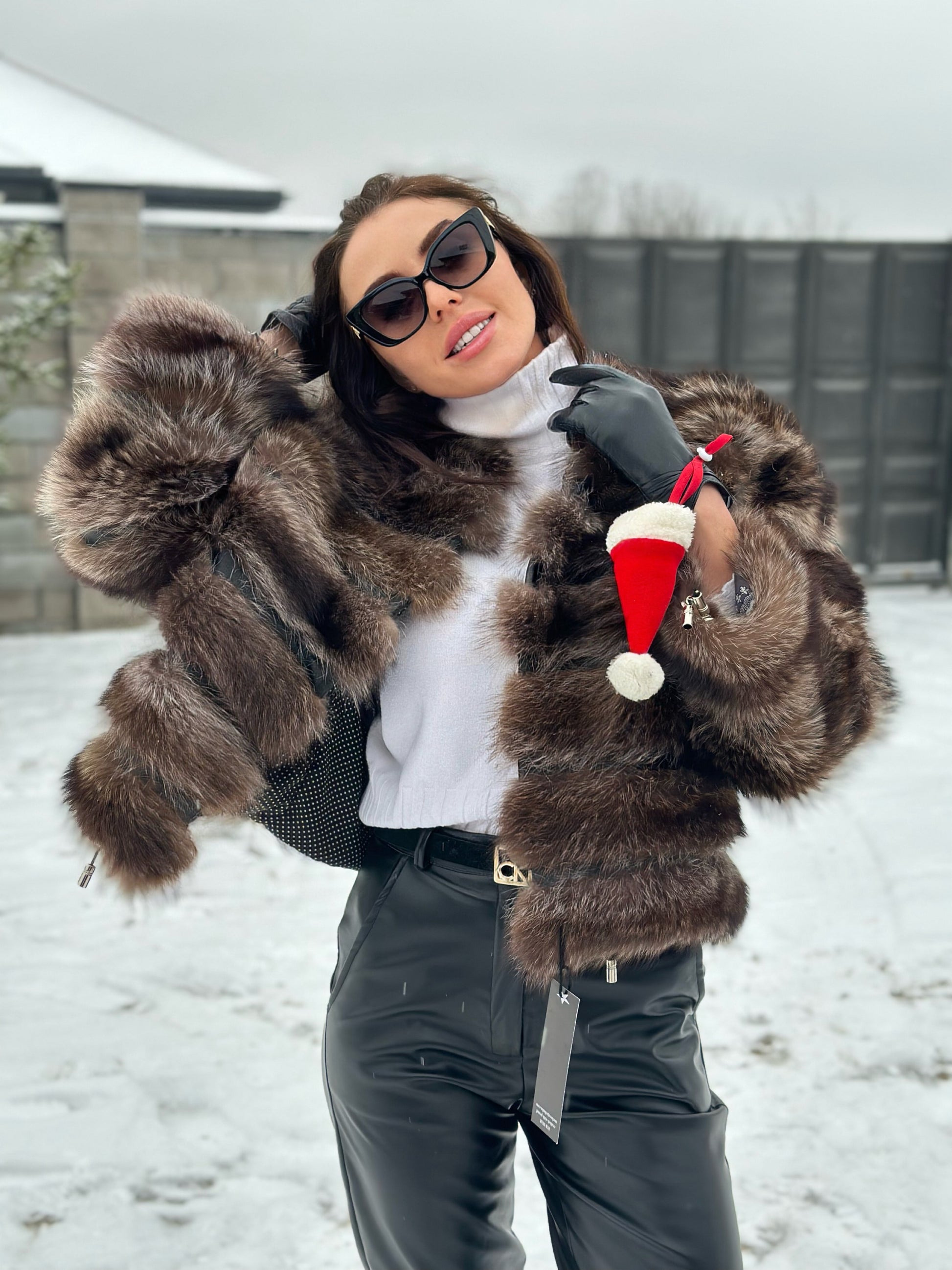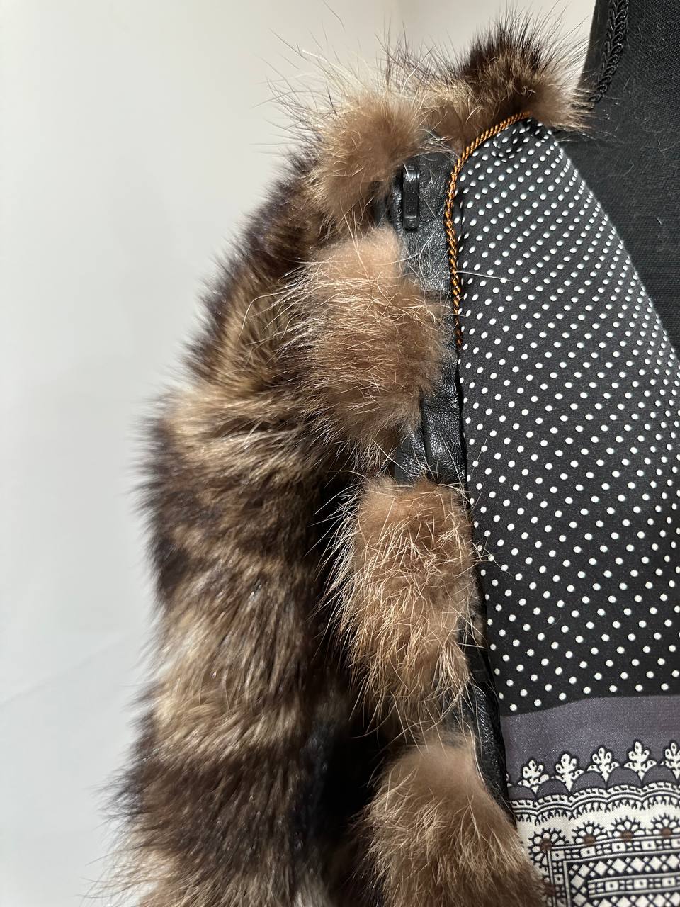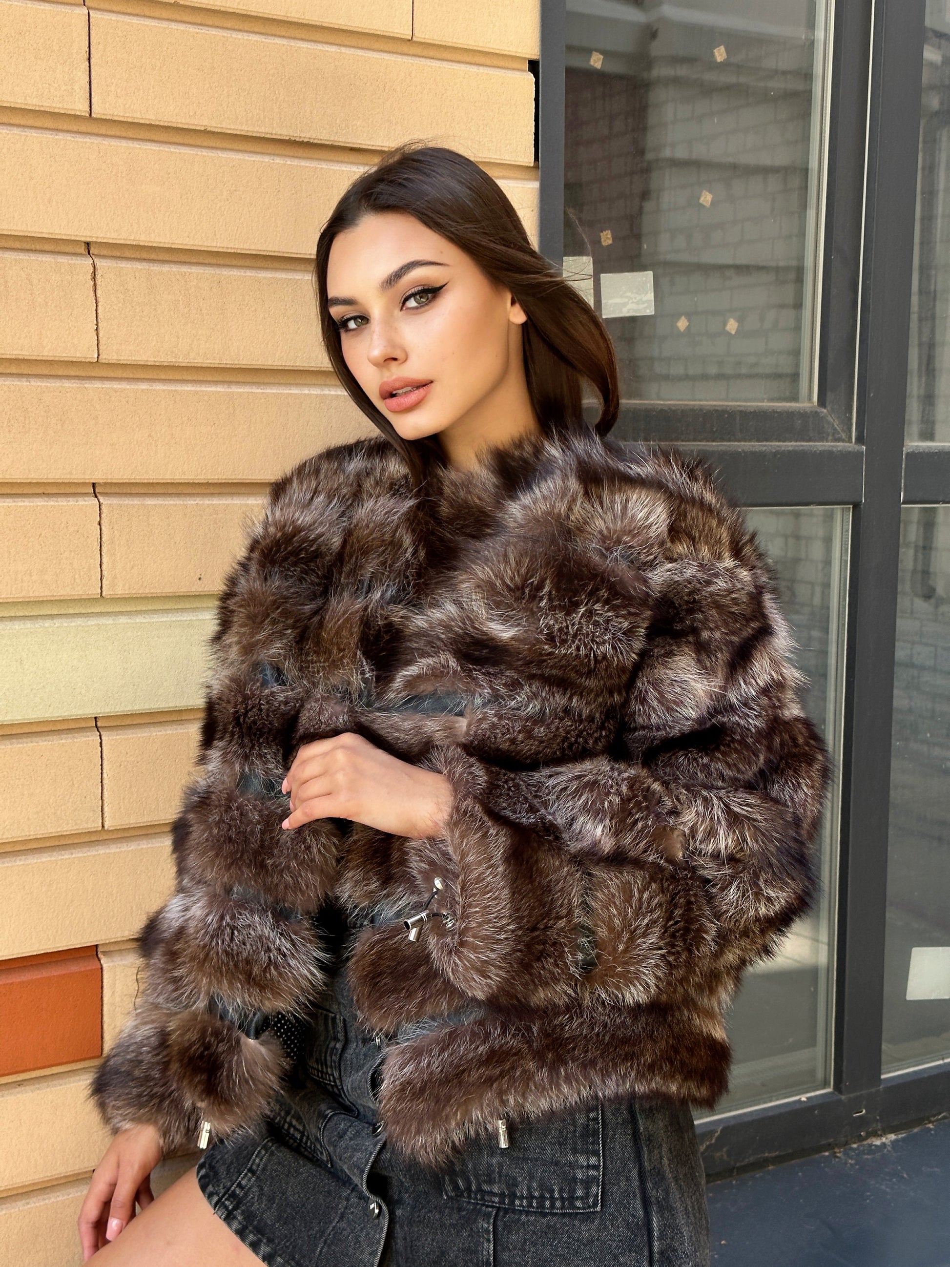 Women's fur coat made of natural raccoon fur natural color L size. Fur - fluffy, thick, warm, soft, shiny pile. The laying of the fur is horizontal, between the fur is genuine black leather. The model is a bomber jacket, on the bottom there is a drawstring. Also, the sleeves have a drawstring, you can adjust the width of the sleeve. There are 2 pockets. Fastens with hooks. Viscose lining, soft to the touch. Ukrainian manufacturer.